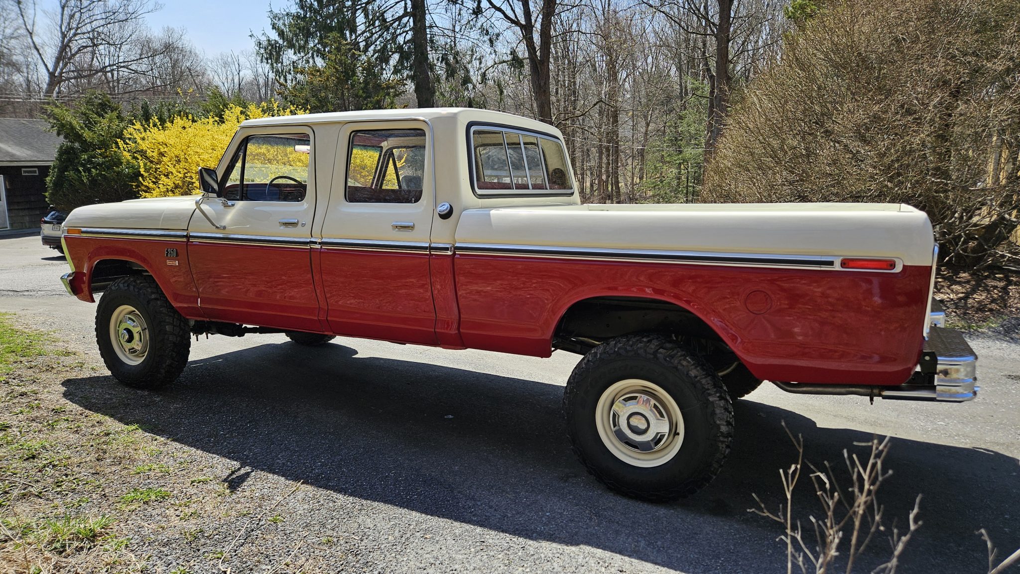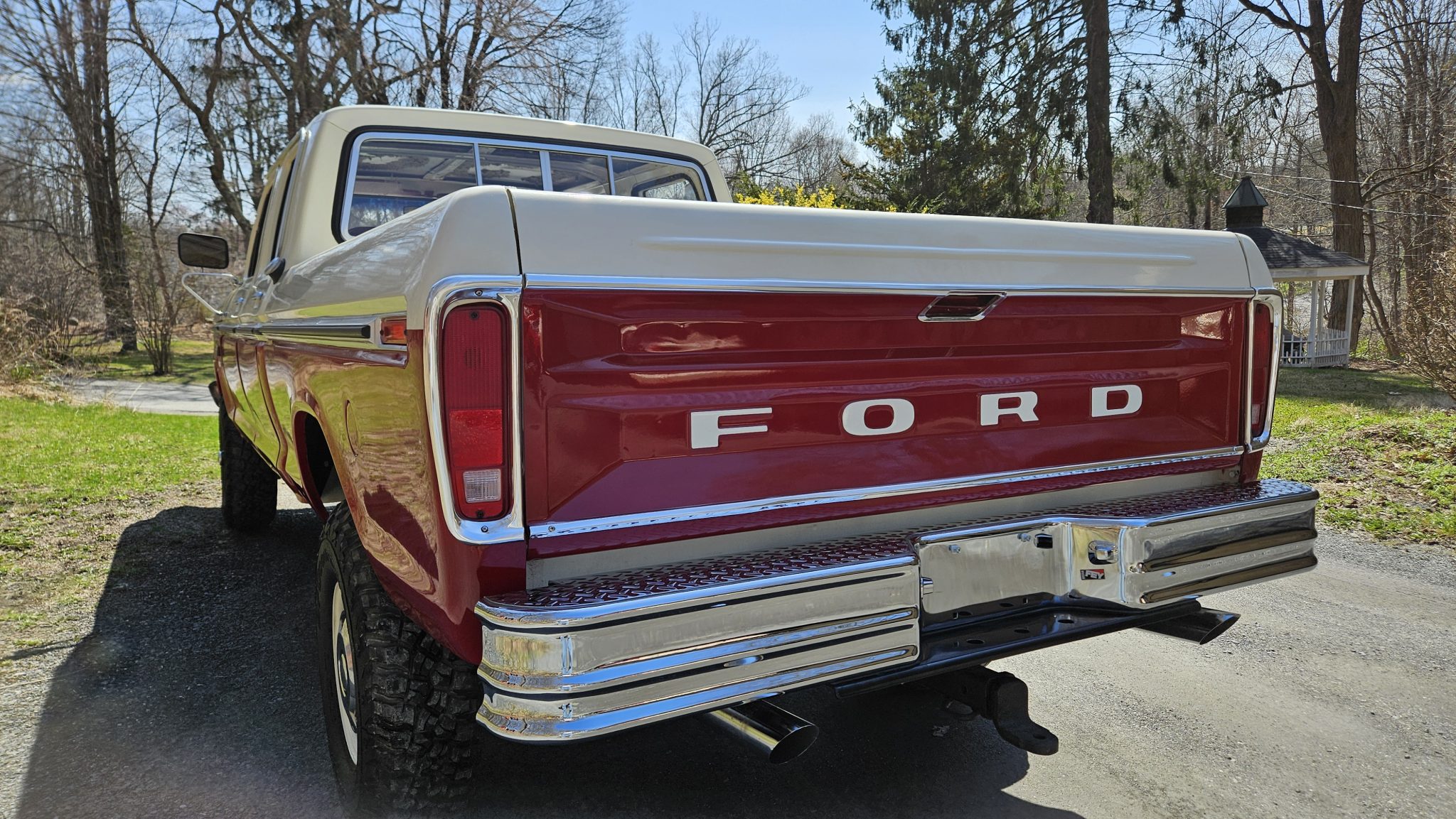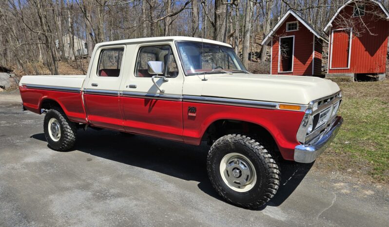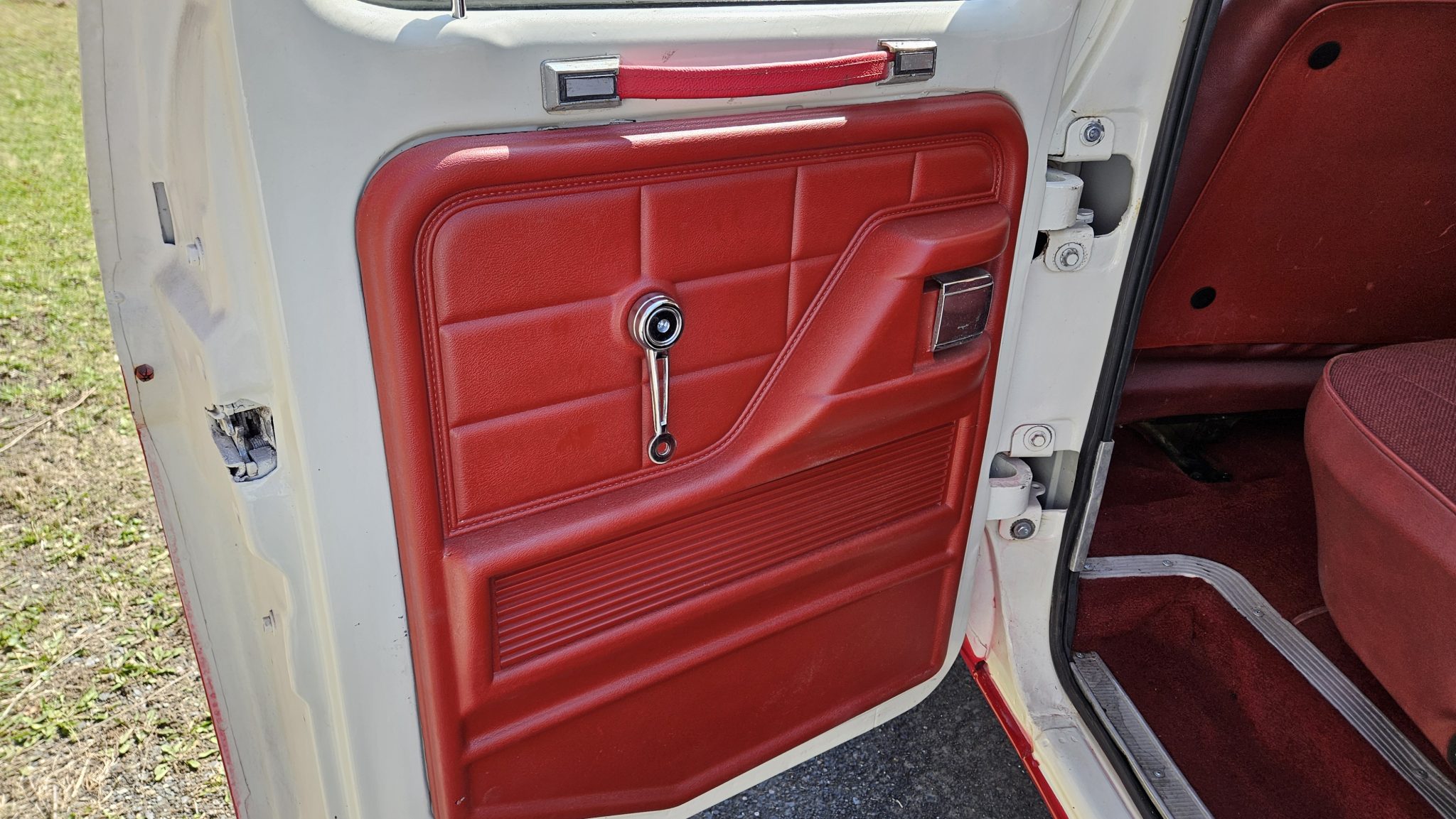 Powered by a 360ci V8 linked with a four-speed manual transmission and a dual-range transfer case, the truck wears a repaint in white and red over red cloth upholstery. Equipment includes 16″ steel wheels, manually locking front hubs, Rancho shocks, front disc brakes, power steering, and an Edelbrock carburetor along with air conditioning, a digital radio, two bench seats, and a hitch receiver.