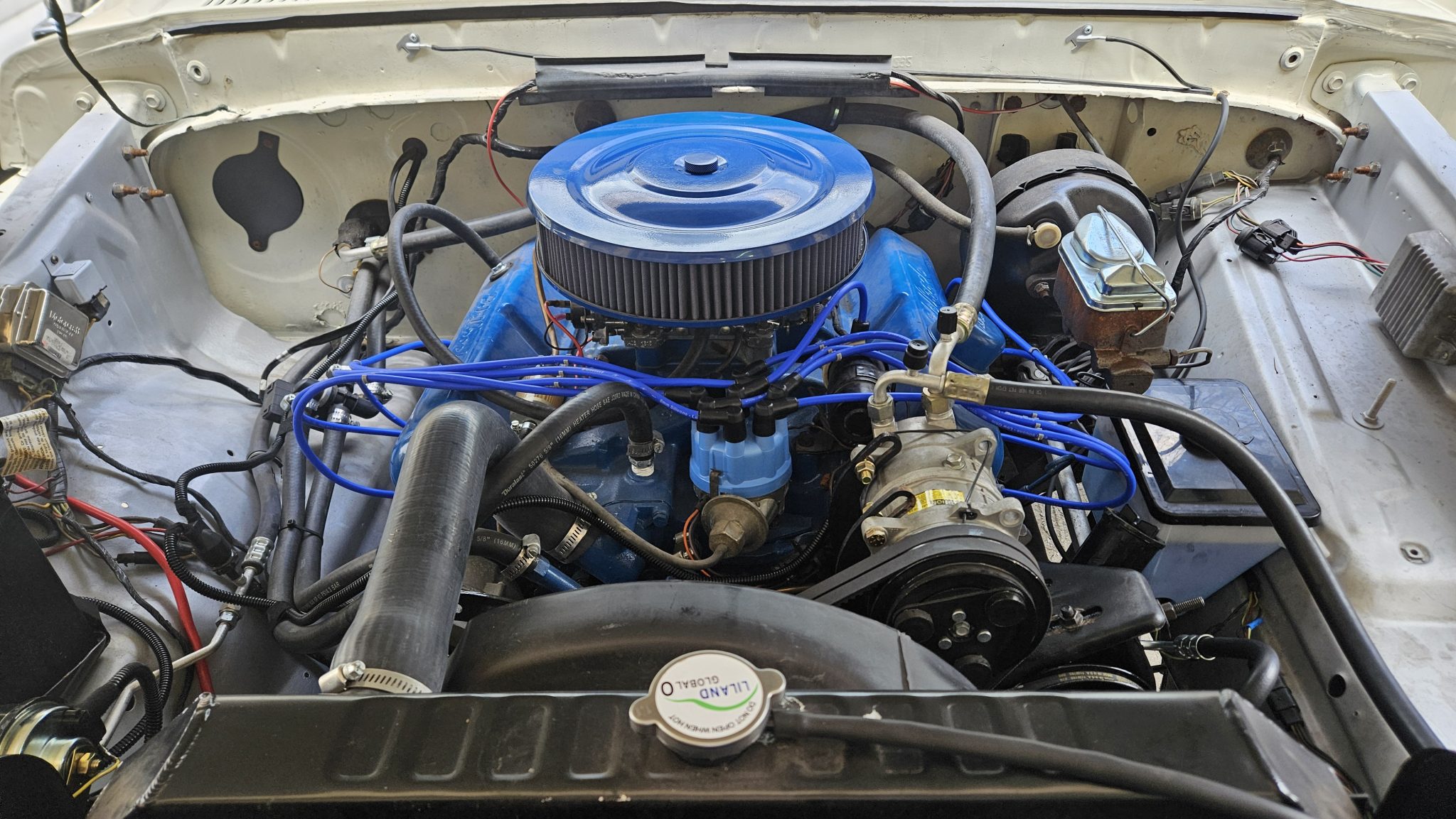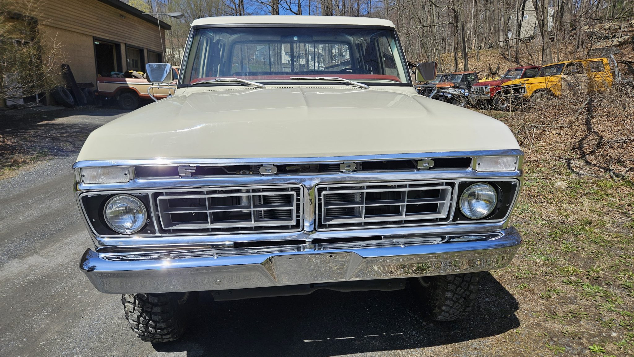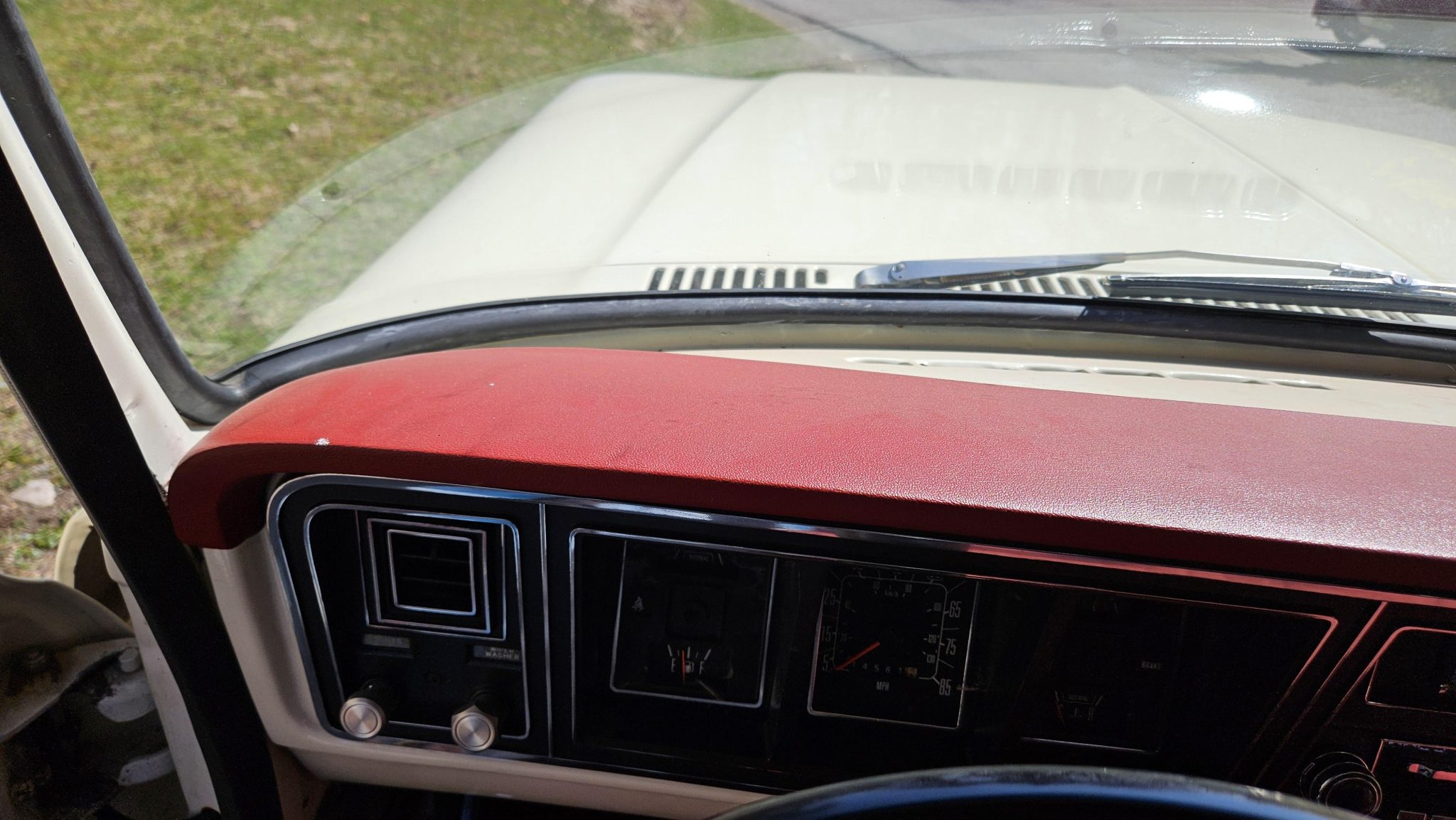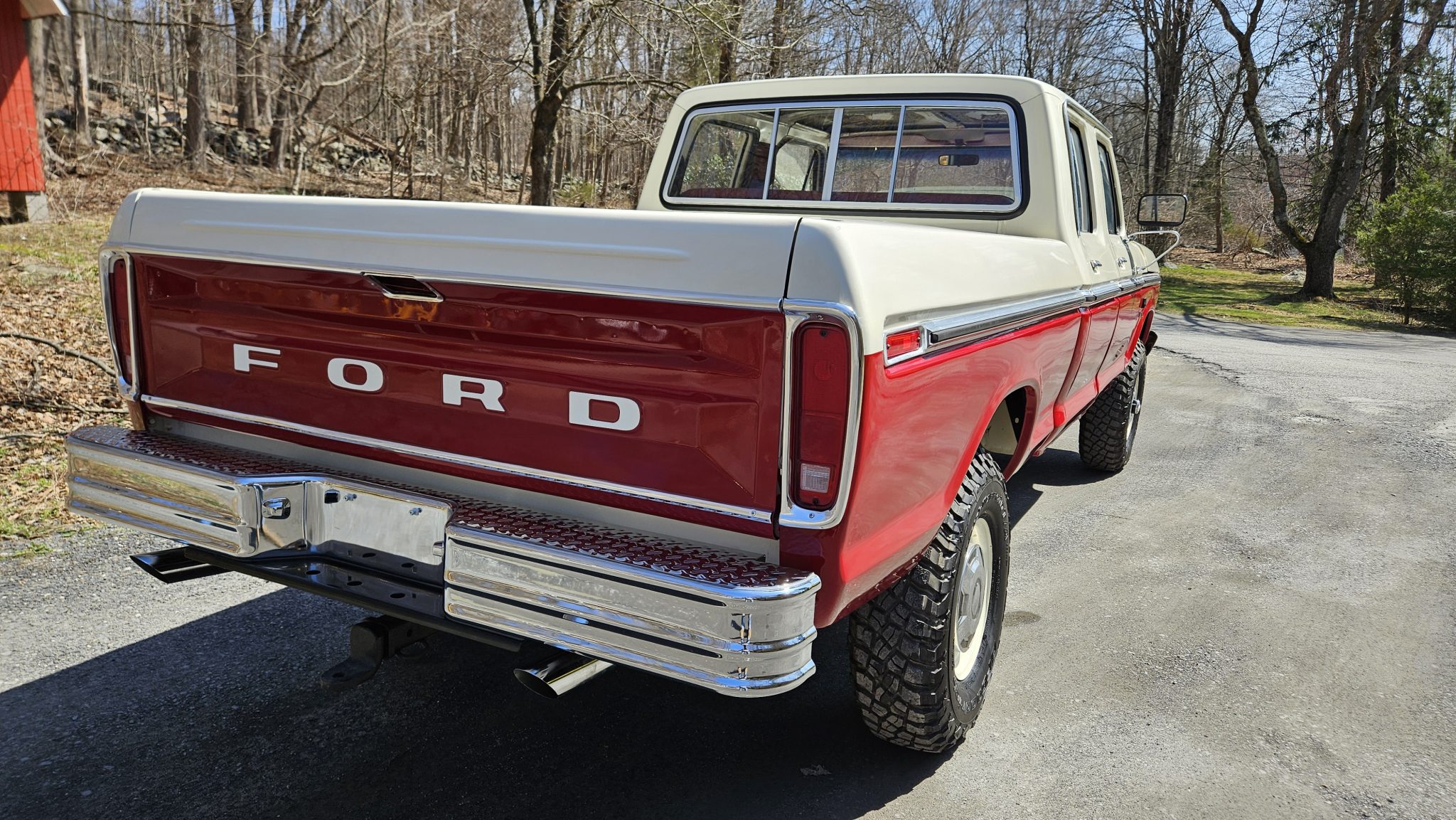 Powered by a 360ci V8 linked with a four-speed manual transmission and a dual-range transfer case, the truck wears a repaint in white and red over red cloth upholstery. Equipment includes 16″ steel wheels, manually locking front hubs, Rancho shocks, front disc brakes, power steering, and an Edelbrock carburetor along with air conditioning, a digital radio, two bench seats, and a hitch receiver.