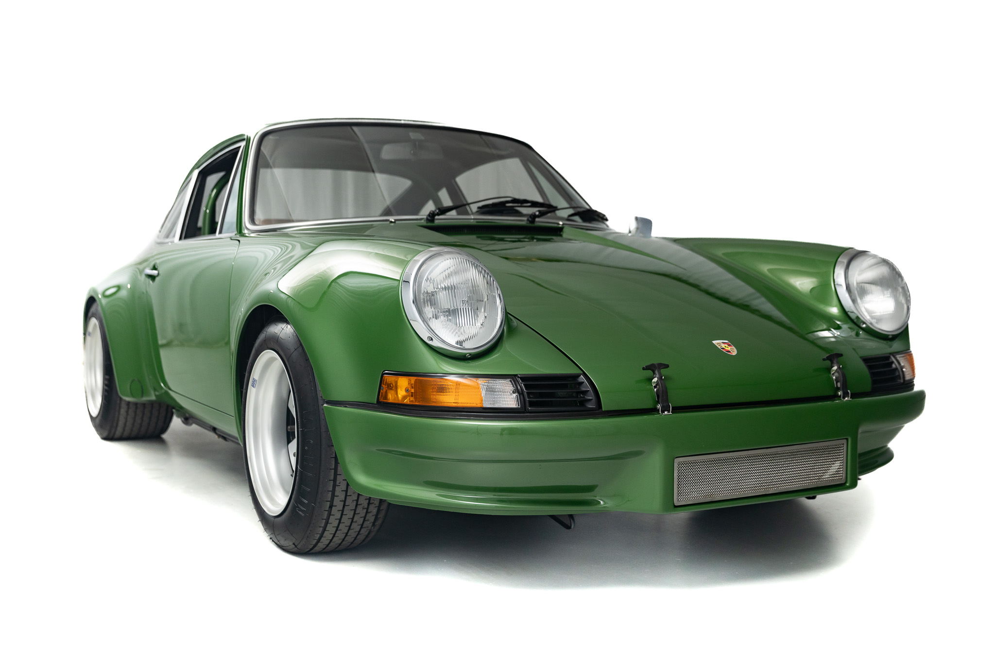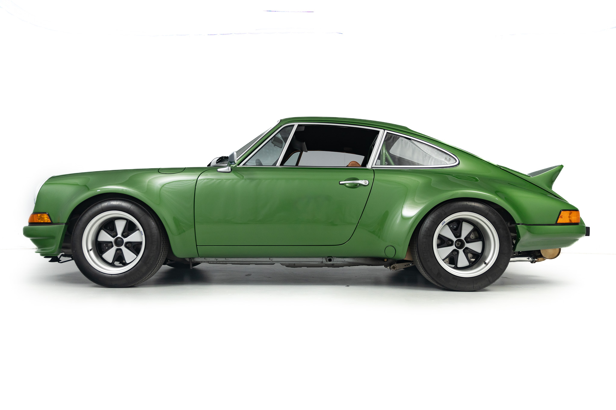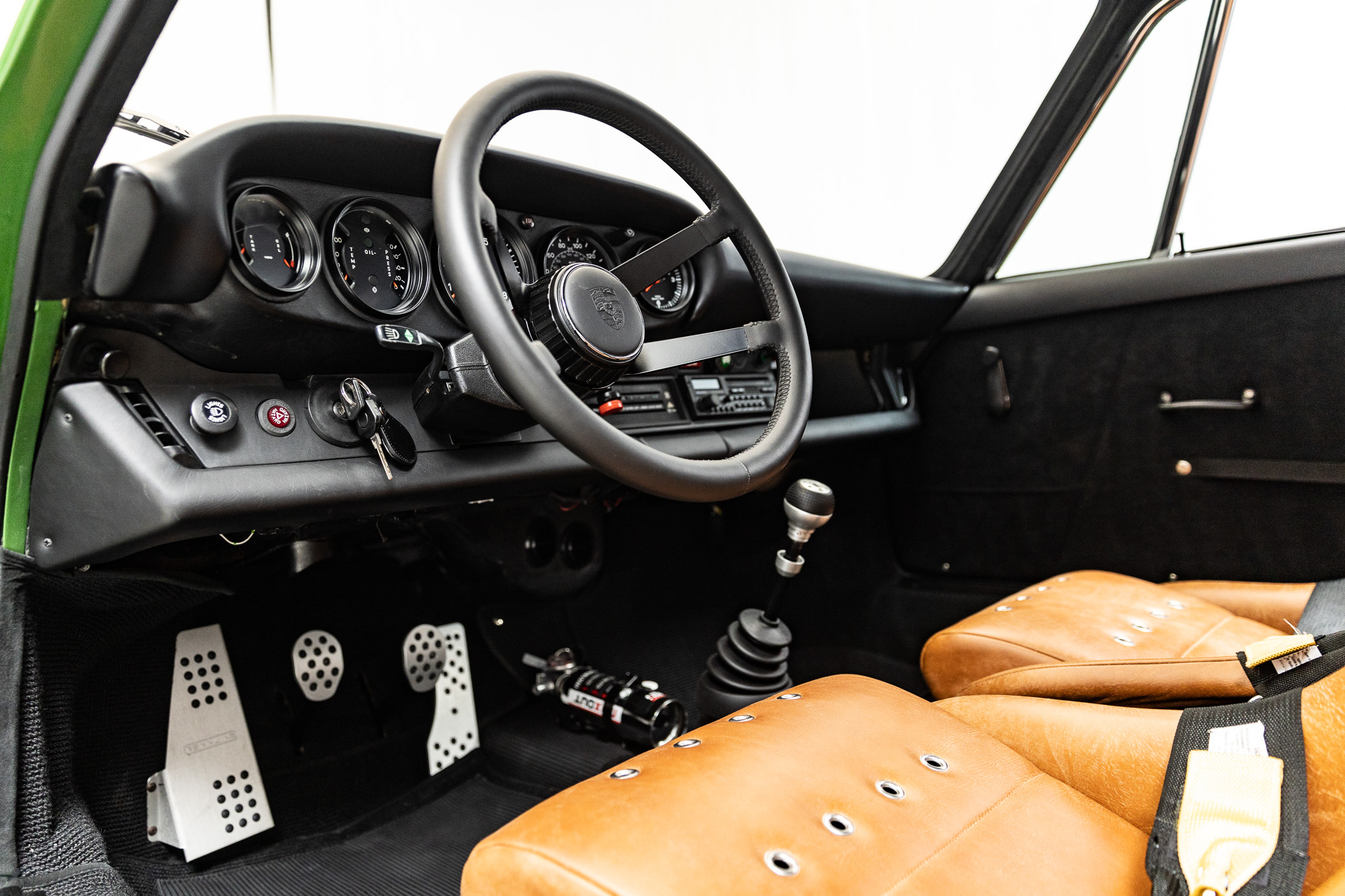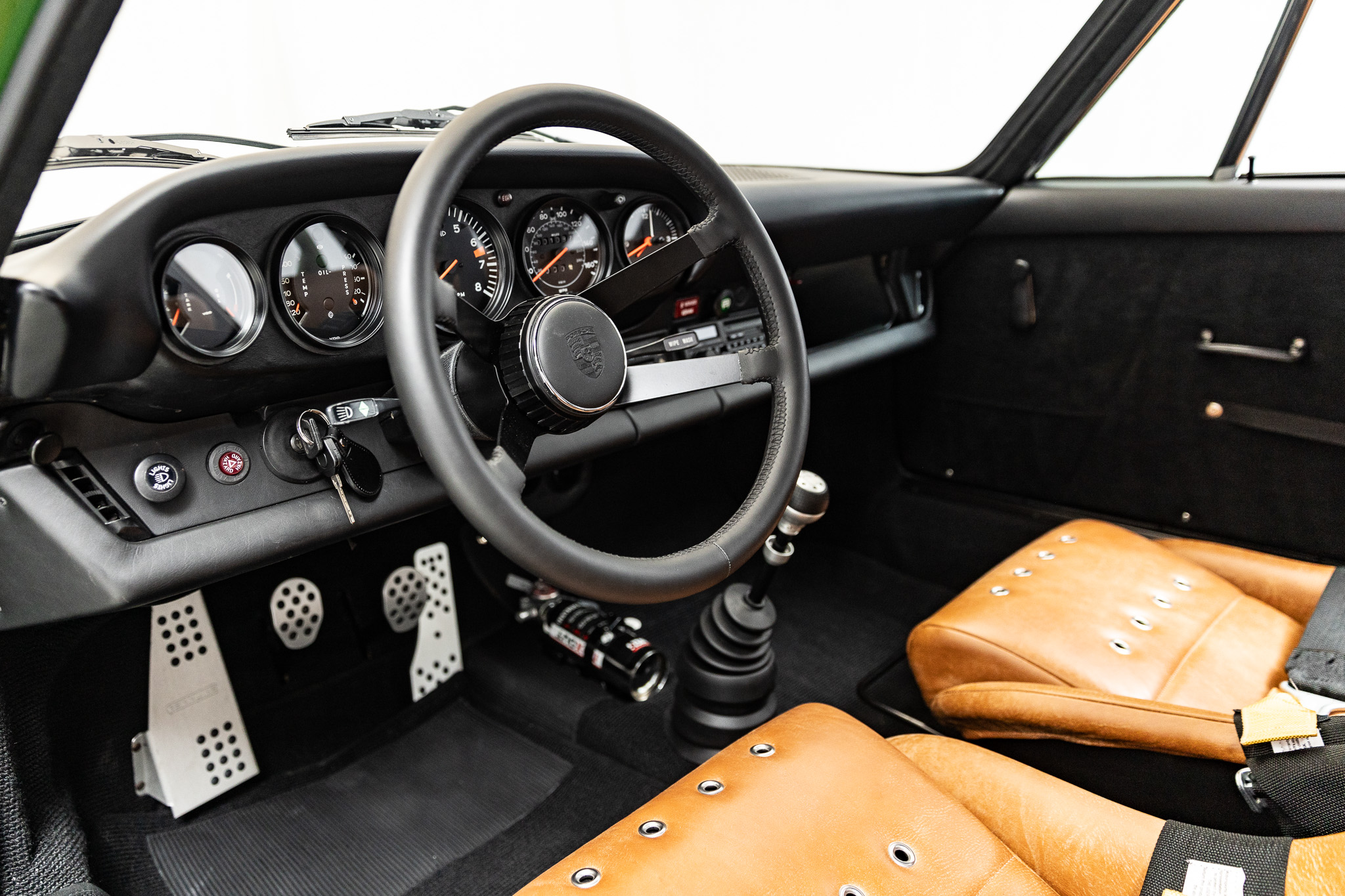 A replacement 3.2-liter flat-six with machined twin-plug cylinder heads was mated to the rebuilt five-speed manual transaxle, and steel fender flares, RSR-style fiberglass bumpers, and a backdated hood and ducktail decklid were fitted before the car was refinished in Metallic Green over a black and tan interior. Additional equipment includes 15″ Braid wheels, Boxster brakes, Bilstein shocks, PMO carburetors, an aftermarket exhaust system, and H4 headlights as well as Recaro fixed-back seats, a multi-point roll bar, RS-style door panels, a dished steering wheel, a WEVO shifter, and a Blaupunkt Bremen stereo.