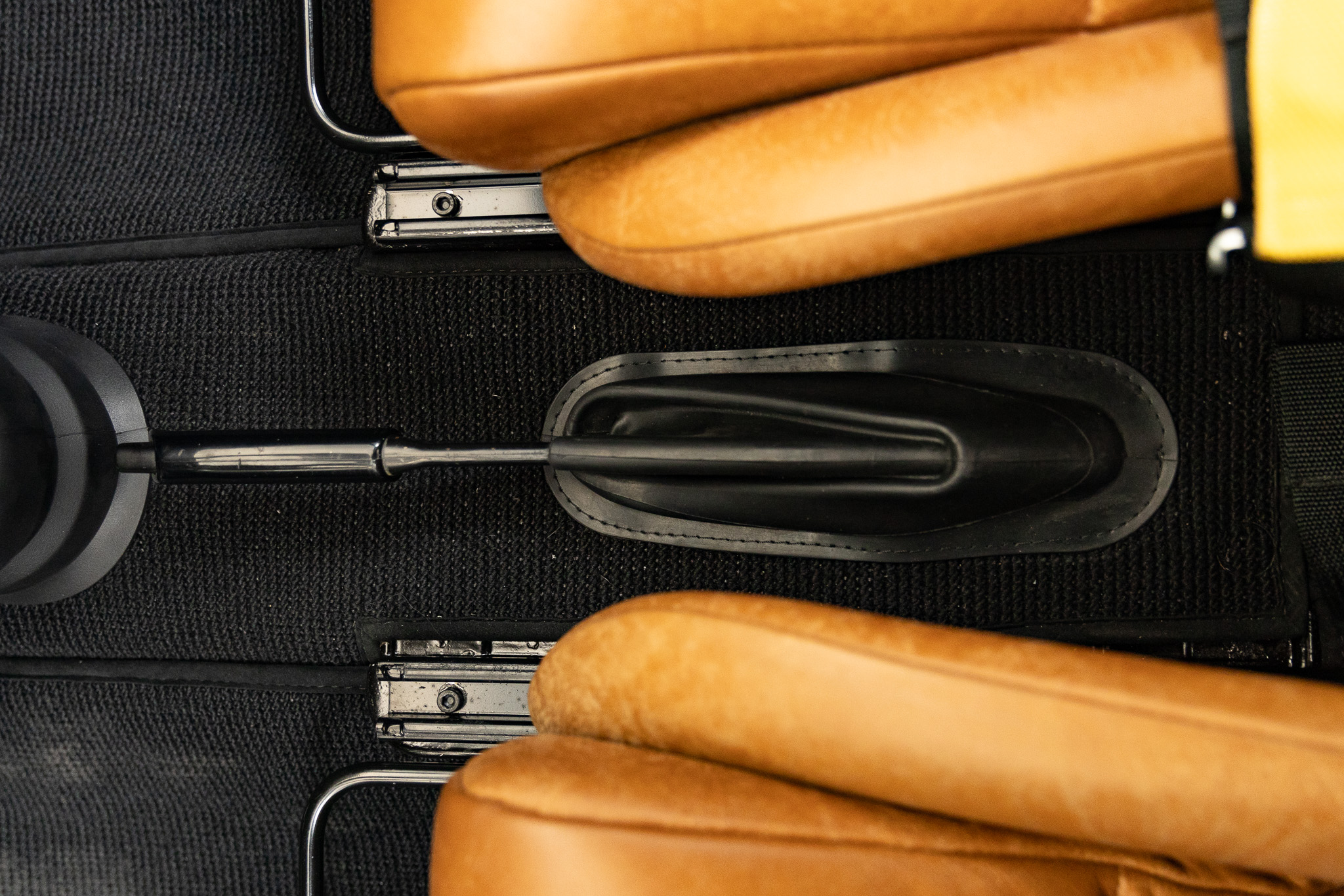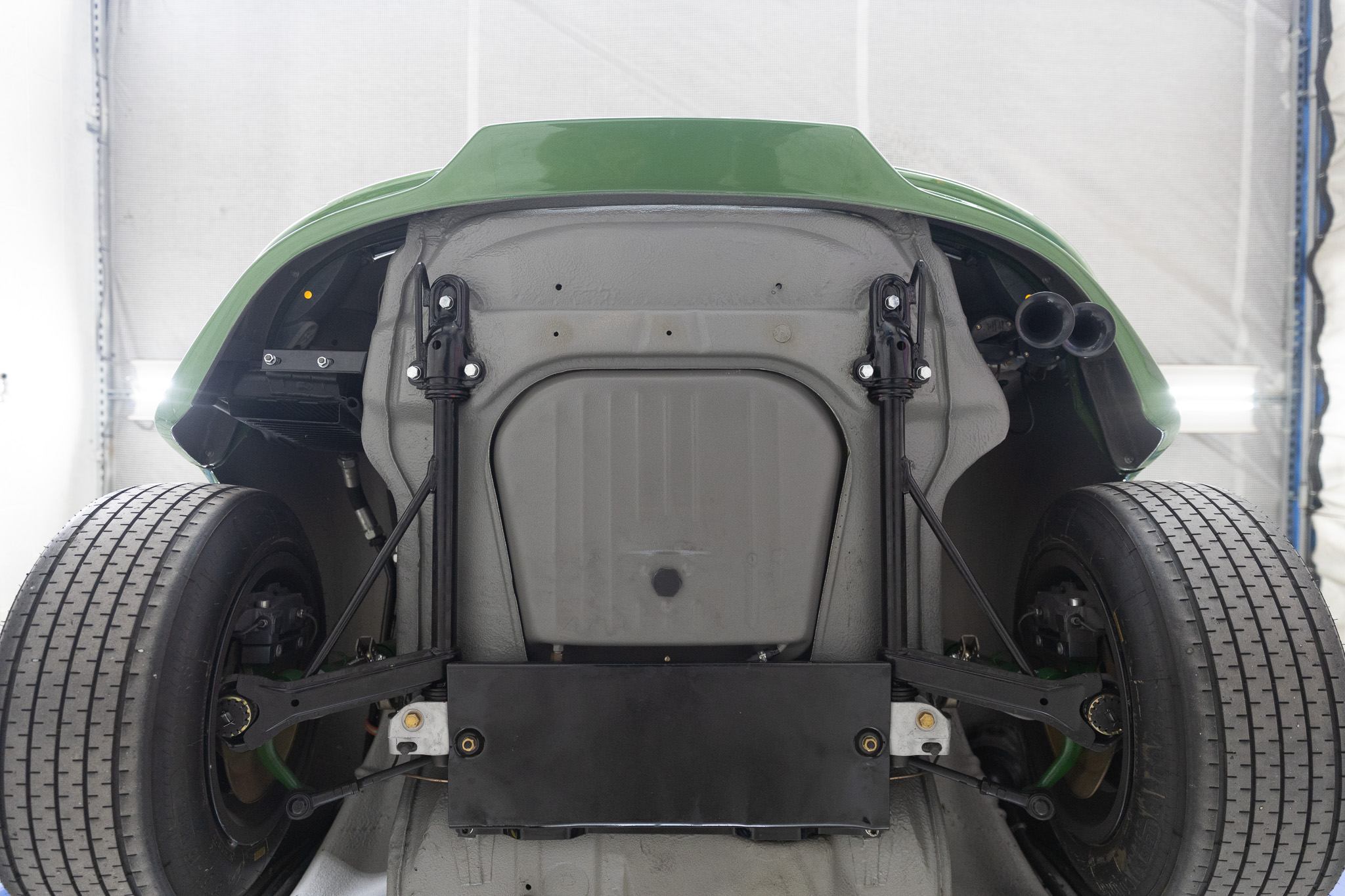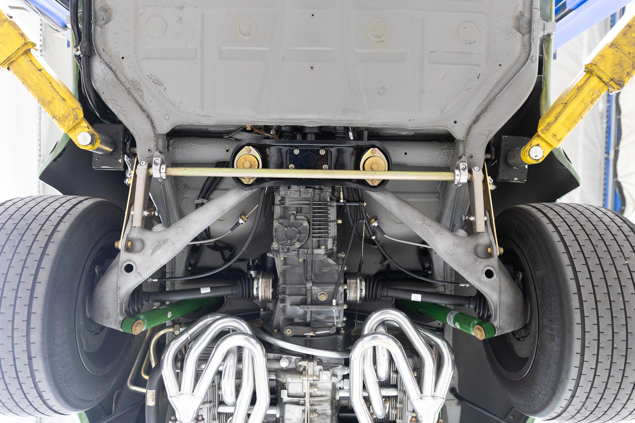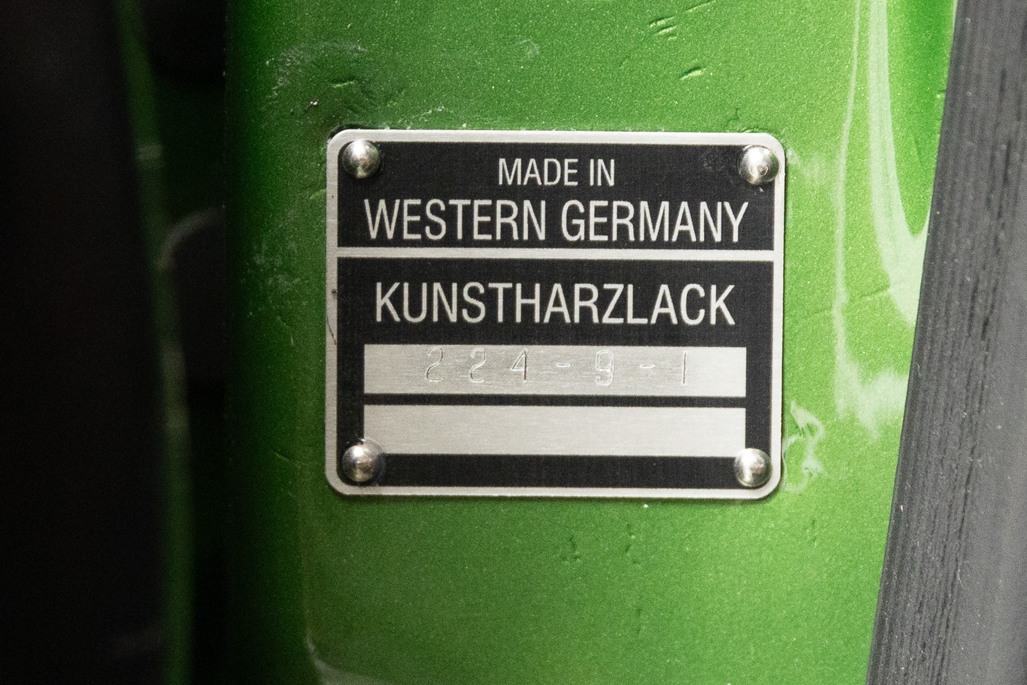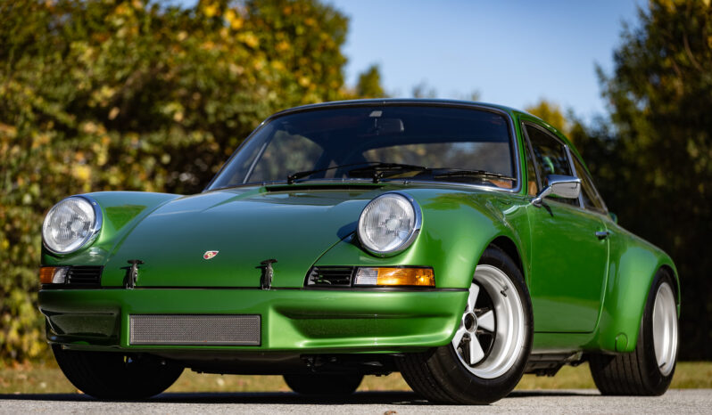 A replacement 3.2-liter flat-six with machined twin-plug cylinder heads was mated to the rebuilt five-speed manual transaxle, and steel fender flares, RSR-style fiberglass bumpers, and a backdated hood and ducktail decklid were fitted before the car was refinished in Metallic Green over a black and tan interior. Additional equipment includes 15″ Braid wheels, Boxster brakes, Bilstein shocks, PMO carburetors, an aftermarket exhaust system, and H4 headlights as well as Recaro fixed-back seats, a multi-point roll bar, RS-style door panels, a dished steering wheel, a WEVO shifter, and a Blaupunkt Bremen stereo.