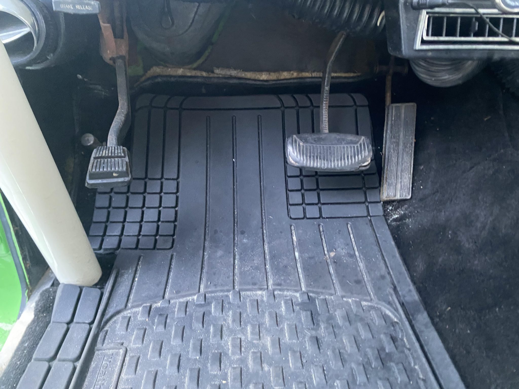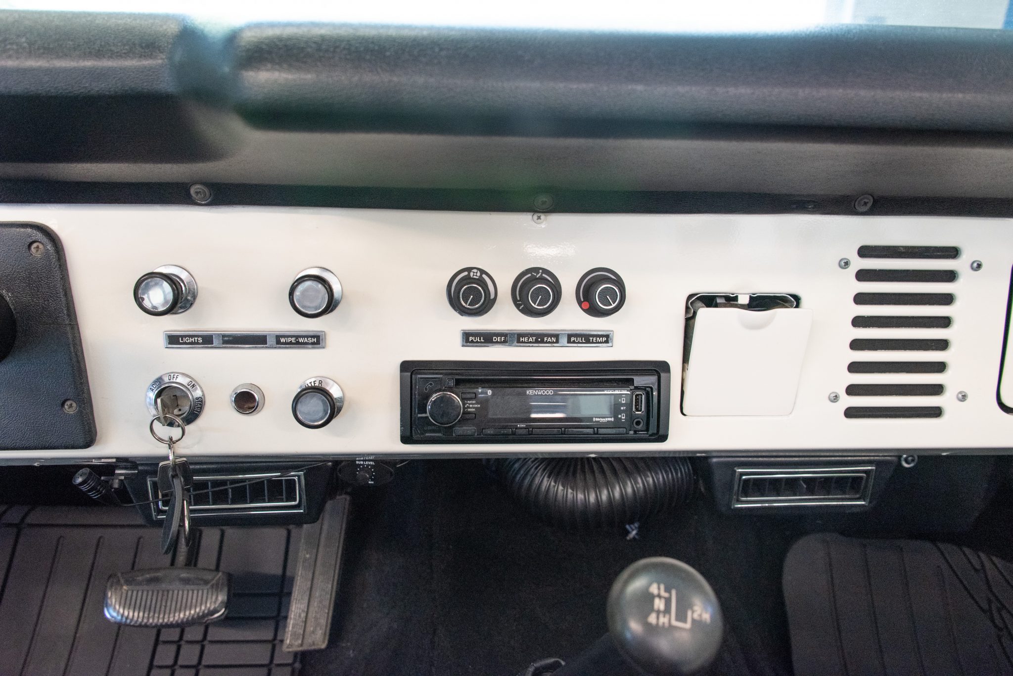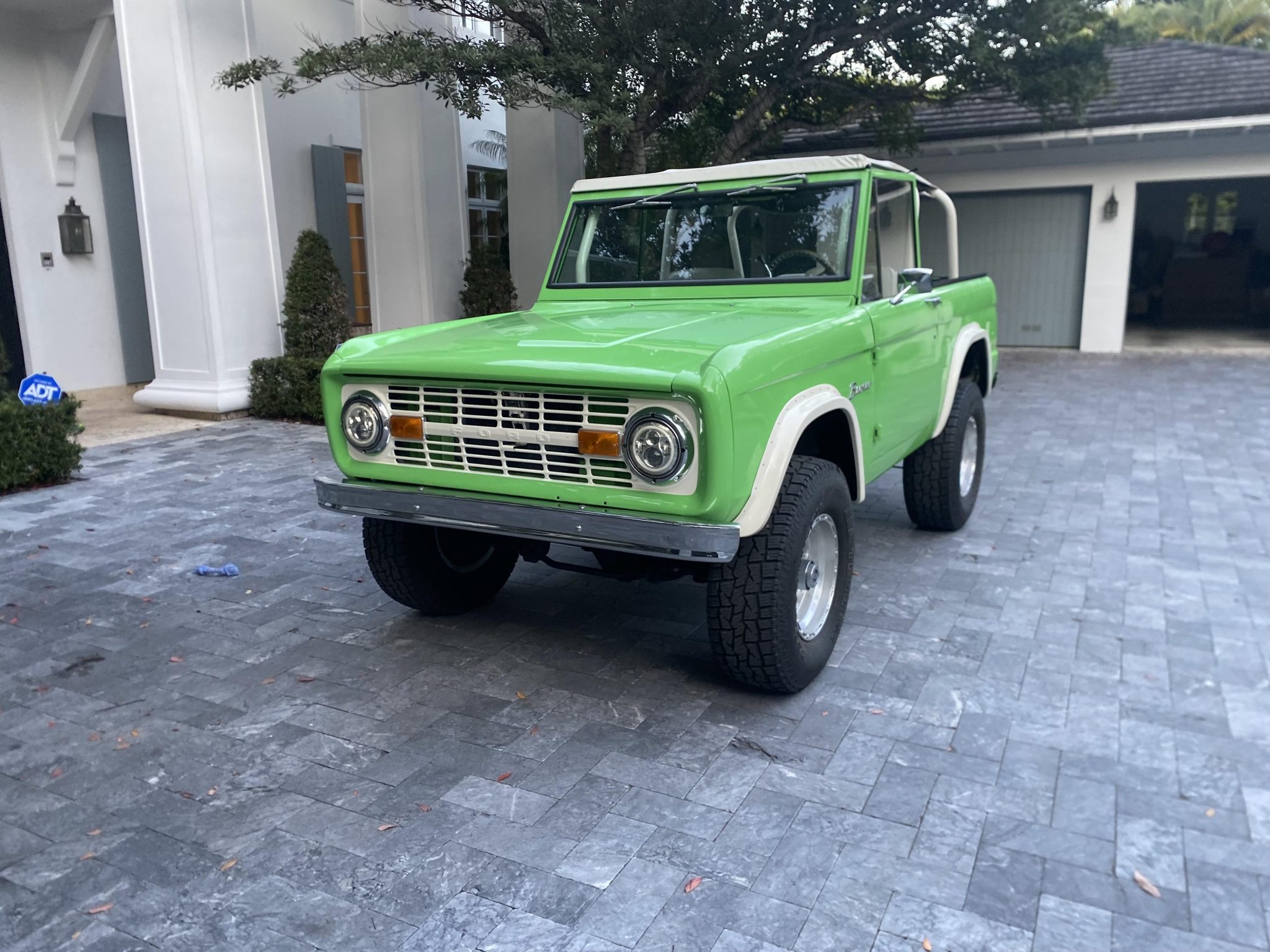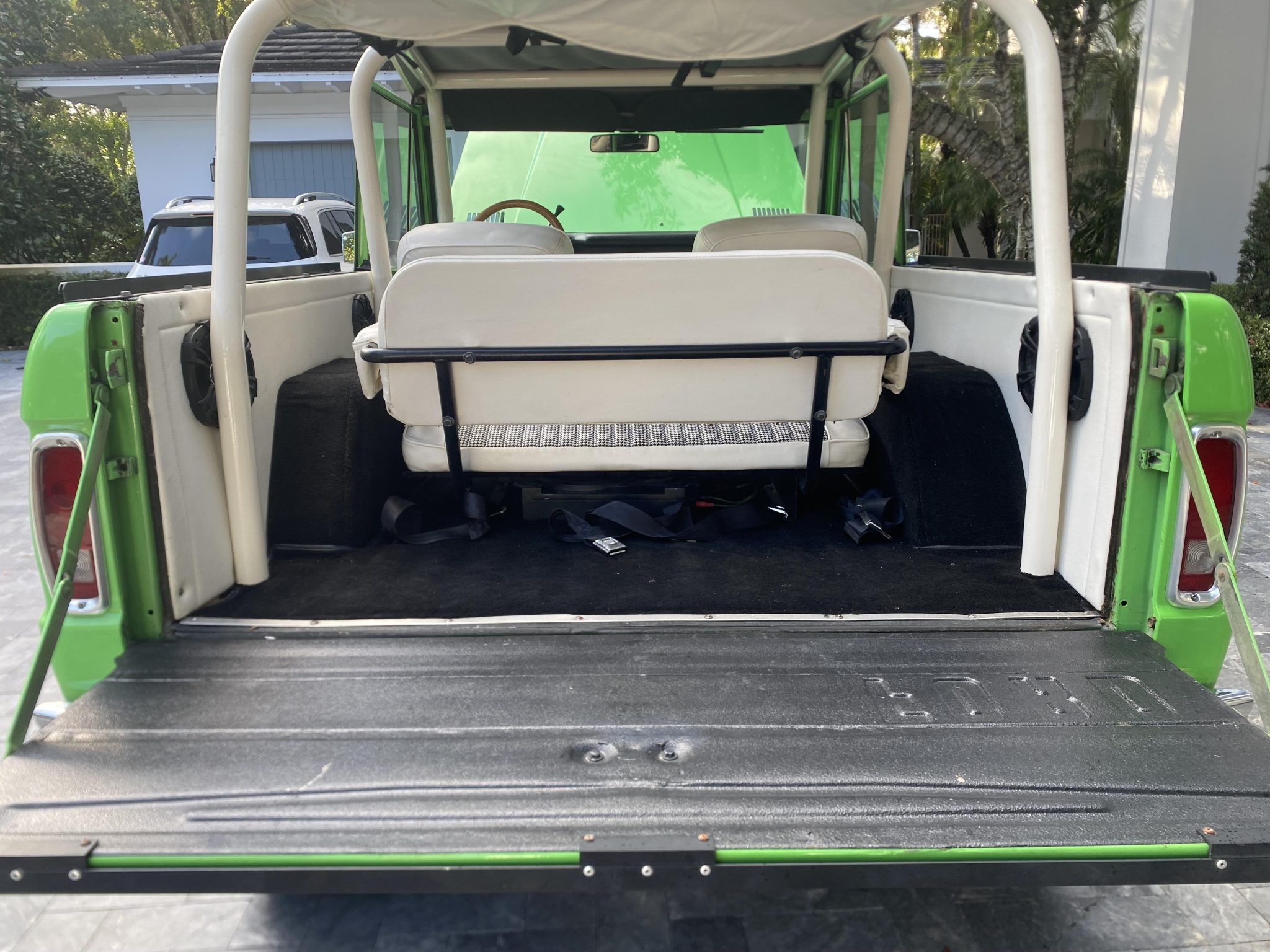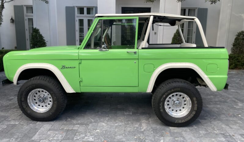 This 1977 Ford Bronco is finished in Medium Emerald Green over Ivory and houndstooth vinyl and is powered by a 302ci V8 linked to a three-speed automatic transmission, a dual-range transfer case, and limited-slip front and rear differentials. Equipment includes a removable black soft top and an ivory Bimini top as well as Holley Sniper electronic fuel injection, an aluminum radiator, power steering, a 2″ suspension lift kit, front disc brakes, 16″ alloy wheels, LED headlights, ivory fender flares, chrome bumpers, a roll cage, air conditioning, a wood-rimmed steering wheel, and a Kenwood CD stereo linked to Kicker speakers.