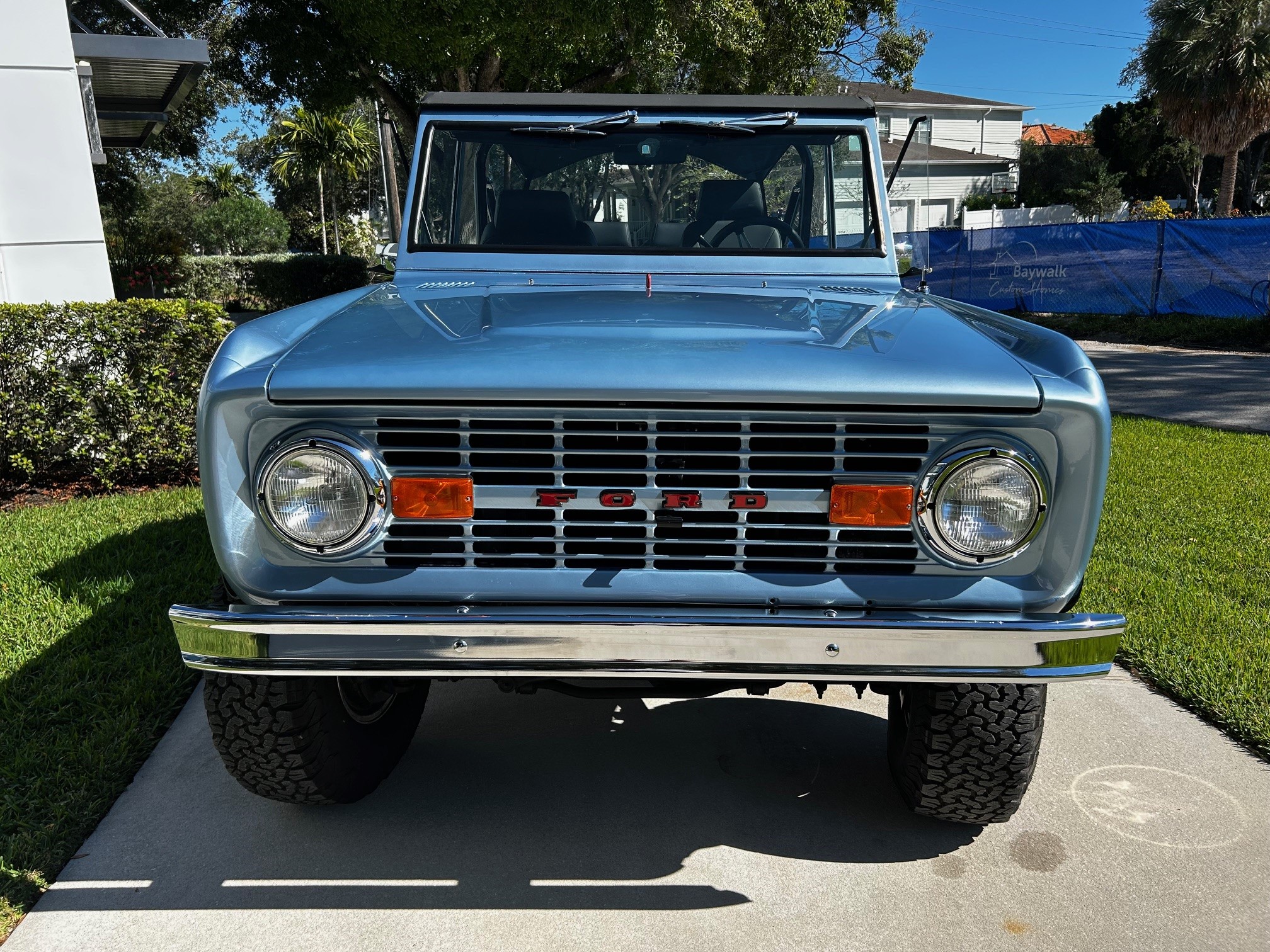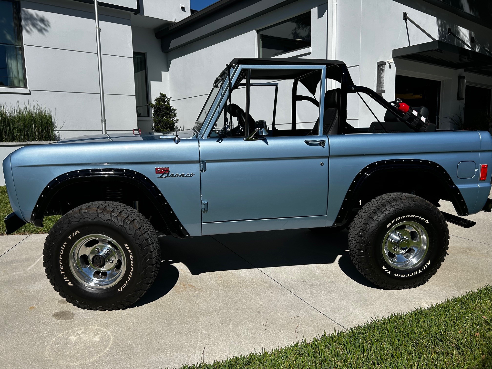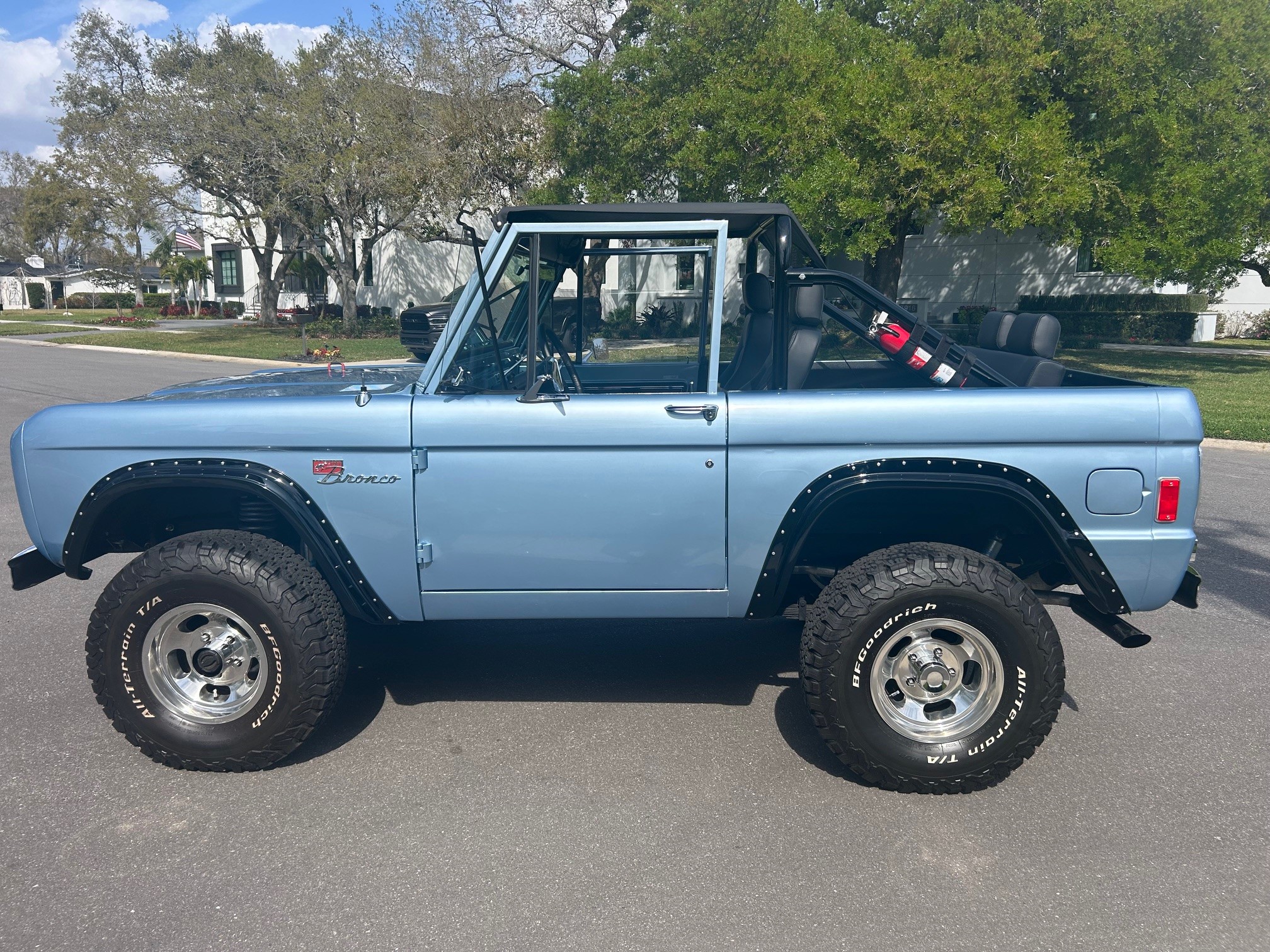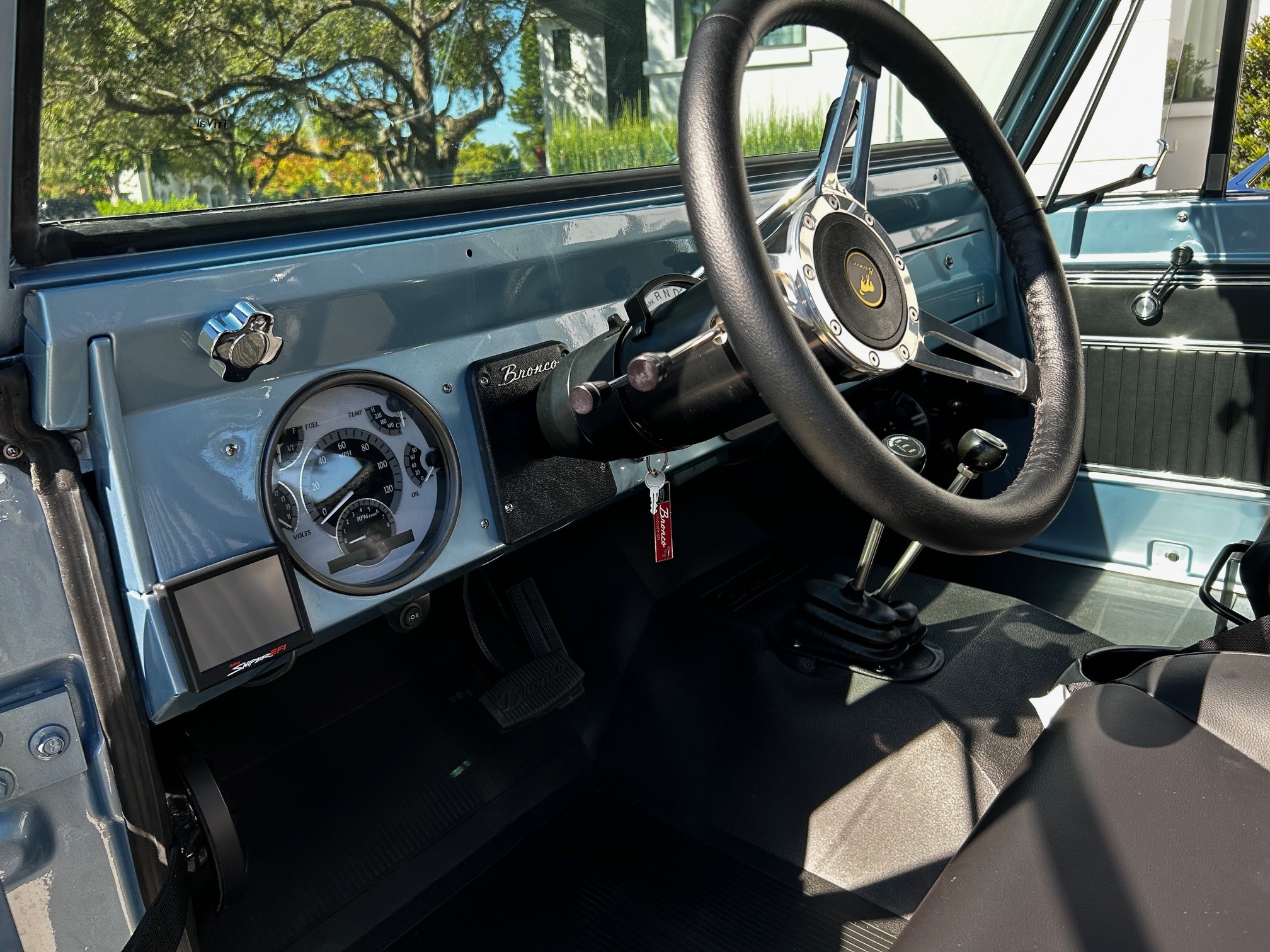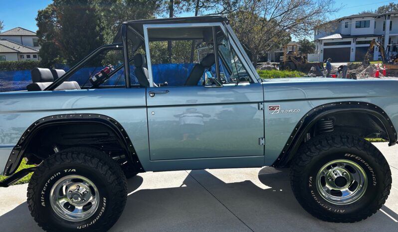 This 1977 Ford Bronco wagon was subsequently refinished in Light Blue and fitted with a BluePrint Engines 302ci V8 at Running Great Automotive in Tampa, Florida. Modifications consist of Holley Sniper electronic fuel injection, a lifted suspension, Bilstein shock absorbers, power steering, front disc brakes, polished 15″ five-spoke alloy wheels, and black wheel arch flares. Power is sent to the rear or all four wheels through a three-speed automatic transmission and a dual-range transfer case, and additional features include a roll bar, a black bikini top, aftermarket seats, a retro-style Bluetooth radio, and Dakota Digital instrumentation.