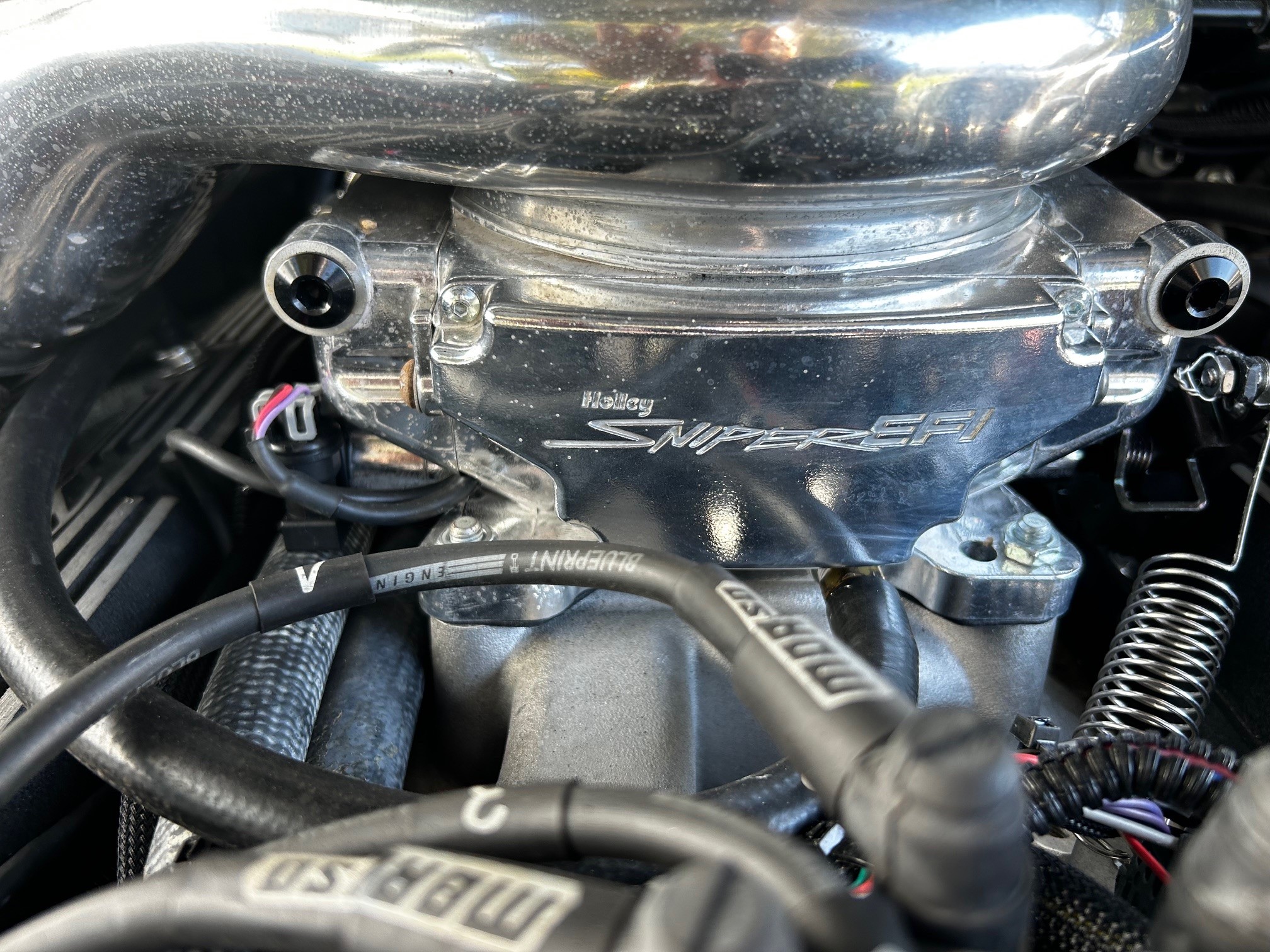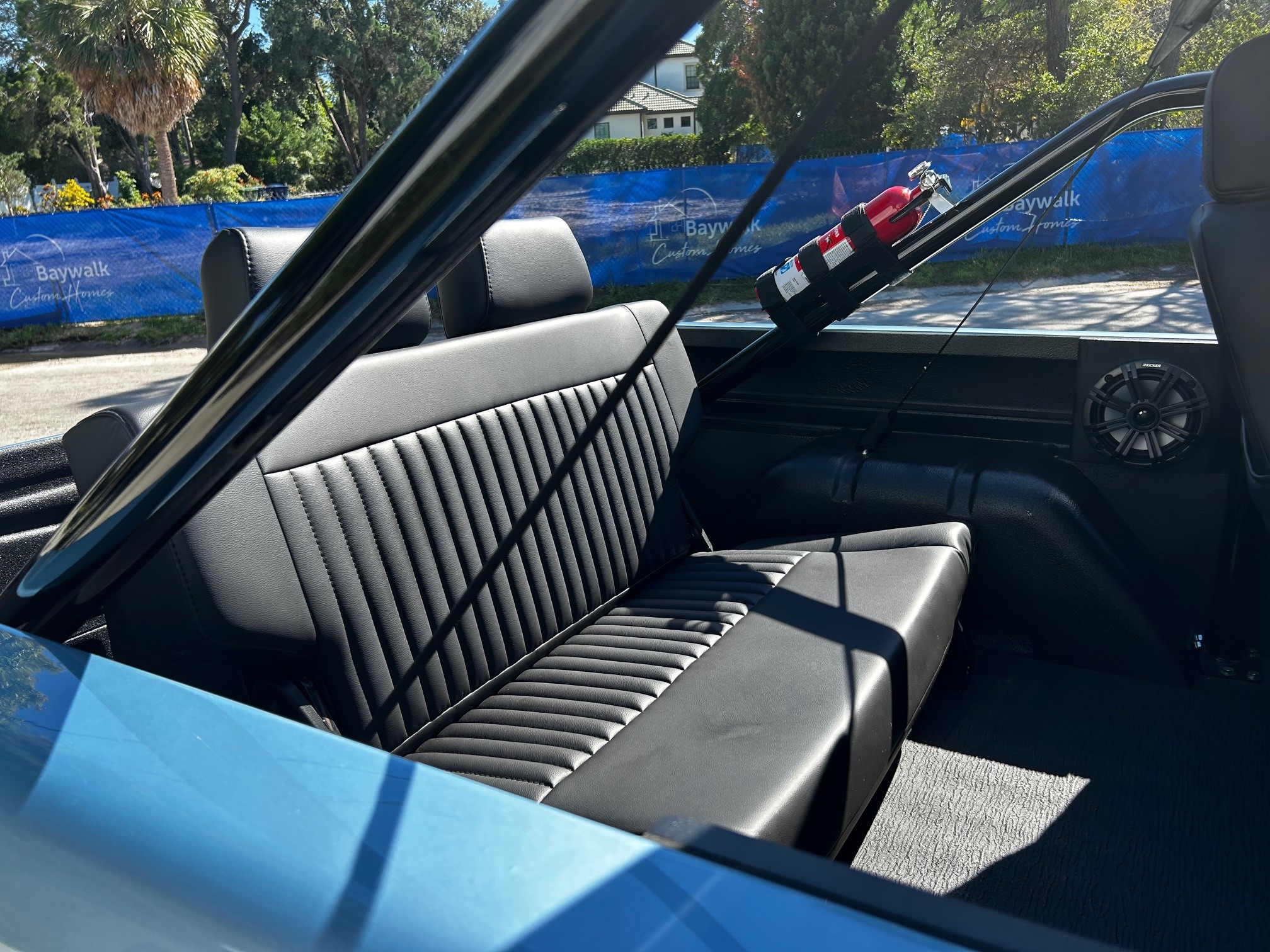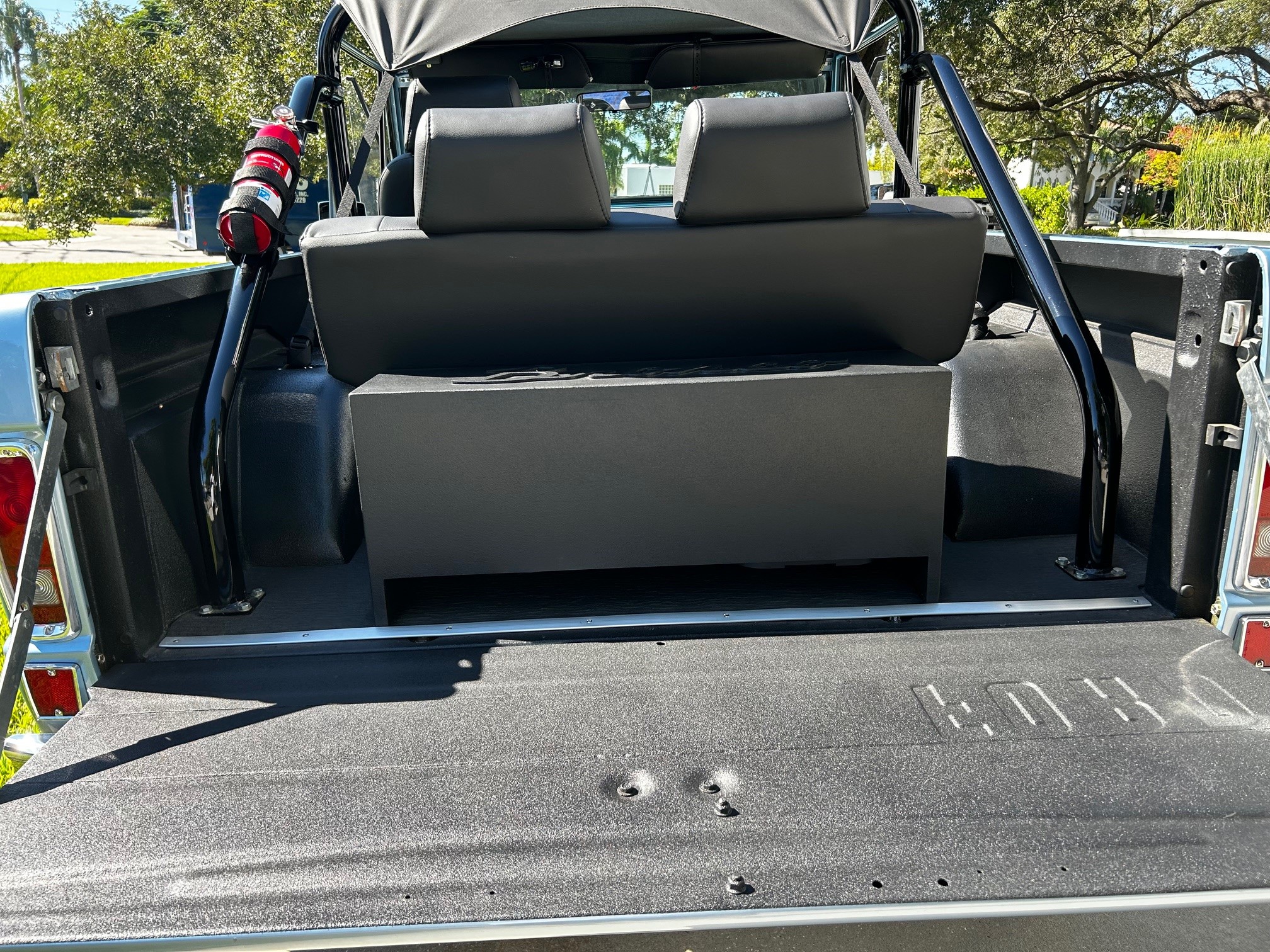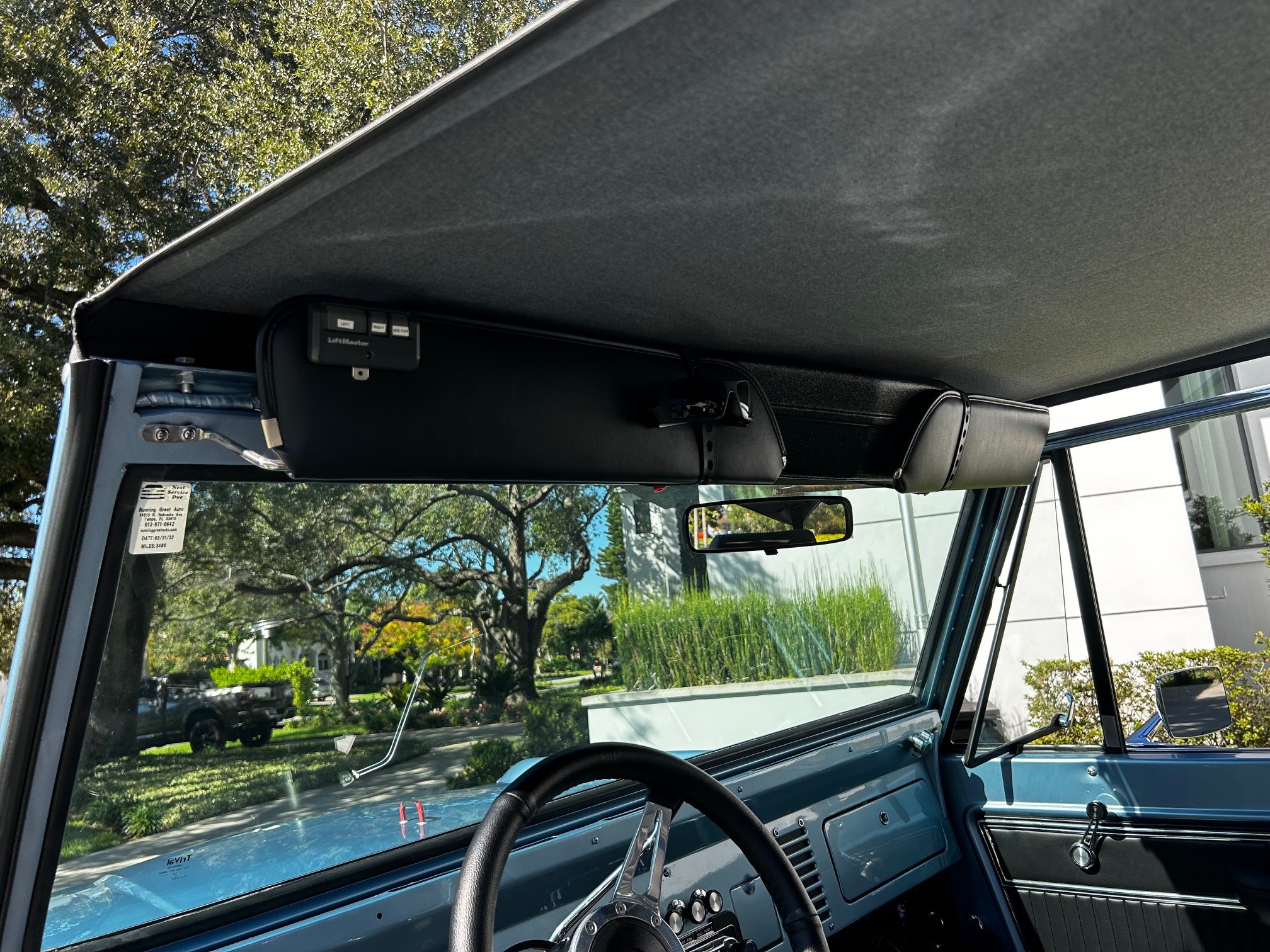 This 1977 Ford Bronco wagon was subsequently refinished in Light Blue and fitted with a BluePrint Engines 302ci V8 at Running Great Automotive in Tampa, Florida. Modifications consist of Holley Sniper electronic fuel injection, a lifted suspension, Bilstein shock absorbers, power steering, front disc brakes, polished 15″ five-spoke alloy wheels, and black wheel arch flares. Power is sent to the rear or all four wheels through a three-speed automatic transmission and a dual-range transfer case, and additional features include a roll bar, a black bikini top, aftermarket seats, a retro-style Bluetooth radio, and Dakota Digital instrumentation.