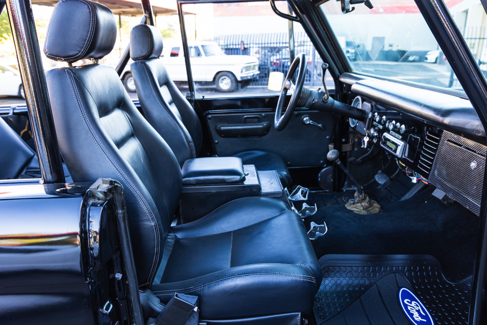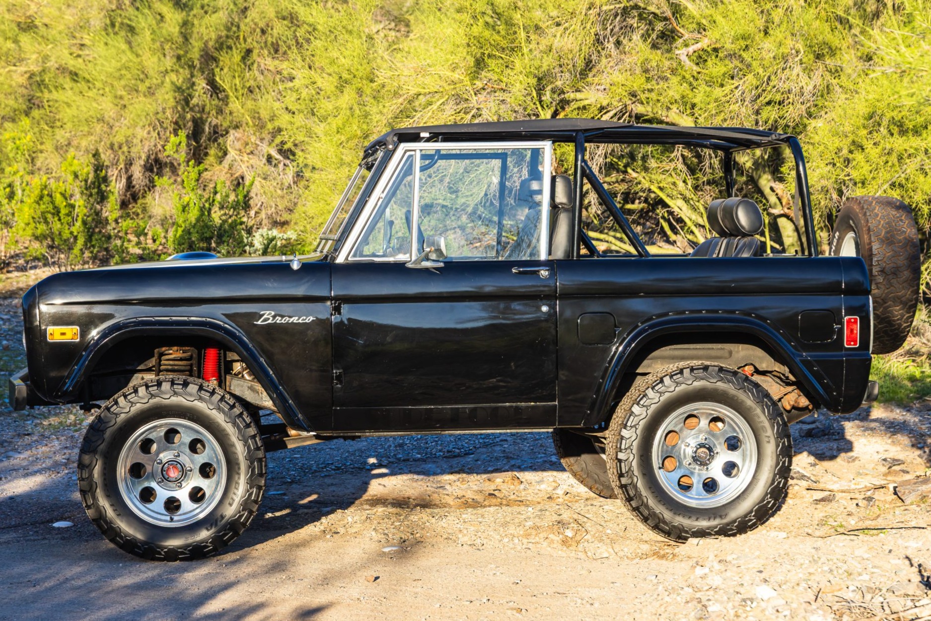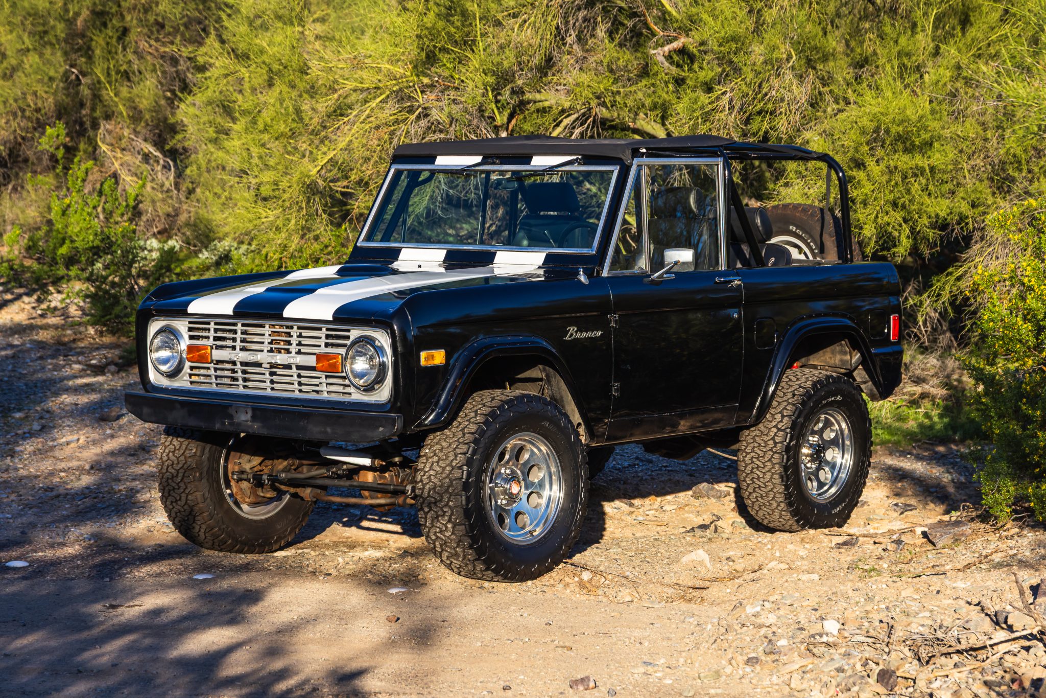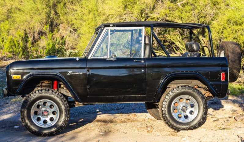 This 1977 Ford Bronco is powered by a replacement 302ci V8 linked with a three-speed automatic transmission and a dual-range transfer case and it is finished in black with white stripes over black upholstery. The truck is equipped with a suspension lift kit, a family-style roll cage, a bikini soft top, bolt-on fender extensions, a swing-out rear tire carrier, 17″ US Mags wheels, manually locking front hubs, power steering, power front disc brakes, a Kenwood stereo, shorty-style headers, a MagnaFlow muffler, and MSD ignition components.