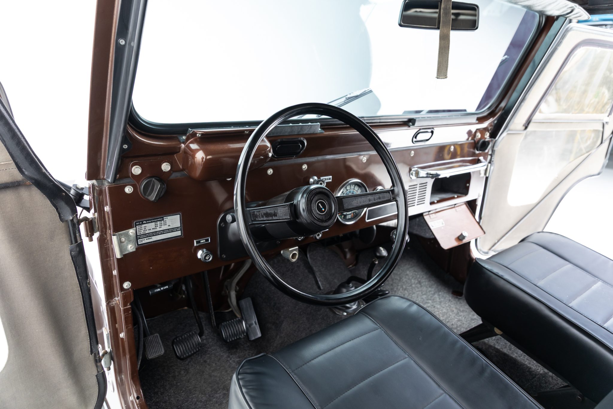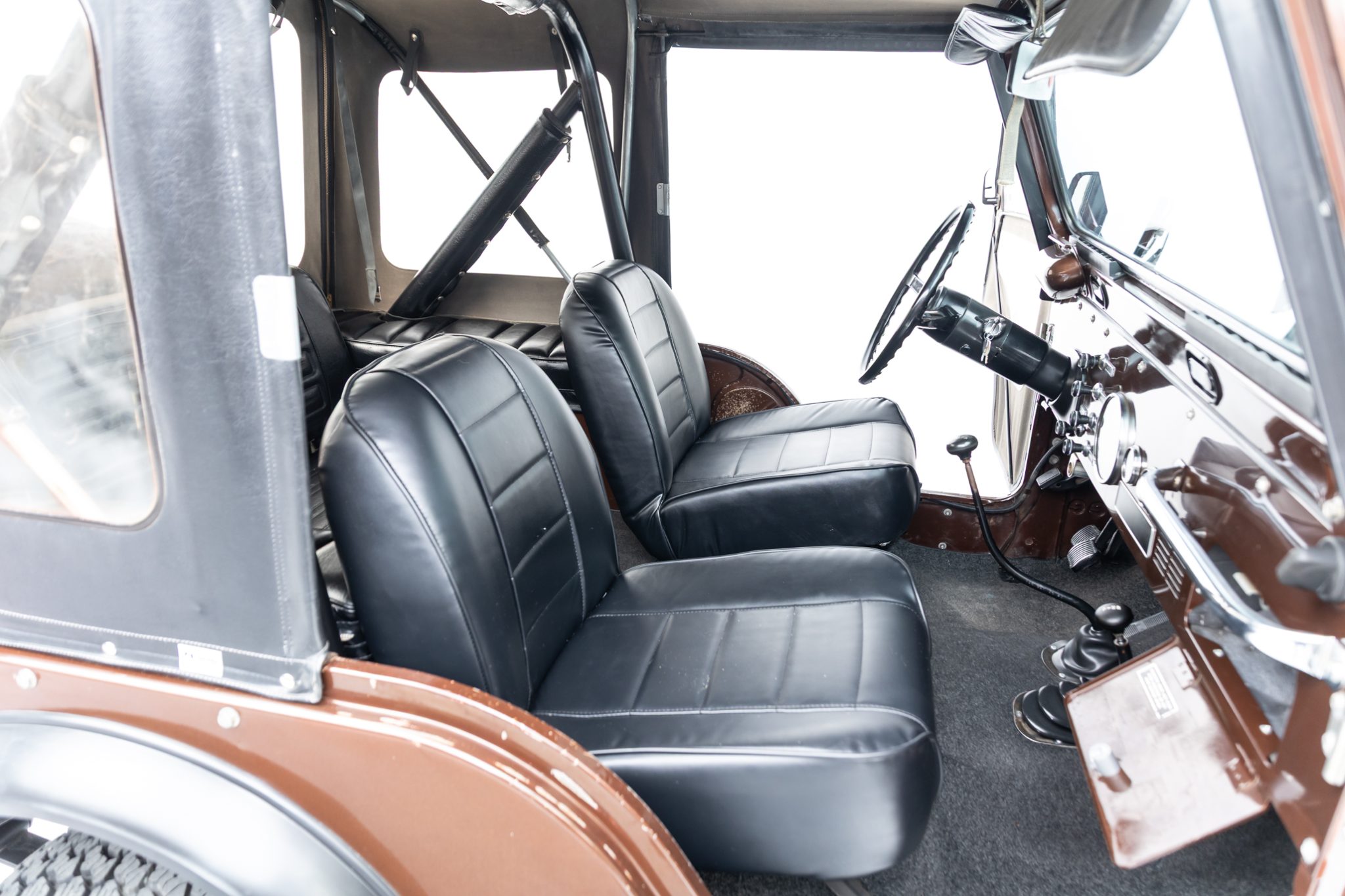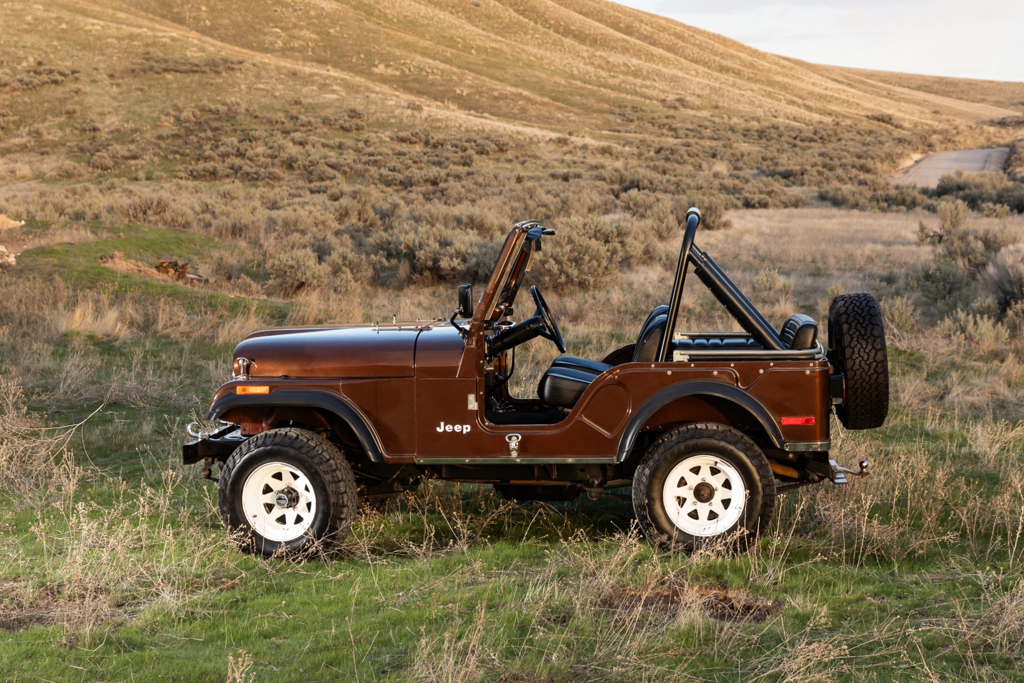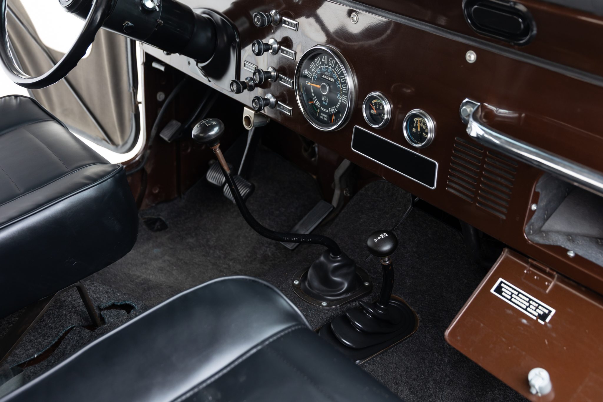 Now showing 41k miles, the truck is finished in Mocha Brown over black vinyl and is powered by a 258ci inline-six linked to a four-speed manual transmission and a dual-range transfer case. Equipment includes manually locking hubs, 15″ wheels, a removable black soft top and doors, a fold-down windshield, a roll bar, a rear bench seat, seat belts, and a tow ball.
