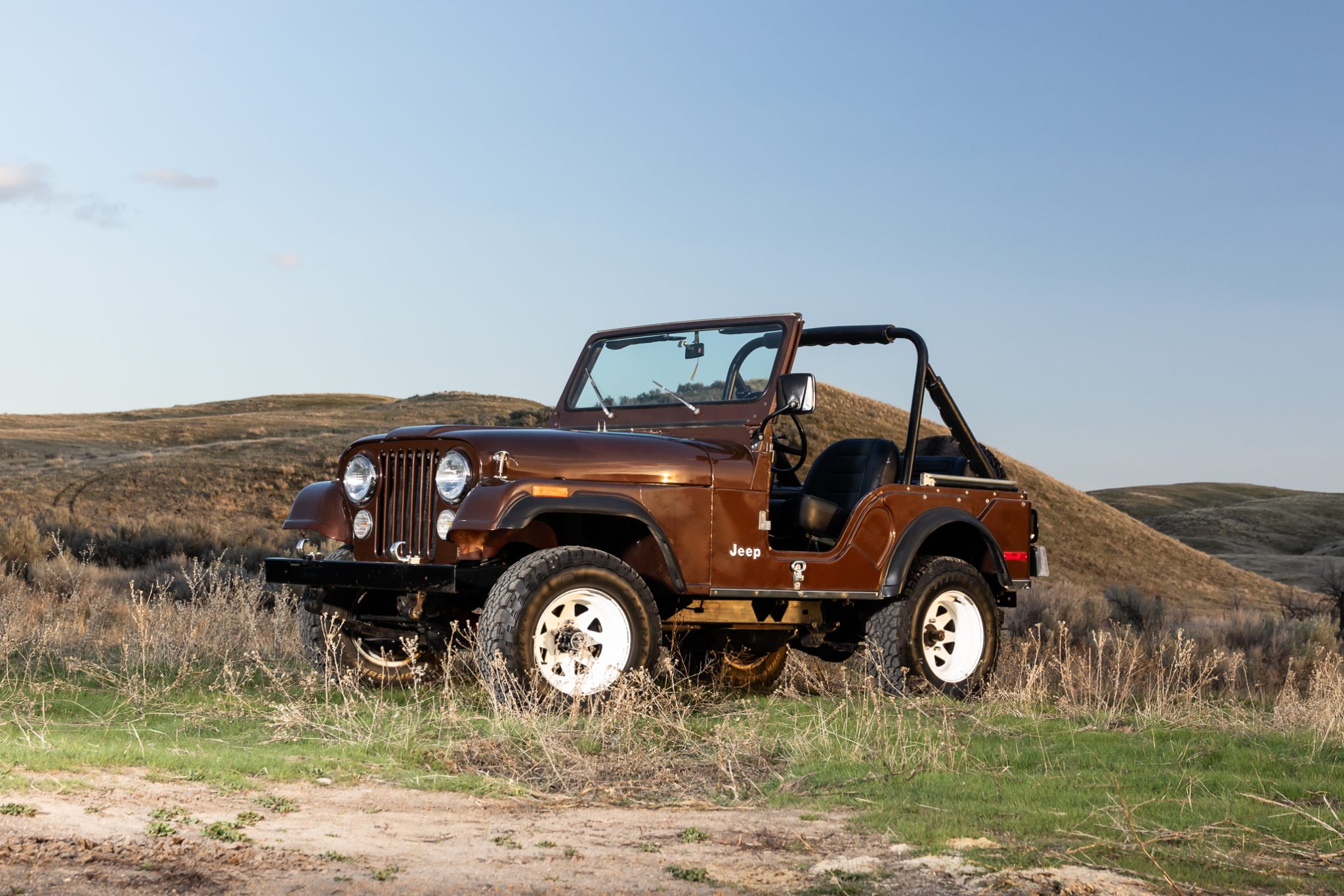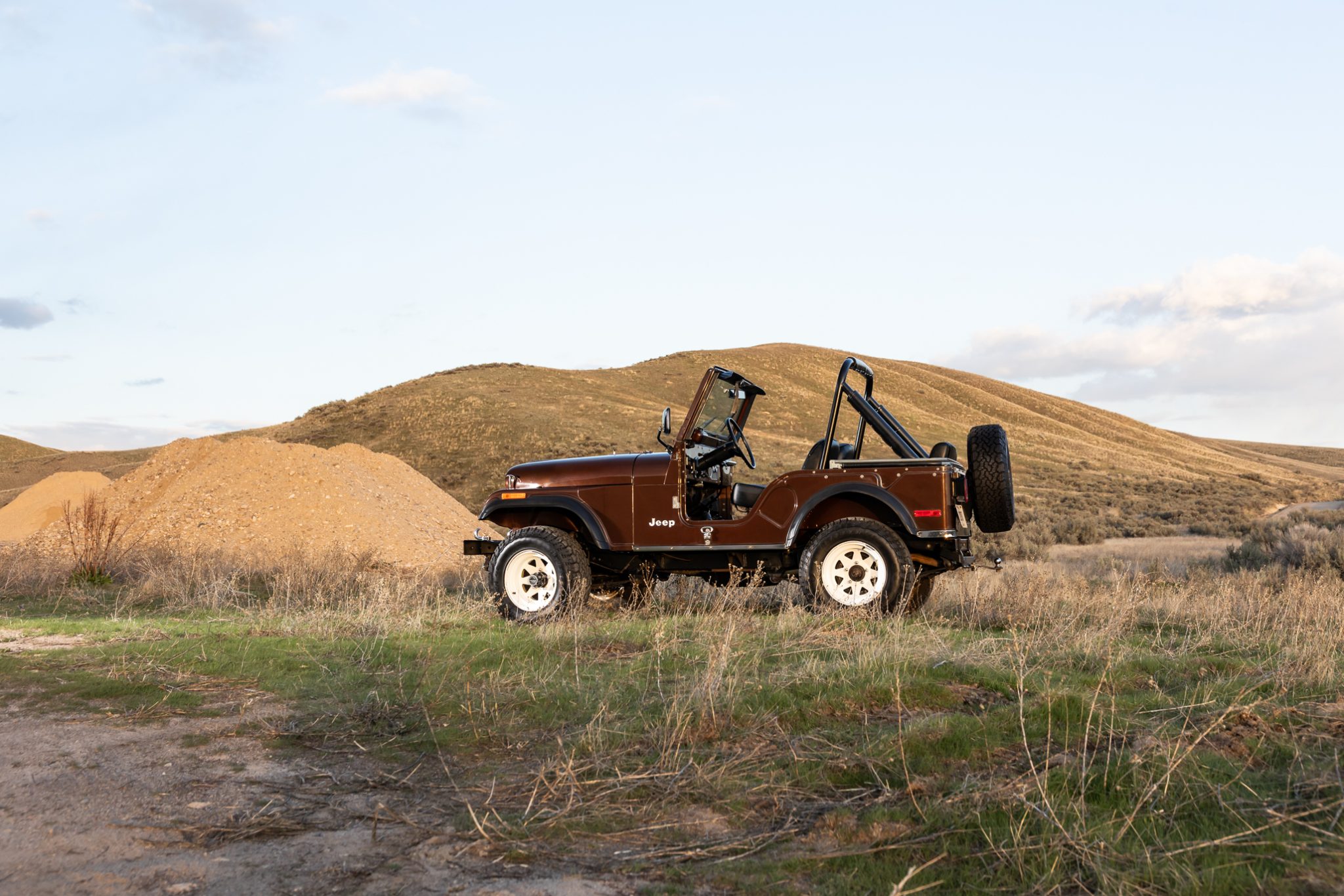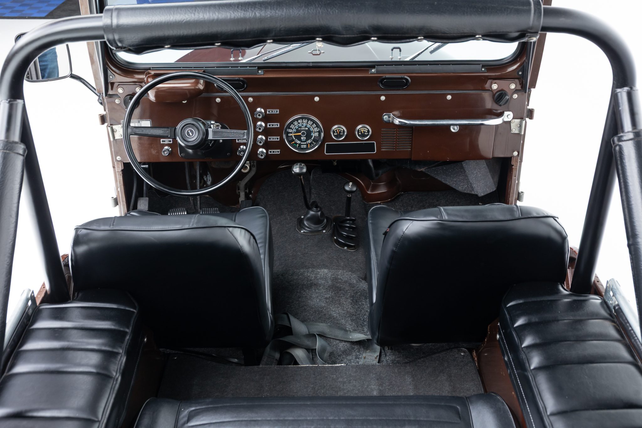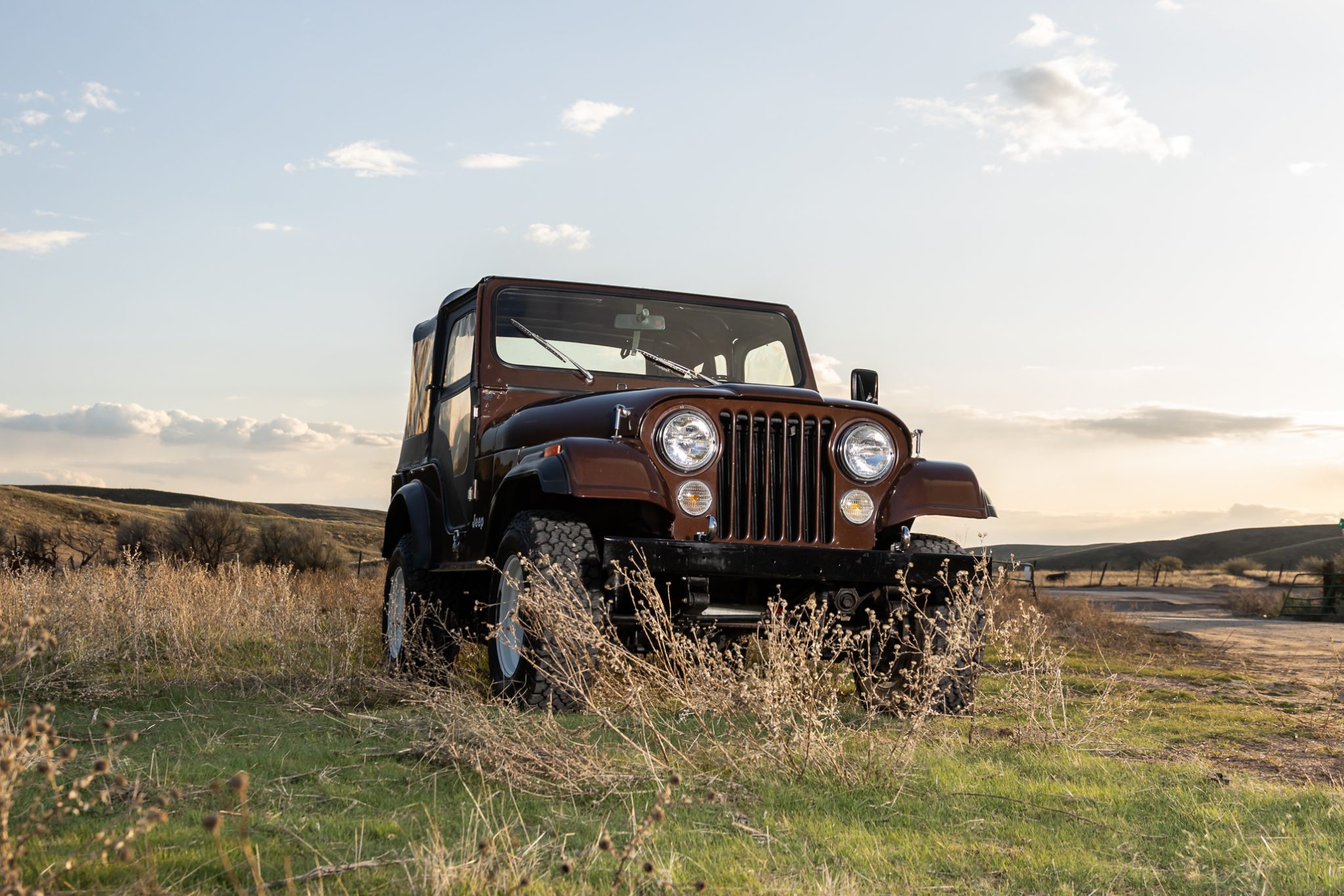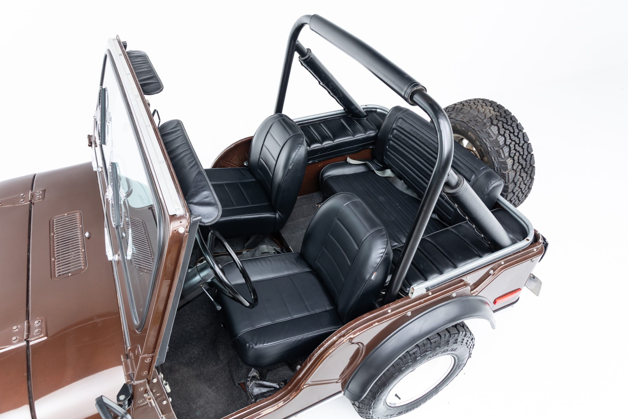 Now showing 41k miles, the truck is finished in Mocha Brown over black vinyl and is powered by a 258ci inline-six linked to a four-speed manual transmission and a dual-range transfer case. Equipment includes manually locking hubs, 15″ wheels, a removable black soft top and doors, a fold-down windshield, a roll bar, a rear bench seat, seat belts, and a tow ball.