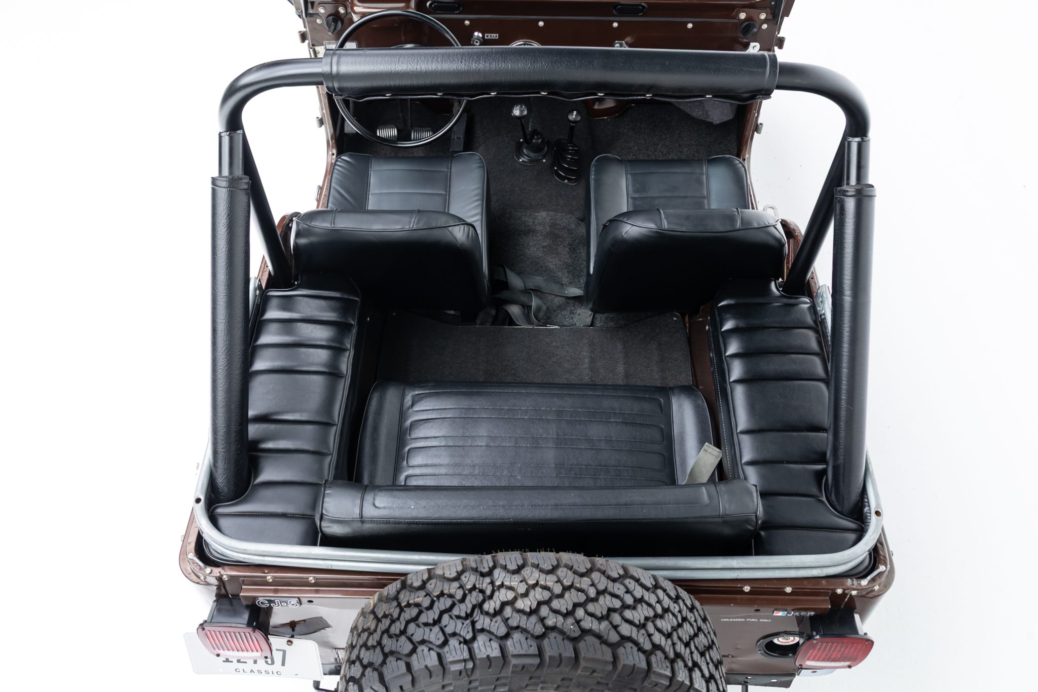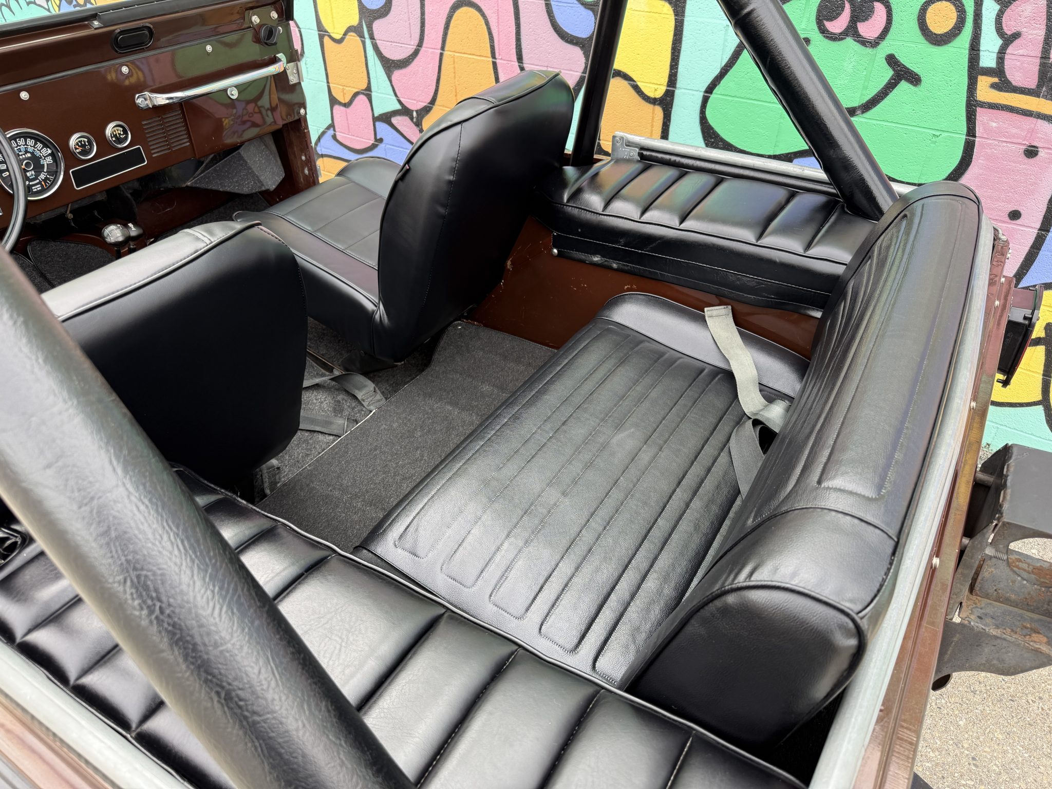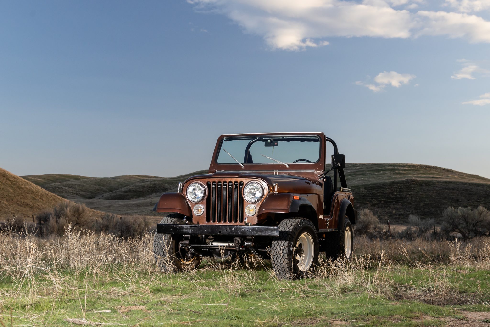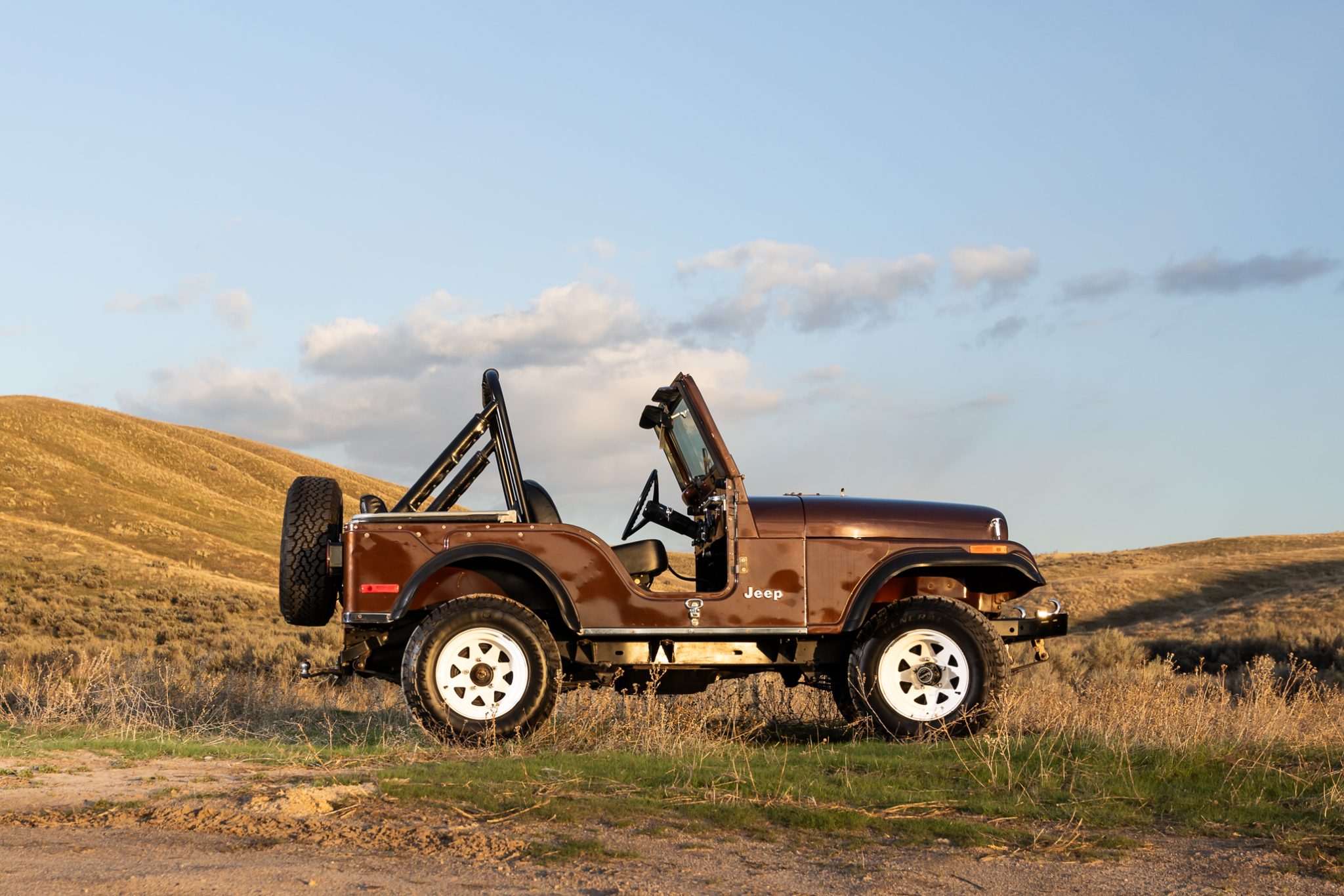 Now showing 41k miles, the truck is finished in Mocha Brown over black vinyl and is powered by a 258ci inline-six linked to a four-speed manual transmission and a dual-range transfer case. Equipment includes manually locking hubs, 15″ wheels, a removable black soft top and doors, a fold-down windshield, a roll bar, a rear bench seat, seat belts, and a tow ball.