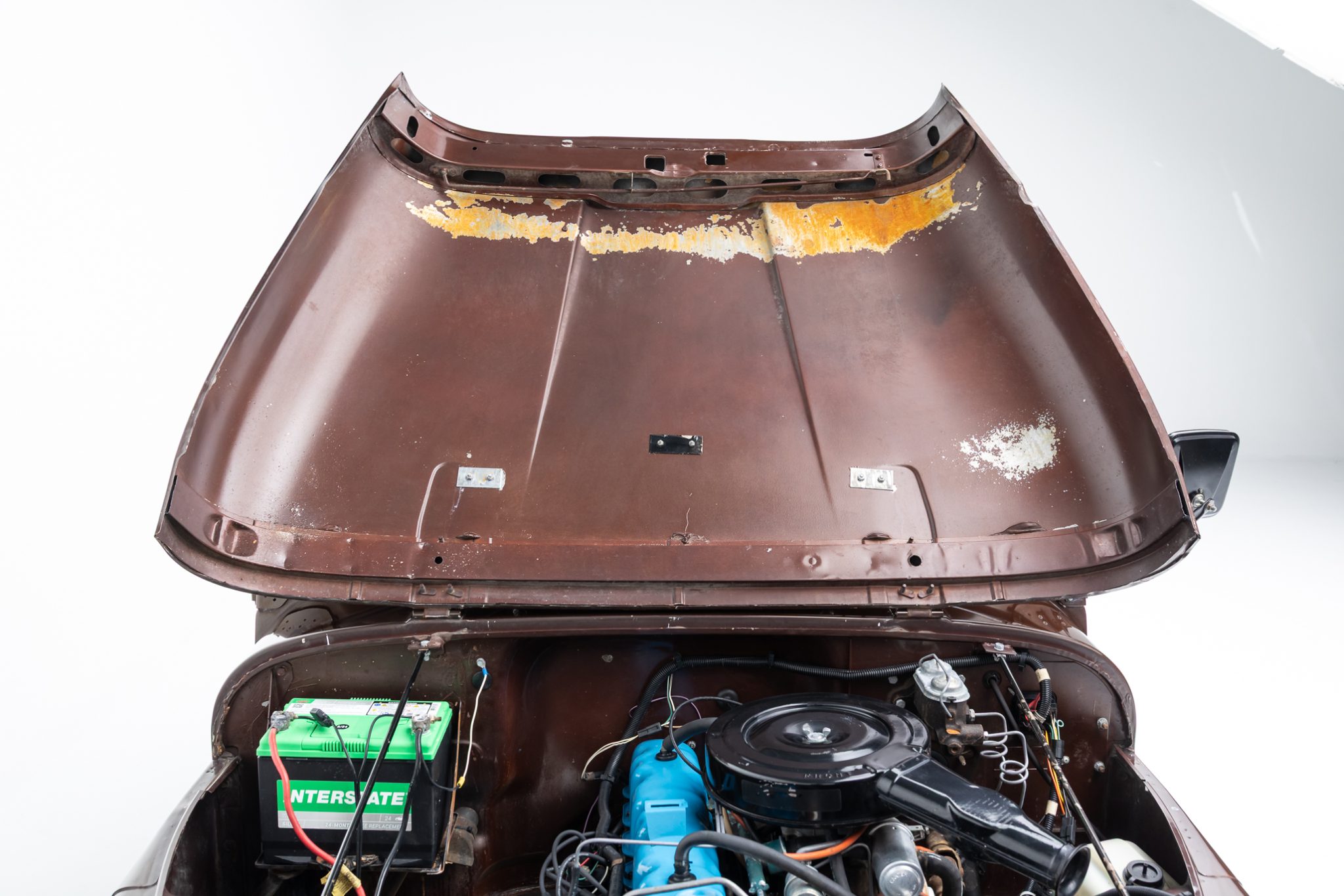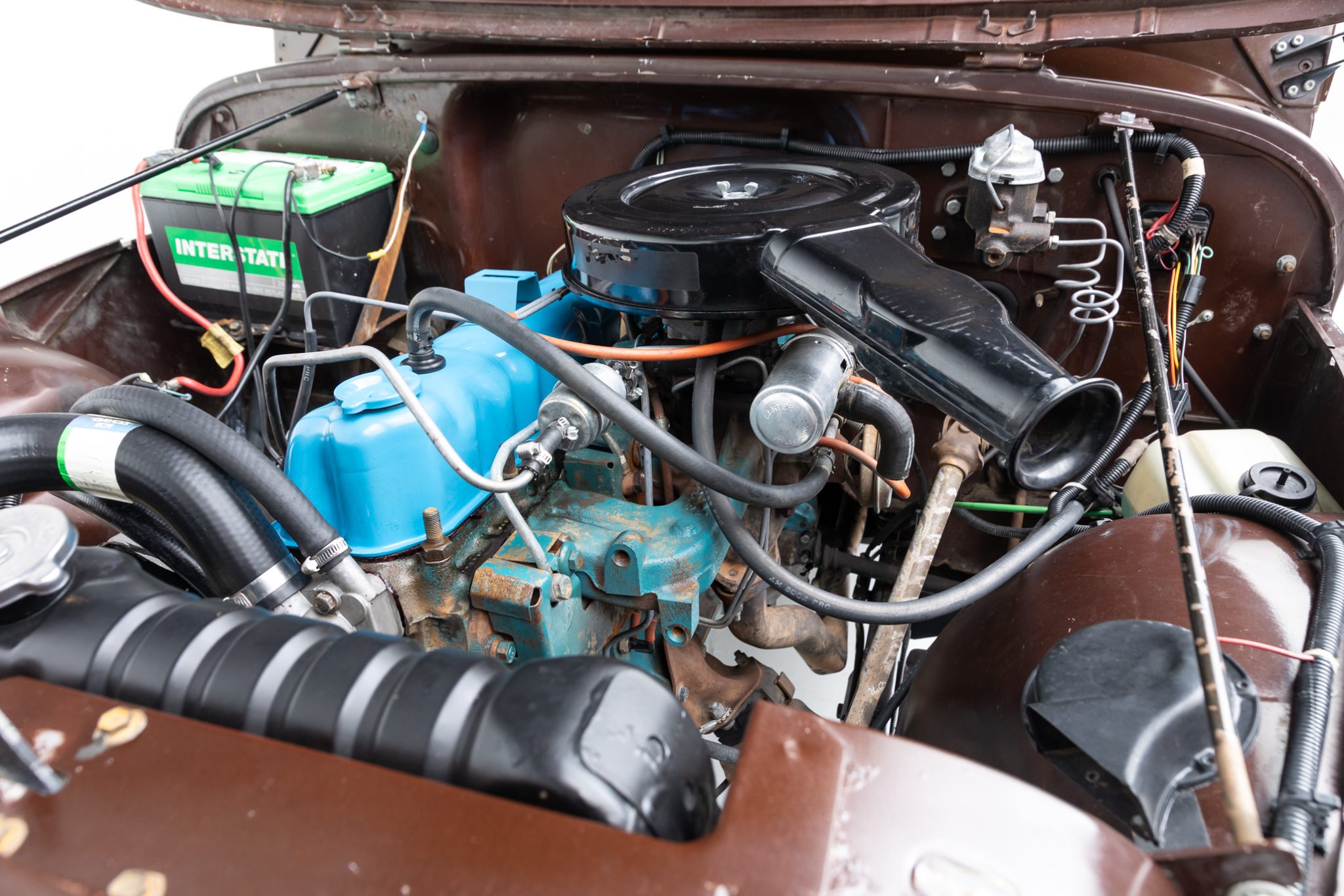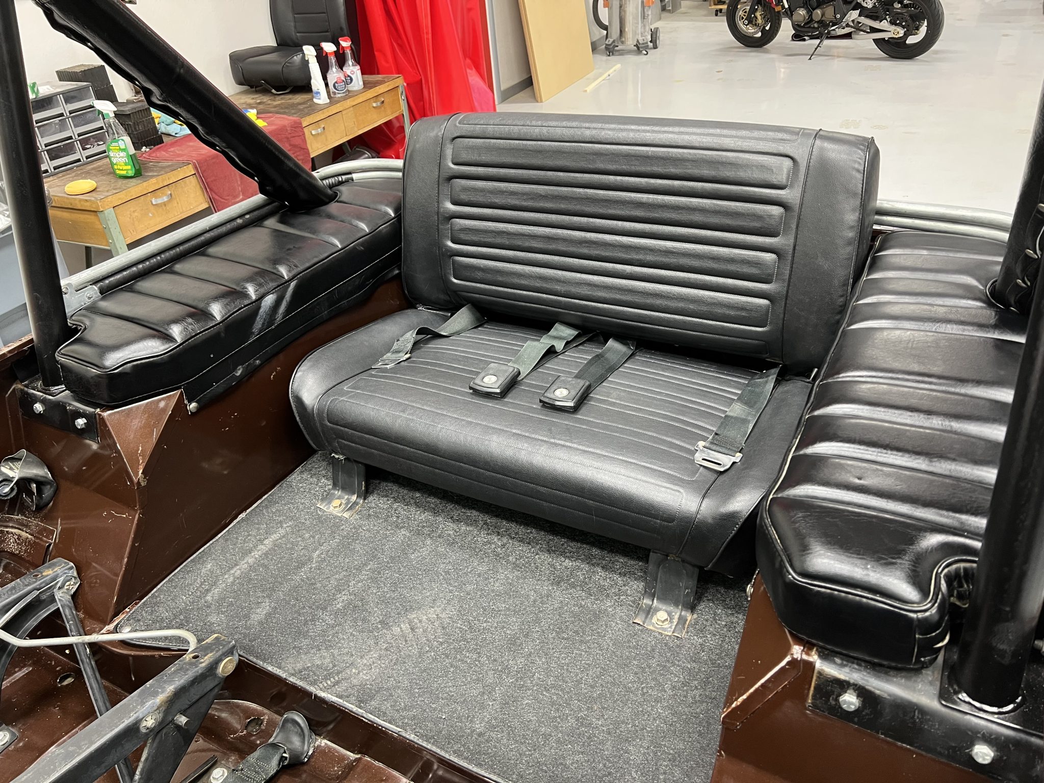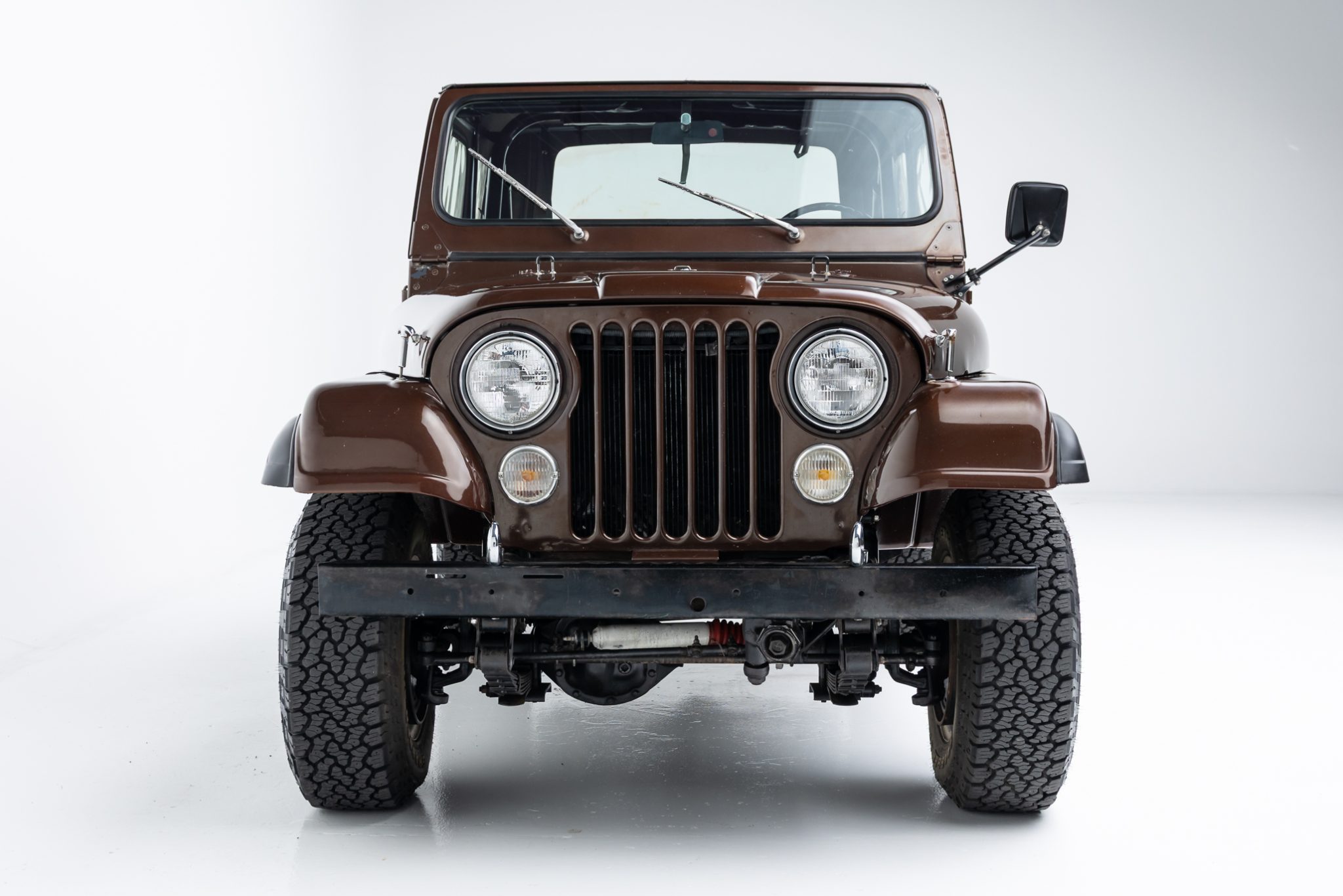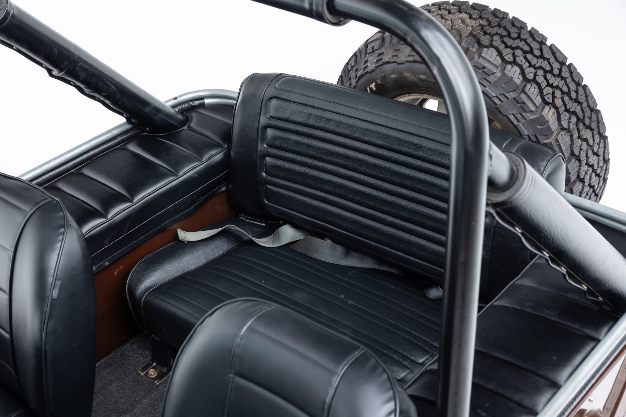 Now showing 41k miles, the truck is finished in Mocha Brown over black vinyl and is powered by a 258ci inline-six linked to a four-speed manual transmission and a dual-range transfer case. Equipment includes manually locking hubs, 15″ wheels, a removable black soft top and doors, a fold-down windshield, a roll bar, a rear bench seat, seat belts, and a tow ball.