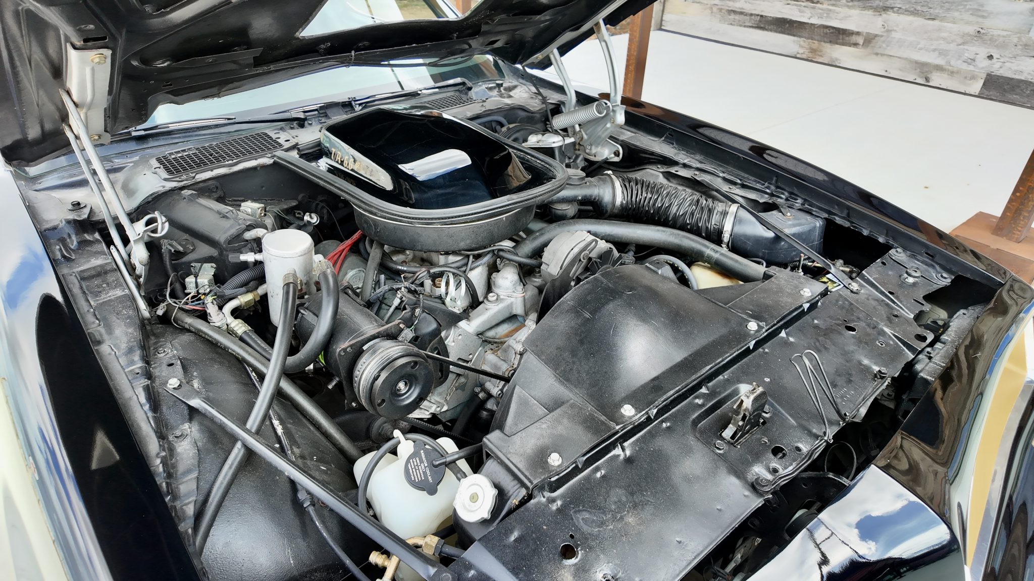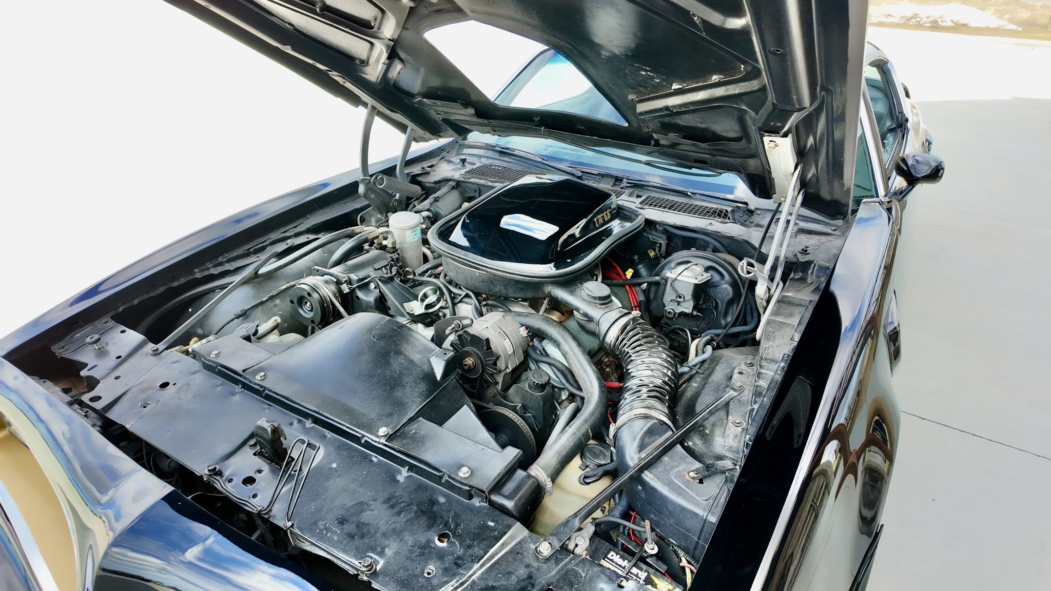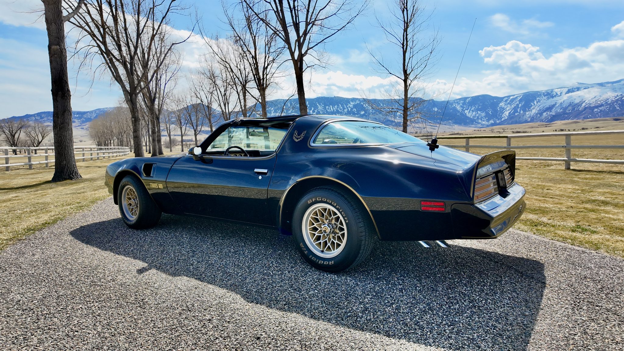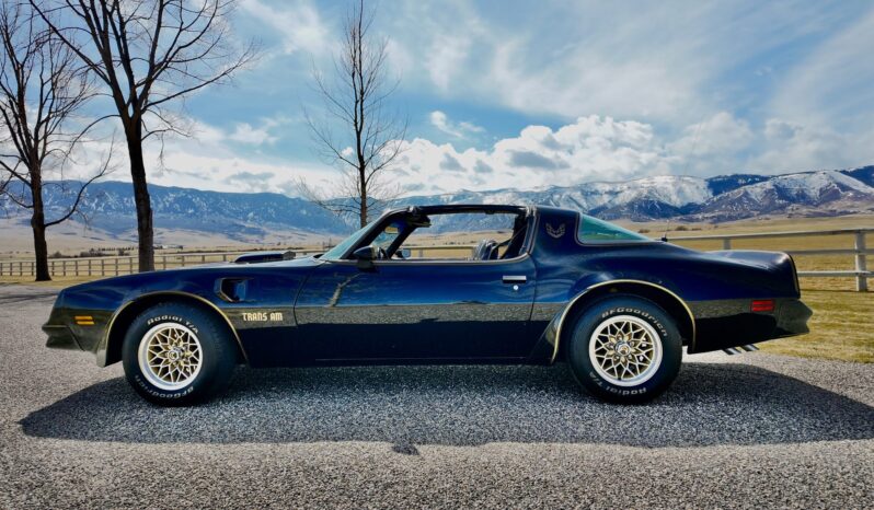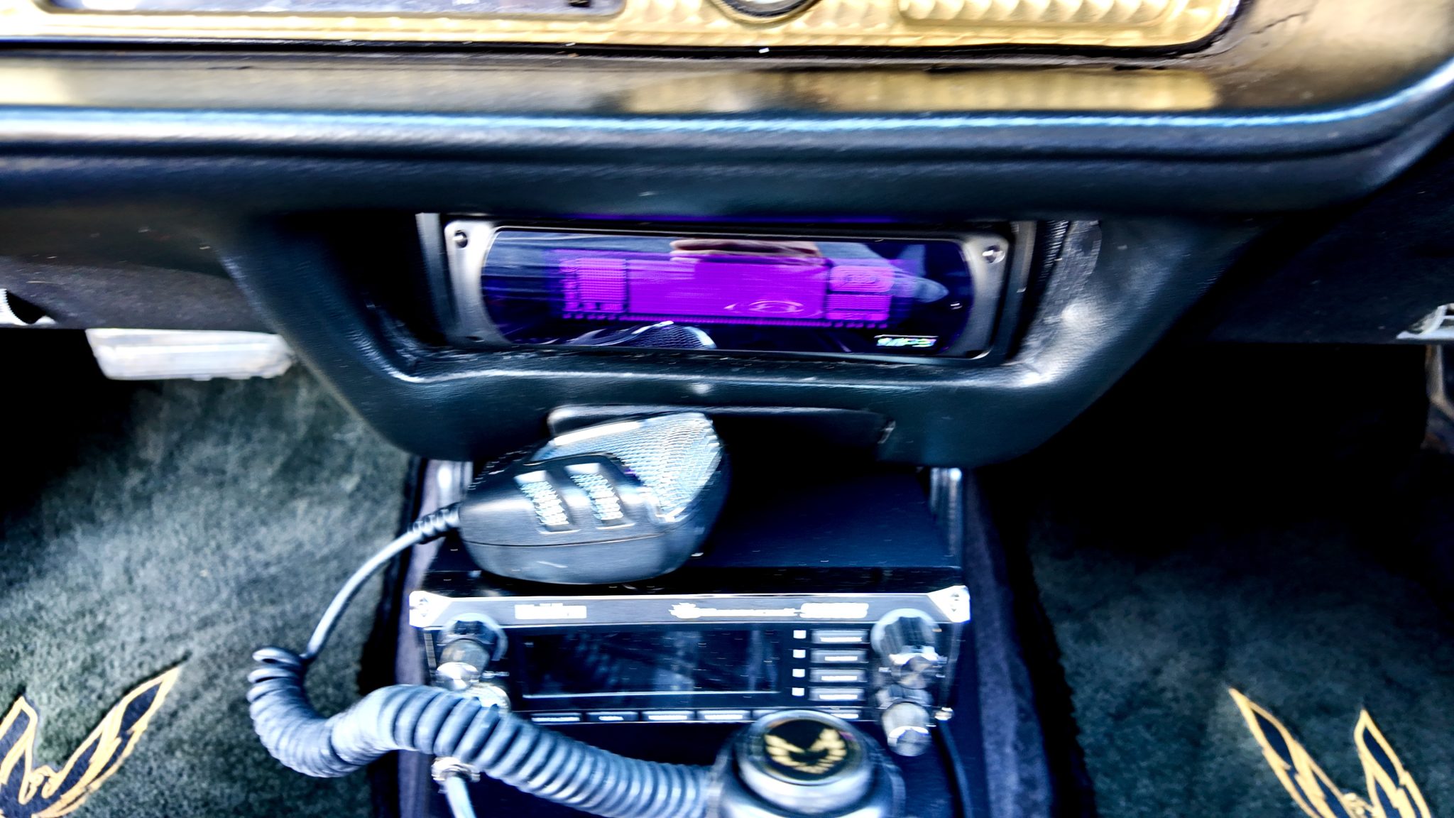 This 1977 Pontiac Firebird Trans Am was refurbished and is refinished in black over black vinyl. Power is provided by a 400ci V8 linked with a three-speed automatic transmission and a Safe-T-Track limited-slip differential. Equipment includes removable t-top roof panels, a shaker hood, 15″ gold-finished snowflake wheels, power steering, a CD stereo, a CB radio, and air conditioning.