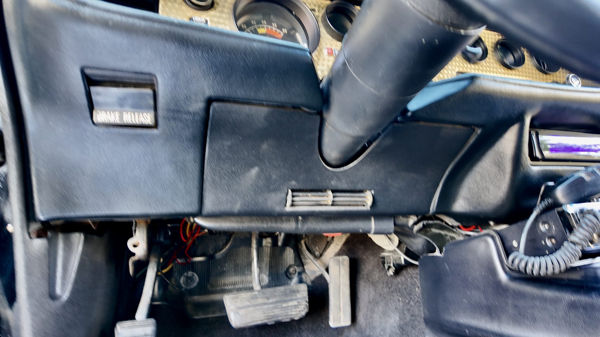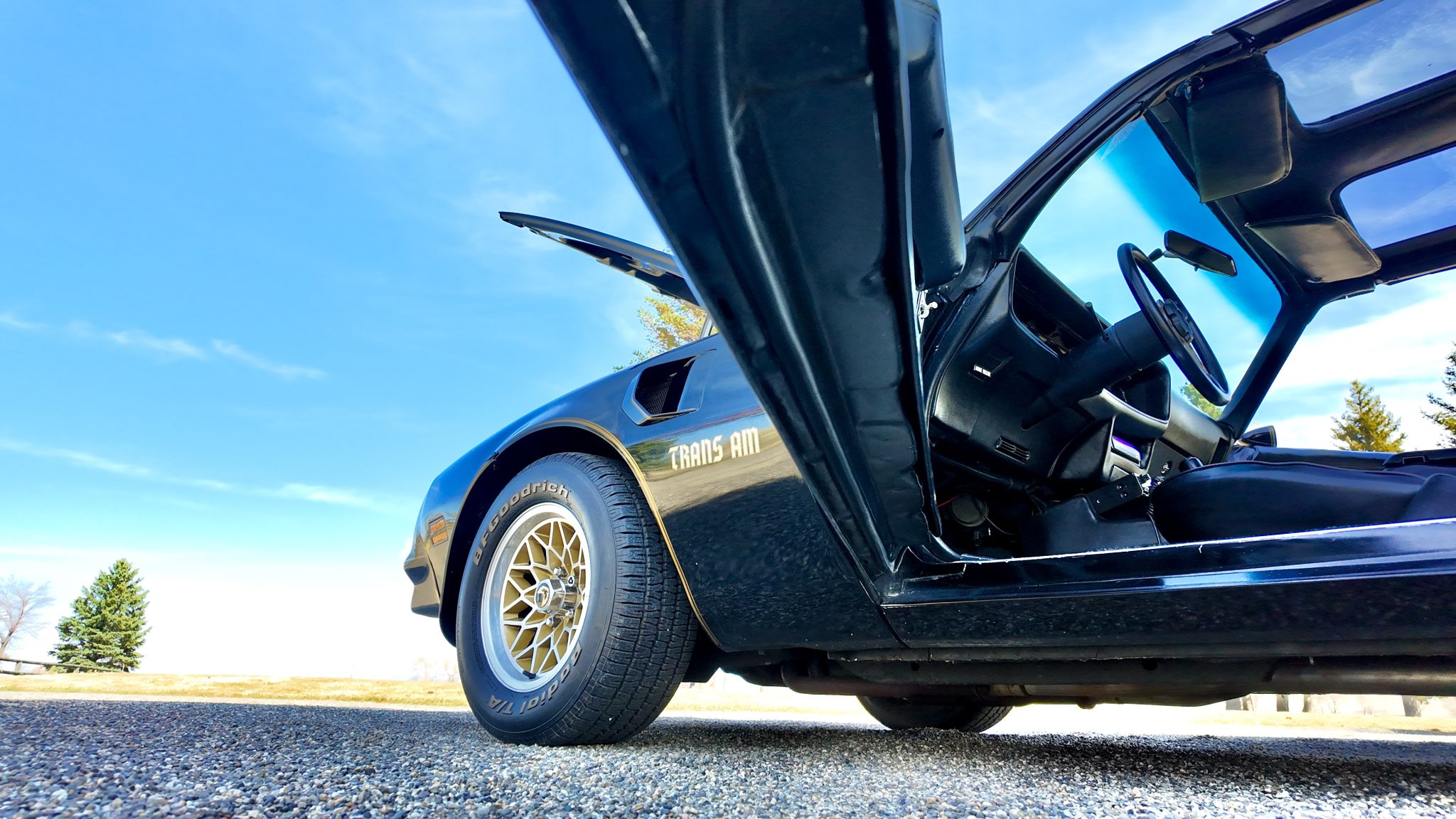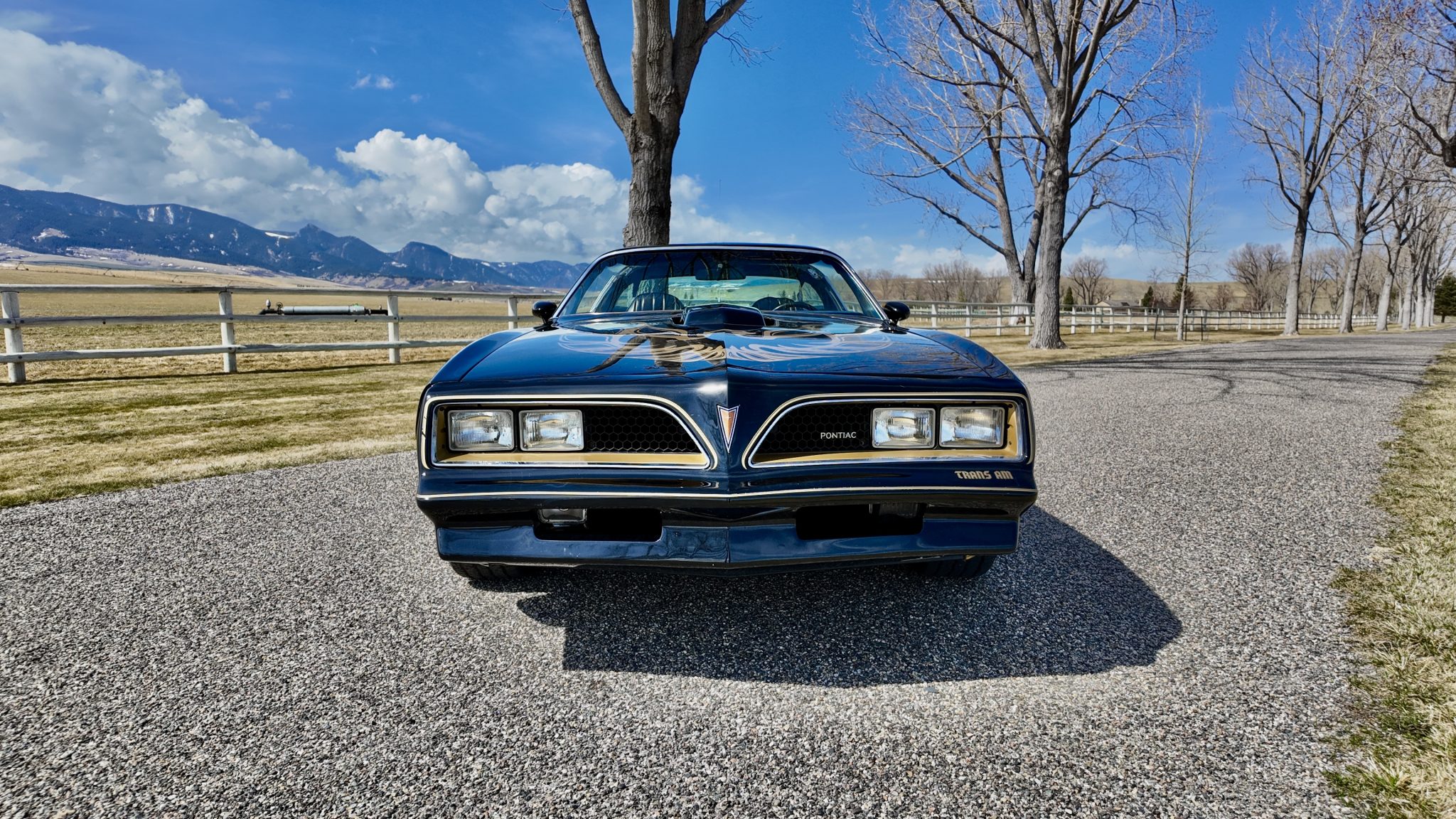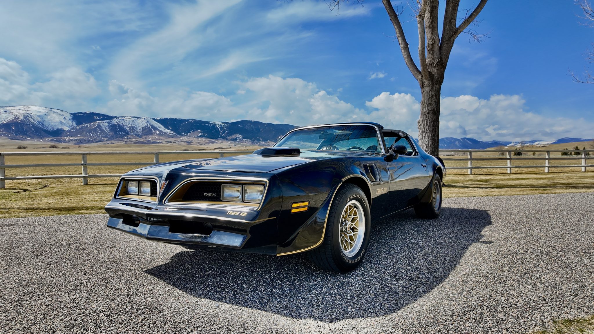 This 1977 Pontiac Firebird Trans Am was refurbished and is refinished in black over black vinyl. Power is provided by a 400ci V8 linked with a three-speed automatic transmission and a Safe-T-Track limited-slip differential. Equipment includes removable t-top roof panels, a shaker hood, 15″ gold-finished snowflake wheels, power steering, a CD stereo, a CB radio, and air conditioning.