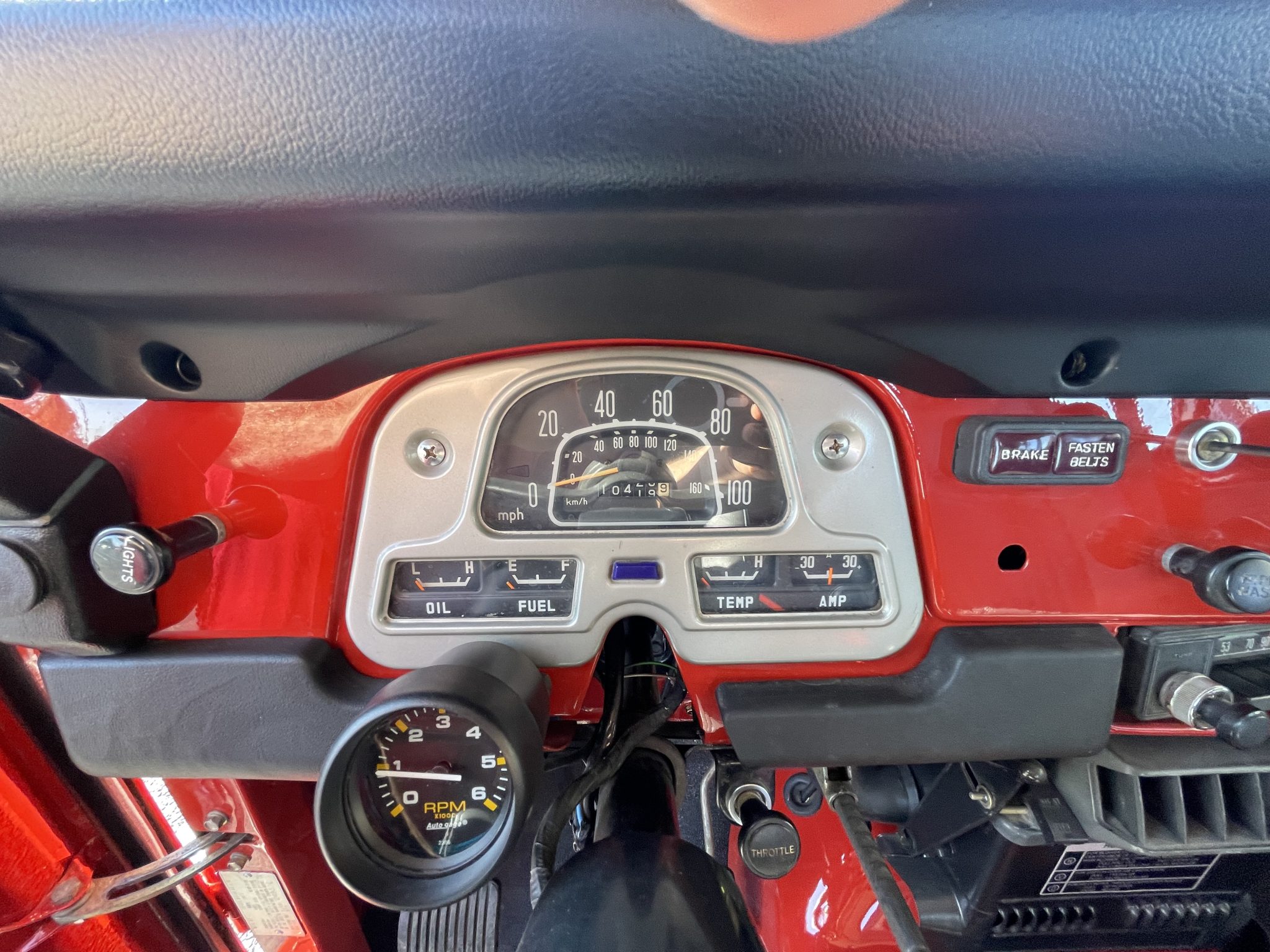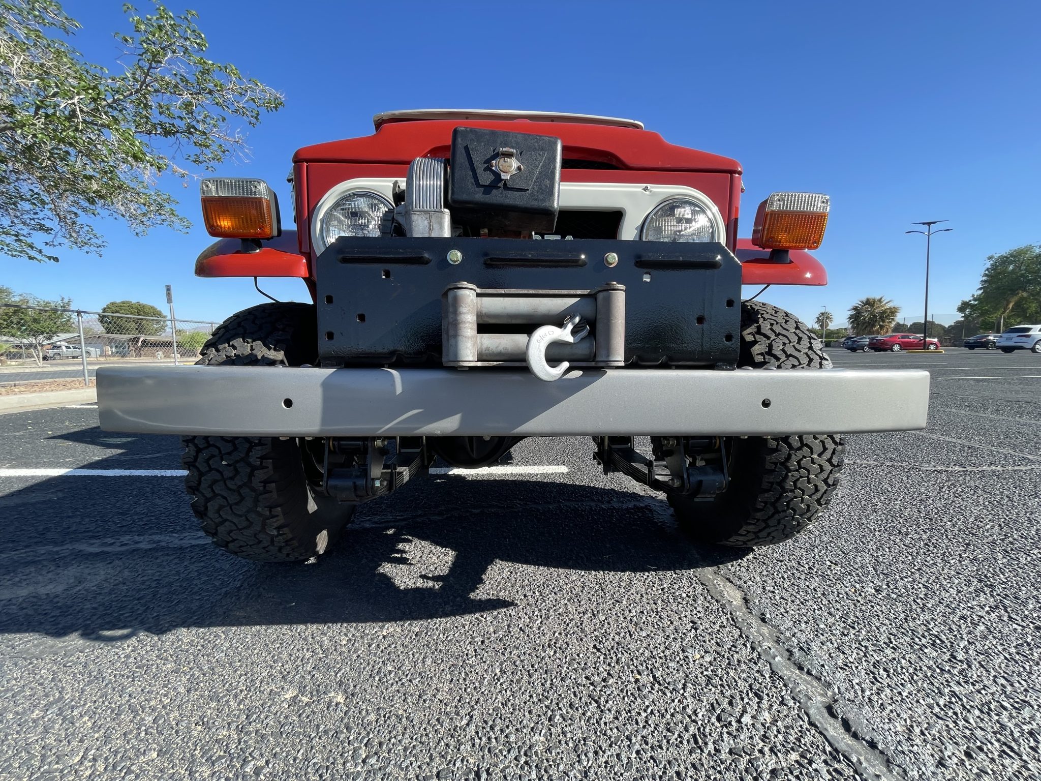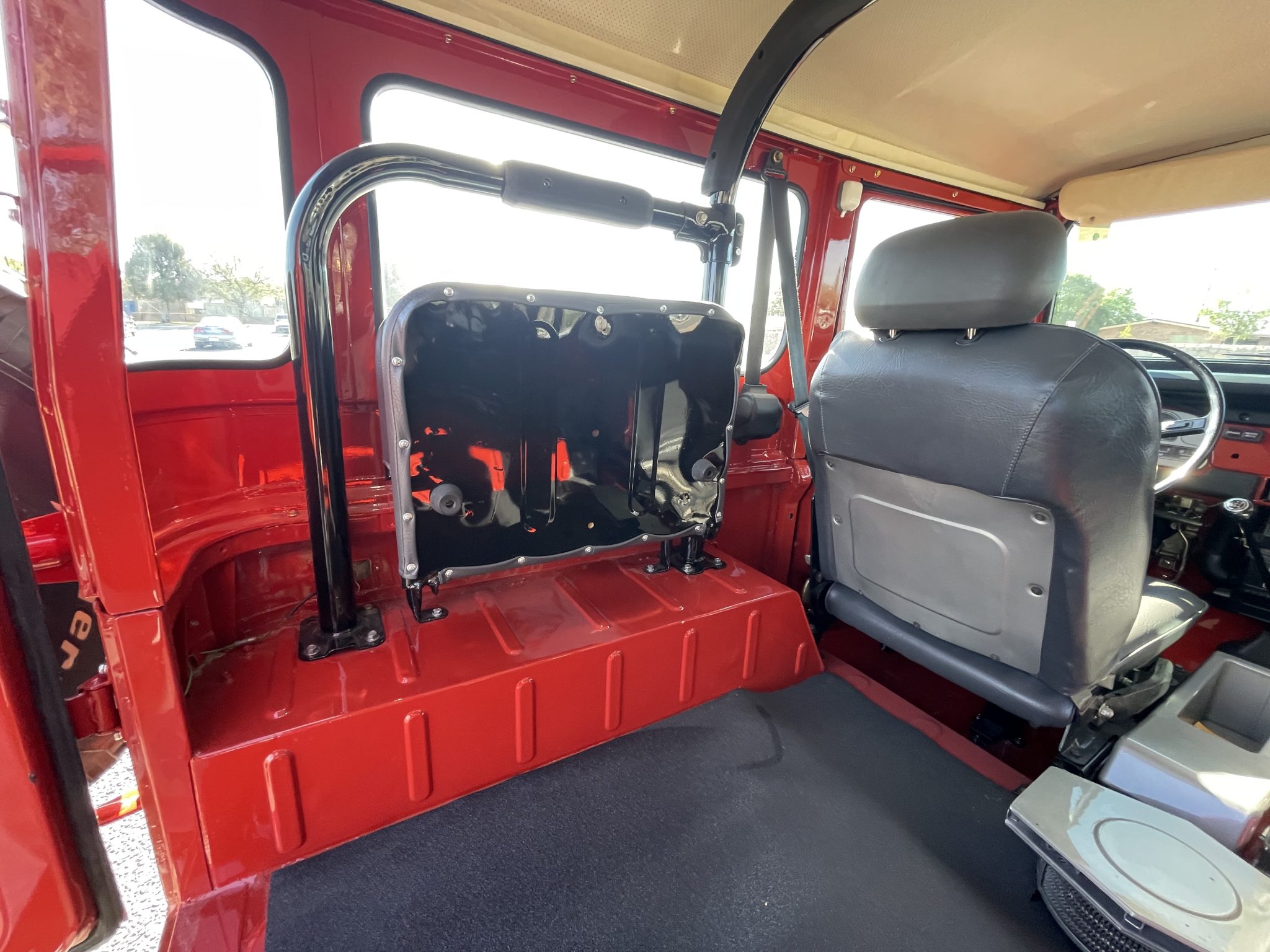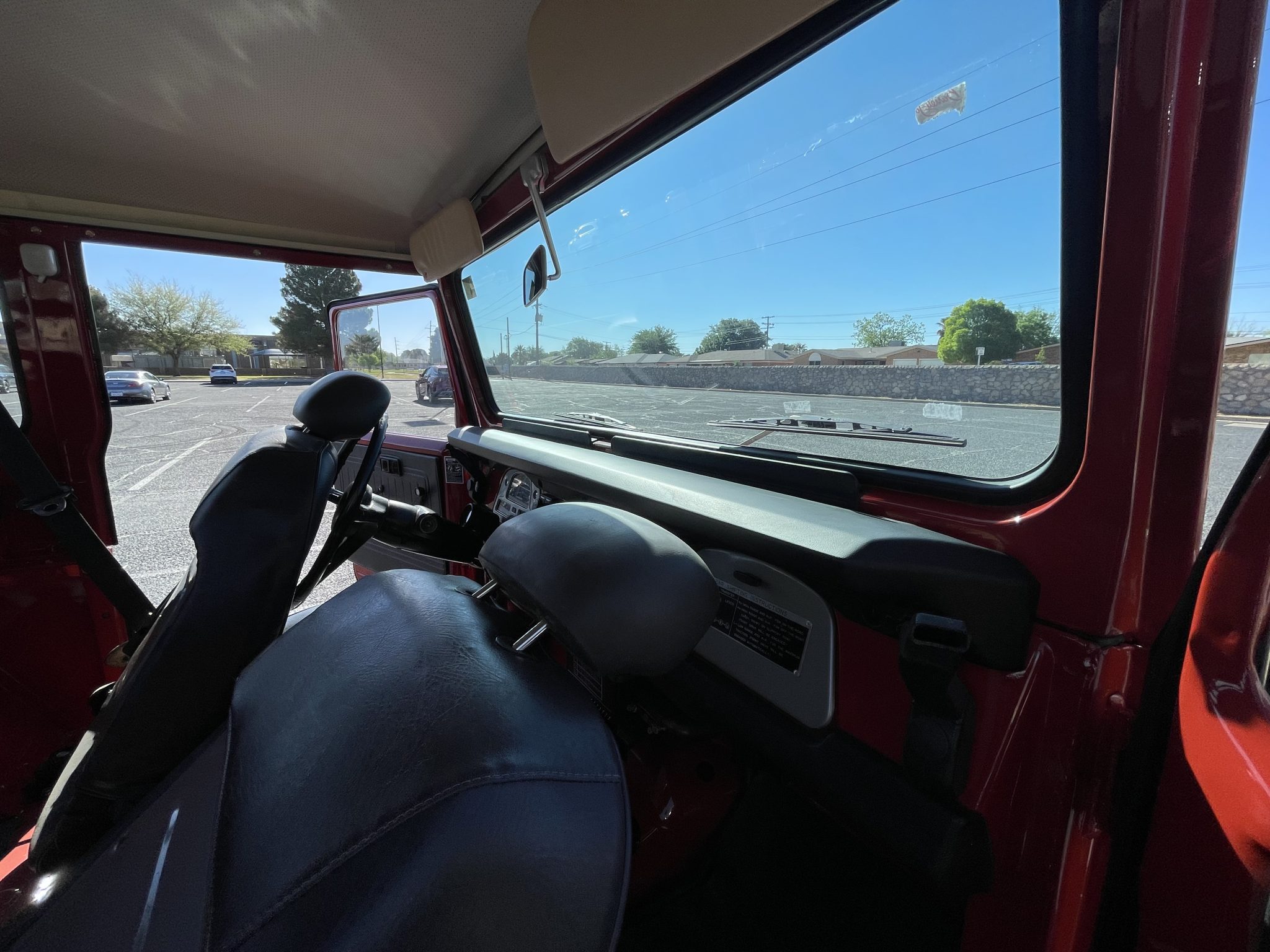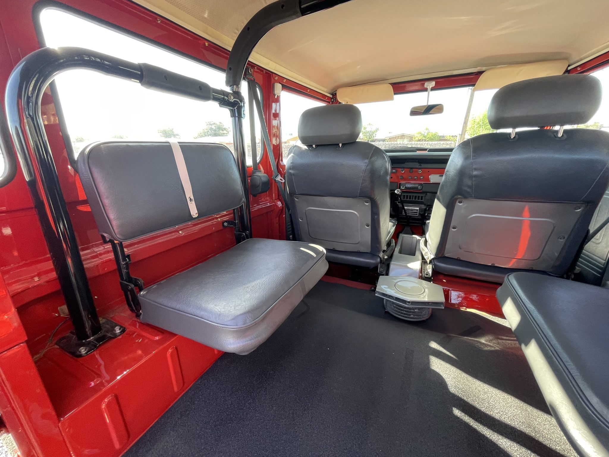 Finished in Freeborn Red over gray vinyl upholstery, the truck is powered by a 4.2-liter inline-six linked with a four-speed manual transmission and a dual-range transfer case. Equipment includes a removable hardtop with a white roof as well as manually locking front hubs, an Old Man Emu suspension, front disc brakes, 15″ steel wheels, a winch, ambulance-style rear doors, a roll bar, a cabin heater, crank windows, rear jump seats, and an AM radio.