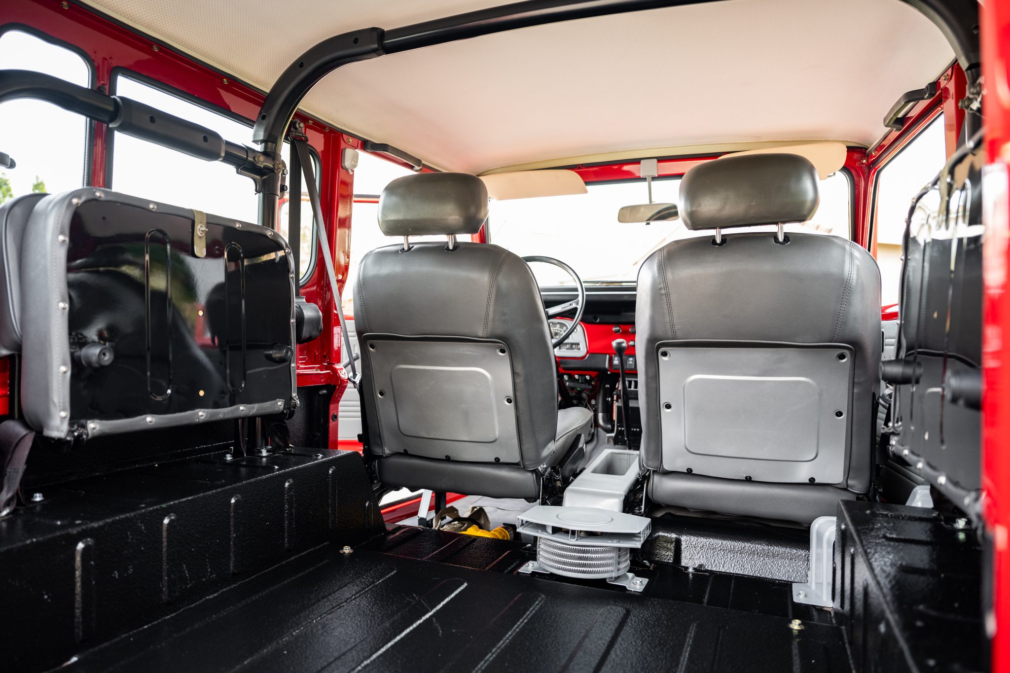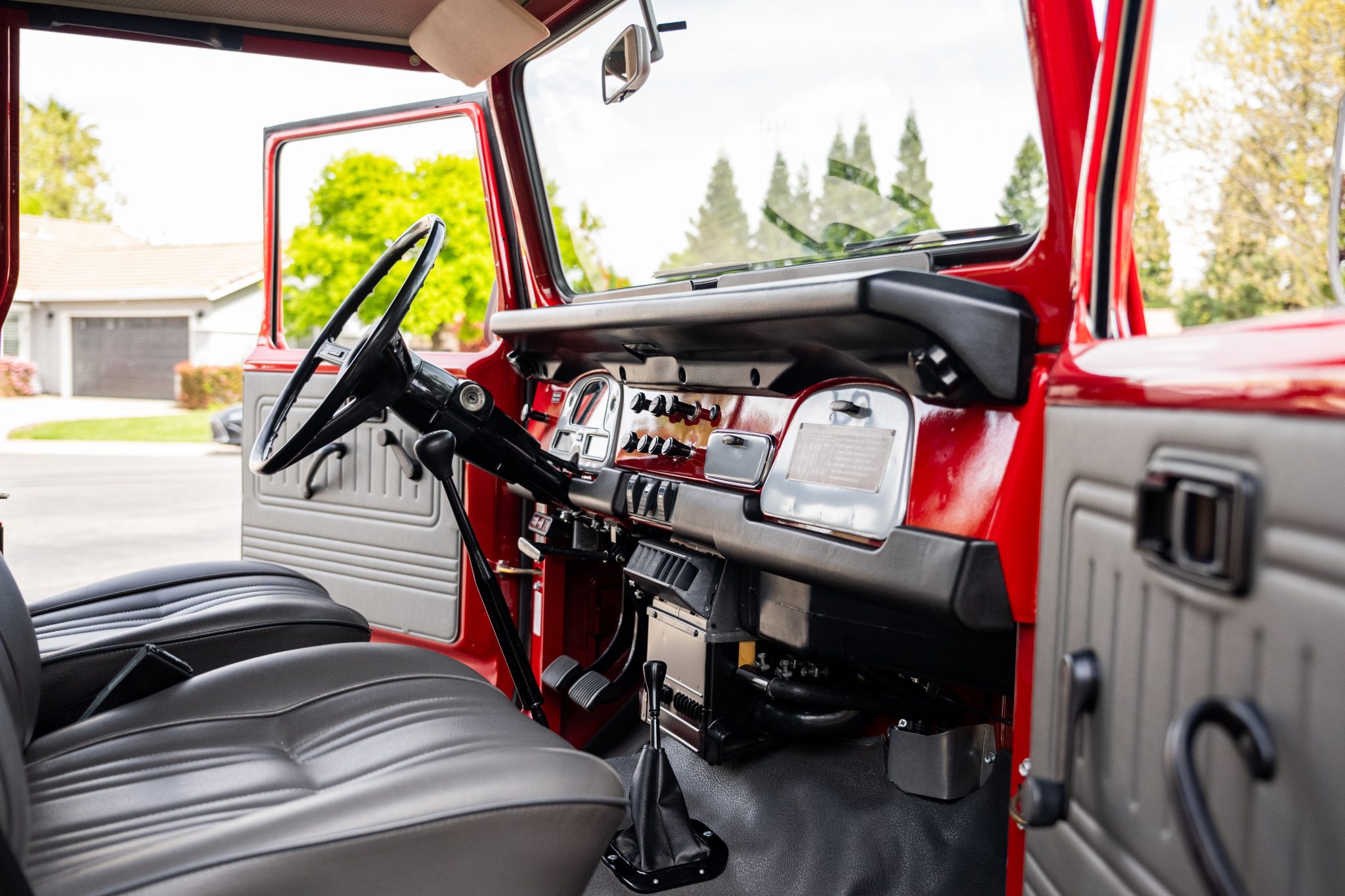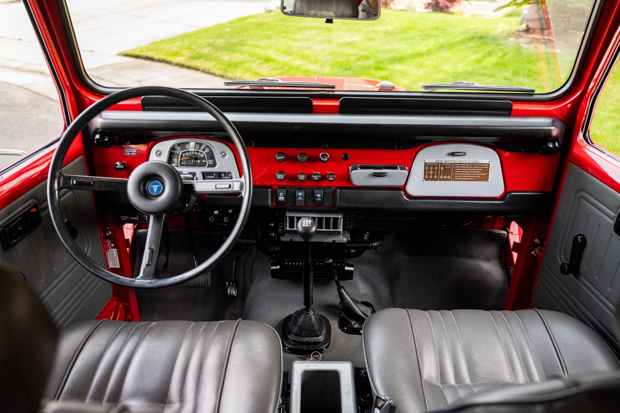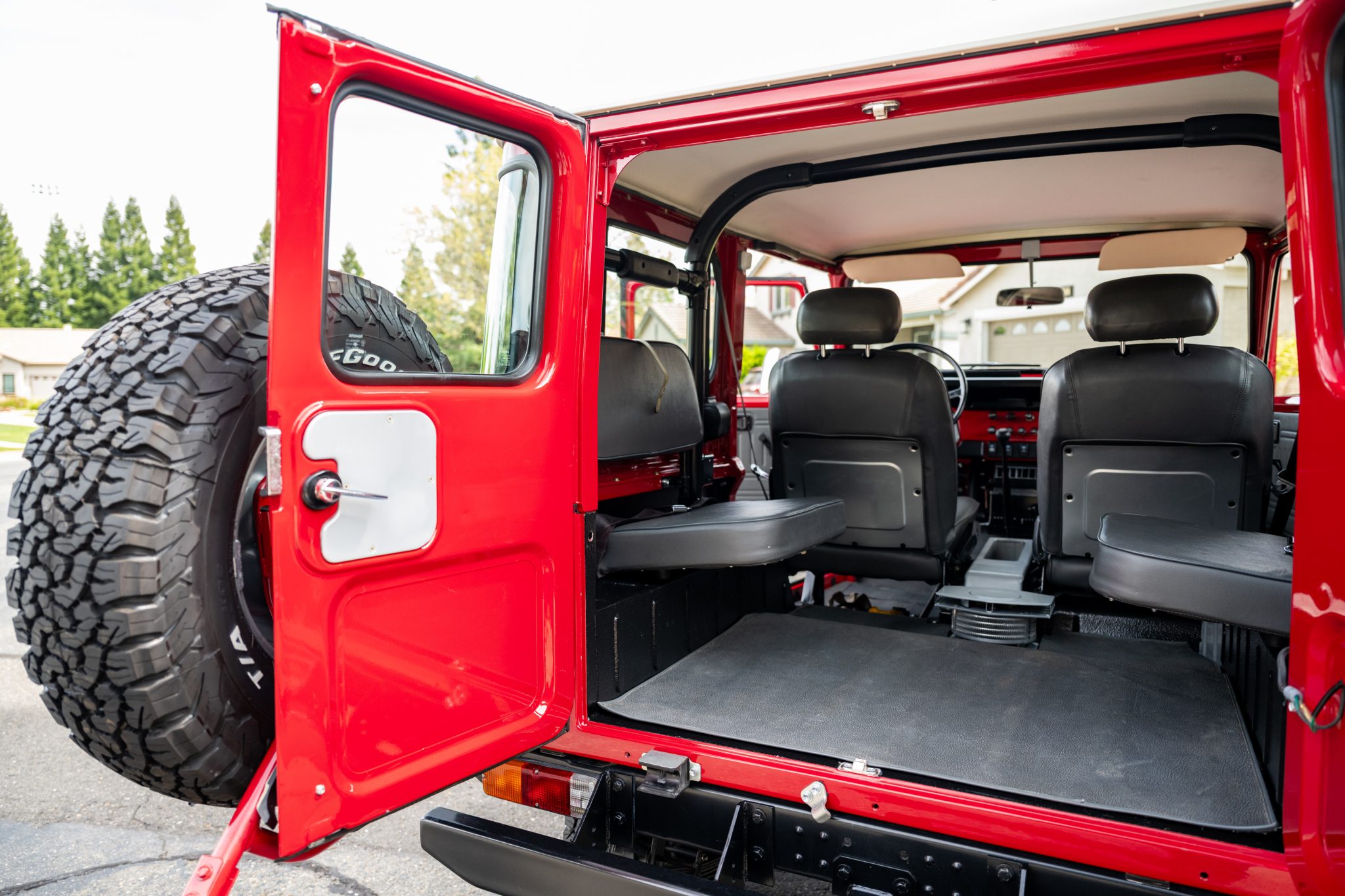 In addition to overhauls of its body, chassis, and interior, the body-off project involved selecting modifications from other Land Cruiser years, models, and markets, and the truck features an H55 five-speed manual transmission, an FJ60 split transfer case, an FJ45 full floating rear axle, four-wheel disc brakes, 1979/80-spec power steering, and a 1980/81-spec block for its 4.2L 2F inline-six. Finished in Freeborn Red with a Cygnus White roof over gray upholstery, it also has Old Man Emu lifted suspension, a front winch, welded 16″ steel wheels, front and rear heaters, and ARB air lockers.