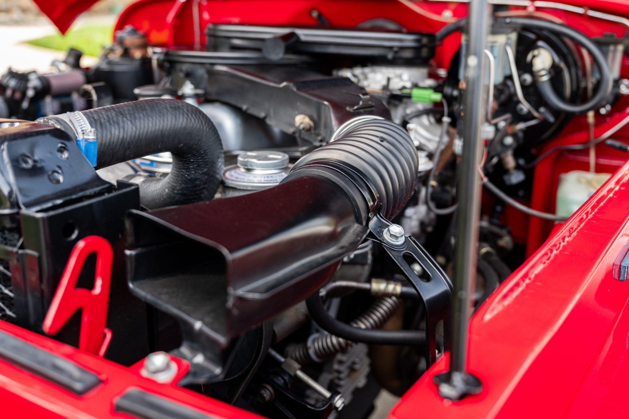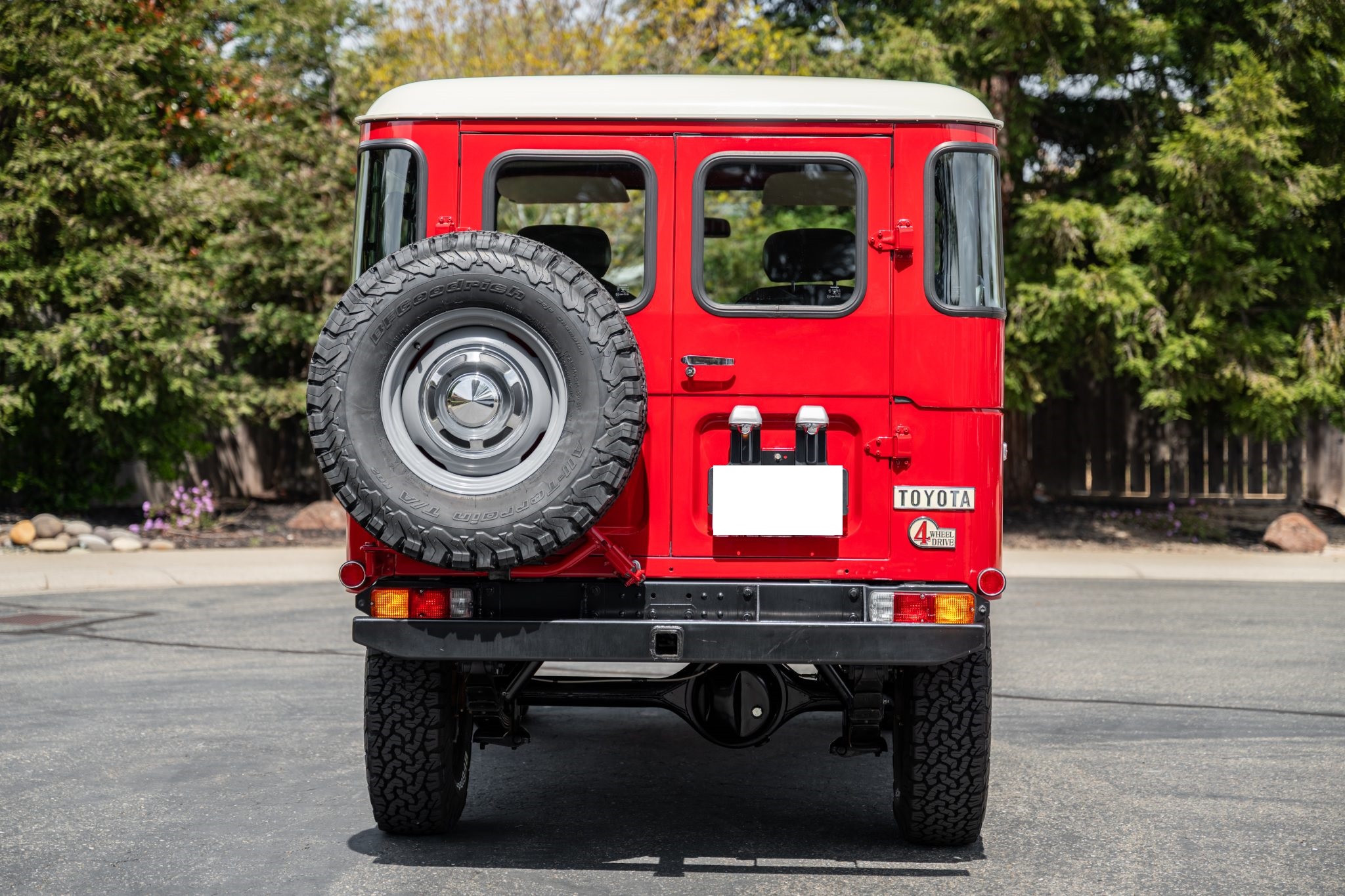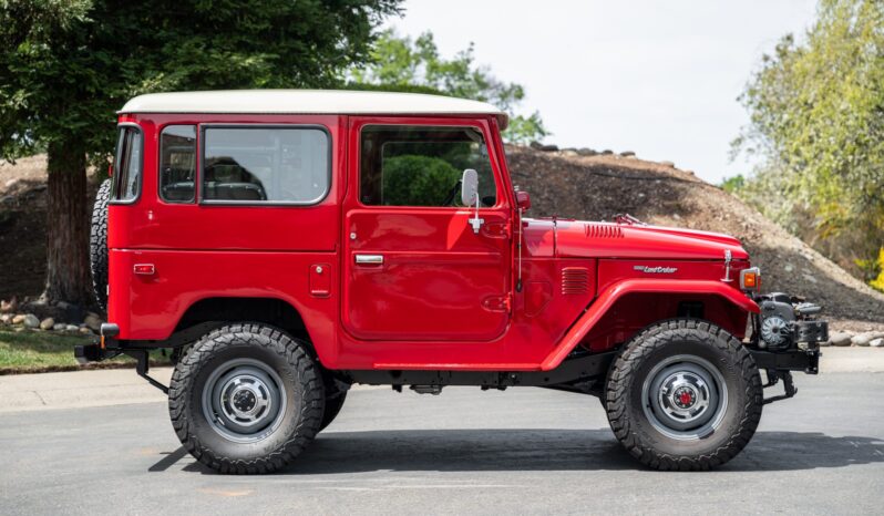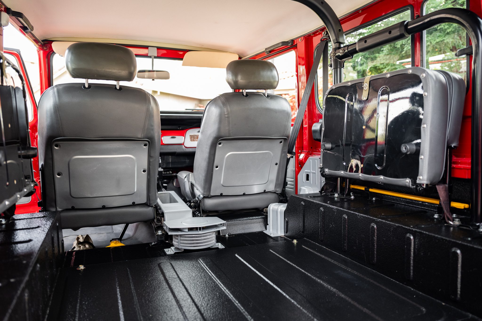 In addition to overhauls of its body, chassis, and interior, the body-off project involved selecting modifications from other Land Cruiser years, models, and markets, and the truck features an H55 five-speed manual transmission, an FJ60 split transfer case, an FJ45 full floating rear axle, four-wheel disc brakes, 1979/80-spec power steering, and a 1980/81-spec block for its 4.2L 2F inline-six. Finished in Freeborn Red with a Cygnus White roof over gray upholstery, it also has Old Man Emu lifted suspension, a front winch, welded 16″ steel wheels, front and rear heaters, and ARB air lockers.