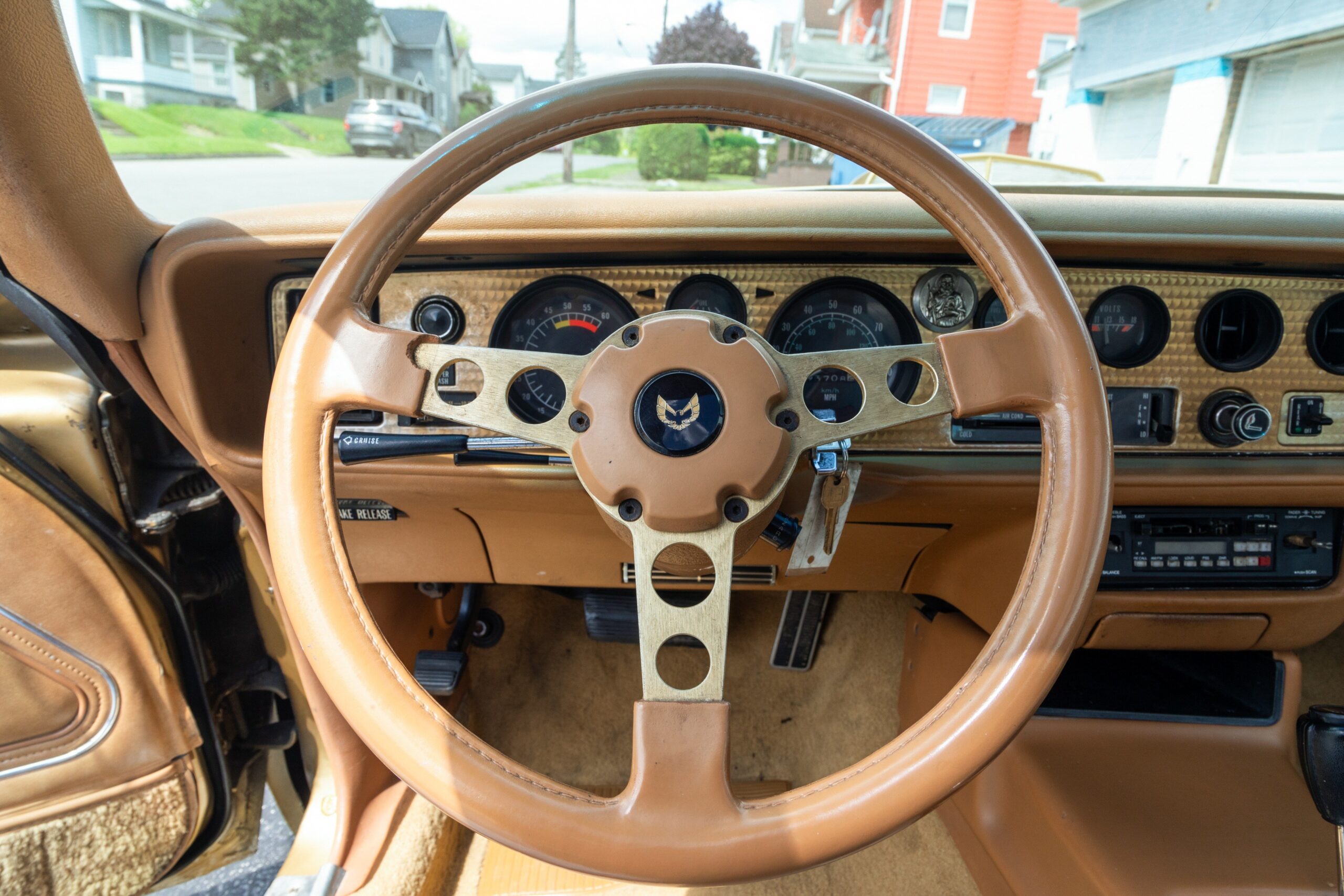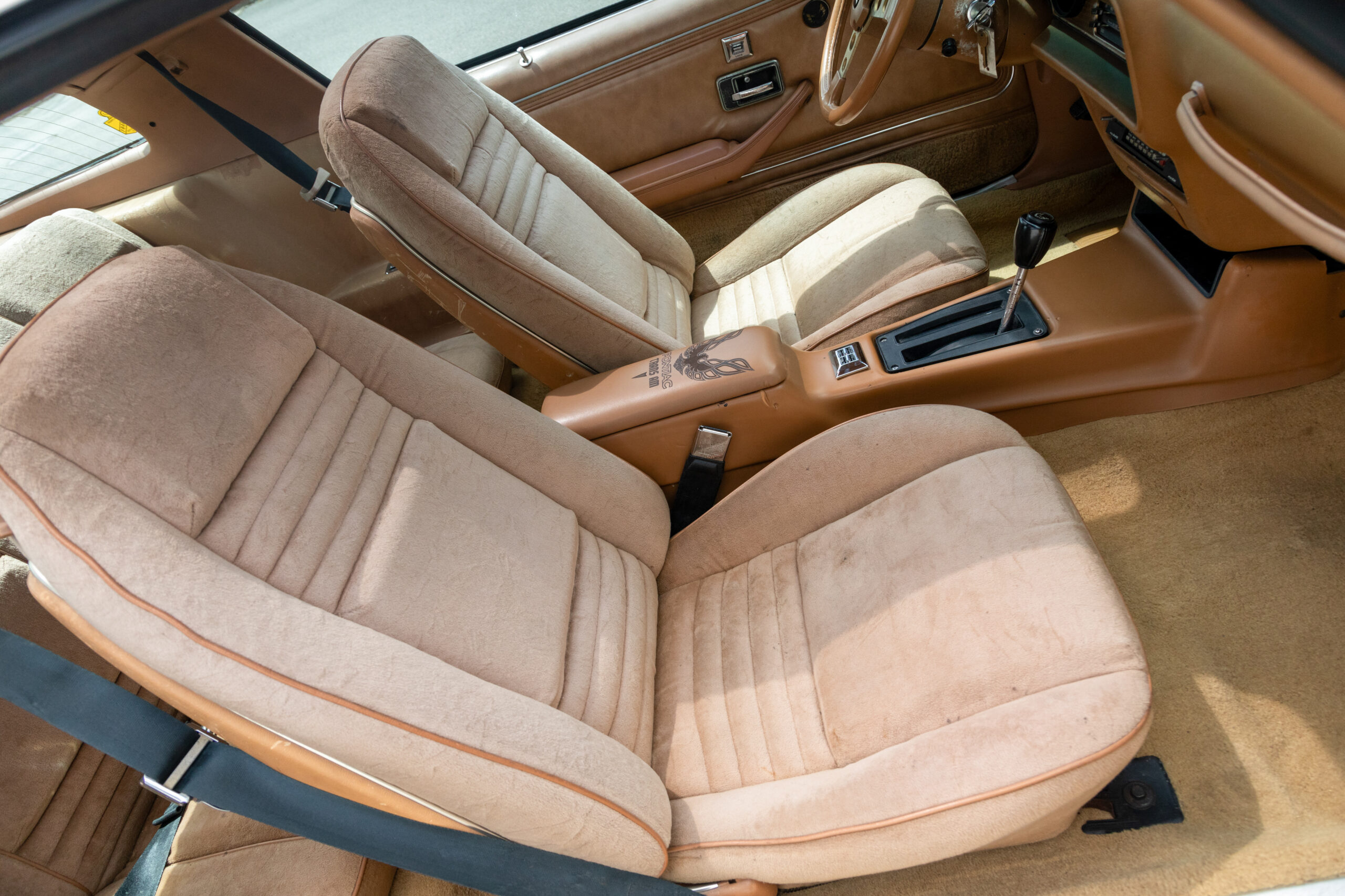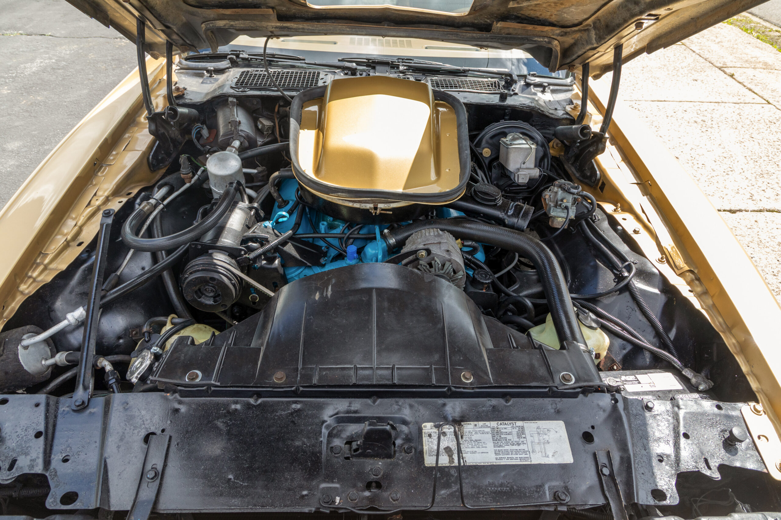 Recent work consisted of rebuilding the engine and repainting the body. The car is finished in Solar Gold over Camel Tan velour and is powered by a 400ci V8 linked with a three-speed automatic transmission and a Safe-T-Track limited-slip differential. Equipment includes removable t-top roof panels, a shaker hood, 15″ gold-finished snowflake wheels, power steering, power windows, an AM/FM radio, cruise control, and air conditioning.