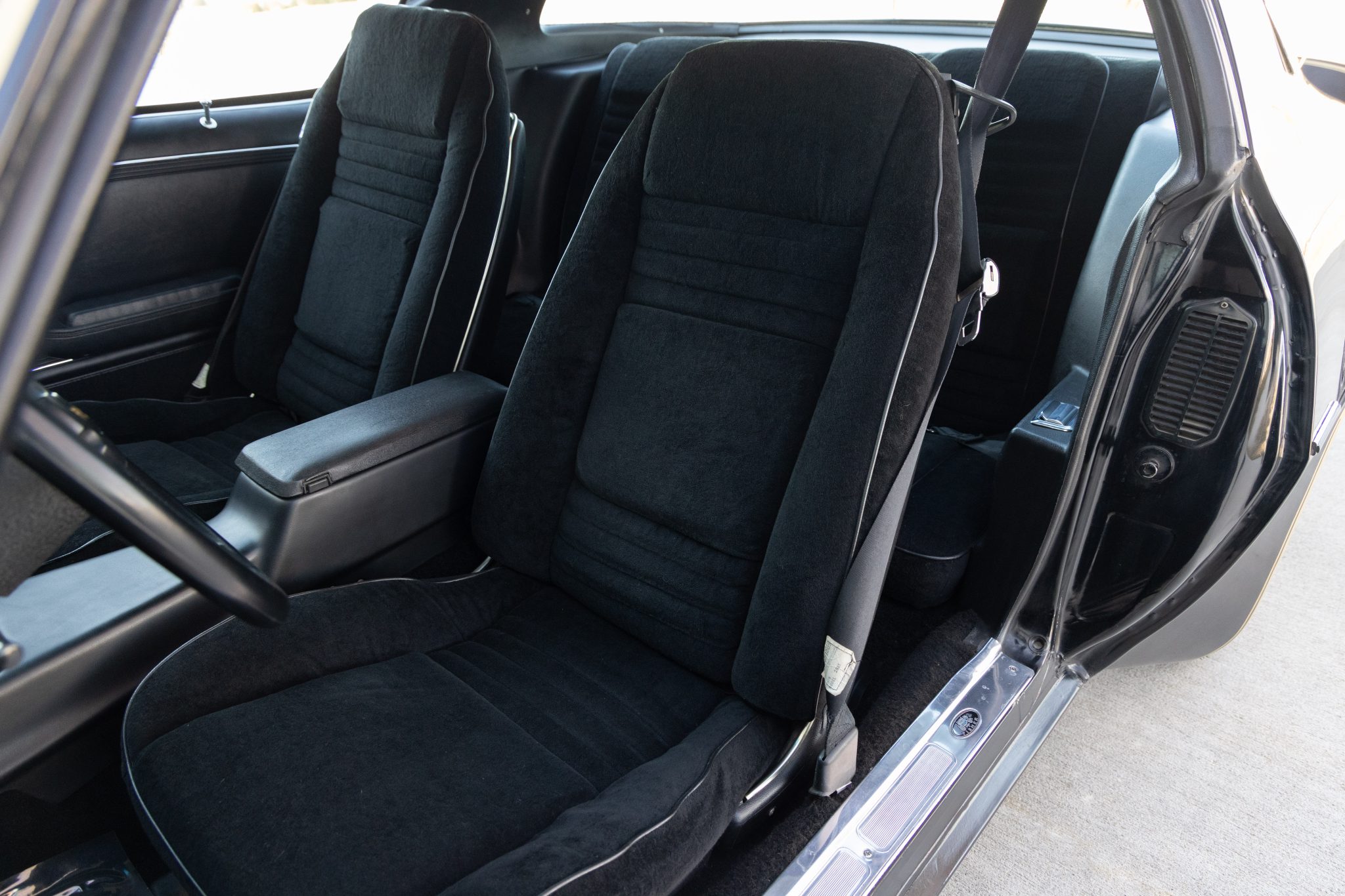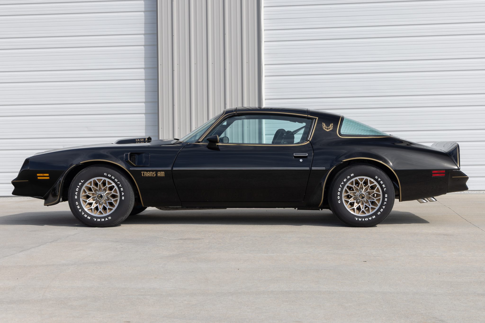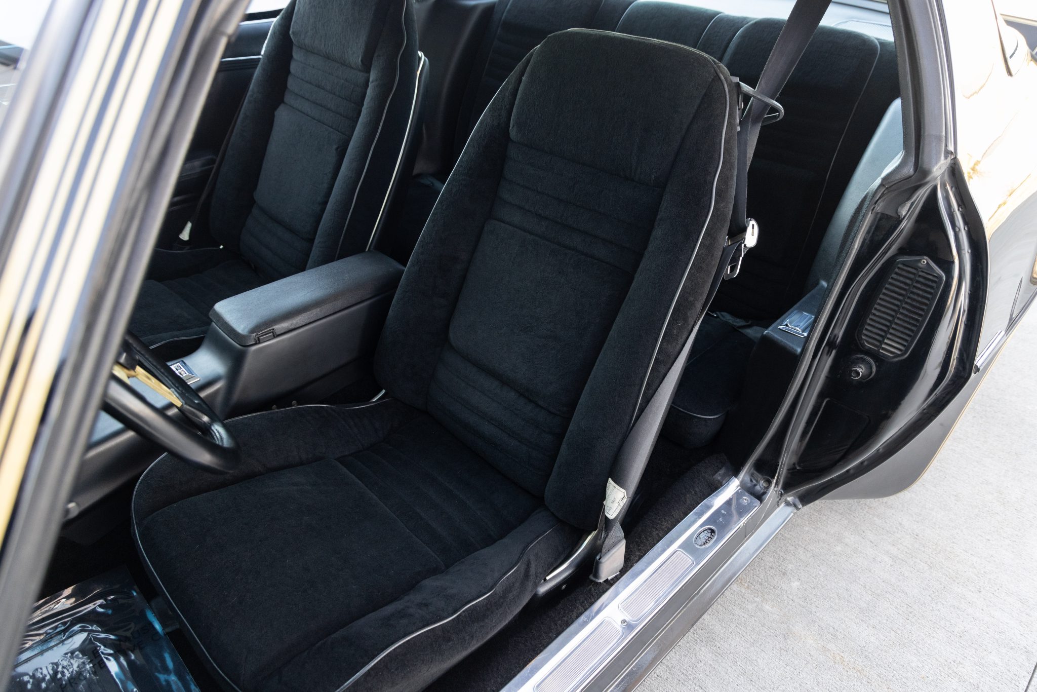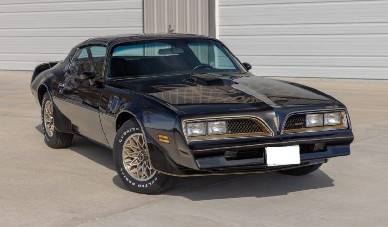 The car is finished in Starlight Black over black velour and is powered by a 400ci V8 linked with a four-speed manual transmission and a Safe-T-Track limited-slip differential. Equipment includes removable t-top roof panels, a shaker hood, 15″ gold-finished snowflake wheels, power steering, power windows, an 8-track tape player, and air conditioning. The engine and transmission were rebuilt in 2024, and work in preparation for the sale involved servicing the front brakes, replacing the tires, and dry-ice cleaning the underside.