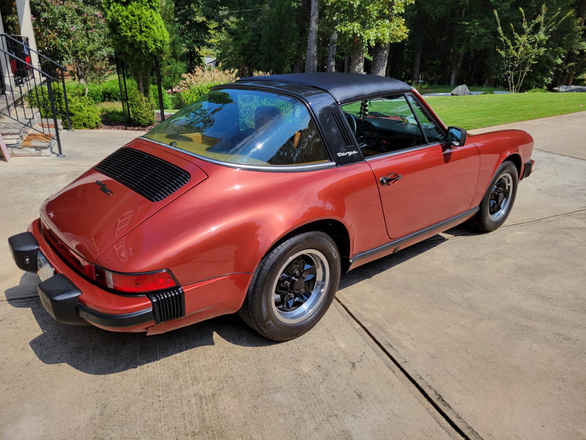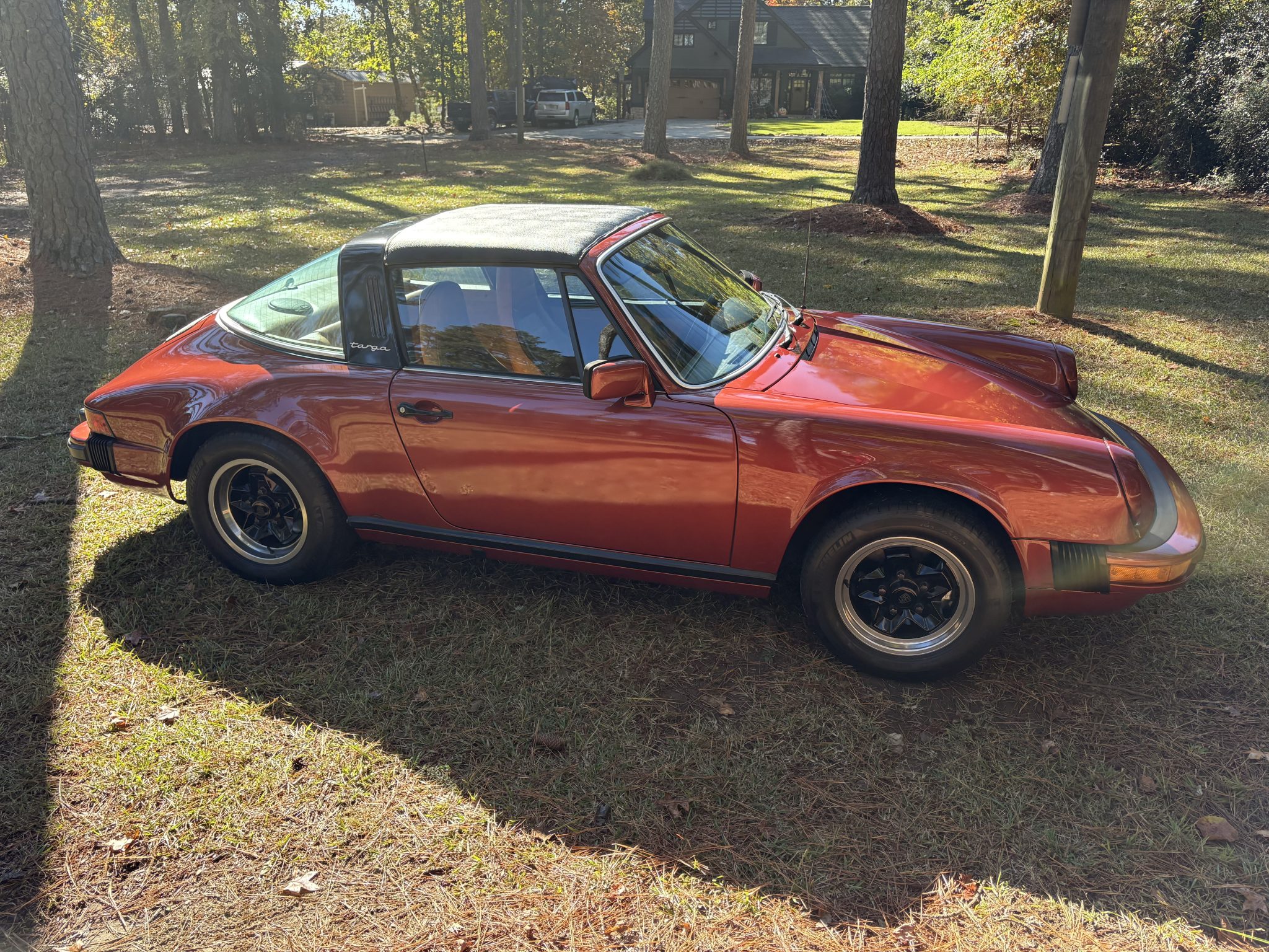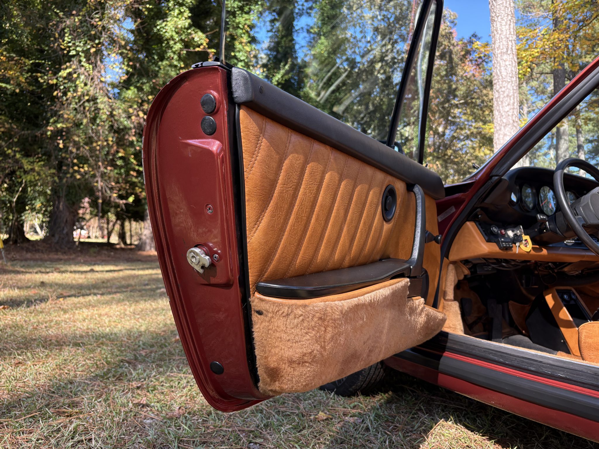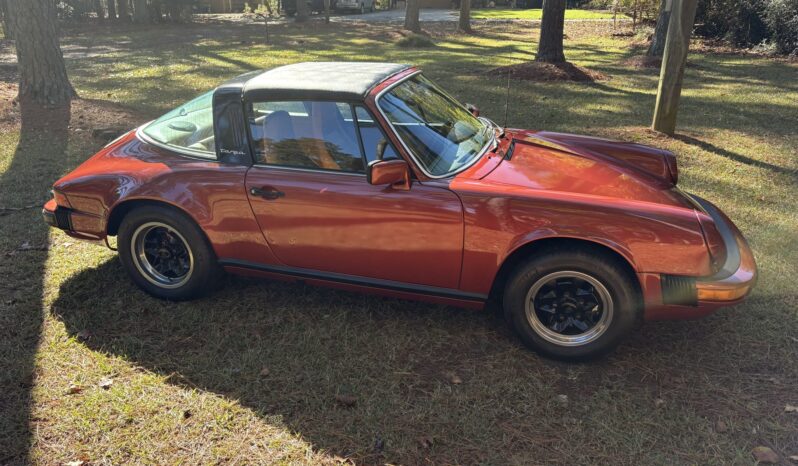 This 1978 Porsche 911SC Targa is finished in Sienna Metallic over Cork leather upholstery. Powered by a 3.0-liter flat-six paired with a five-speed manual transaxle, the car features 15″ ATS “cookie-cutter” alloy wheels, a removable roof panel, a leather-wrapped steering wheel, air conditioning, and an aftermarket stereo