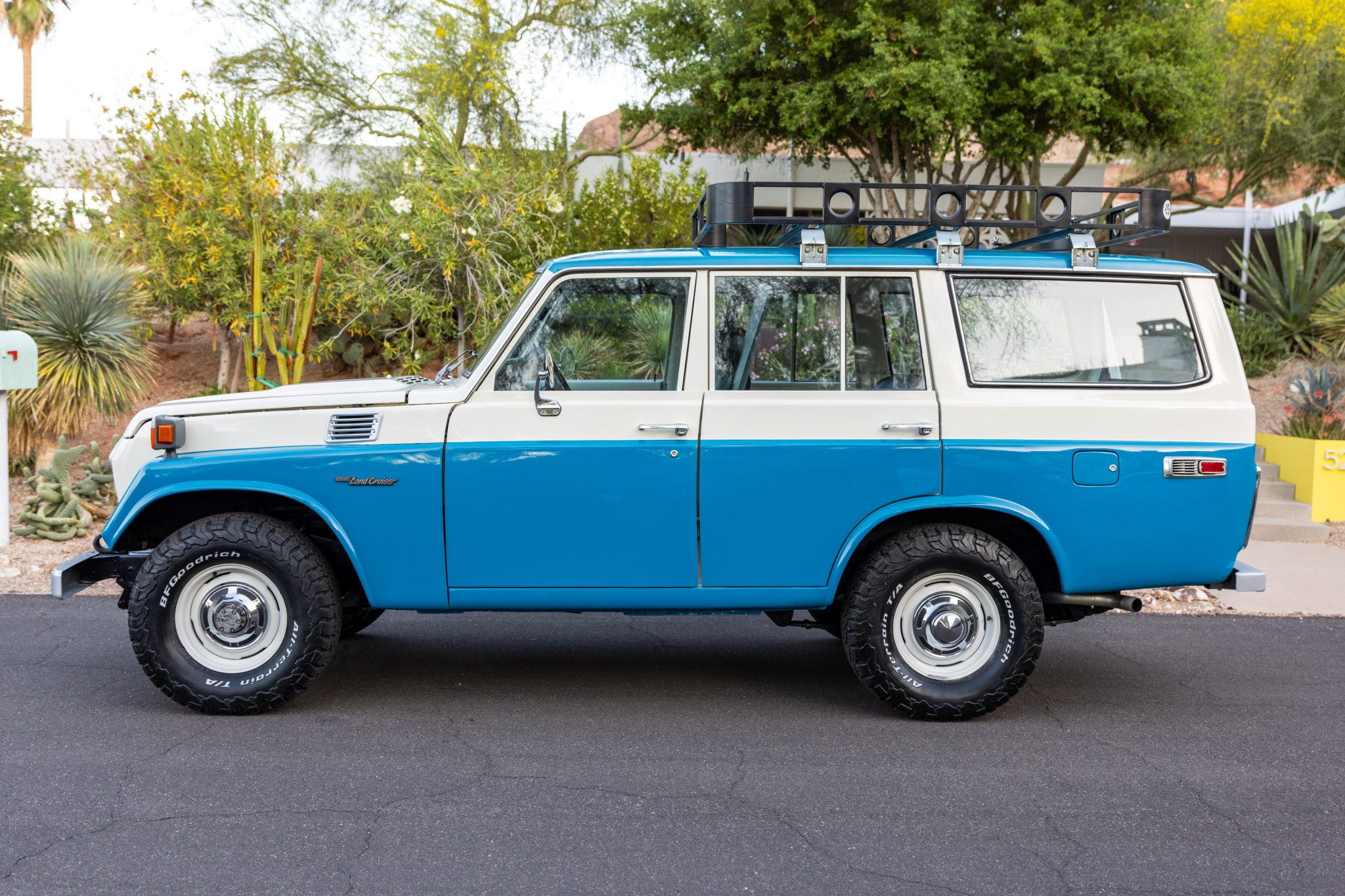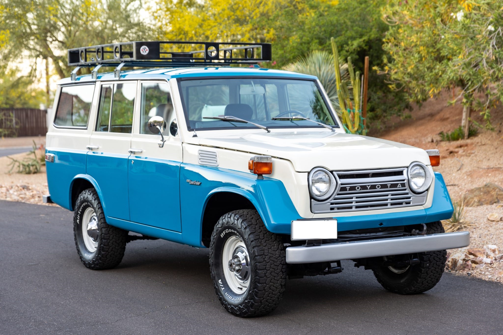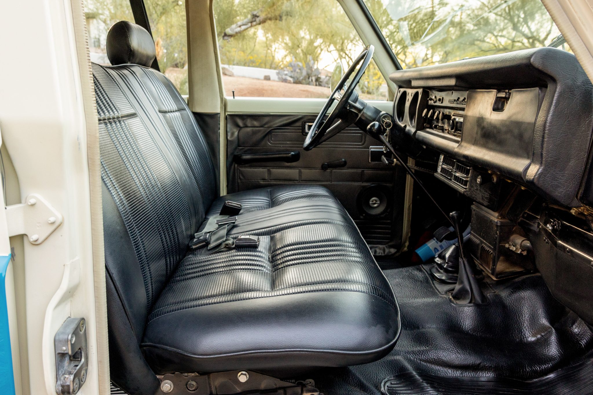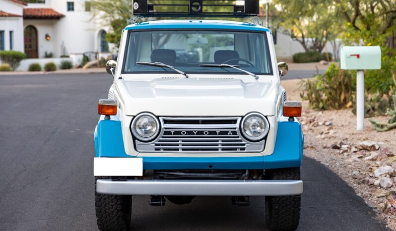 This 1978 Toyota Land Cruiser FJ55 was underwent a multi-year refurbishment that involved re-trimming the bench seats in black vinyl and overhauling the 4.2-liter inline-six, four-speed manual transmission, and dual-range transfer case. It has been modified with tubular headers, four-wheel disc brakes, power steering, Old Man Emu shocks, and a roof rack, and the body has been refinished in blue and white. The truck also has 15″ steel wheels, locking front hubs, a Pioneer stereo, and air conditioning.