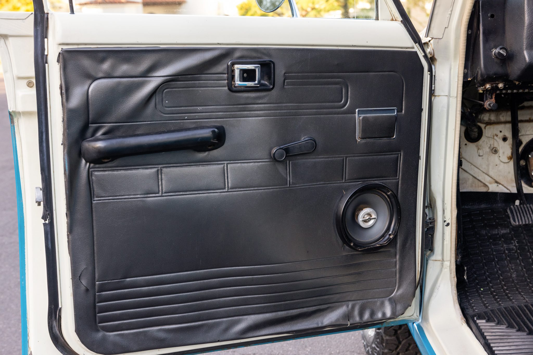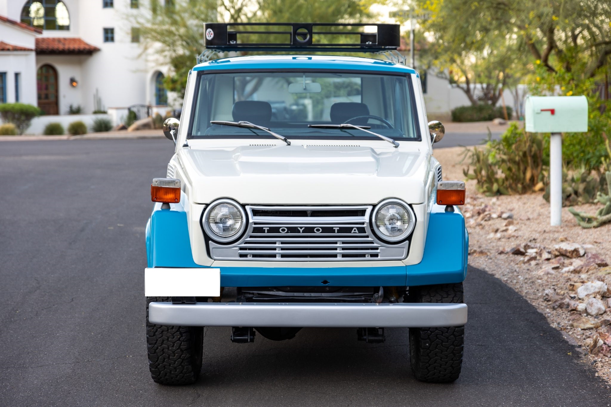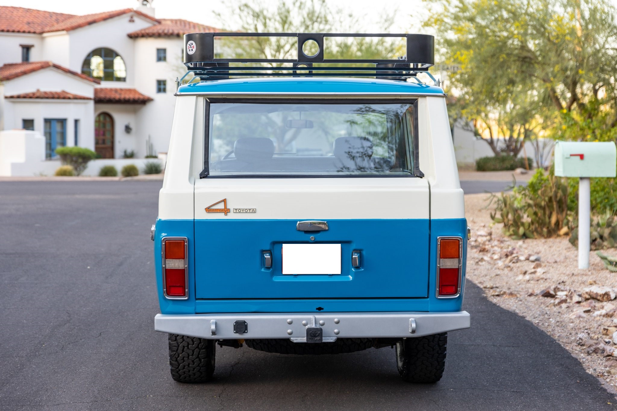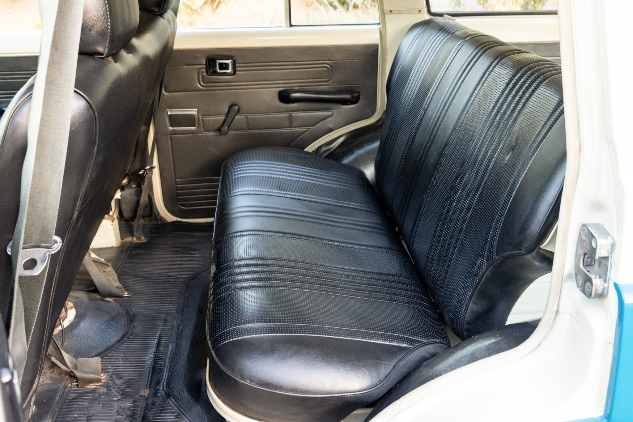 This 1978 Toyota Land Cruiser FJ55 was underwent a multi-year refurbishment that involved re-trimming the bench seats in black vinyl and overhauling the 4.2-liter inline-six, four-speed manual transmission, and dual-range transfer case. It has been modified with tubular headers, four-wheel disc brakes, power steering, Old Man Emu shocks, and a roof rack, and the body has been refinished in blue and white. The truck also has 15″ steel wheels, locking front hubs, a Pioneer stereo, and air conditioning.