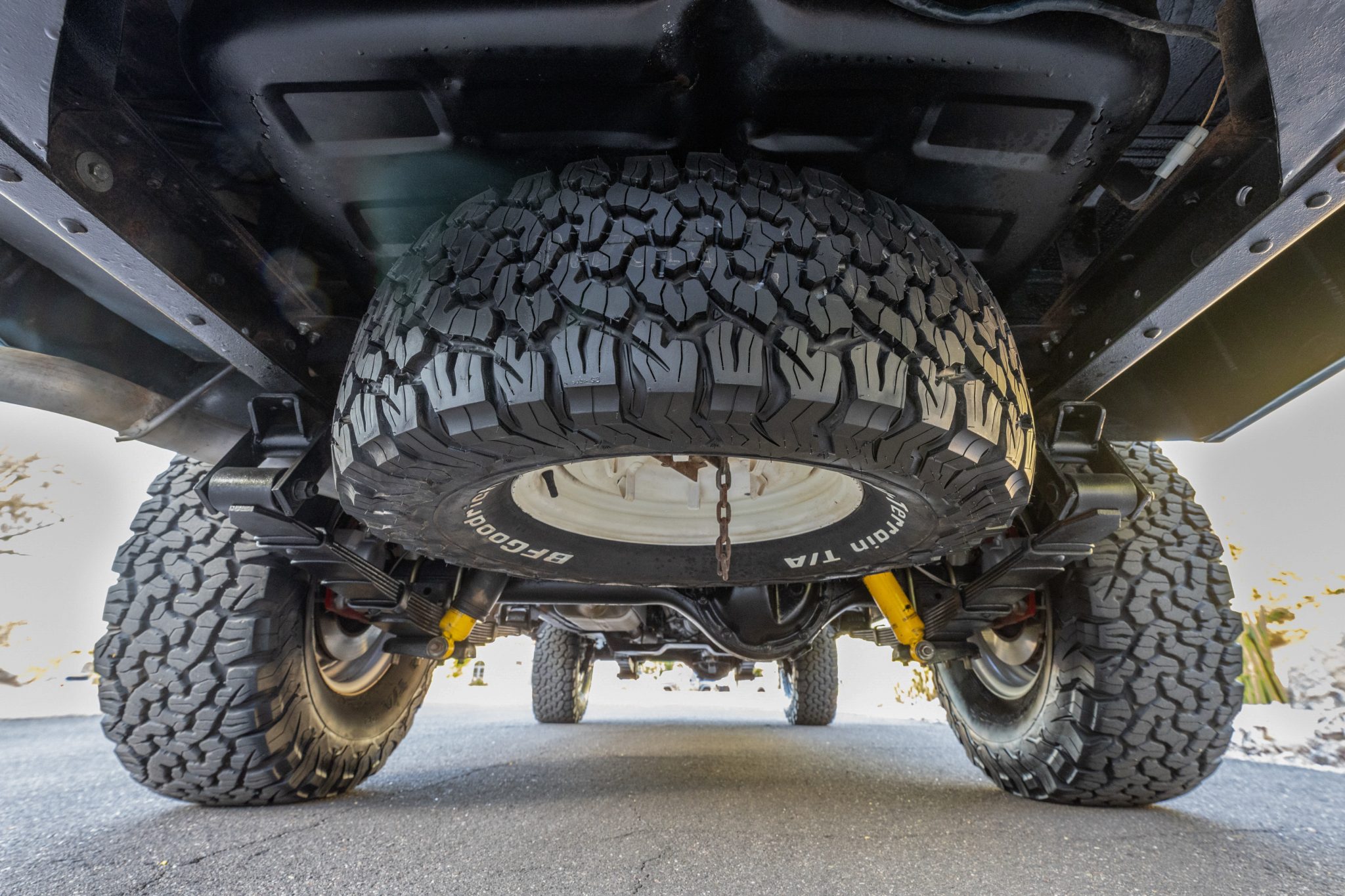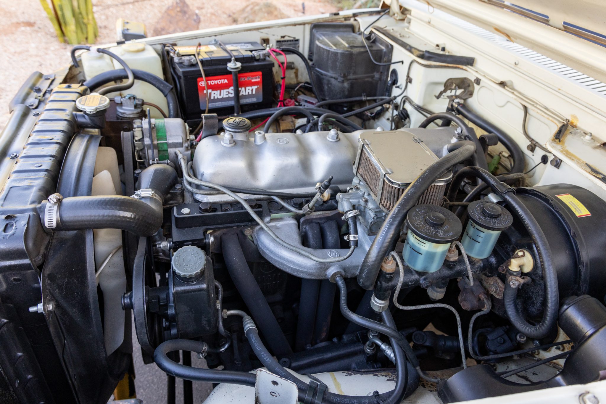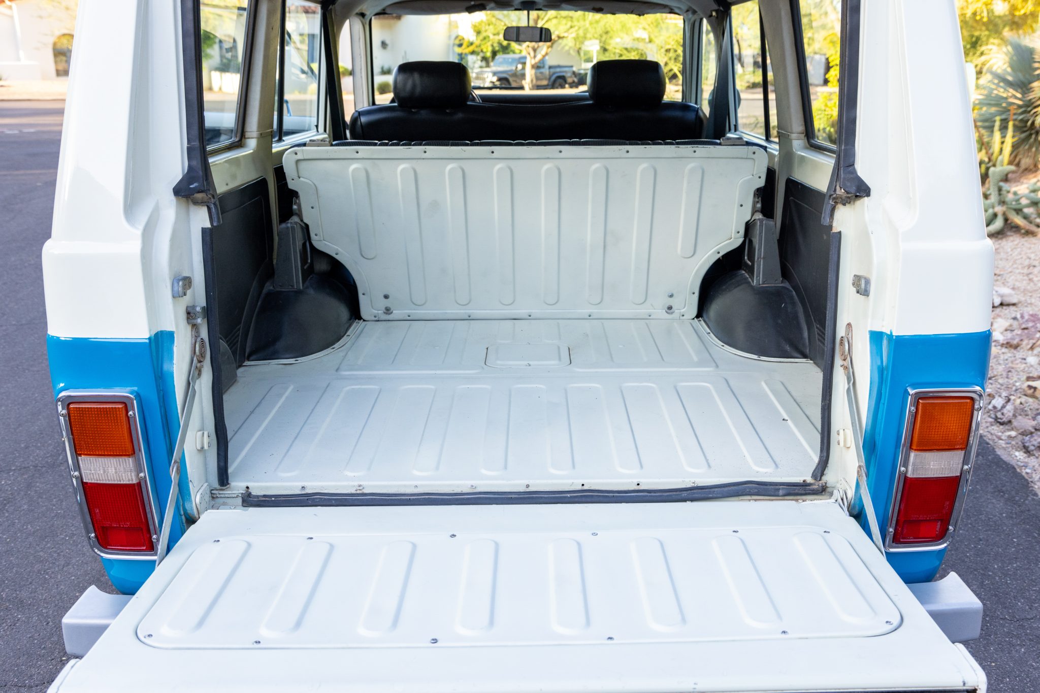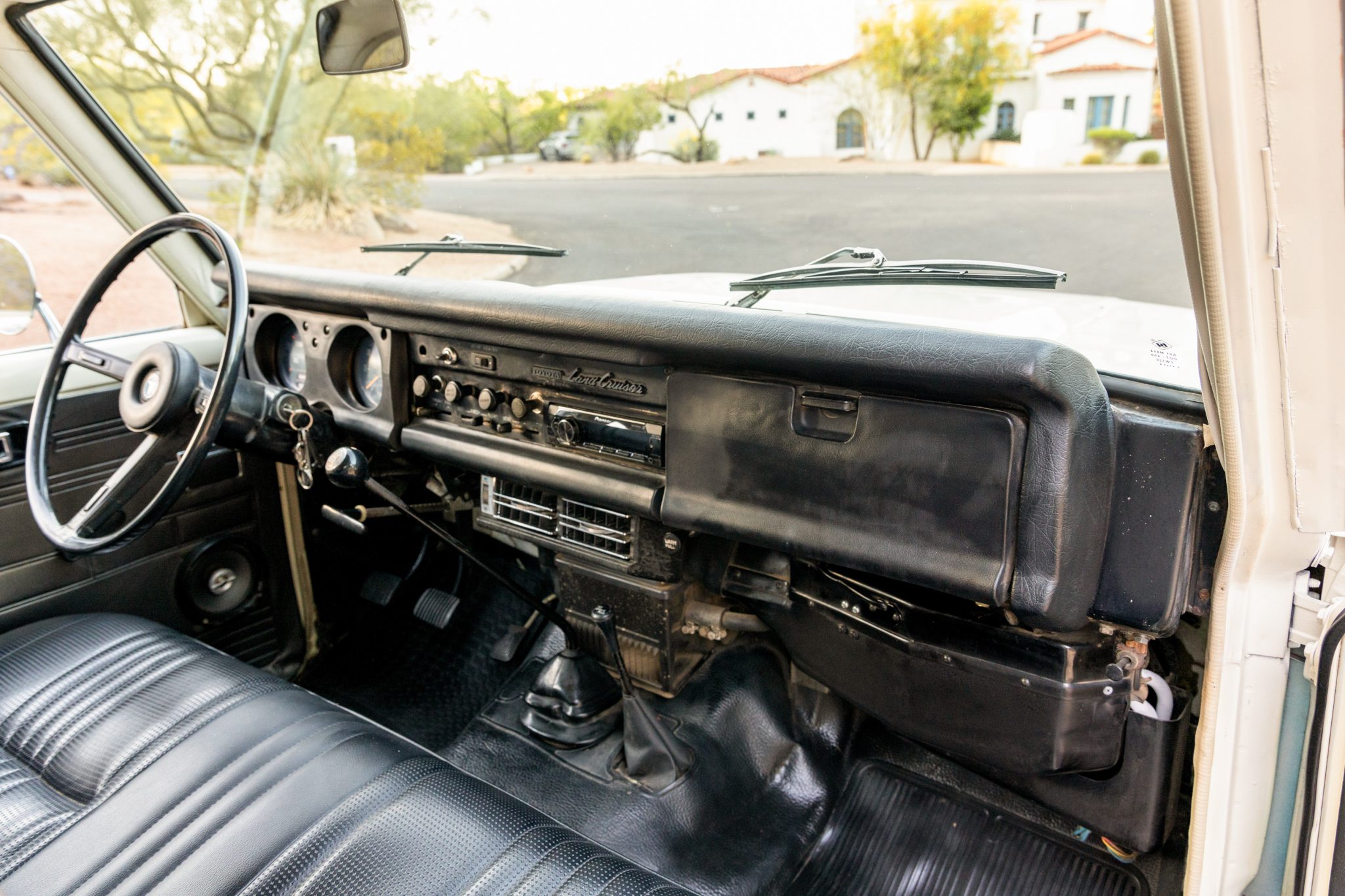 This 1978 Toyota Land Cruiser FJ55 was underwent a multi-year refurbishment that involved re-trimming the bench seats in black vinyl and overhauling the 4.2-liter inline-six, four-speed manual transmission, and dual-range transfer case. It has been modified with tubular headers, four-wheel disc brakes, power steering, Old Man Emu shocks, and a roof rack, and the body has been refinished in blue and white. The truck also has 15″ steel wheels, locking front hubs, a Pioneer stereo, and air conditioning.