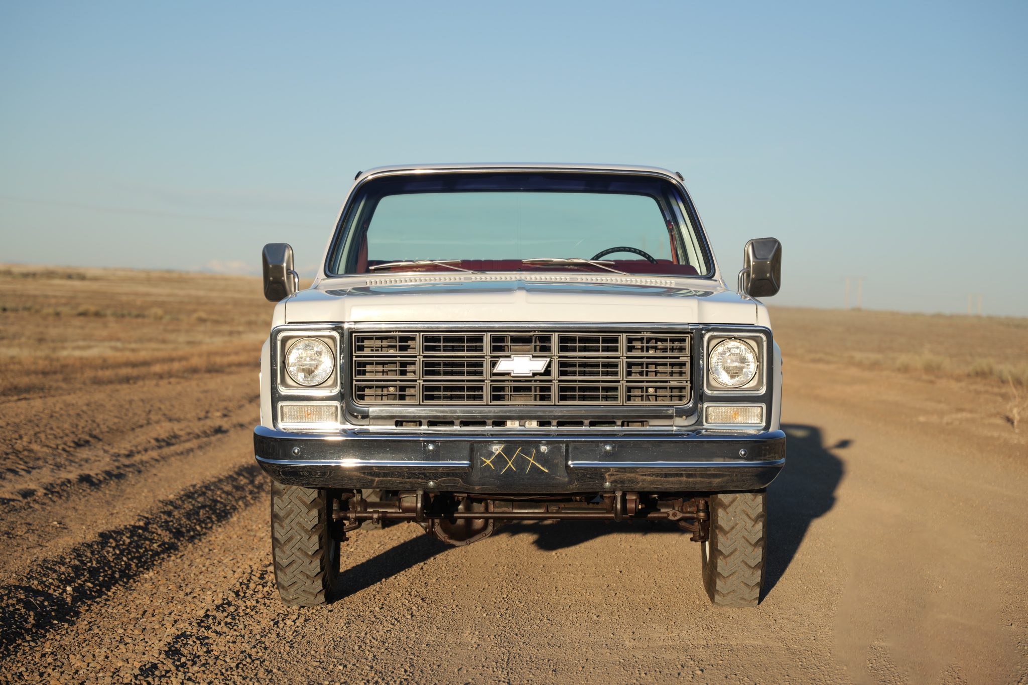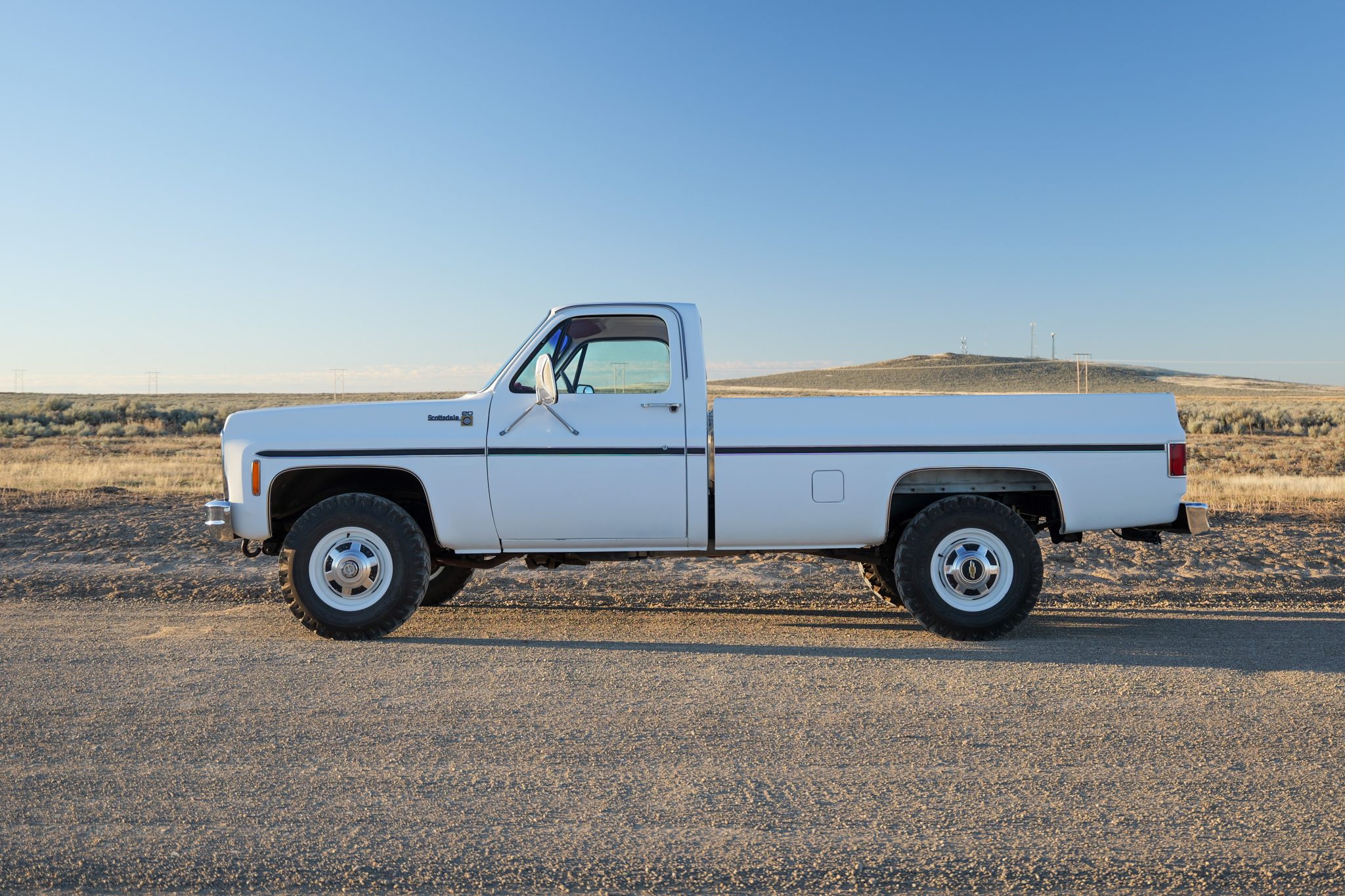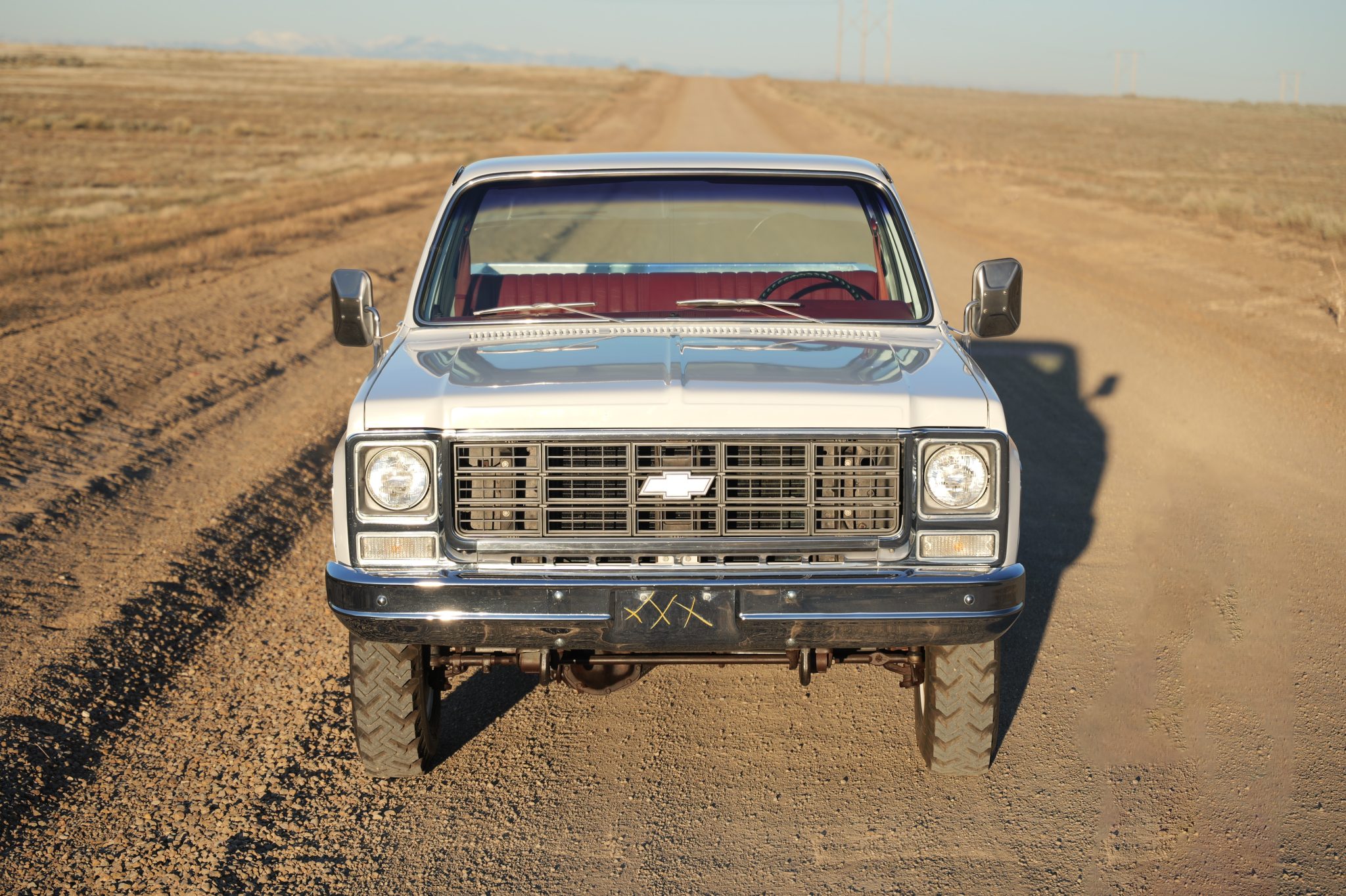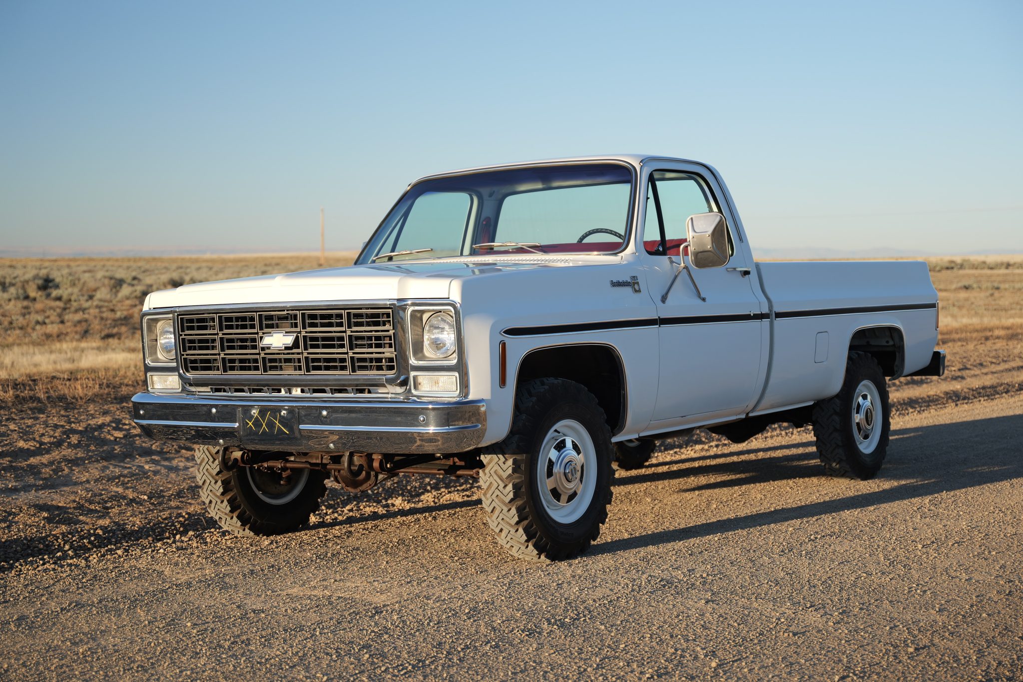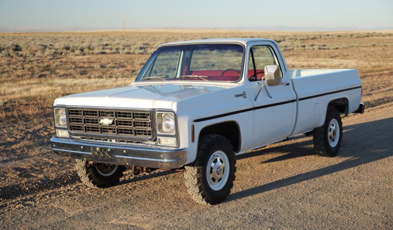 It is finished in Frost White over Carmine vinyl and is powered by a 5.7-liter V8 linked with a four-speed manual transmission and a dual-range transfer case. Equipment includes 16″ steel wheels, manually locking front hubs, and a dual exhaust system with glass pack-style mufflers along with a Fleetside bed, a receiver hitch, camper mirrors, and a push-button radio.
