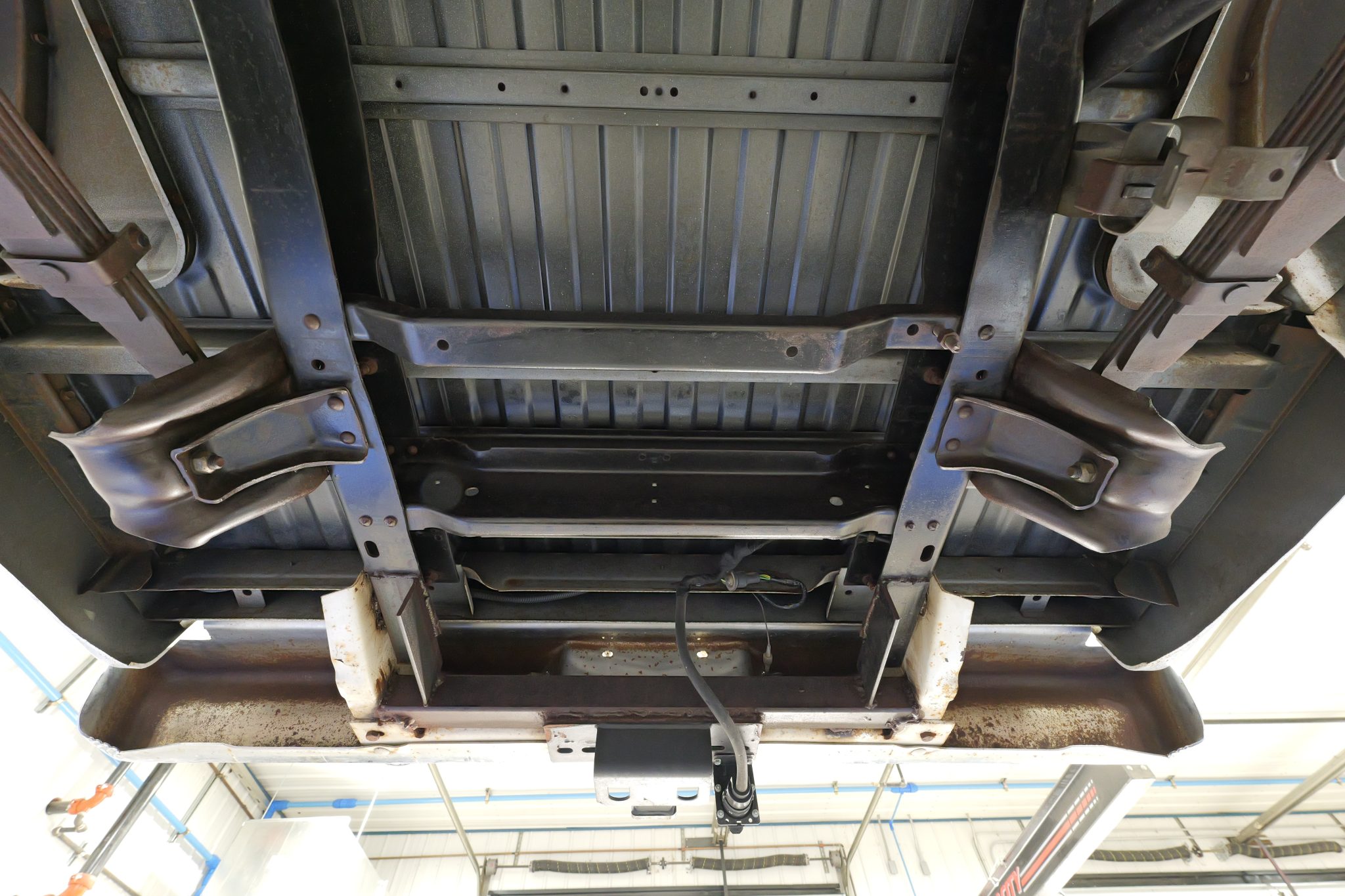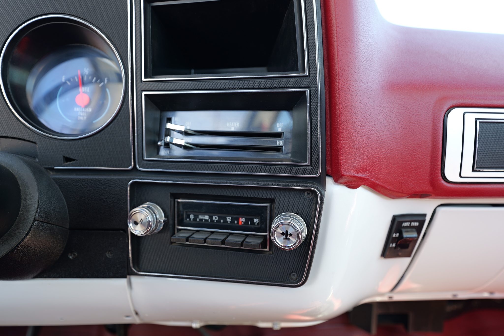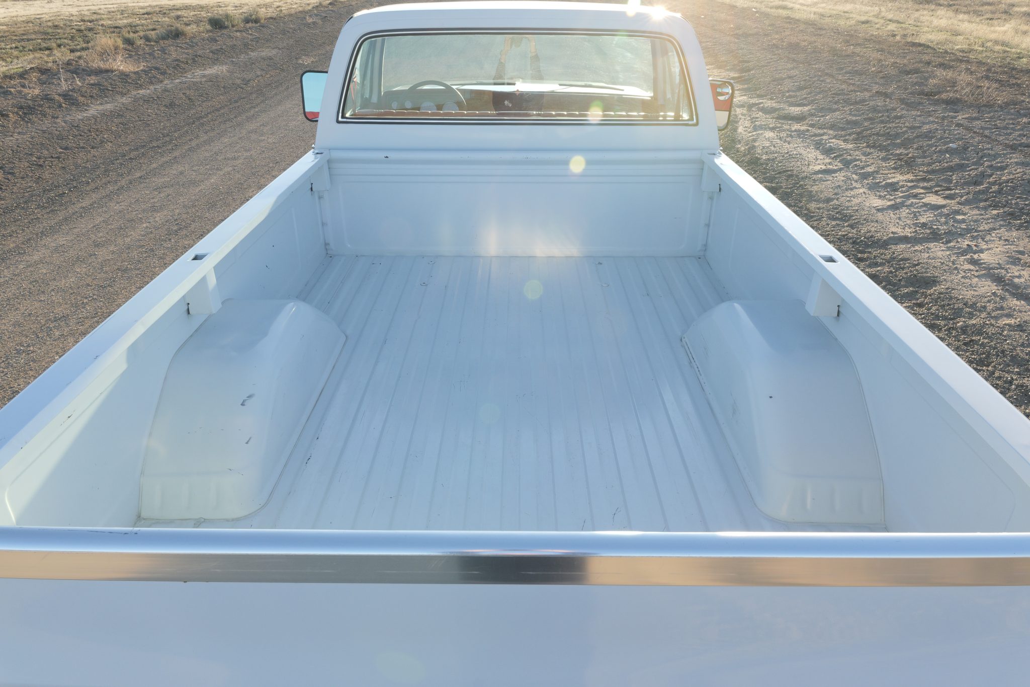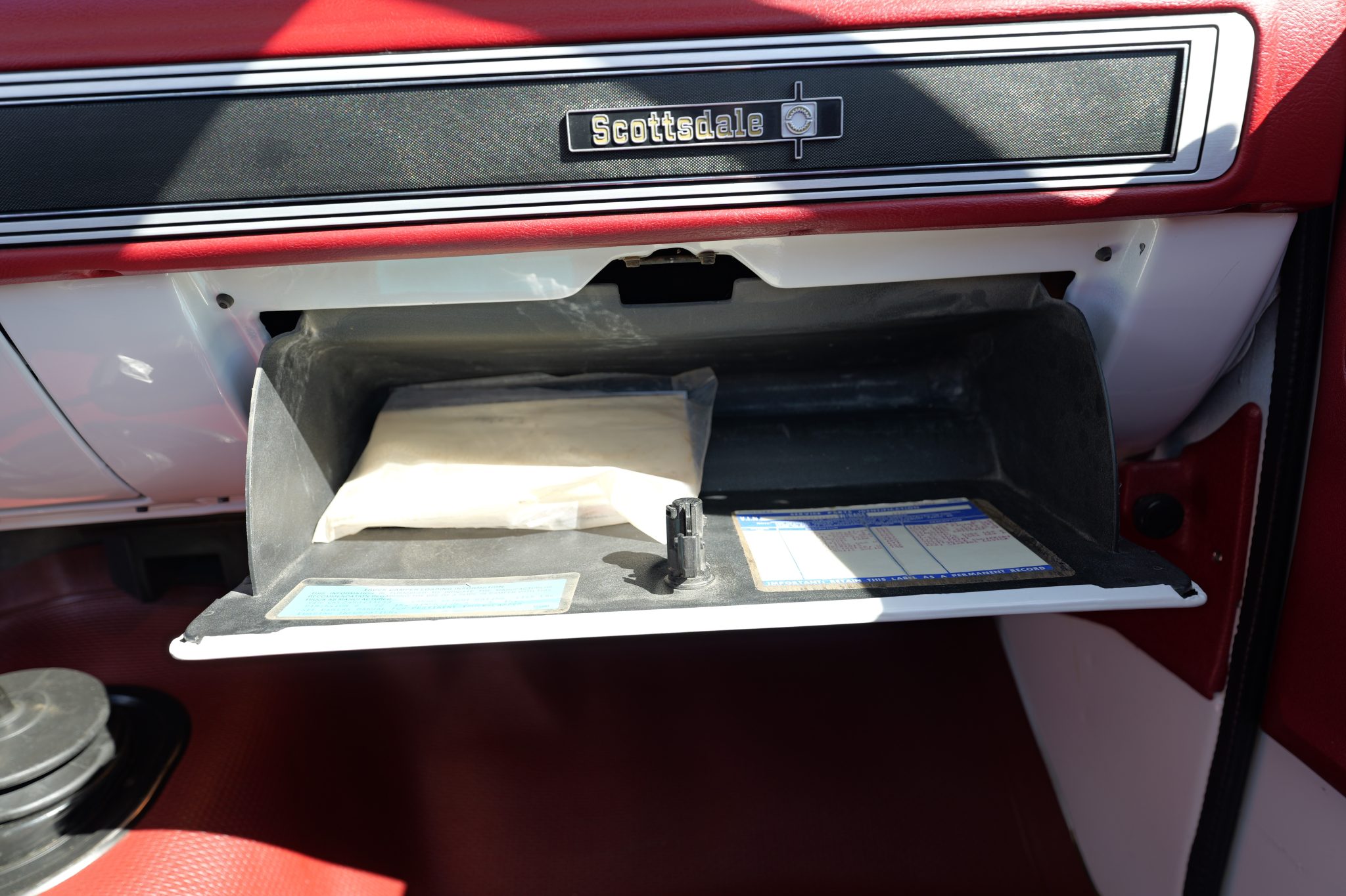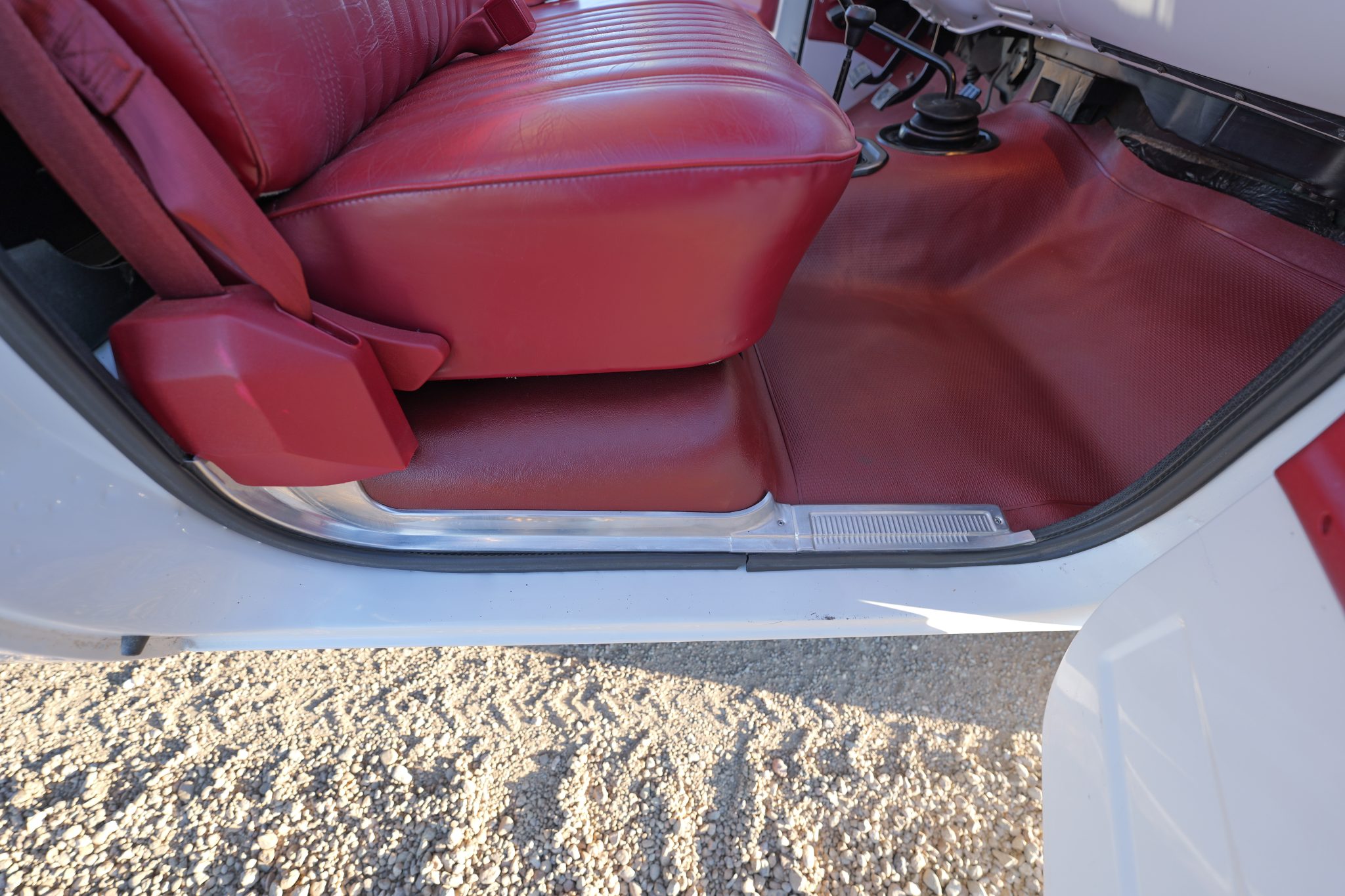 It is finished in Frost White over Carmine vinyl and is powered by a 5.7-liter V8 linked with a four-speed manual transmission and a dual-range transfer case. Equipment includes 16″ steel wheels, manually locking front hubs, and a dual exhaust system with glass pack-style mufflers along with a Fleetside bed, a receiver hitch, camper mirrors, and a push-button radio.