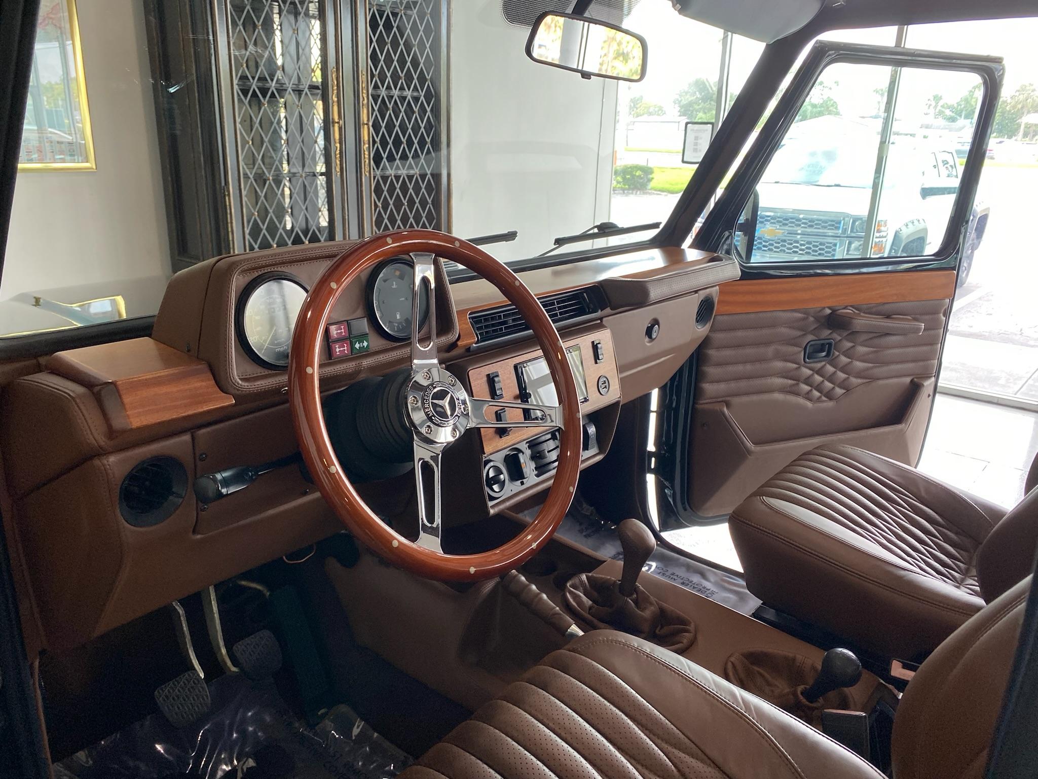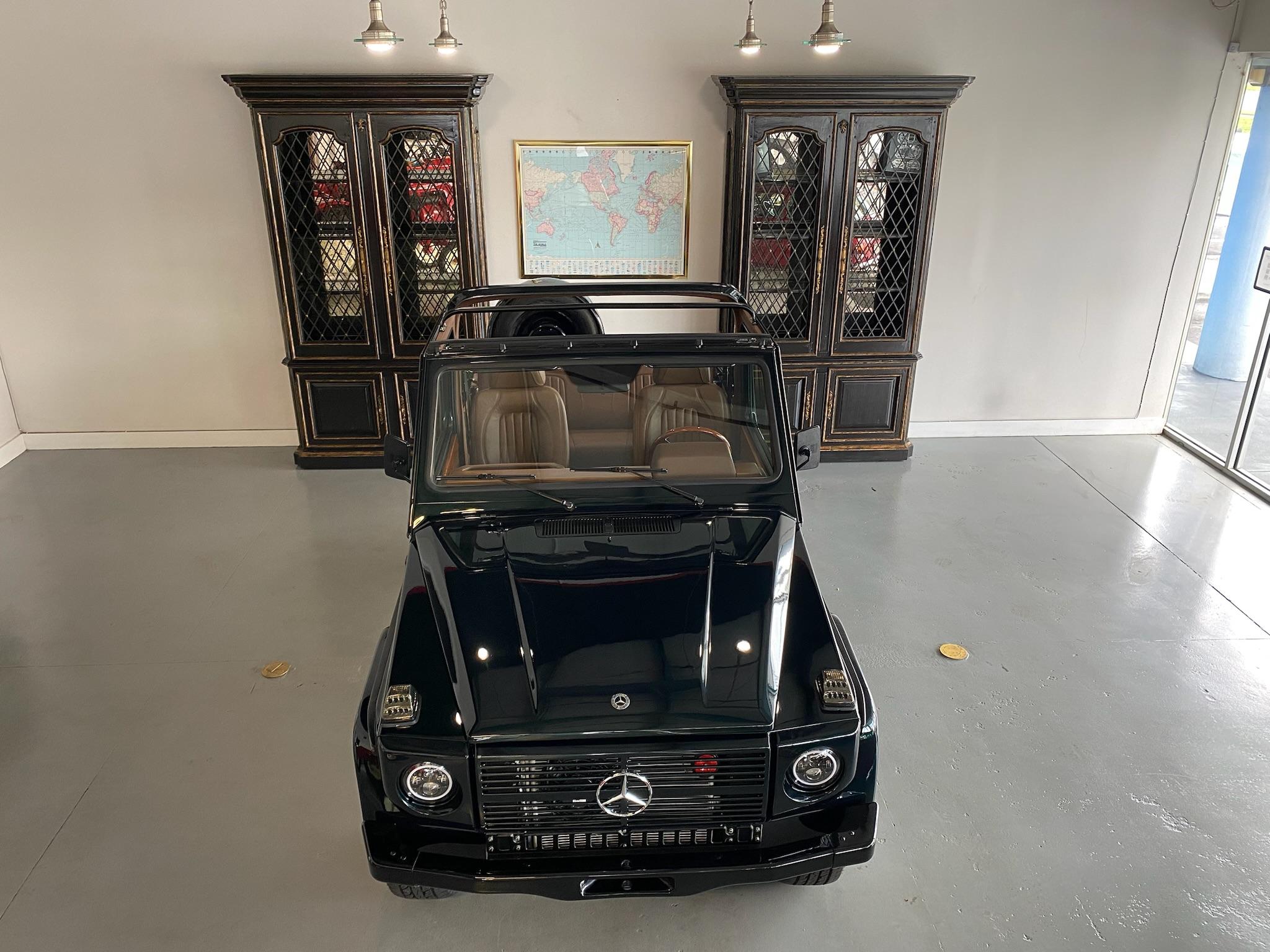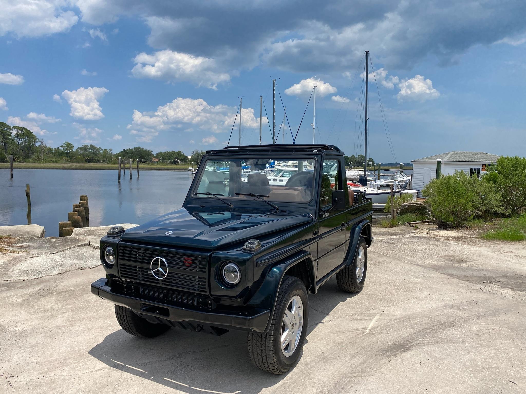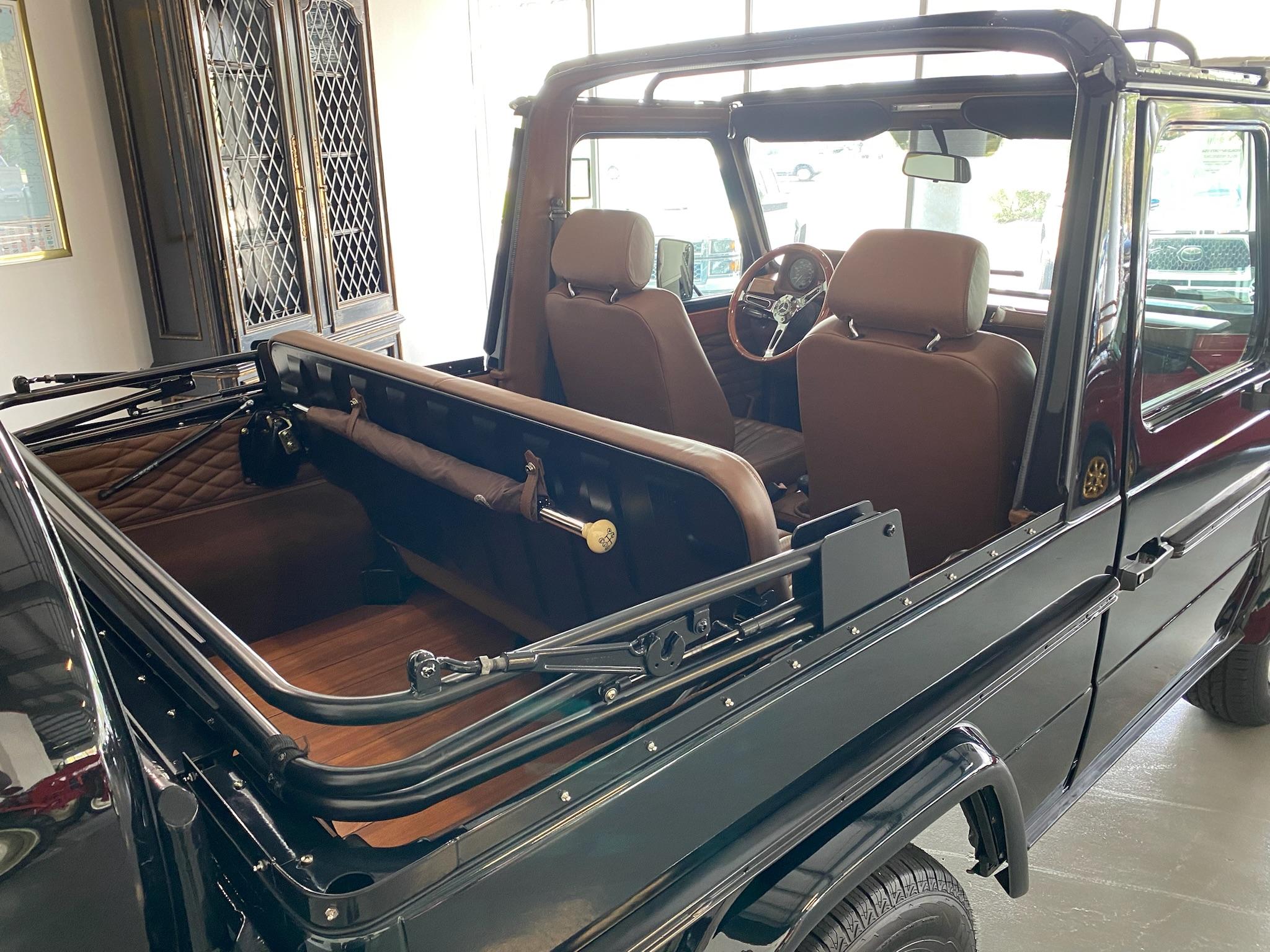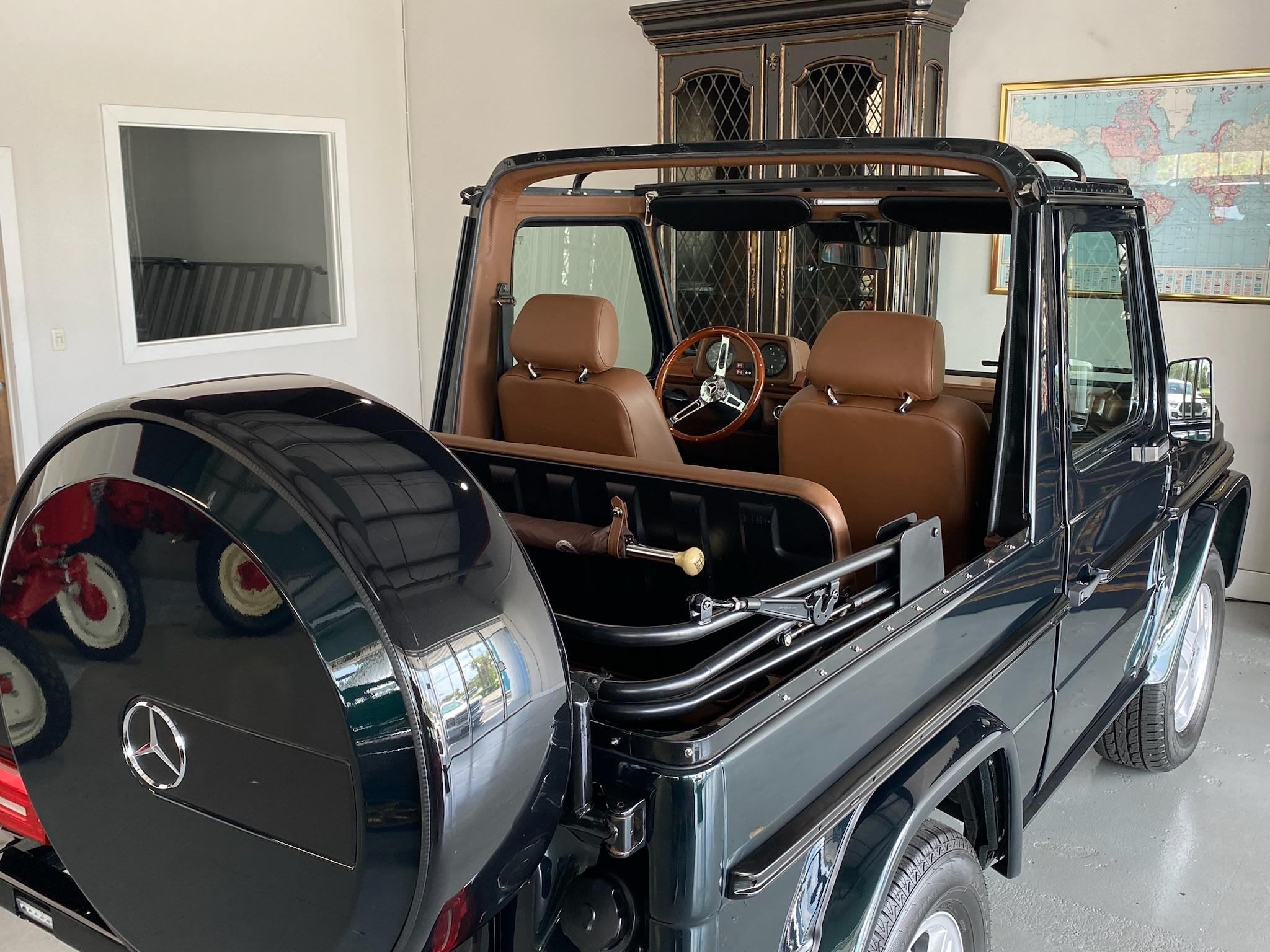 Finished in Dark Emerald Green over Saddle leather, the truck is powered by a 3.0-liter turbodiesel inline-five linked with a five-speed manual transmission, a dual-range transfer case, and locking front and rear differentials. Equipment includes a black soft top, a revised turbocharger, front disc brakes, 18″ Ashtaroth wheels, air conditioning, a wood-rimmed steering wheel, and a Blaupunkt touchscreen infotainment system. This W460 300GD shows 34k miles