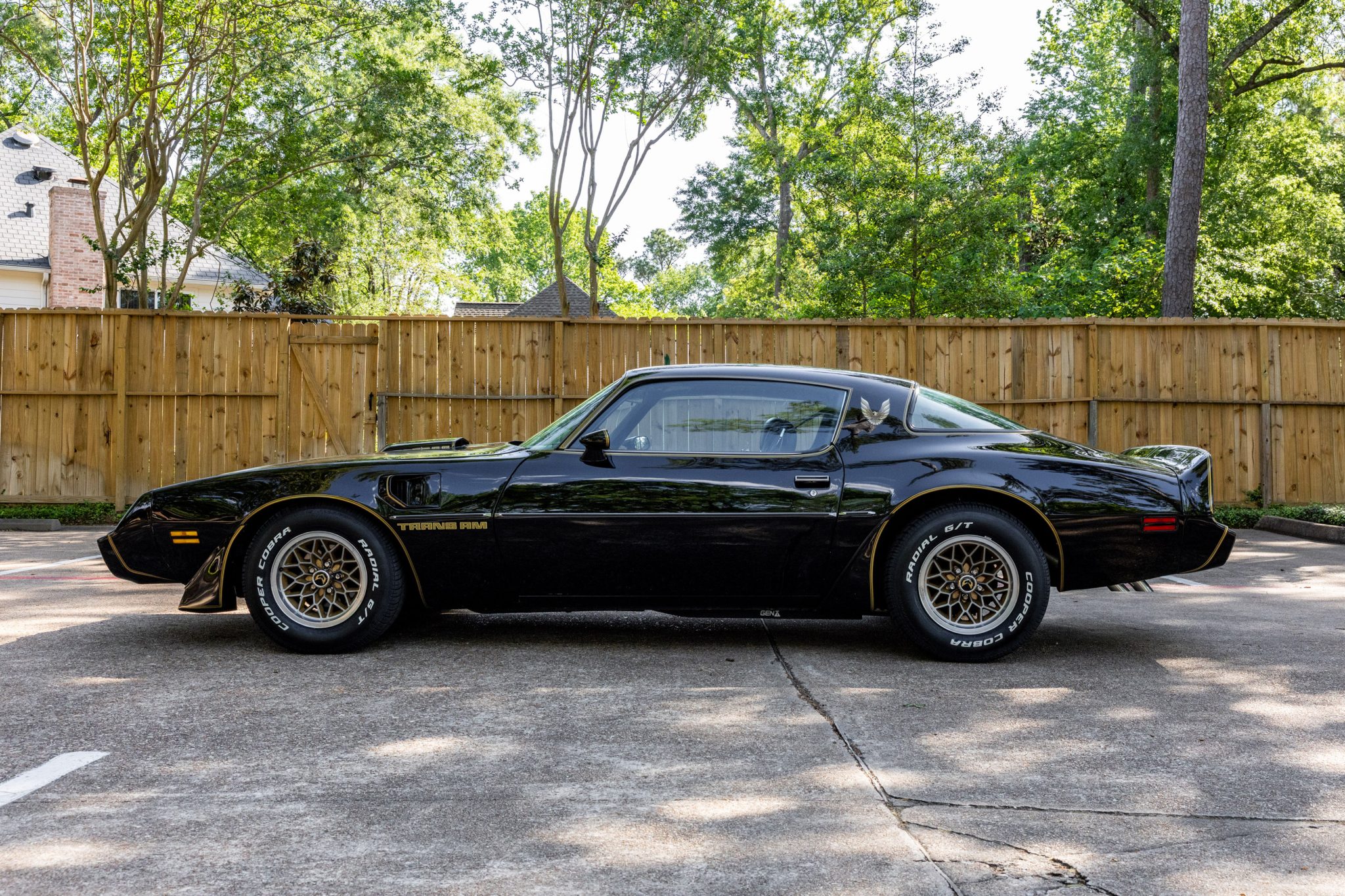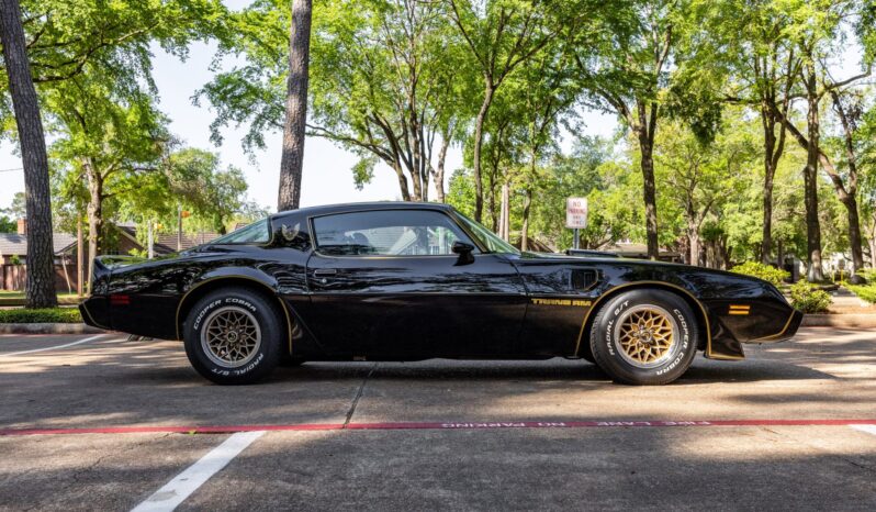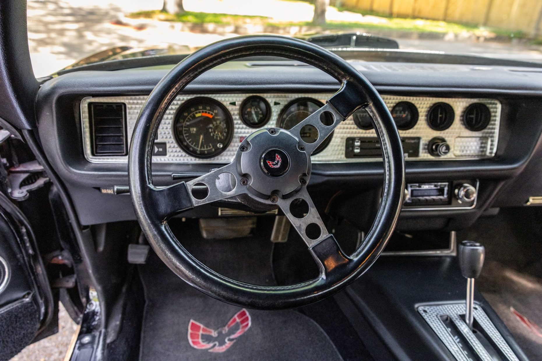 This 1979 Pontiac Firebird Trans Am was refurbished with a repaint in black with Special Edition-style graphics and a reupholstered interior featuring a modern radio. It was acquired in 2017 by the seller, who has since rebuilt the 403ci V8 and three-speed automatic transmission, overhauled the suspension with Pro-Touring F-Body components, and added Vintage Air climate control and ceramic-coated exhaust manifold. The car also has power steering and brakes as well as 15″ gold-finished snowflake wheels.