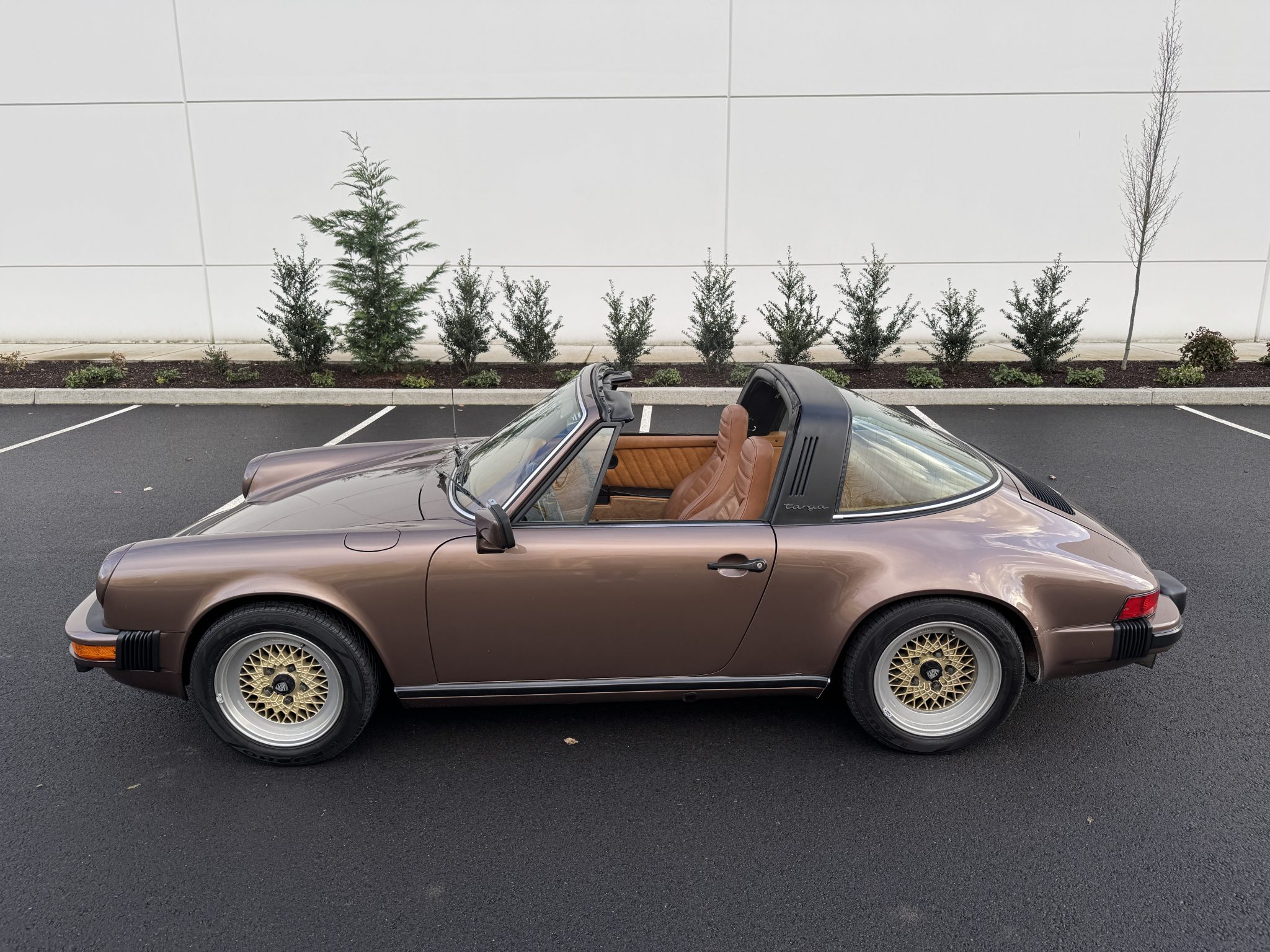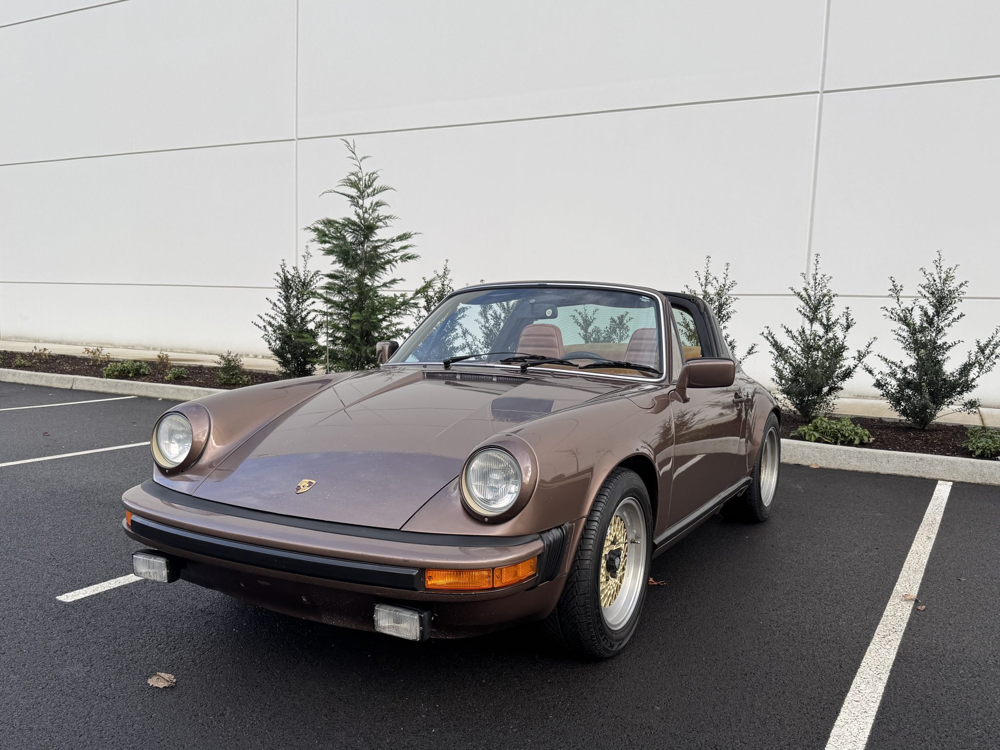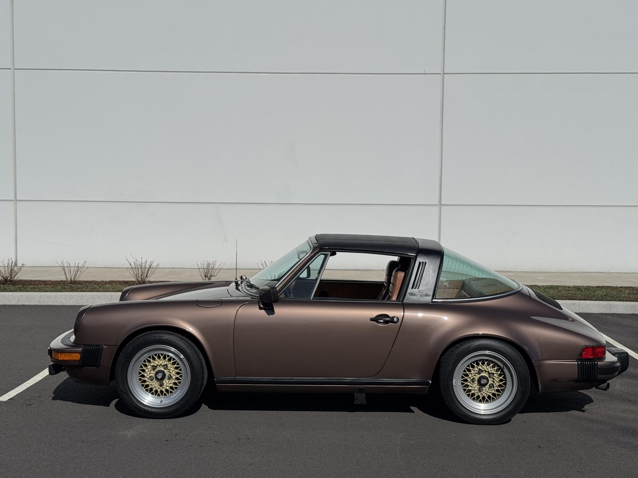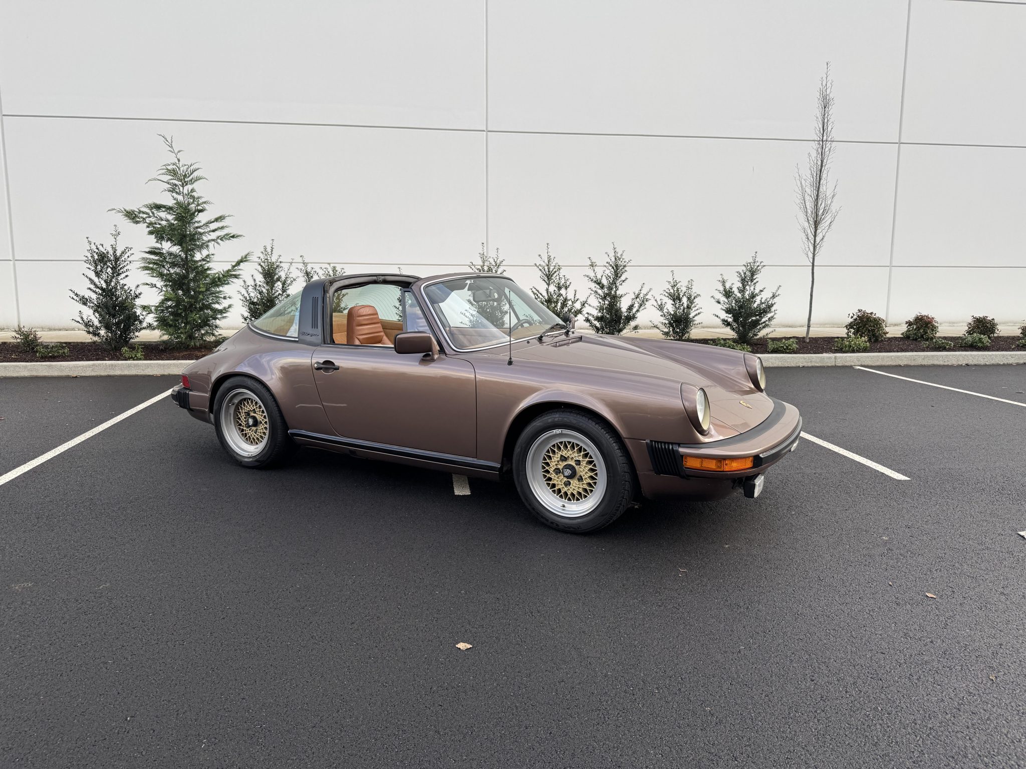 Powered by a 3.0-liter flat-six paired with a five-speed manual transaxle, the car is finished in Copper Brown Metallic over Cork leatherette upholstery. Equipment includes 16″ BBS wheels, a removable roof panel, a leather-wrapped steering wheel, power windows, cruise control, and a Blaupunkt cassette stereo.