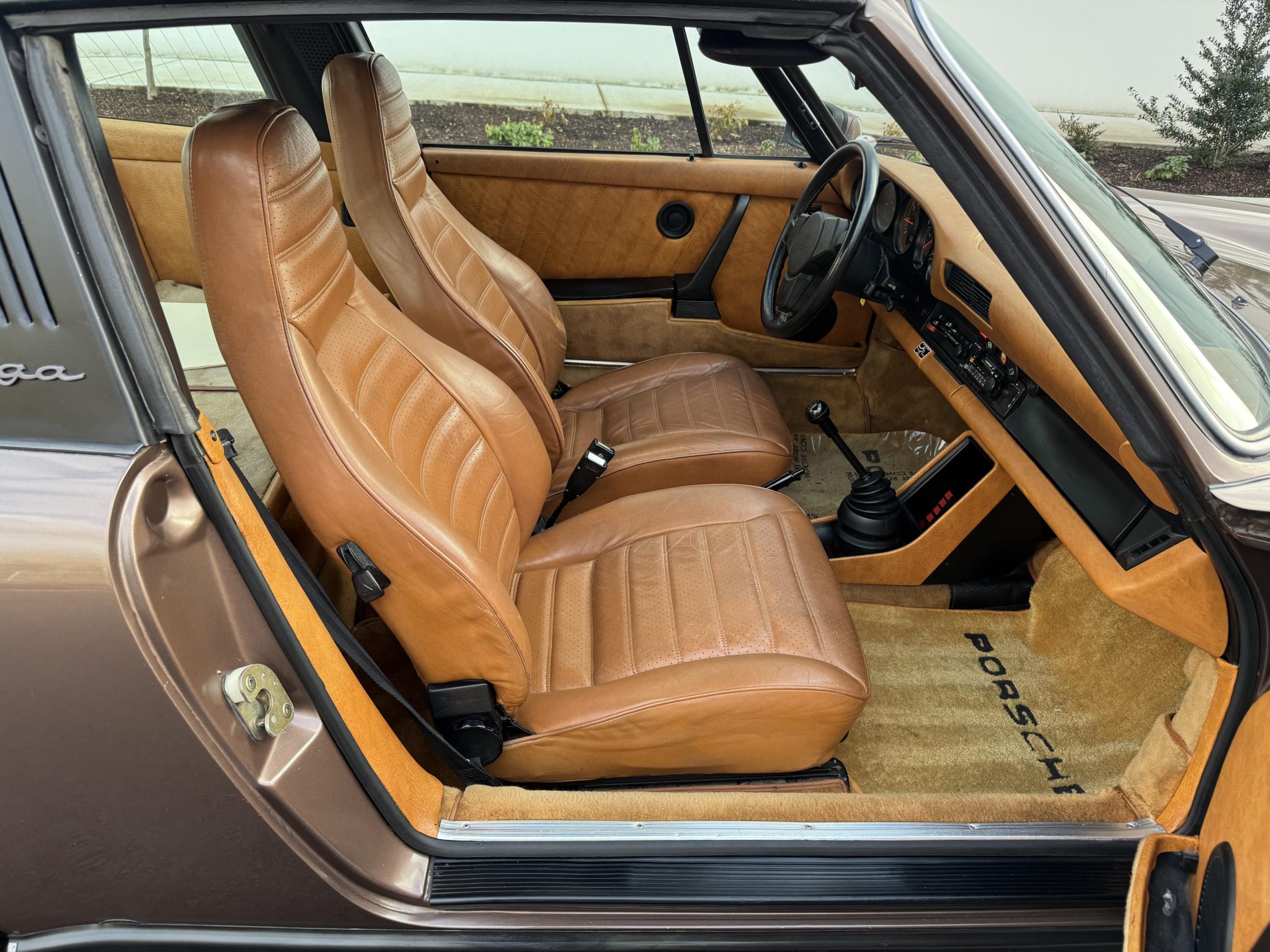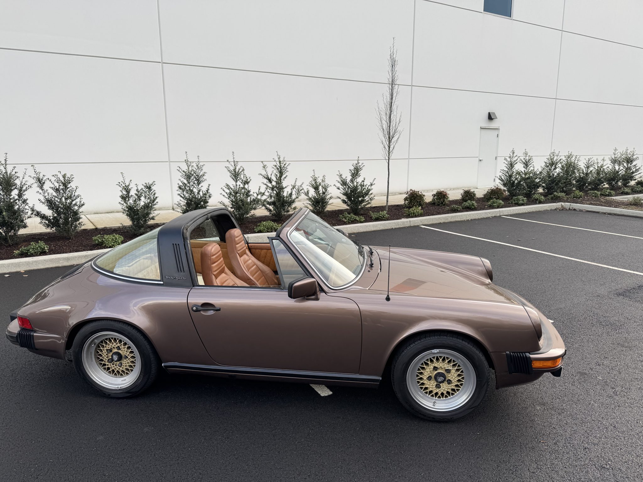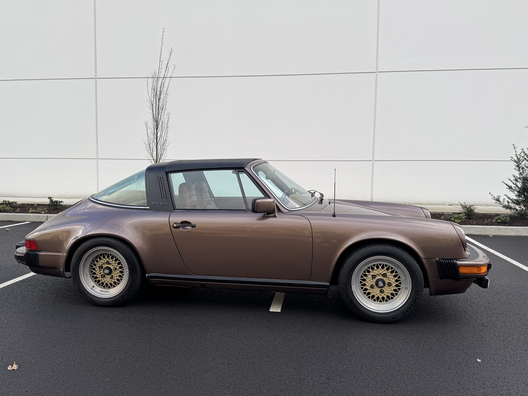 Powered by a 3.0-liter flat-six paired with a five-speed manual transaxle, the car is finished in Copper Brown Metallic over Cork leatherette upholstery. Equipment includes 16″ BBS wheels, a removable roof panel, a leather-wrapped steering wheel, power windows, cruise control, and a Blaupunkt cassette stereo.