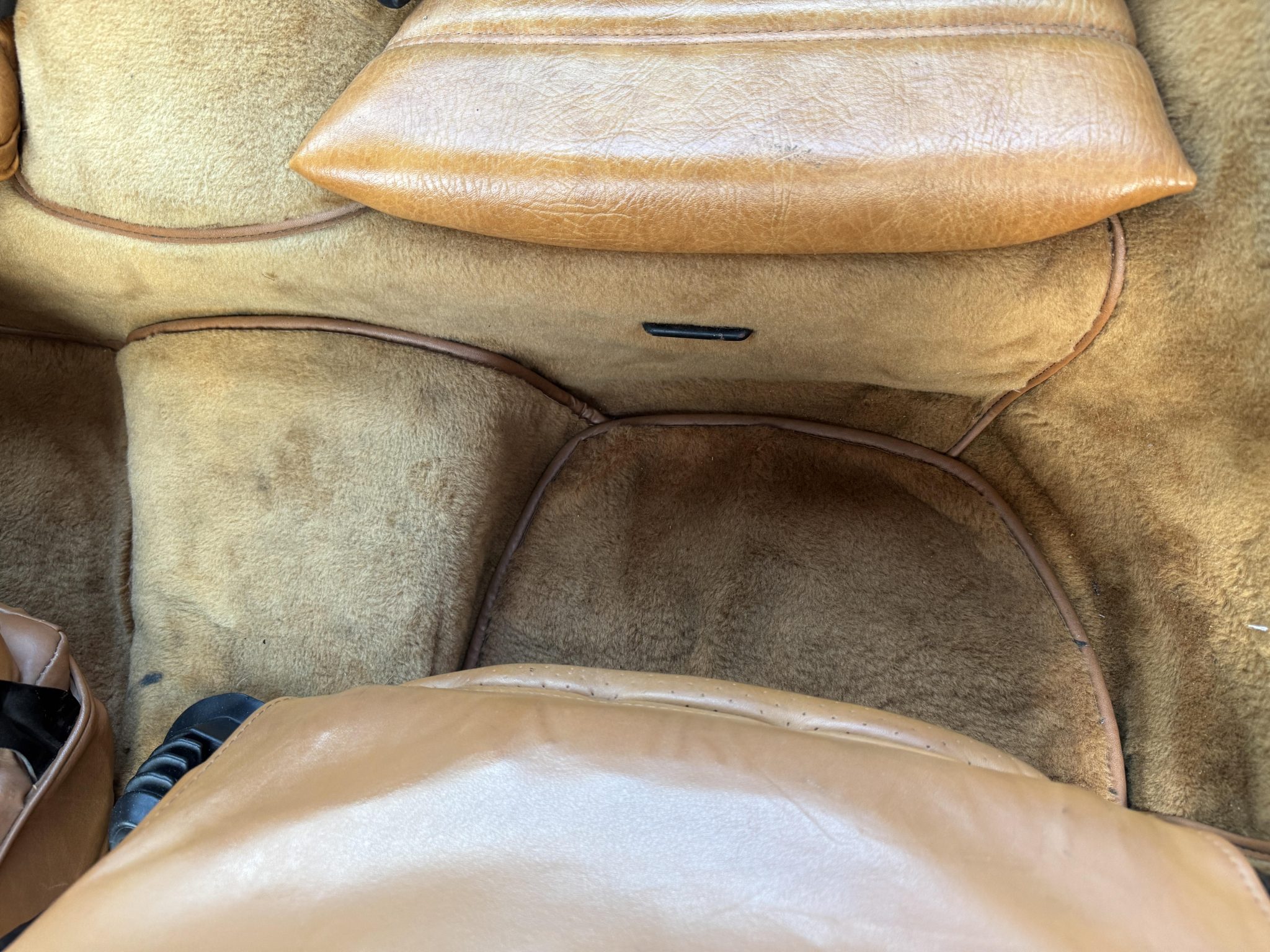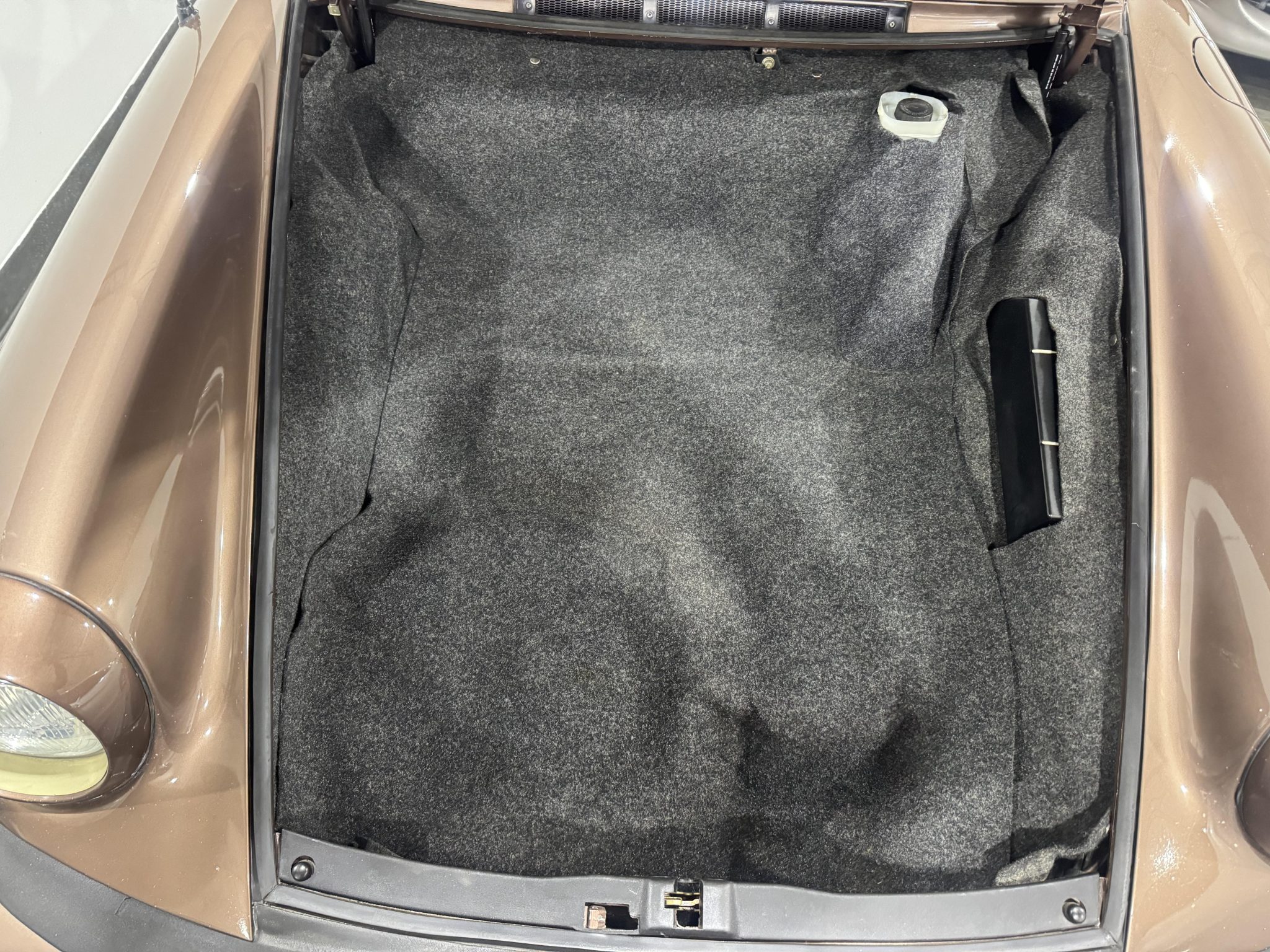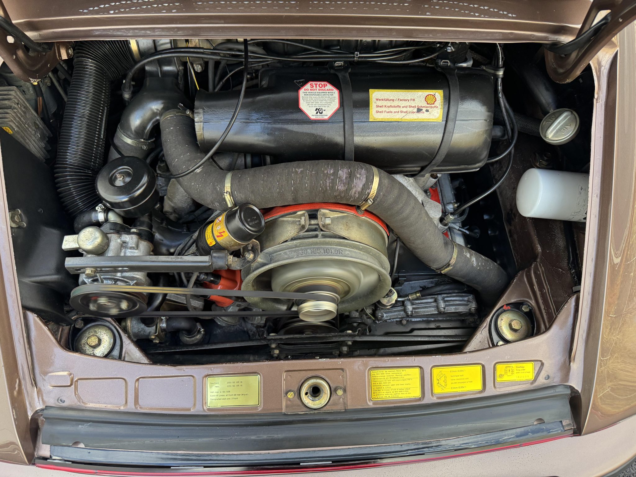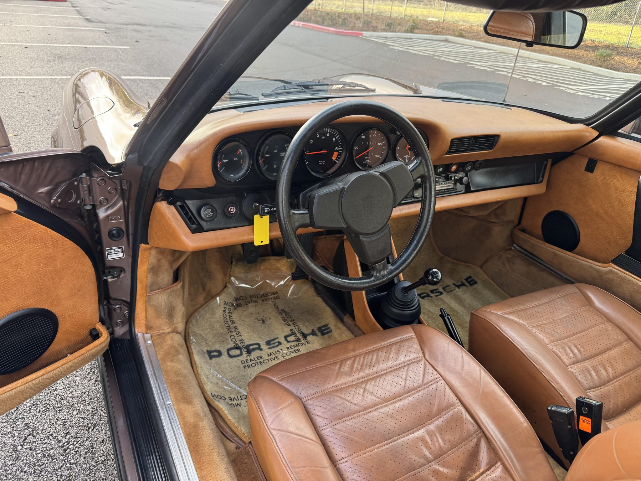 Powered by a 3.0-liter flat-six paired with a five-speed manual transaxle, the car is finished in Copper Brown Metallic over Cork leatherette upholstery. Equipment includes 16″ BBS wheels, a removable roof panel, a leather-wrapped steering wheel, power windows, cruise control, and a Blaupunkt cassette stereo.