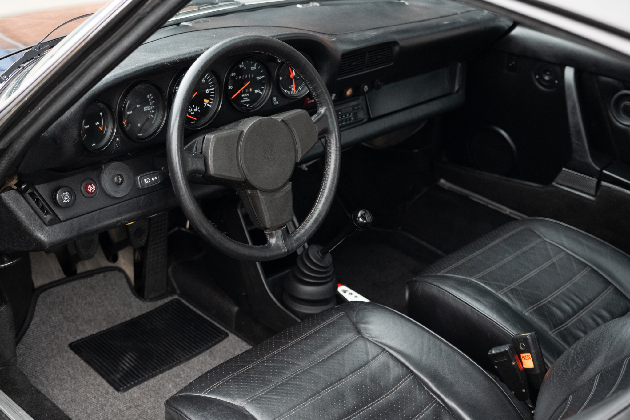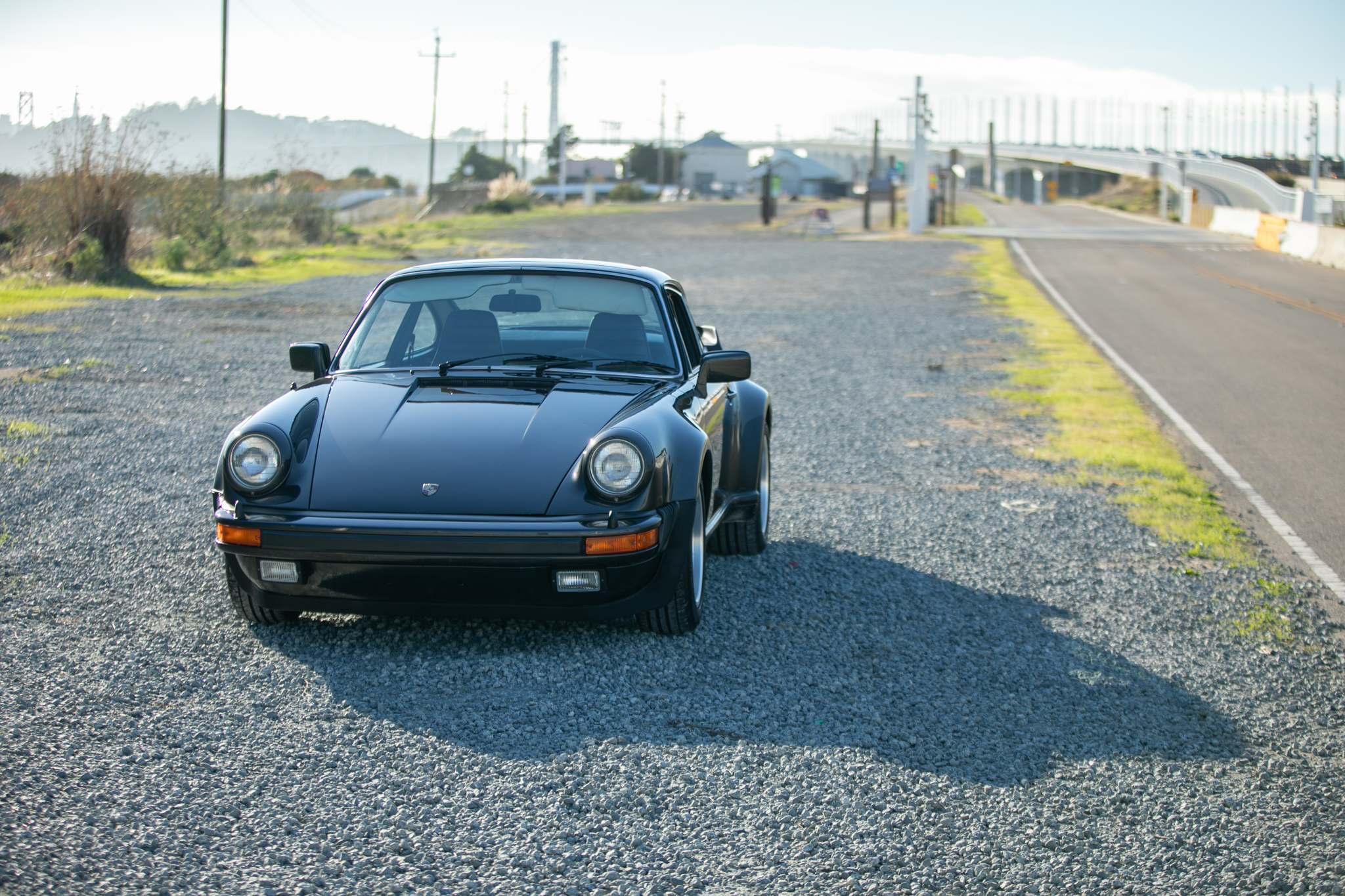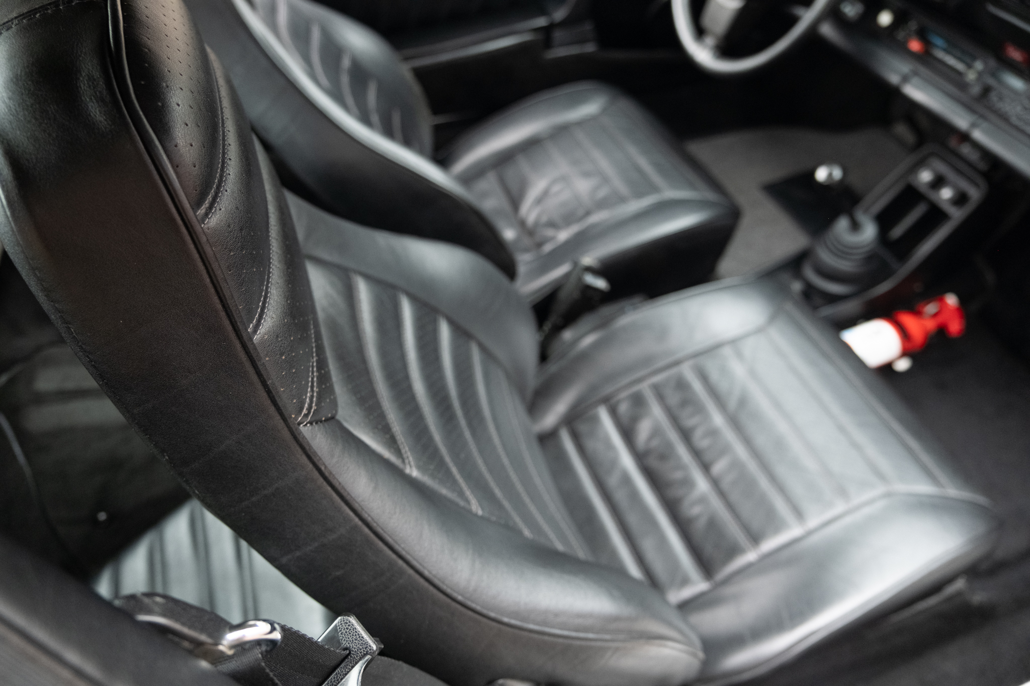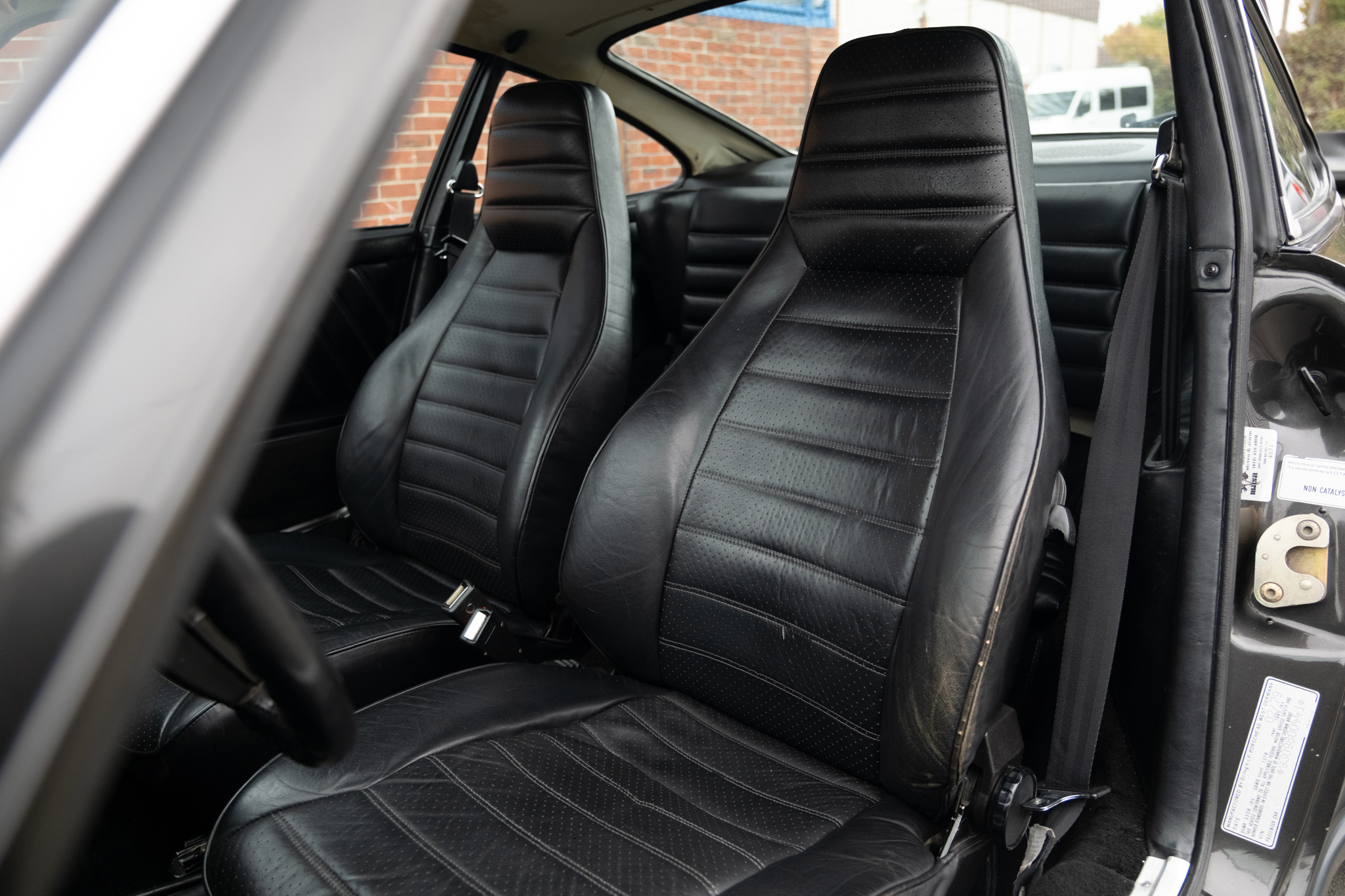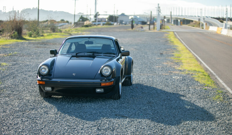 This 1979 Porsche 930 Turbo is finished in Black Metallic over black leather upholstery and powered by a turbocharged 3.3-liter flat-six paired with a four-speed manual transaxle. Equipment includes front and rear spoilers, fog lights, 16″ Fuchs wheels, and an aftermarket stereo system.