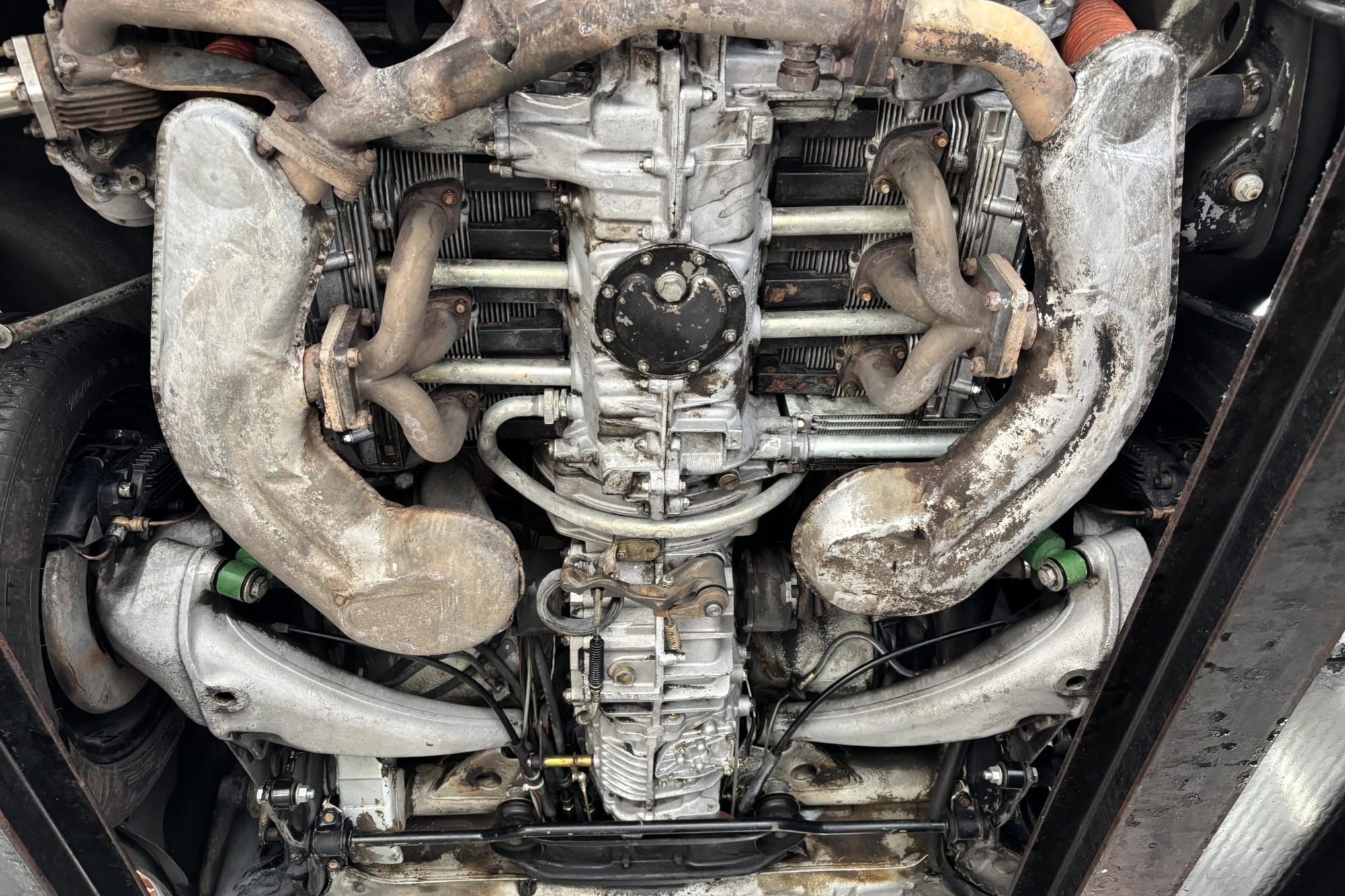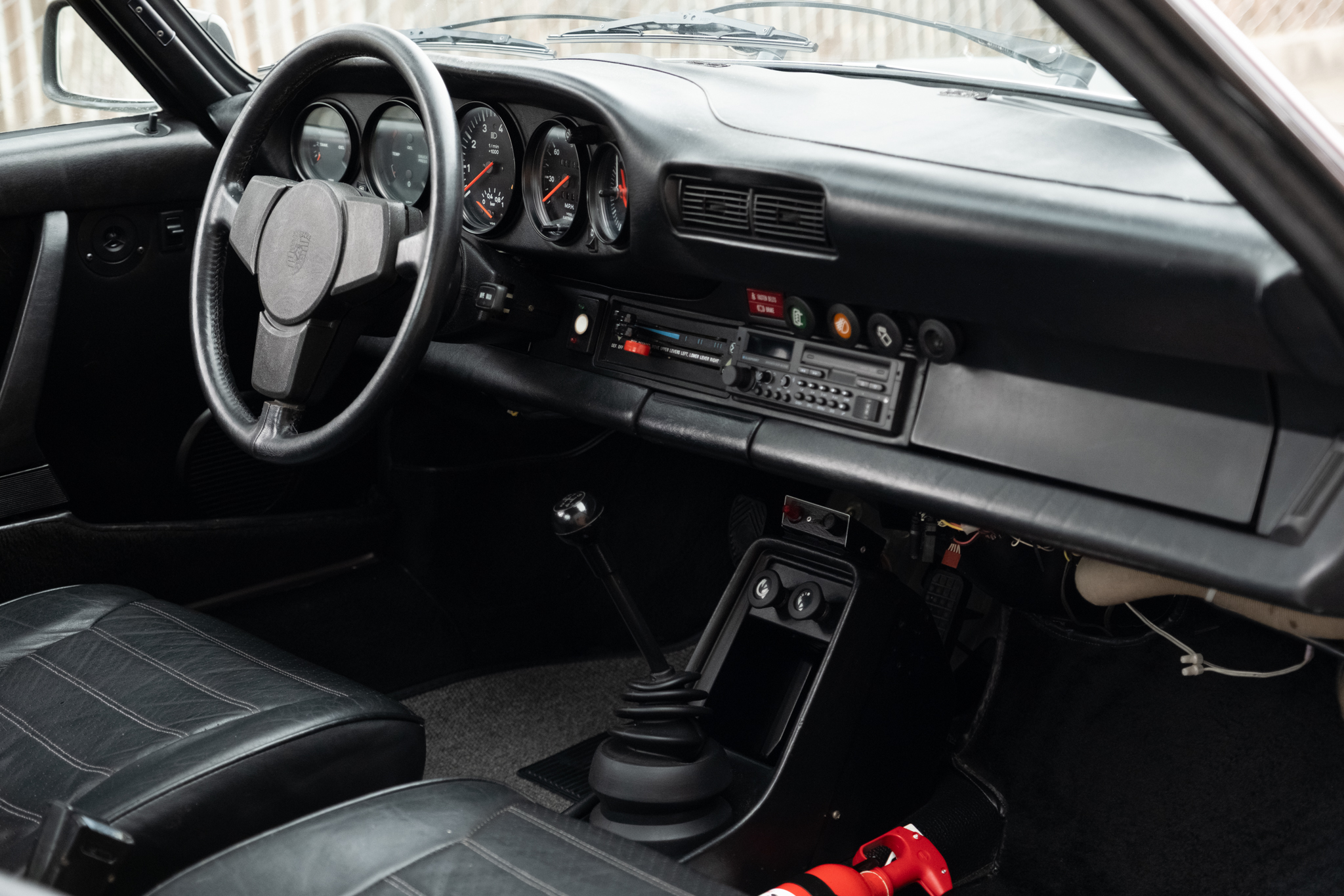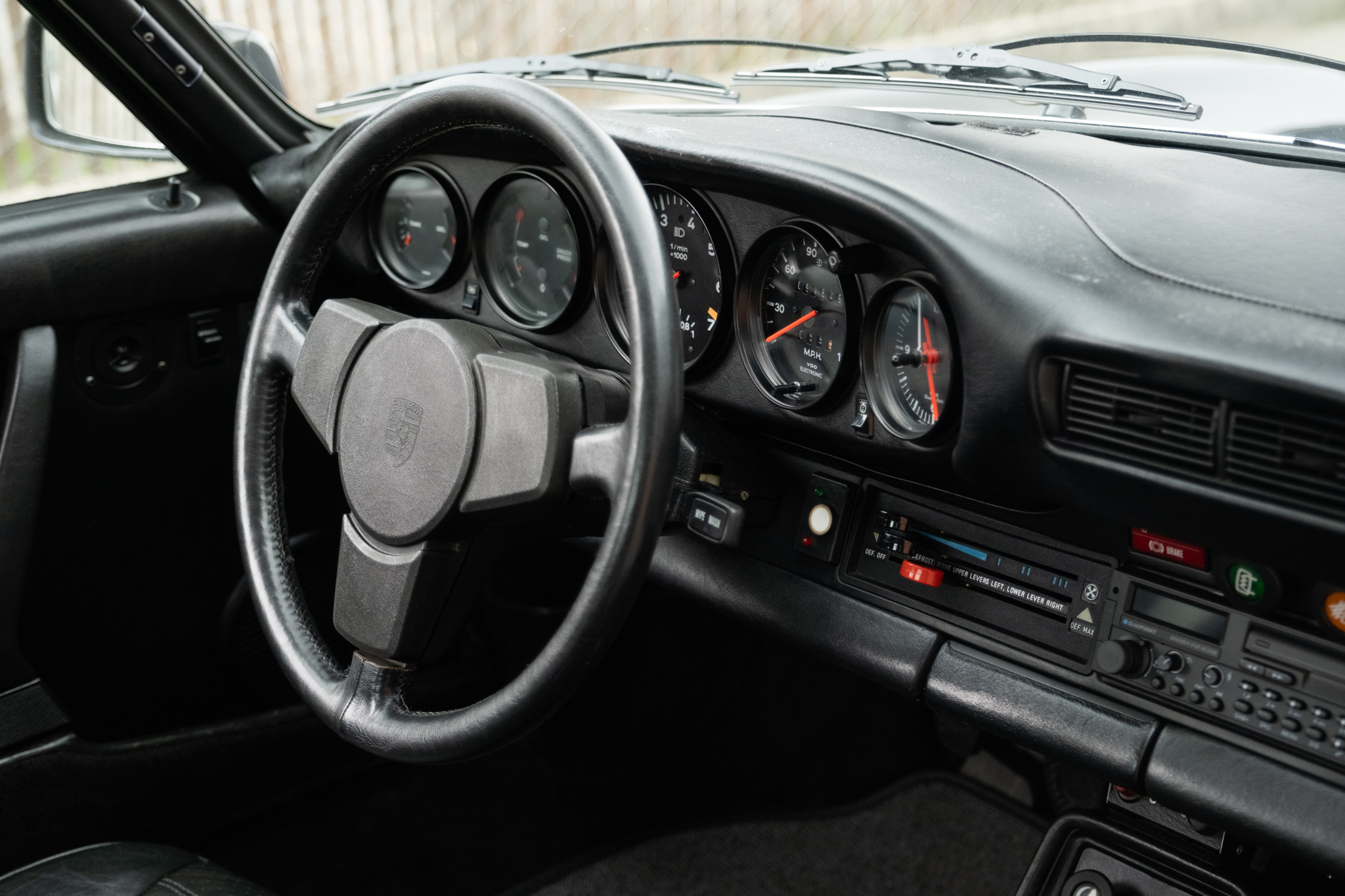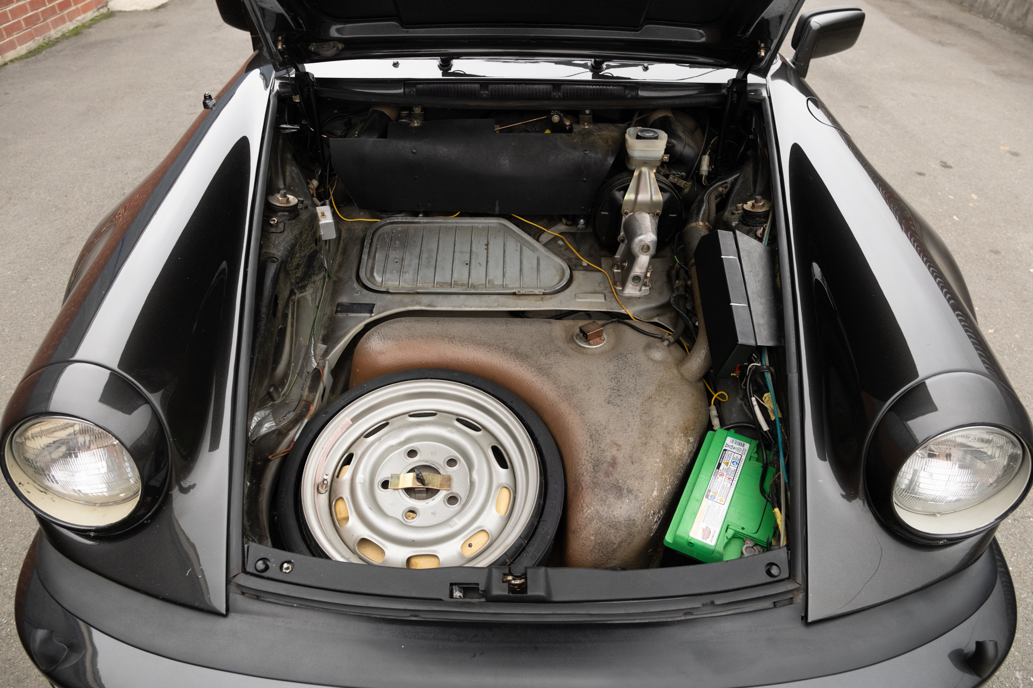This 1979 Porsche 930 Turbo is finished in Black Metallic over black leather upholstery and powered by a turbocharged 3.3-liter flat-six paired with a four-speed manual transaxle. Equipment includes front and rear spoilers, fog lights, 16″ Fuchs wheels, and an aftermarket stereo system.