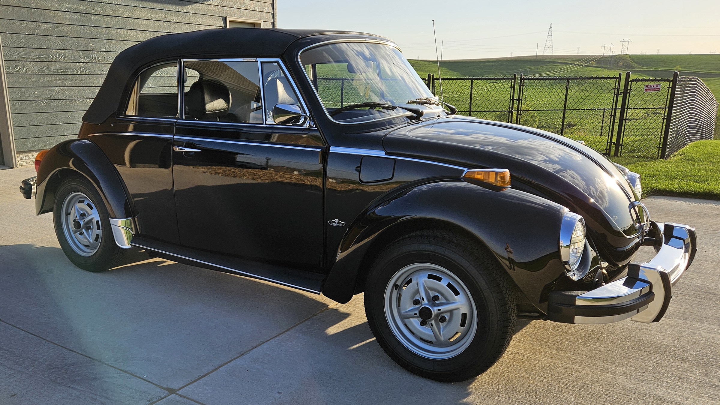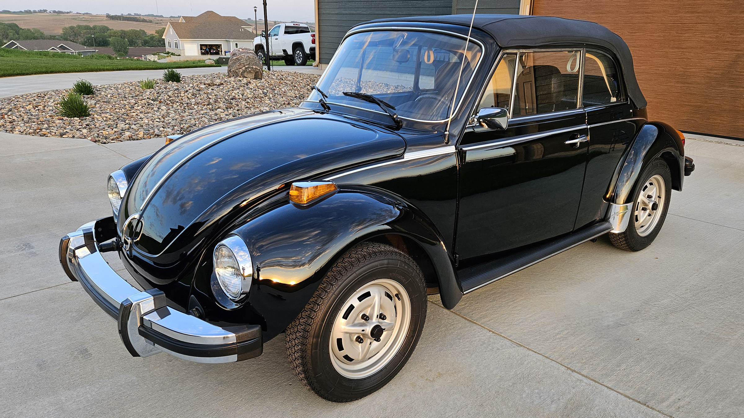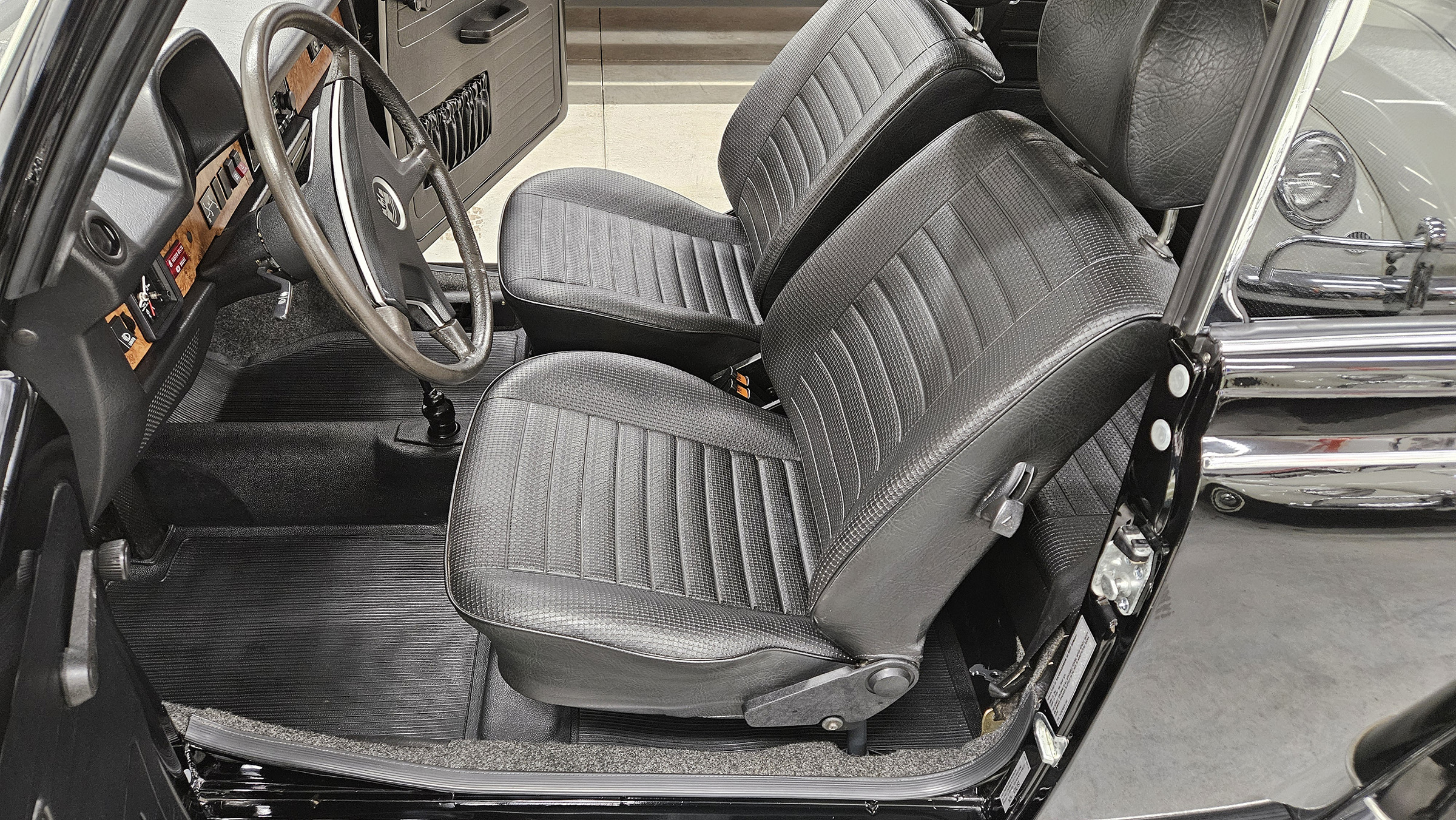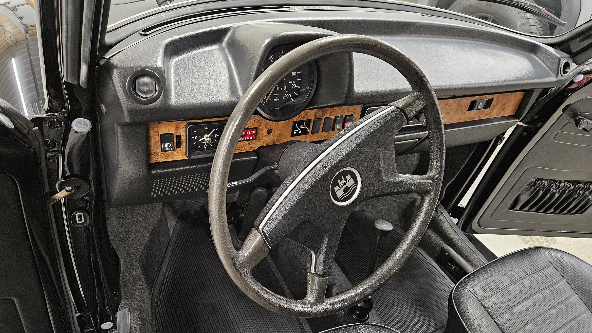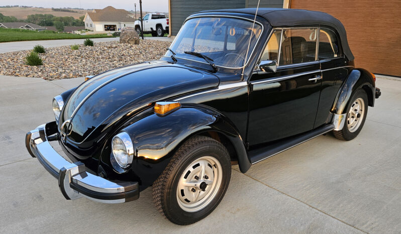 Power comes from a fuel-injected air-cooled 1.6L flat-four paired with a four-speed manual transaxle, and the body is finished in black over black upholstery. Additional equipment includes a black convertible soft top and boot, 15″ Lemmerz sport steel wheels, rack and pinion steering, woodgrain dashboard appliqué, and a Blaupunkt AM/FM radio.