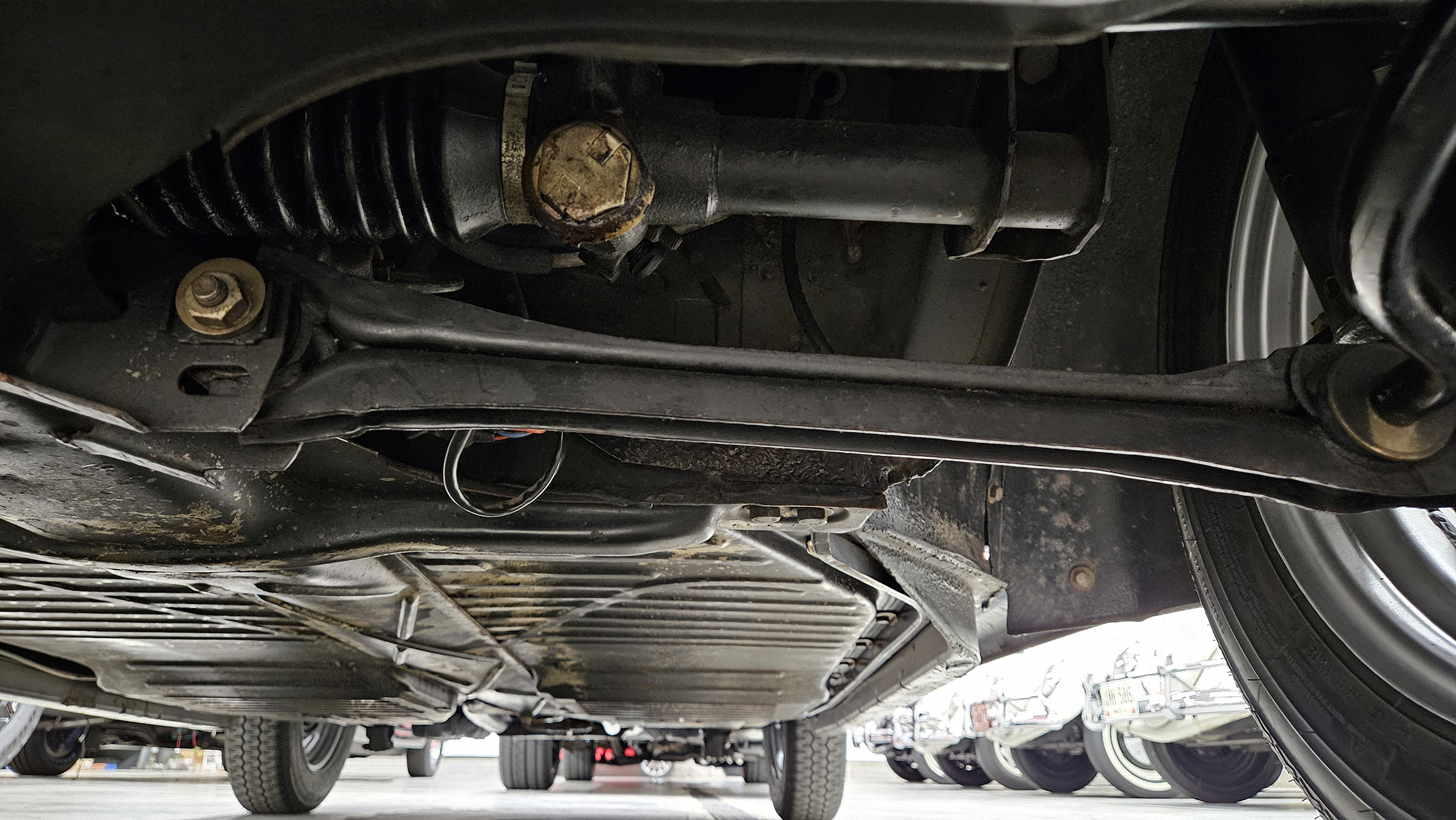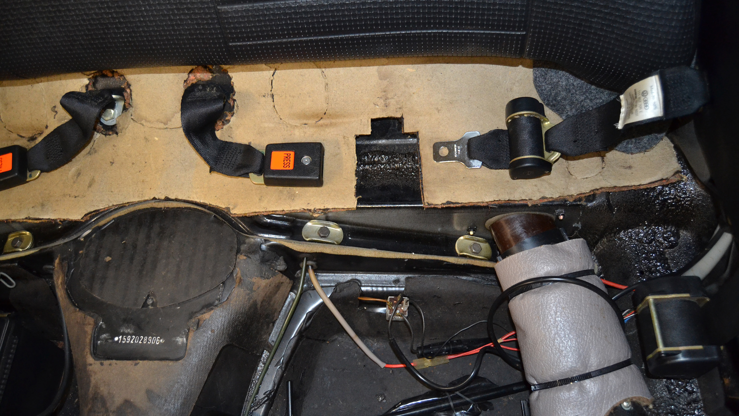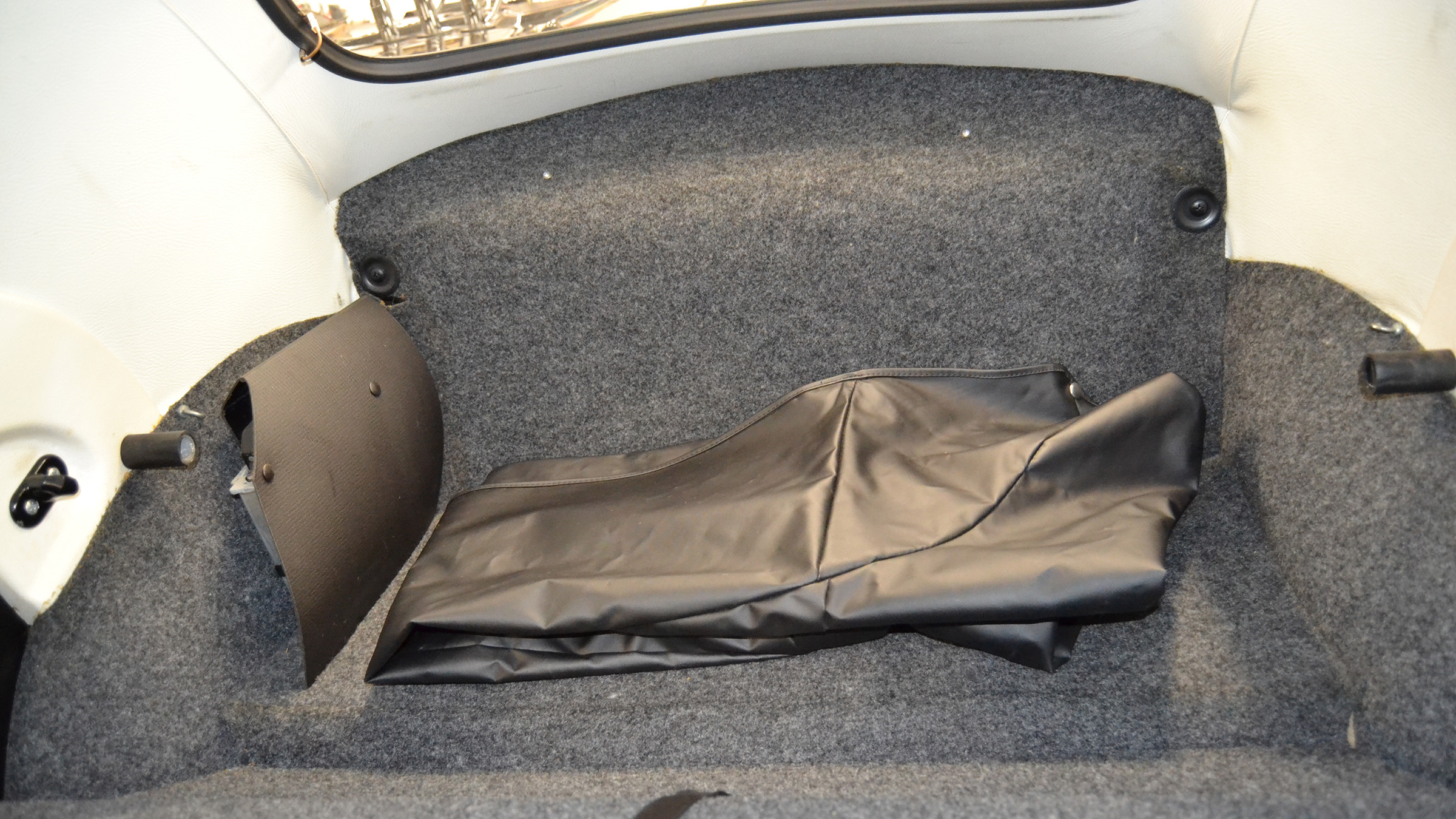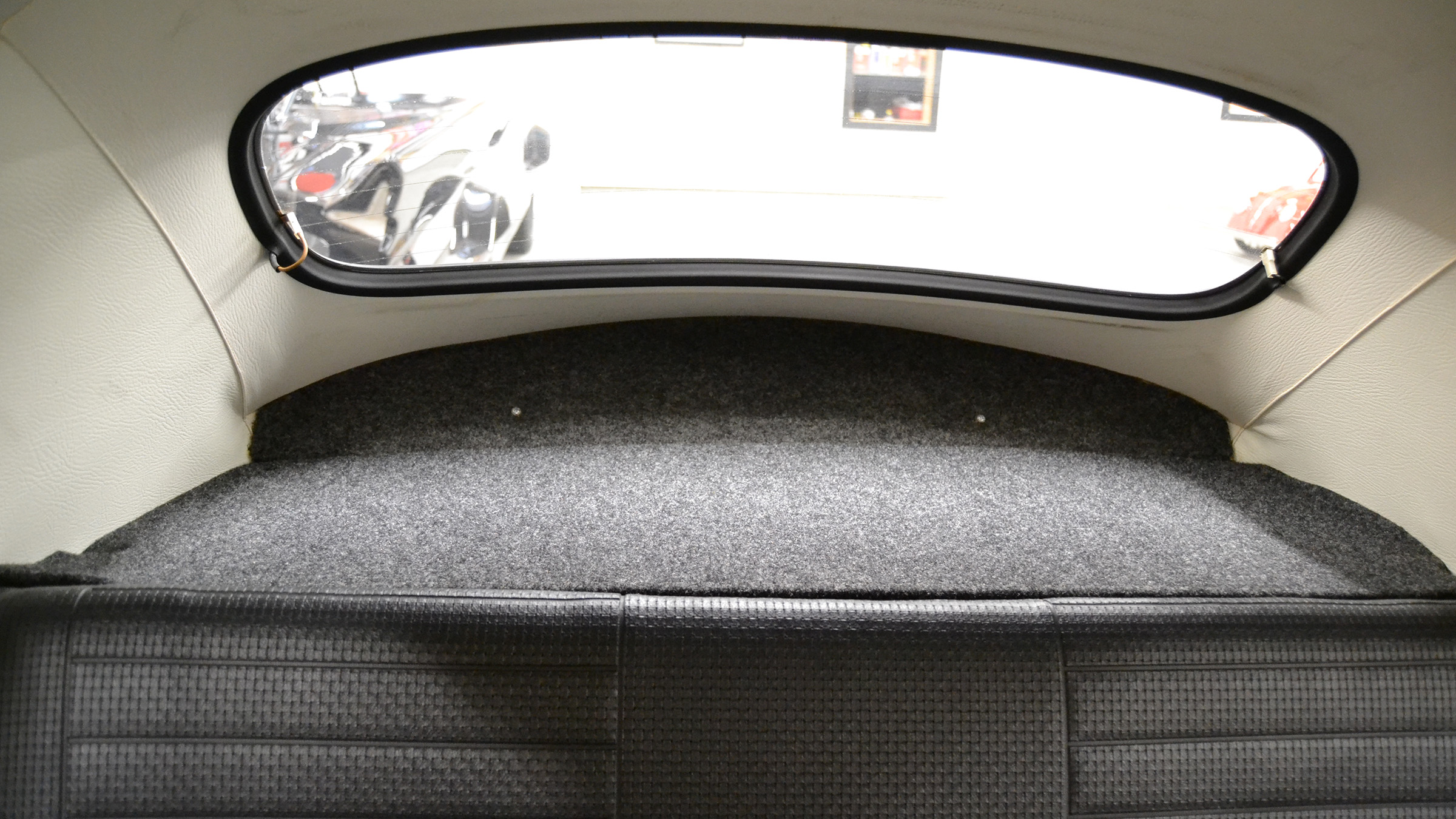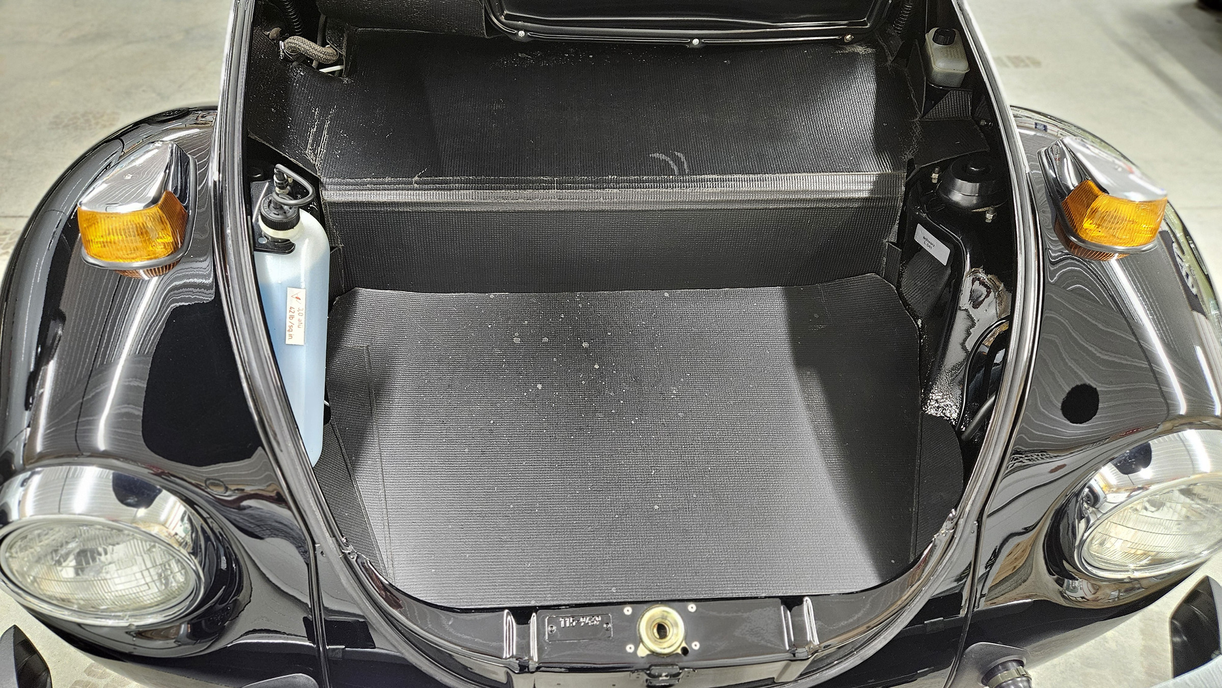 Power comes from a fuel-injected air-cooled 1.6L flat-four paired with a four-speed manual transaxle, and the body is finished in black over black upholstery. Additional equipment includes a black convertible soft top and boot, 15″ Lemmerz sport steel wheels, rack and pinion steering, woodgrain dashboard appliqué, and a Blaupunkt AM/FM radio.