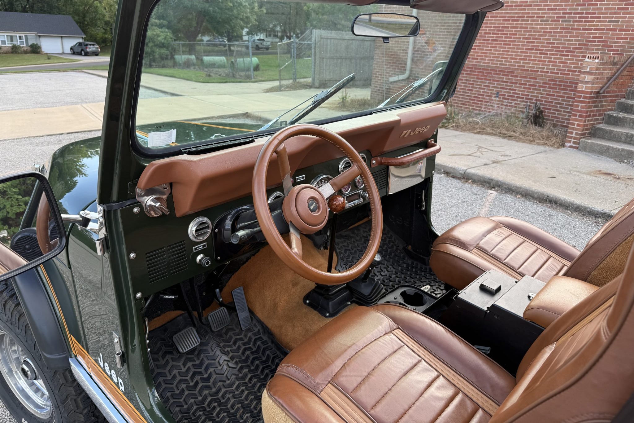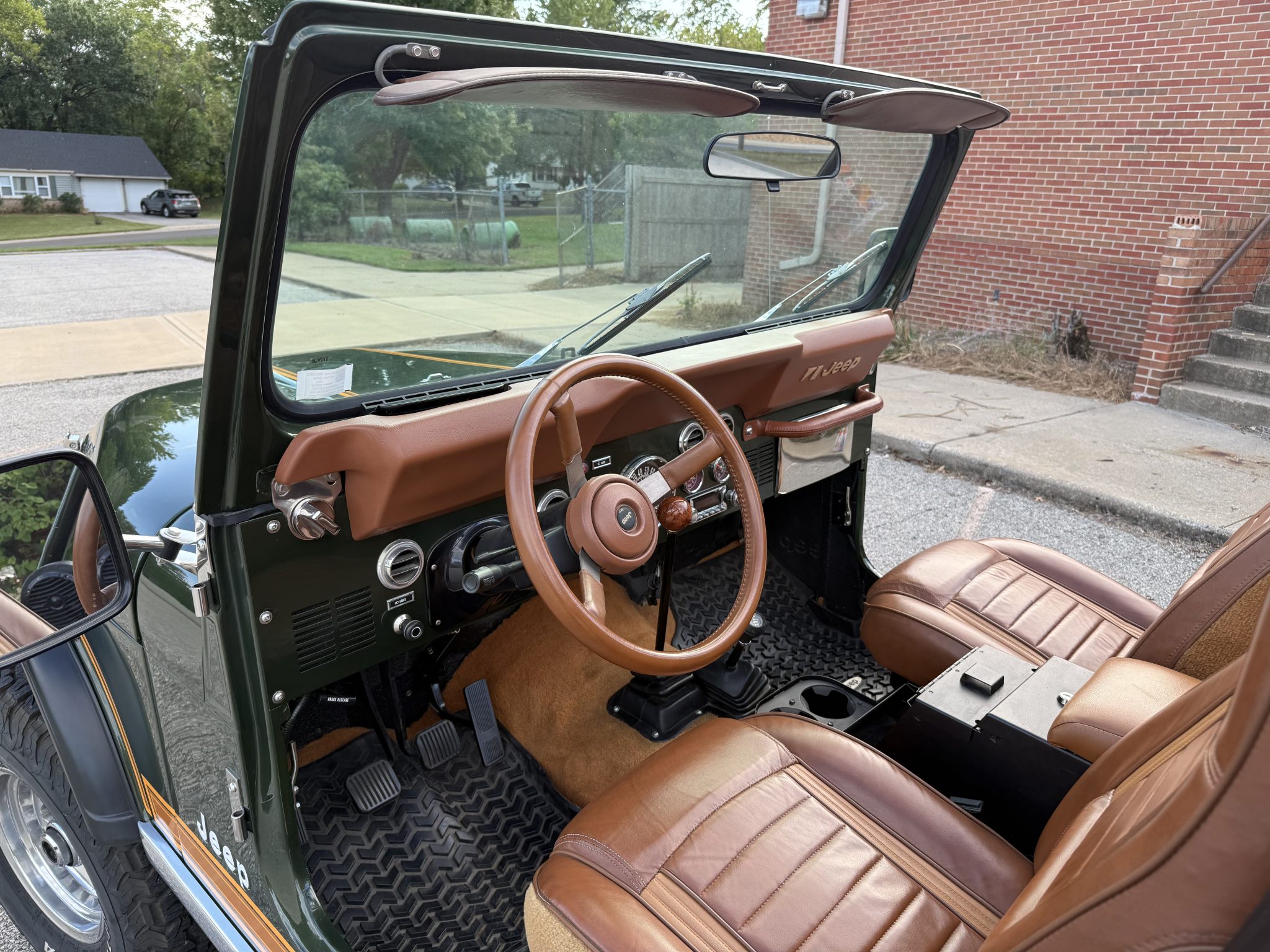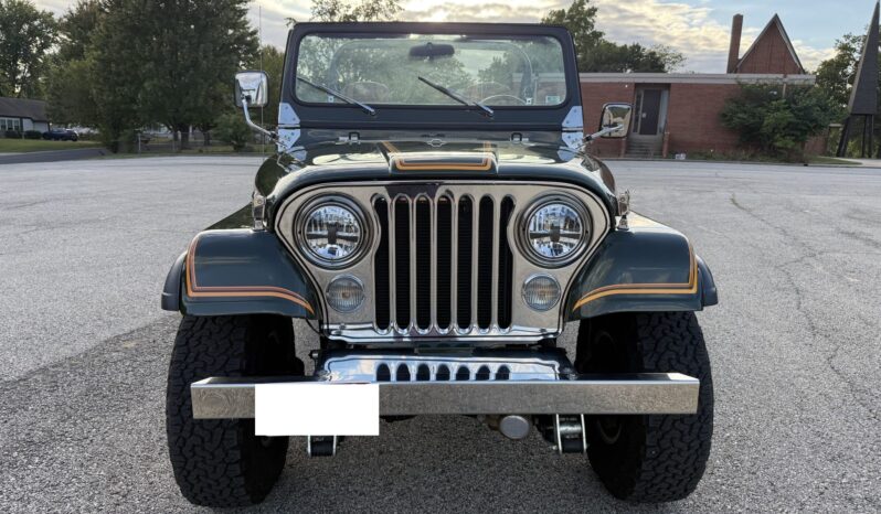 Finished in Nordic Green over Nutmeg leather, the truck is powered by an AMC 401ci V8 linked with a four-speed manual transmission and a dual-range transfer case. Equipment includes Holley Sniper EFI, an Edelbrock air cleaner, an aluminum radiator, tubular exhaust headers, a custom dual exhaust system, power steering, manually locking front hubs, a suspension lift kit, front disc brakes, 15″ Mickey Thompson wheels, 32″ BFGoodrich tires, polished bumpers, bright trim, LED lighting, a roll bar, a cabin heater, and a RetroSound stereo linked to a Rockford Fosgate sound system.