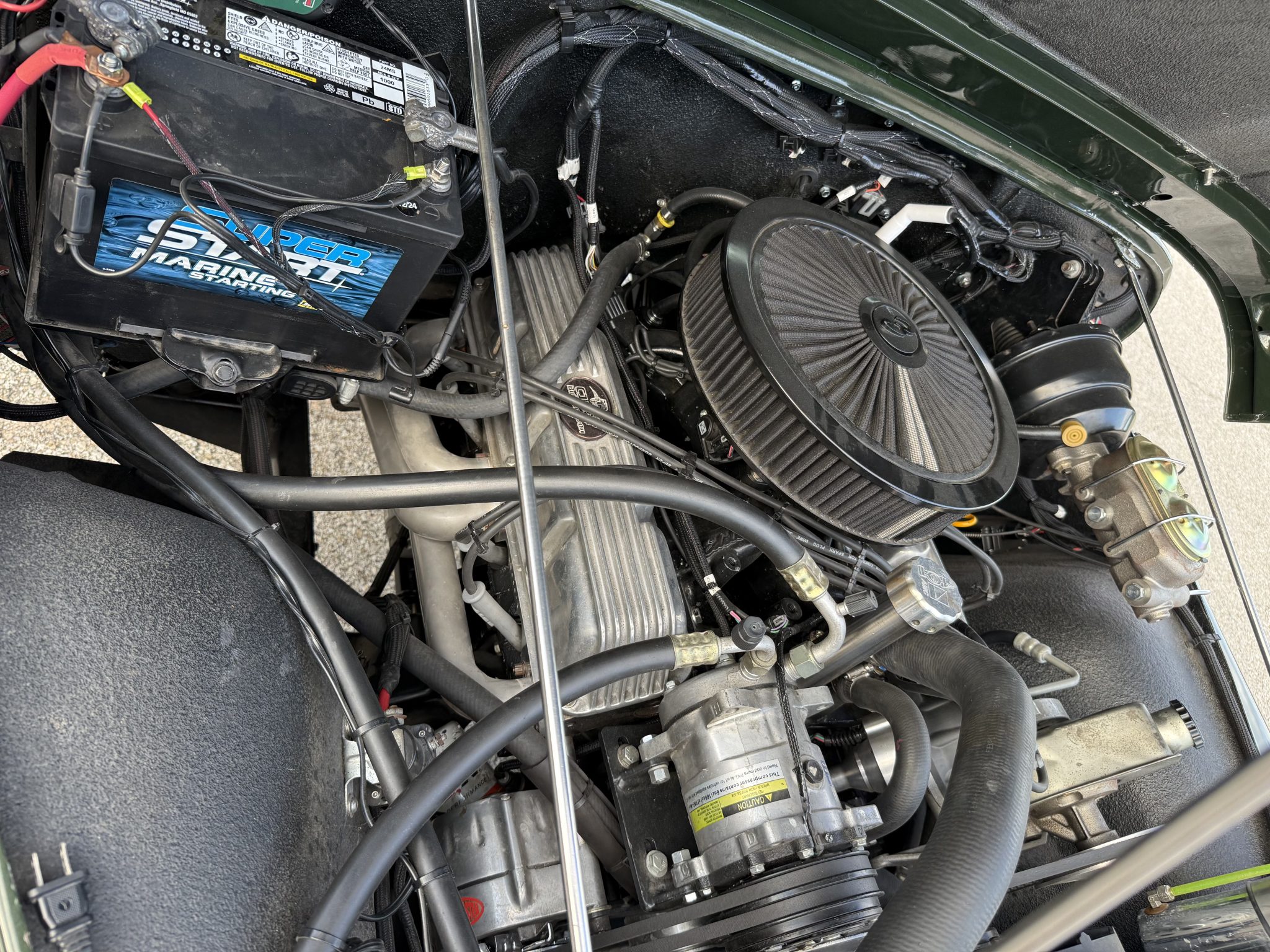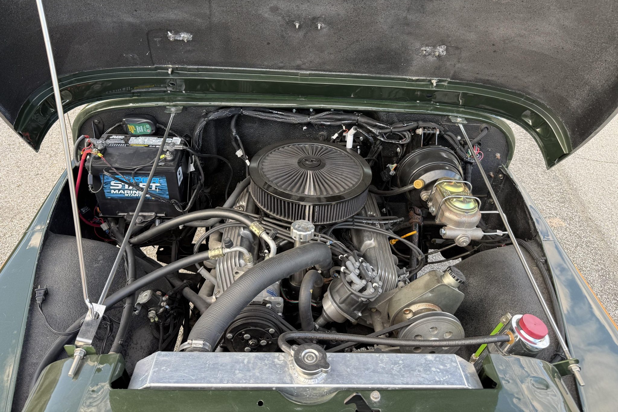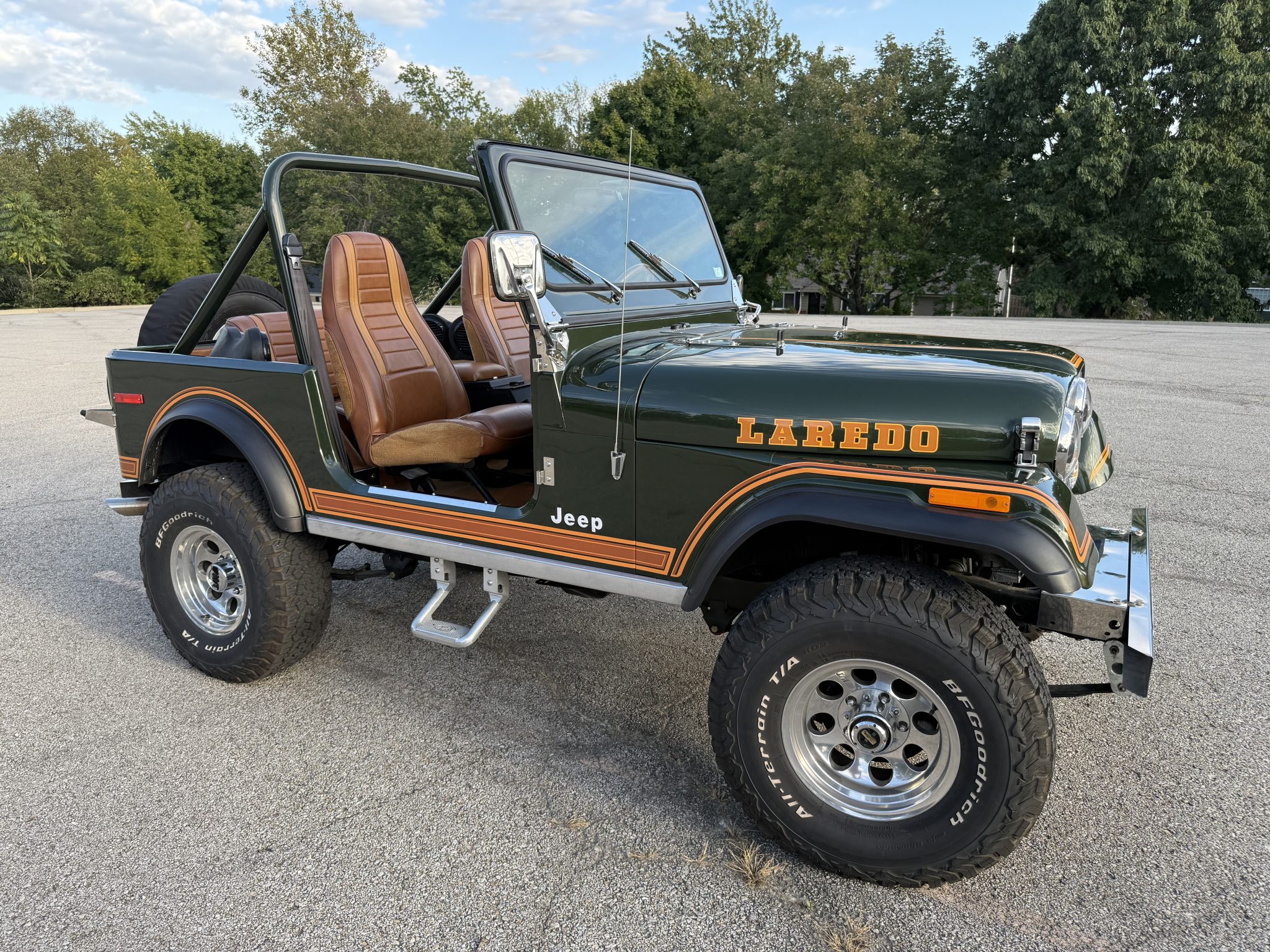 Finished in Nordic Green over Nutmeg leather, the truck is powered by an AMC 401ci V8 linked with a four-speed manual transmission and a dual-range transfer case. Equipment includes Holley Sniper EFI, an Edelbrock air cleaner, an aluminum radiator, tubular exhaust headers, a custom dual exhaust system, power steering, manually locking front hubs, a suspension lift kit, front disc brakes, 15″ Mickey Thompson wheels, 32″ BFGoodrich tires, polished bumpers, bright trim, LED lighting, a roll bar, a cabin heater, and a RetroSound stereo linked to a Rockford Fosgate sound system.