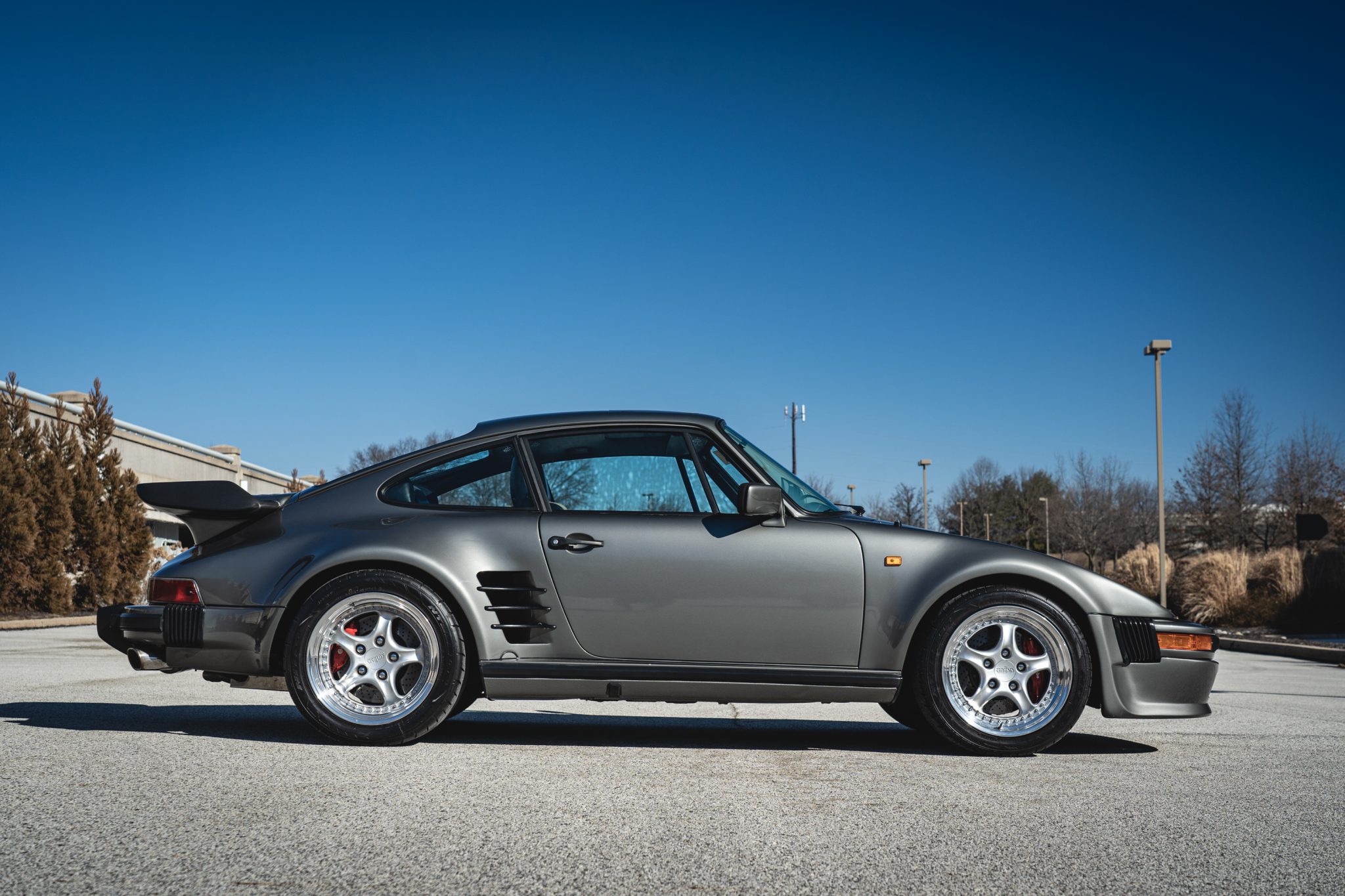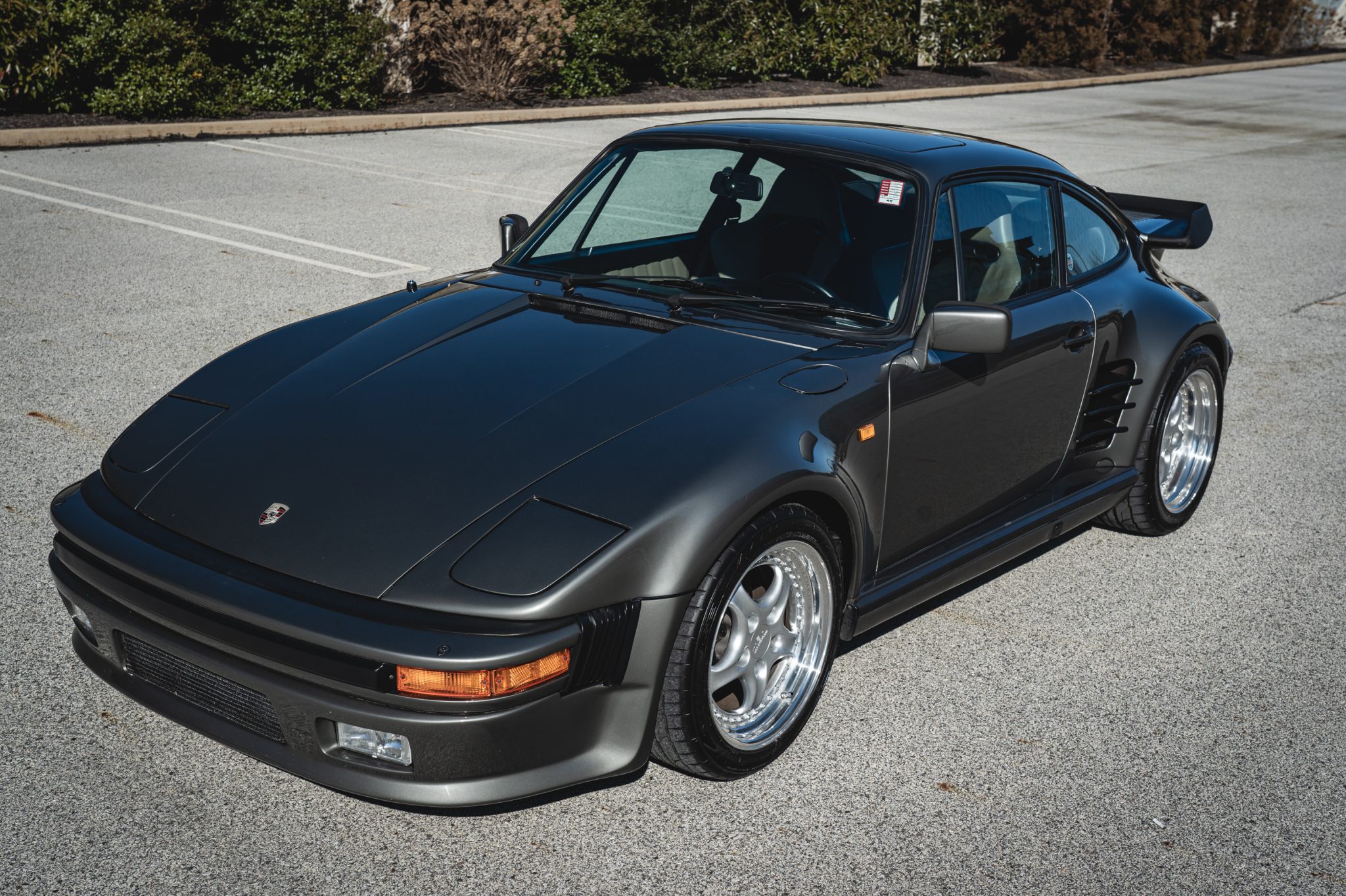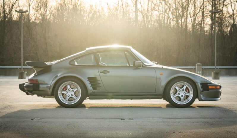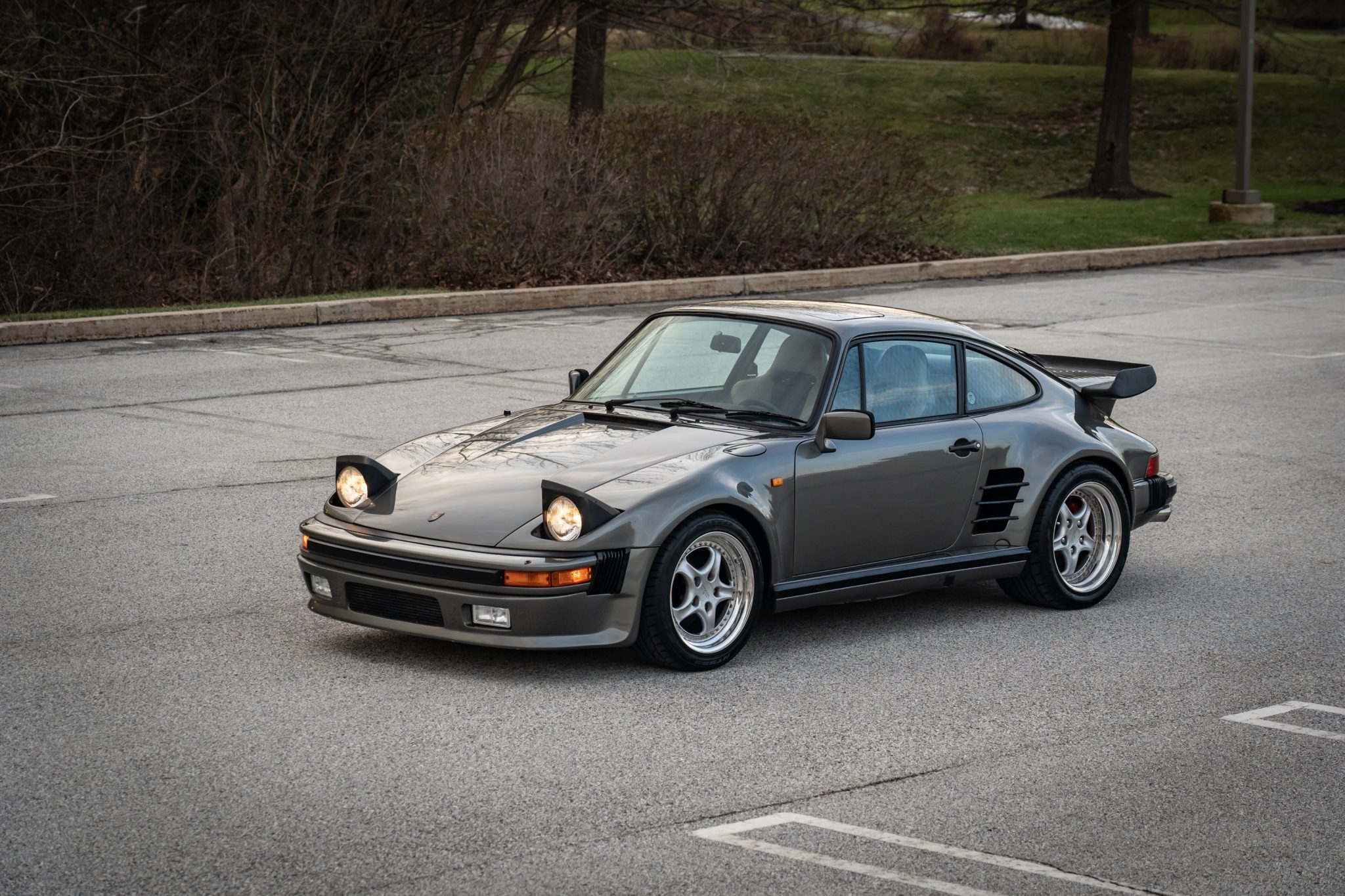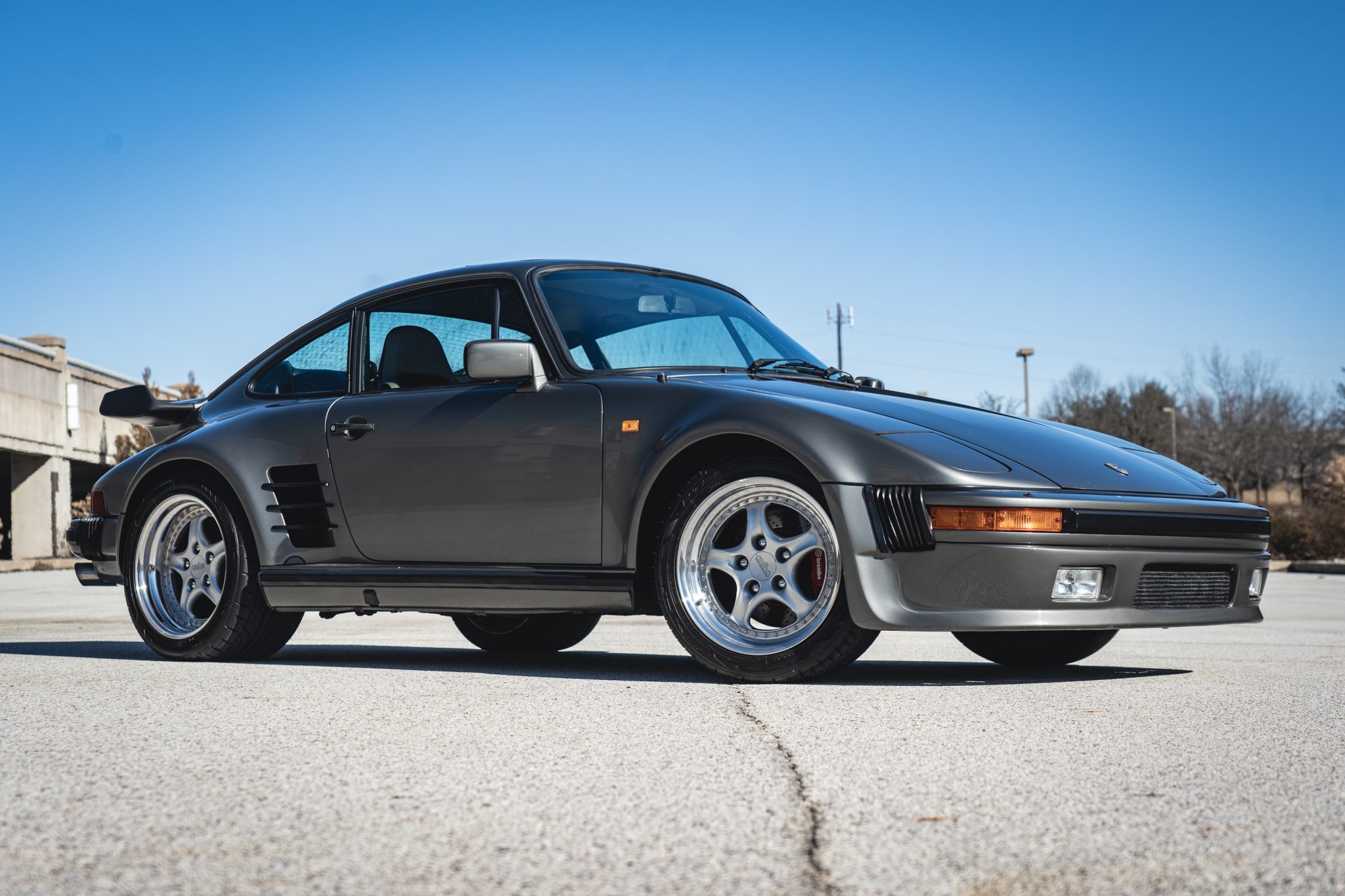 Power is provided by a turbocharged 3.3L flat-six mated to a four-speed manual transaxle and a limited-slip differential, and the car is finished in metallic gray over a two-tone interior. Modifications include a slant-nose conversion, Brembo calipers, 17″ Kinesis wheels, an aftermarket intercooler and exhaust, Recaro front seats, aftermarket pedals, an Andial boost gauge, and HKS tuning components