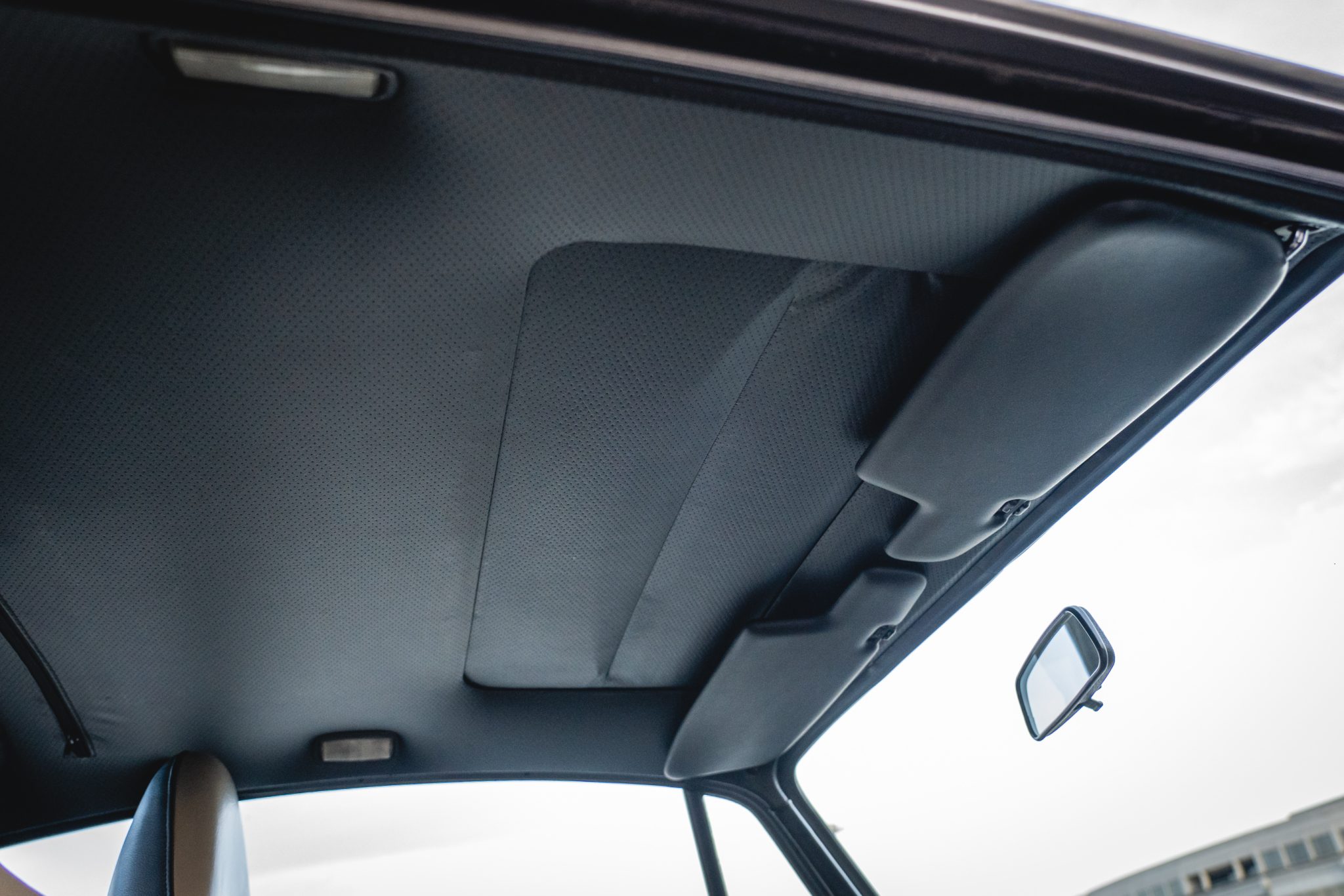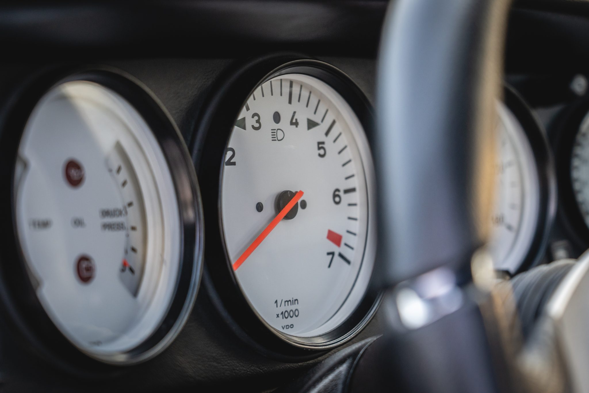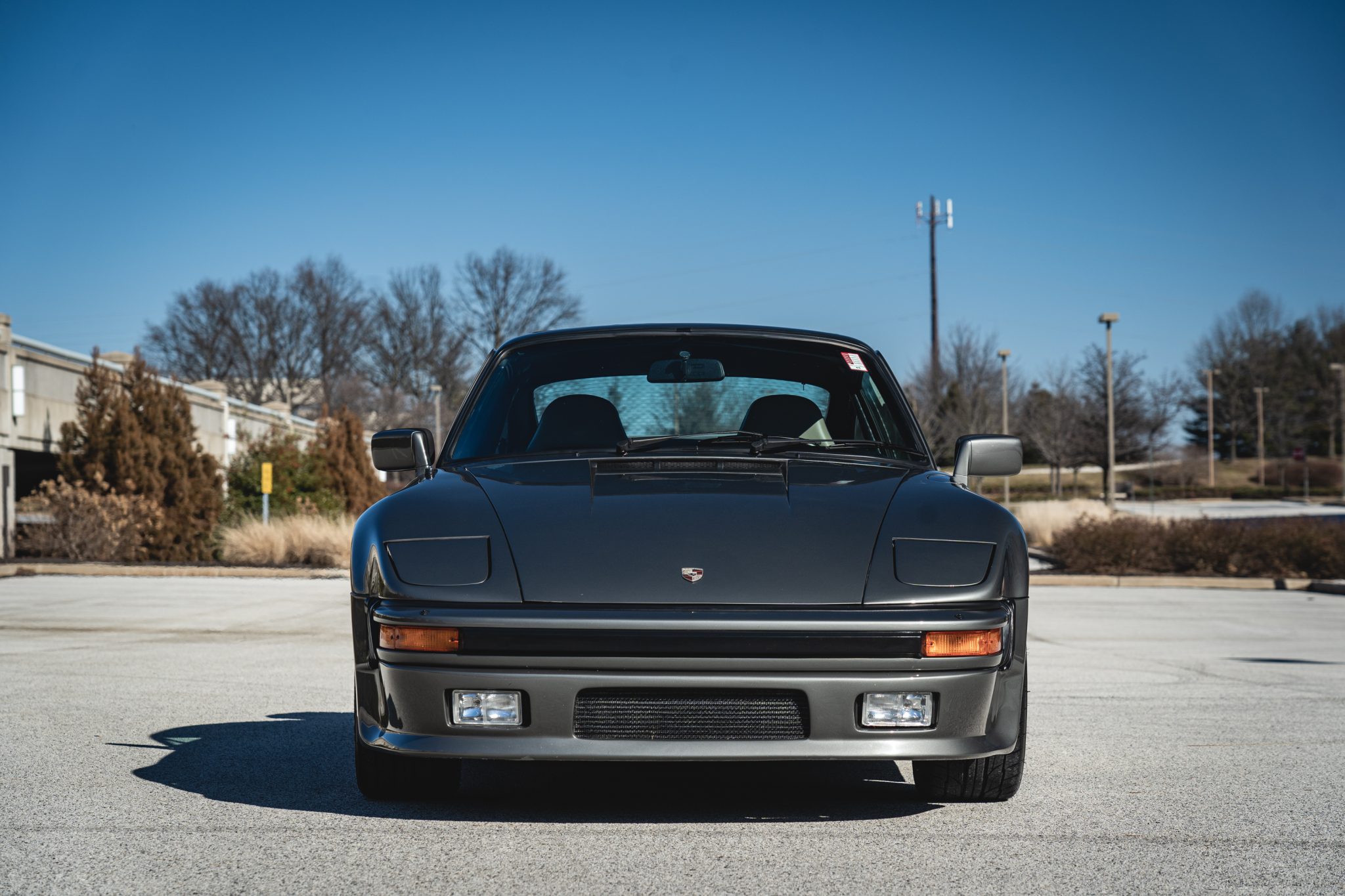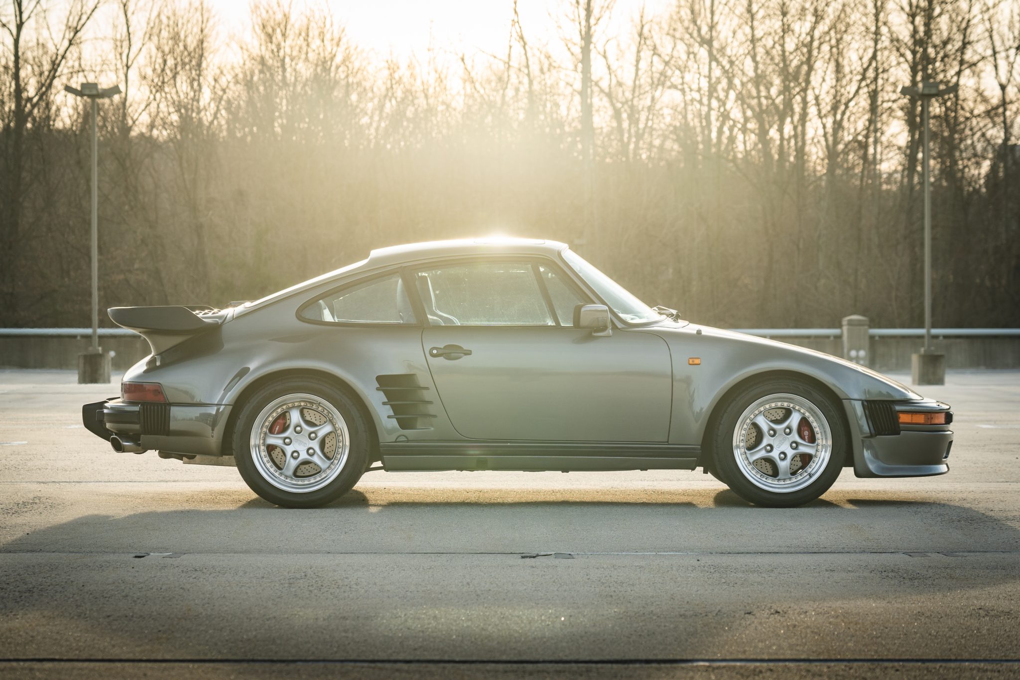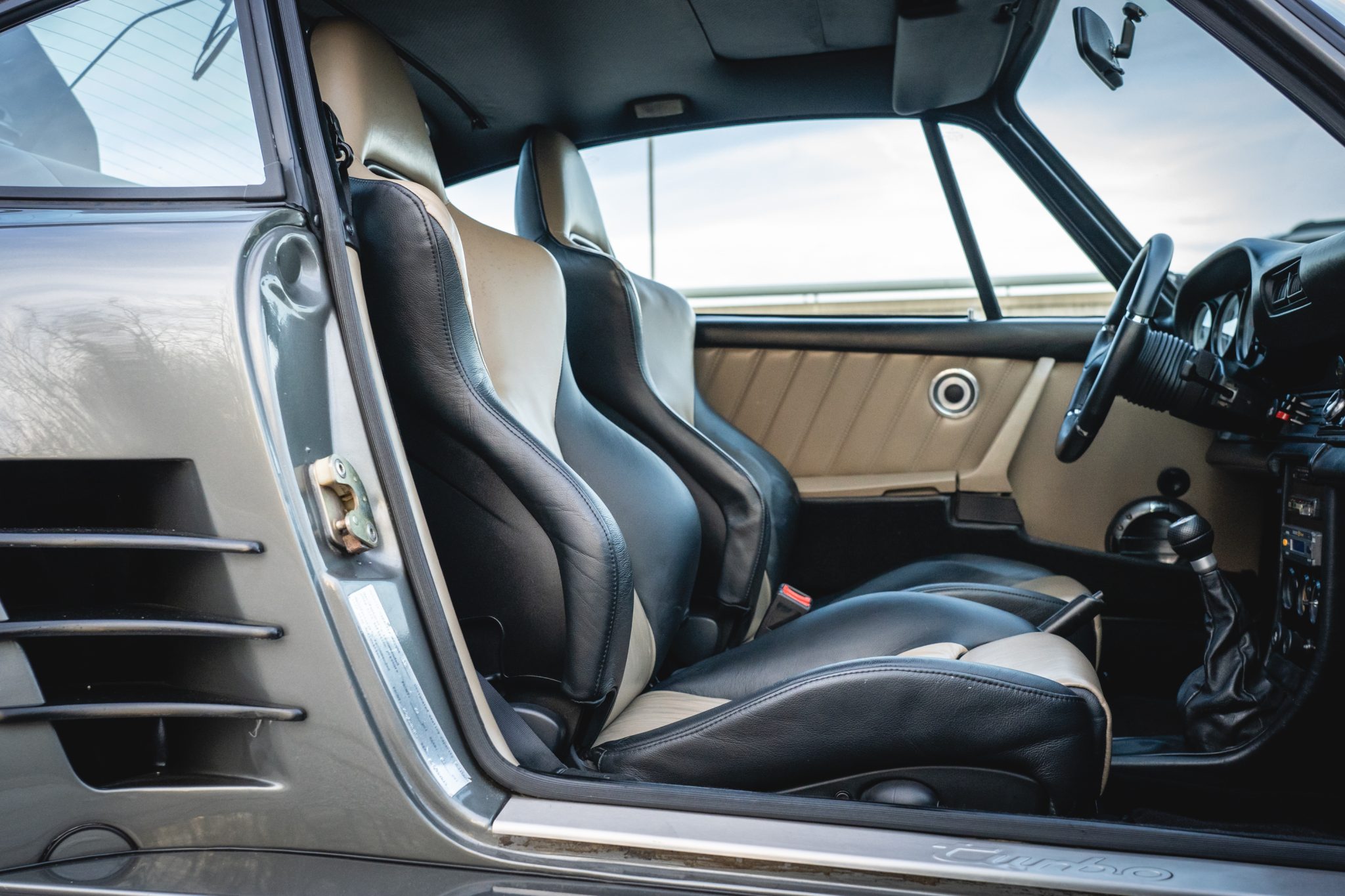 Power is provided by a turbocharged 3.3L flat-six mated to a four-speed manual transaxle and a limited-slip differential, and the car is finished in metallic gray over a two-tone interior. Modifications include a slant-nose conversion, Brembo calipers, 17″ Kinesis wheels, an aftermarket intercooler and exhaust, Recaro front seats, aftermarket pedals, an Andial boost gauge, and HKS tuning components