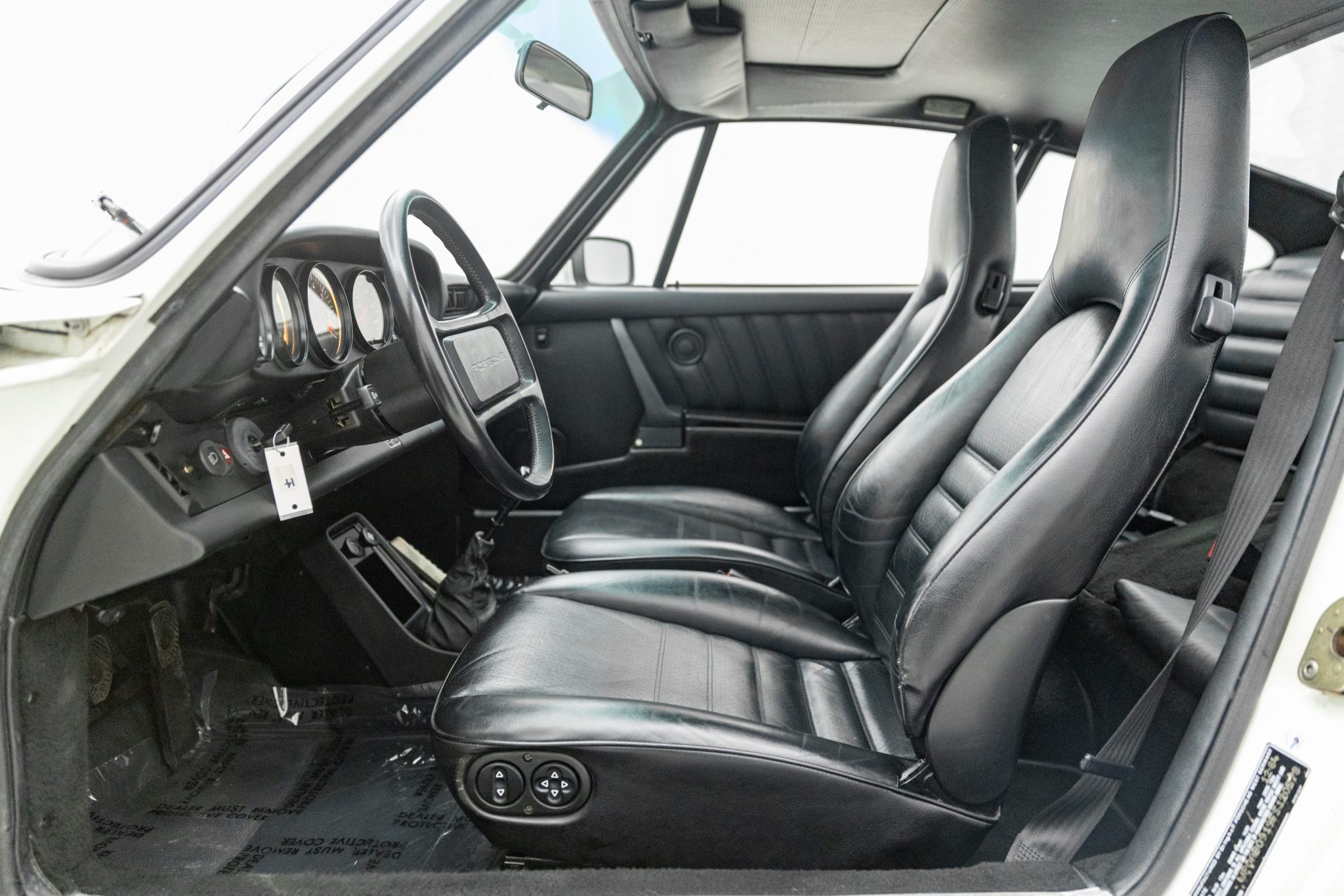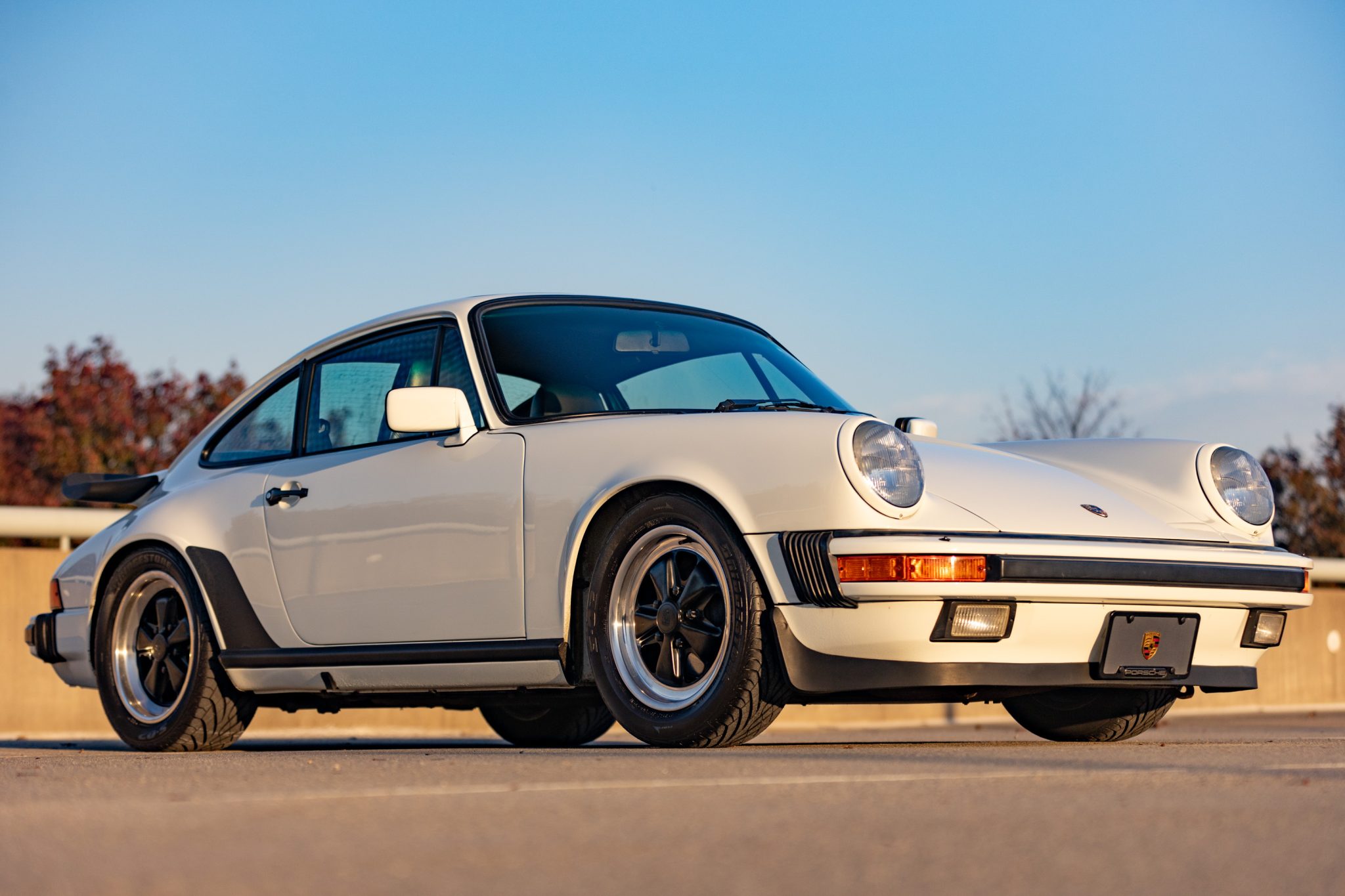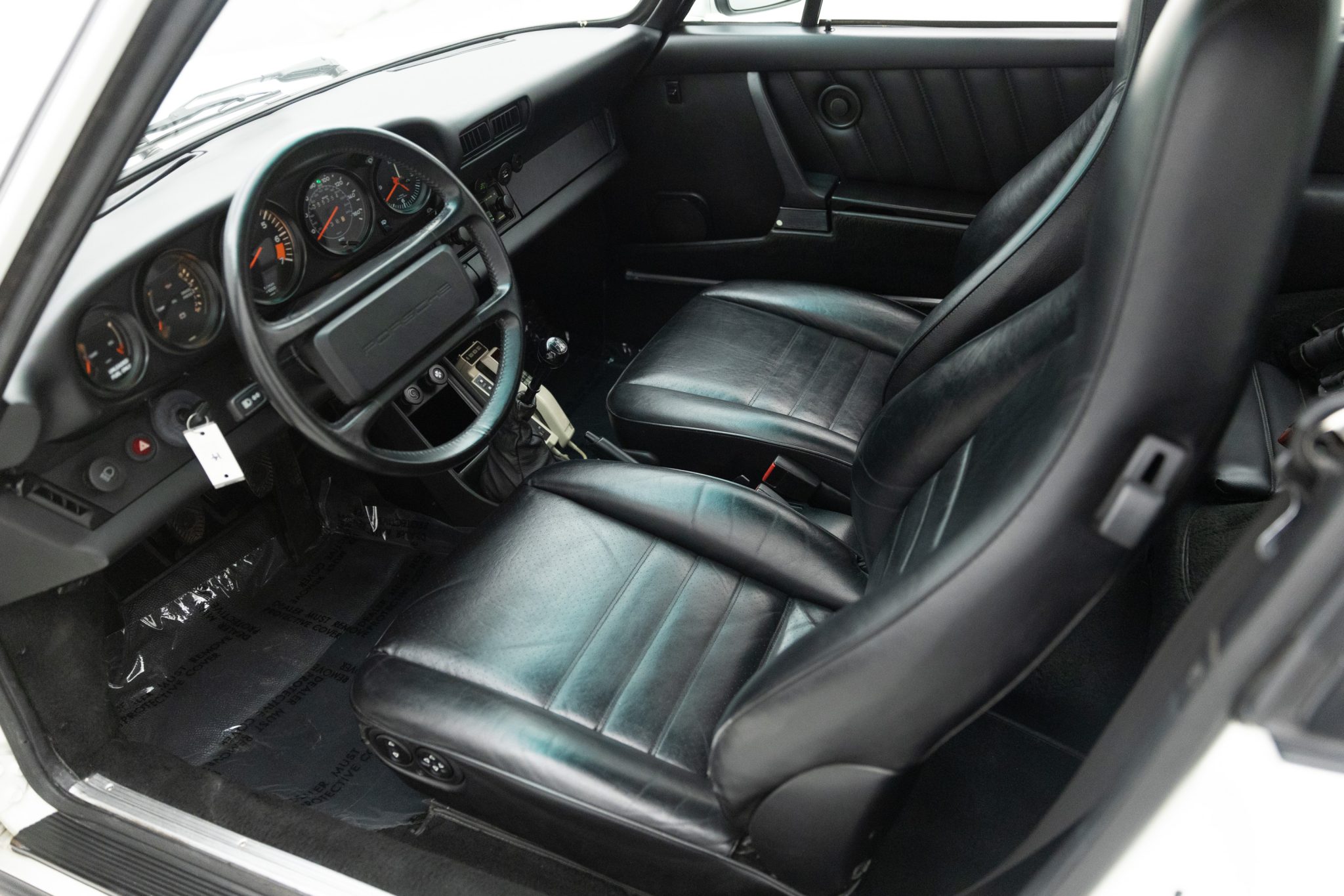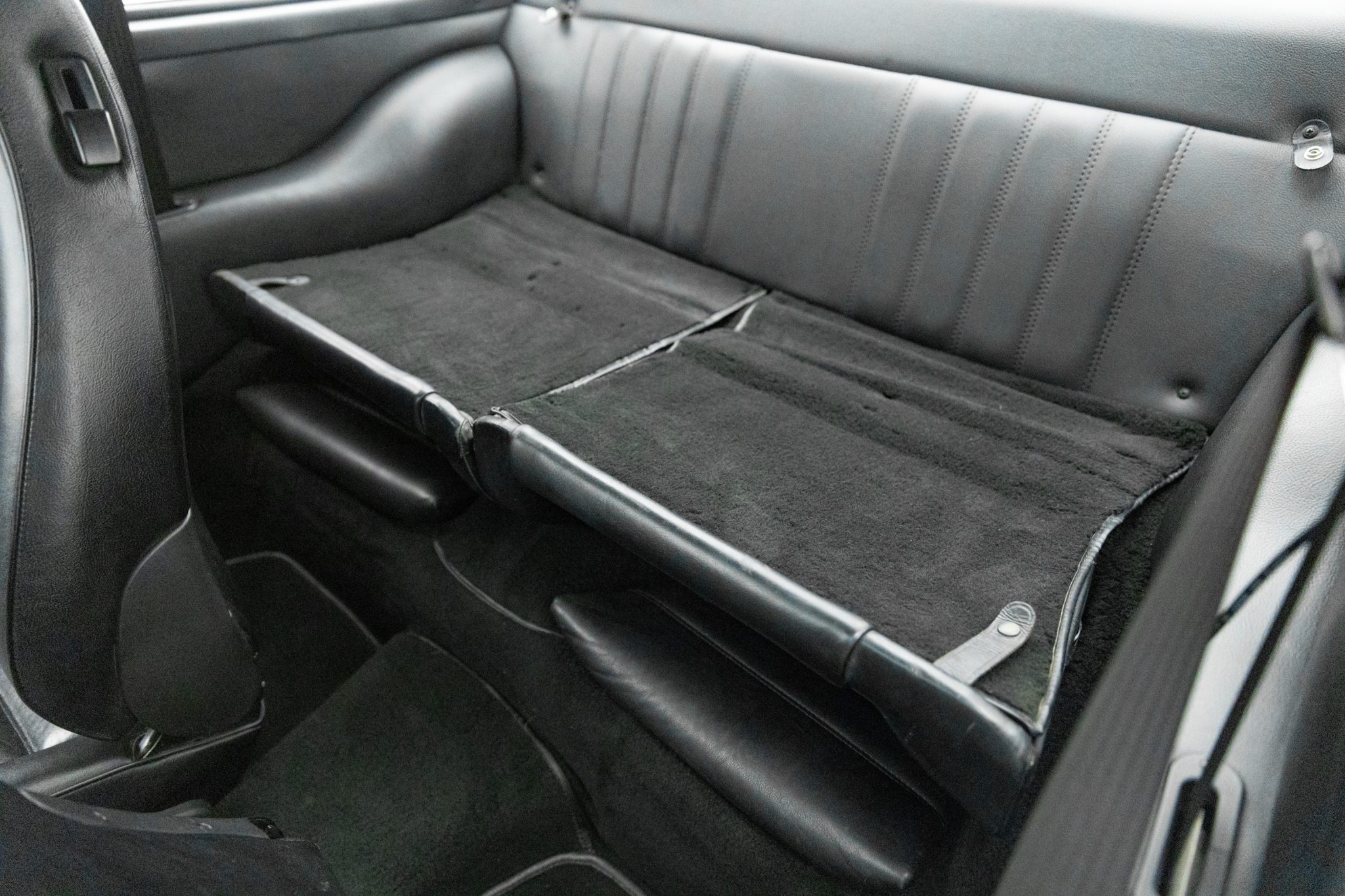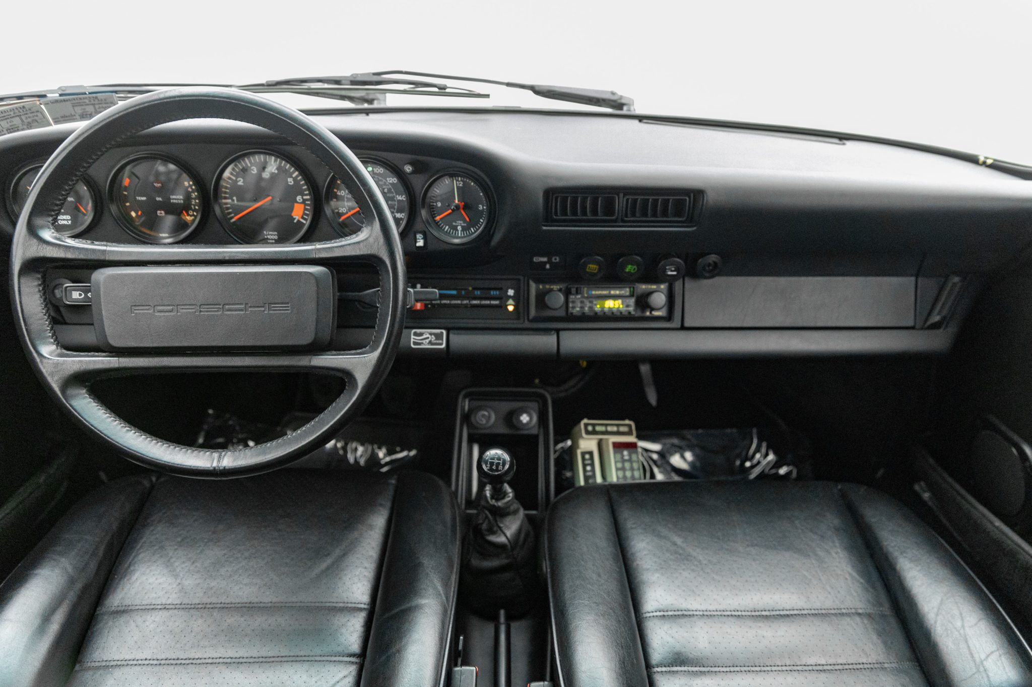 The car is powered by a 3.2-liter flat-six paired with a 915 five-speed manual transaxle and is finished in Grand Prix White over black leather upholstery. Equipment includes 16″ Fuchs alloy wheels, a rear spoiler, a power-operated sunroof, a power-adjustable driver’s seat, air conditioning, power windows, cruise control, and a Blaupunkt AM/FM/cassette stereo.