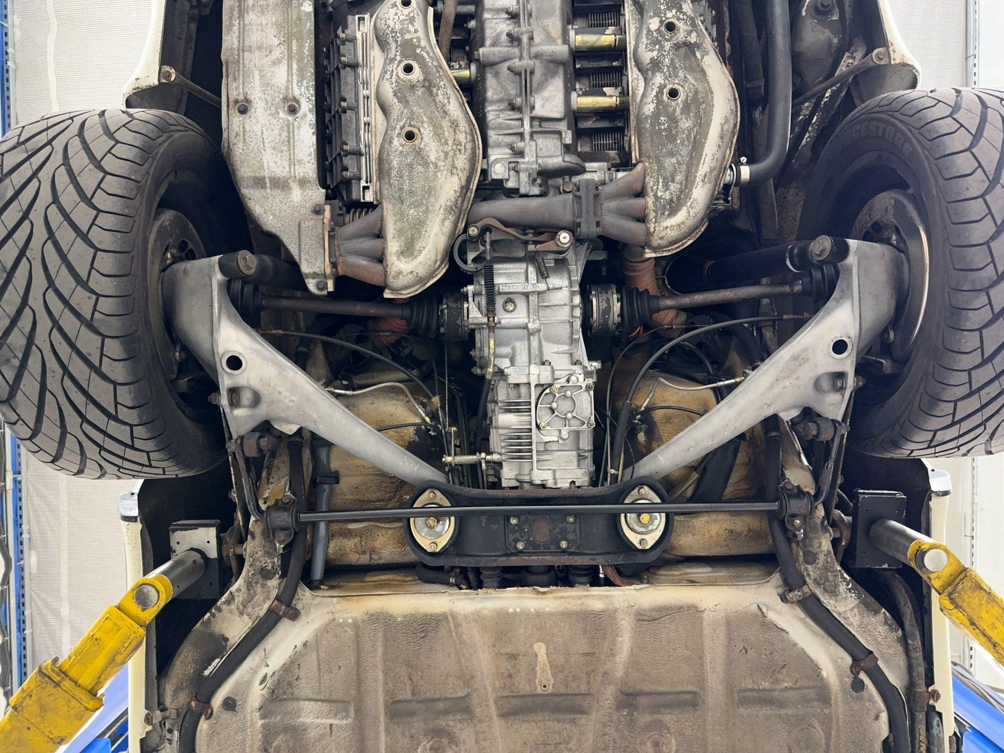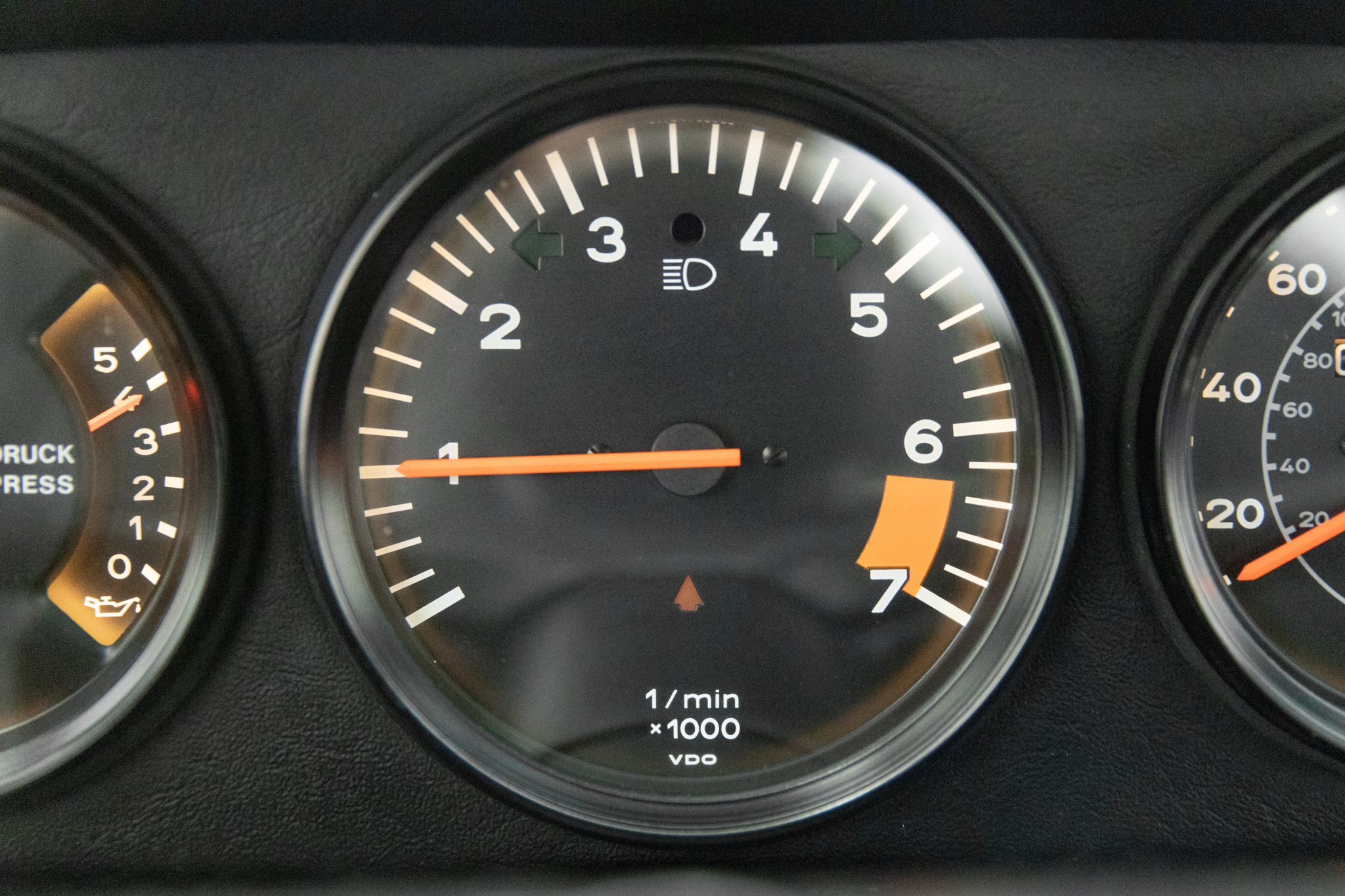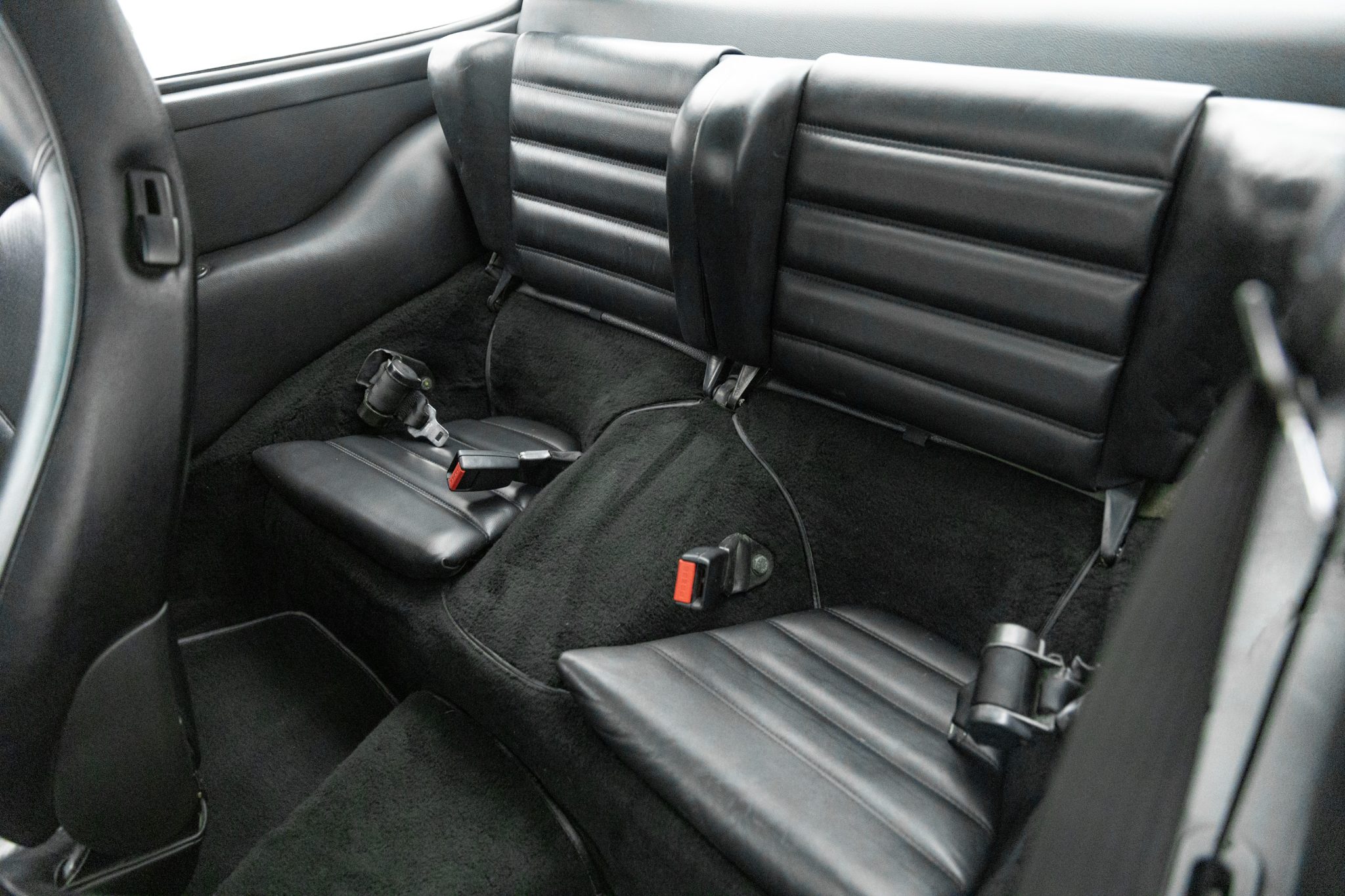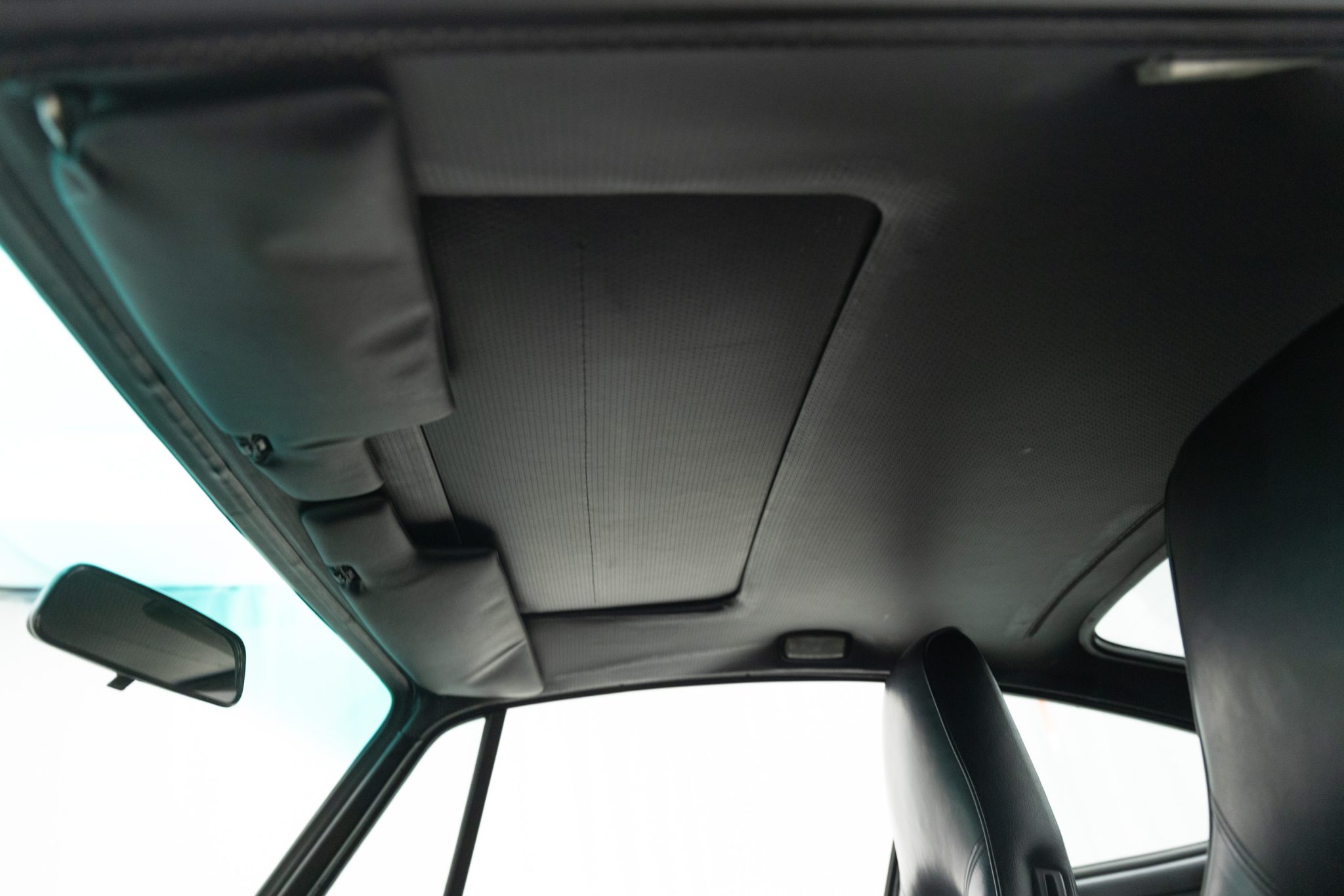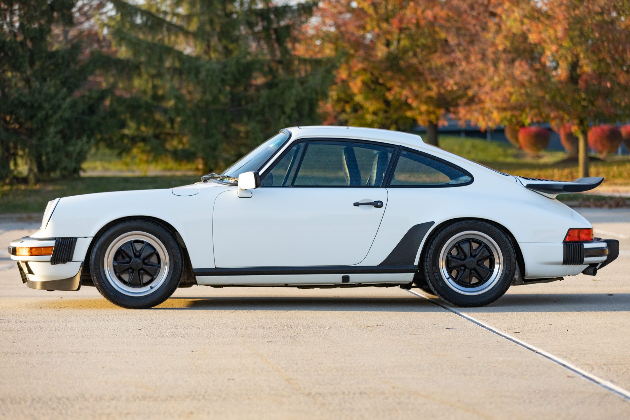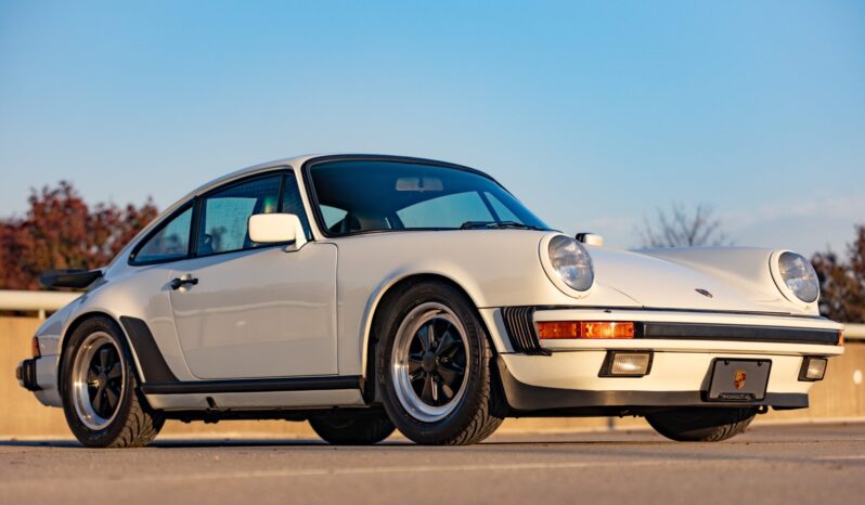 The car is powered by a 3.2-liter flat-six paired with a 915 five-speed manual transaxle and is finished in Grand Prix White over black leather upholstery. Equipment includes 16″ Fuchs alloy wheels, a rear spoiler, a power-operated sunroof, a power-adjustable driver’s seat, air conditioning, power windows, cruise control, and a Blaupunkt AM/FM/cassette stereo.