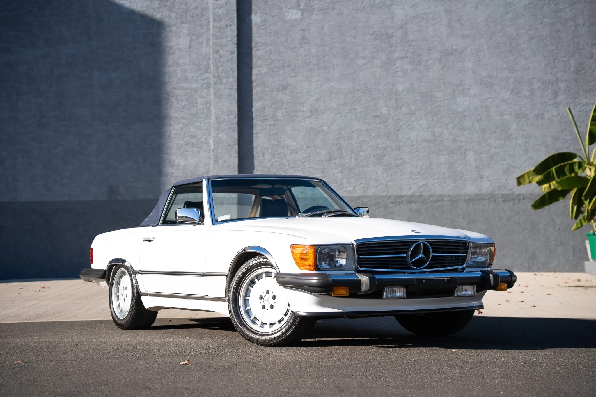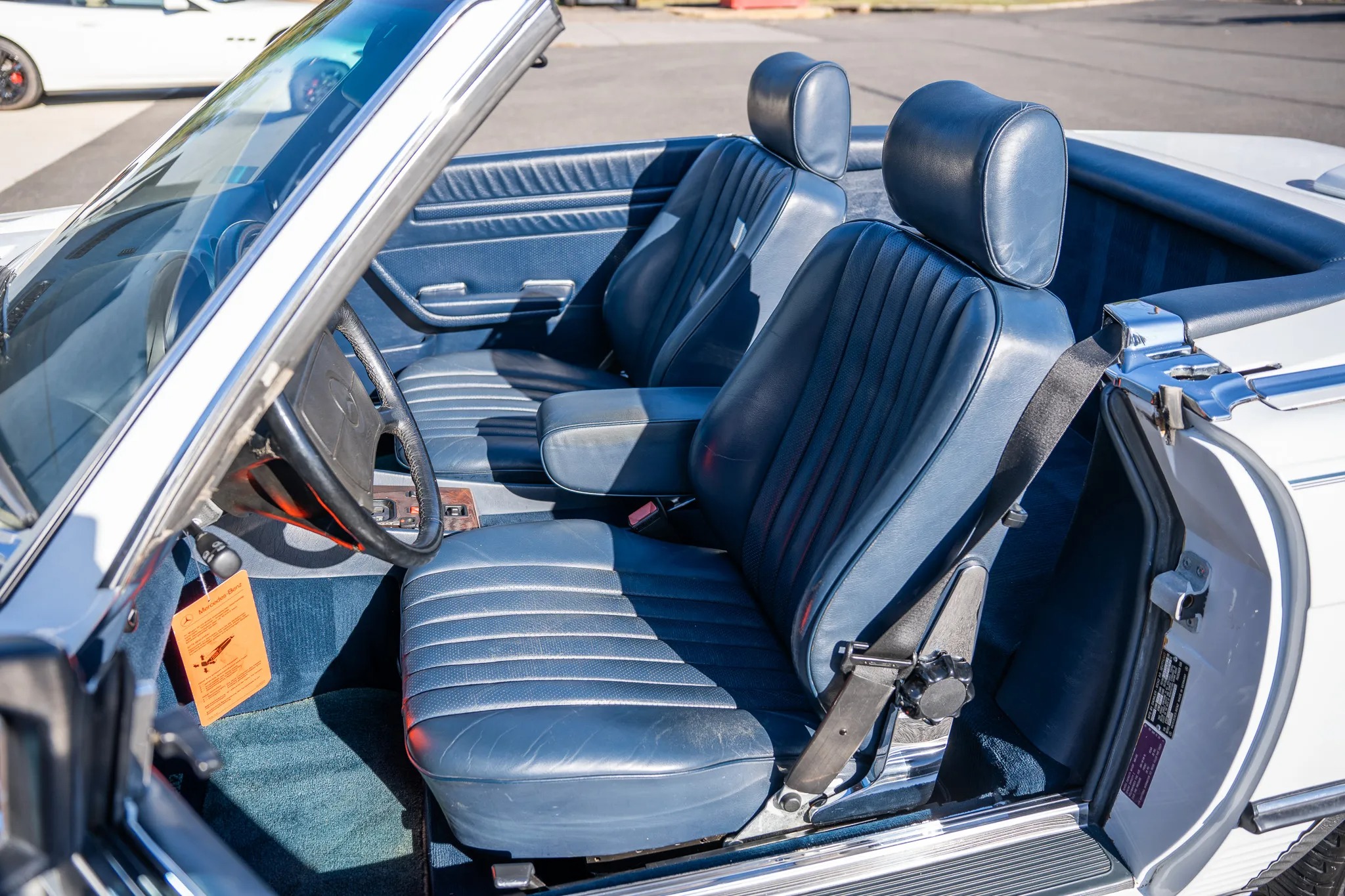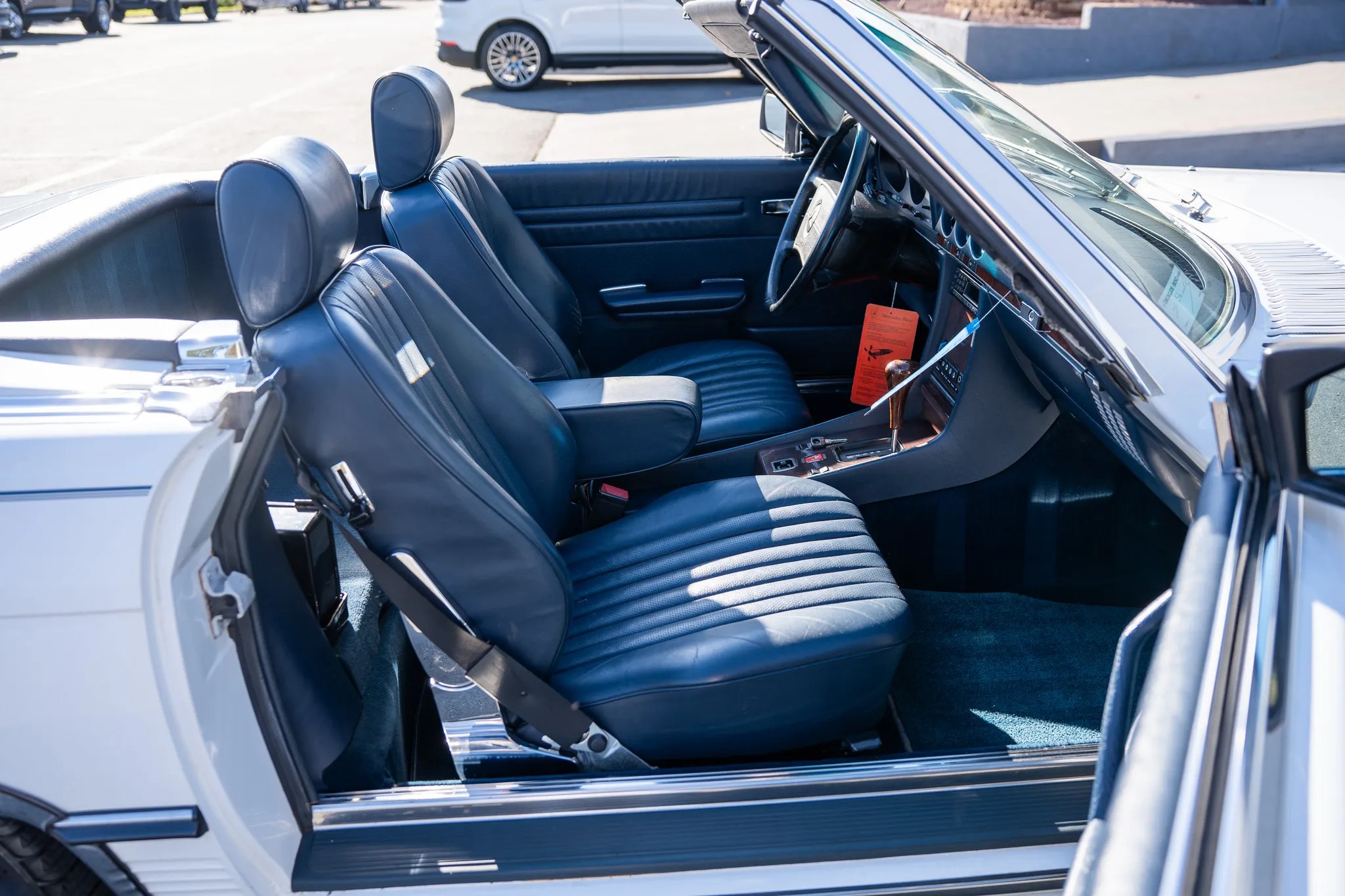 Finished in Classic White over blue leather, the car is powered by a 5.5-liter V8 paired with a four-speed automatic transmission. Equipment includes a limited-slip differential, a dark blue soft top, a removable hardtop, 16″ Lorinser alloy wheels, fog lights, an aftermarket stereo, electric windows, central locking, cruise control, and automatic climate control.