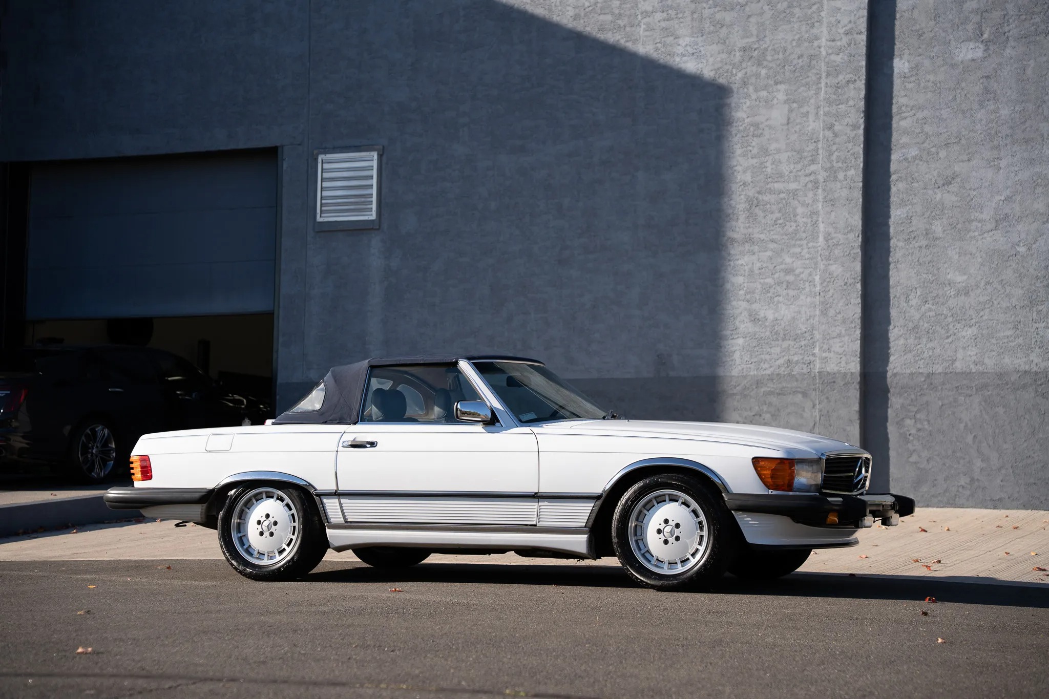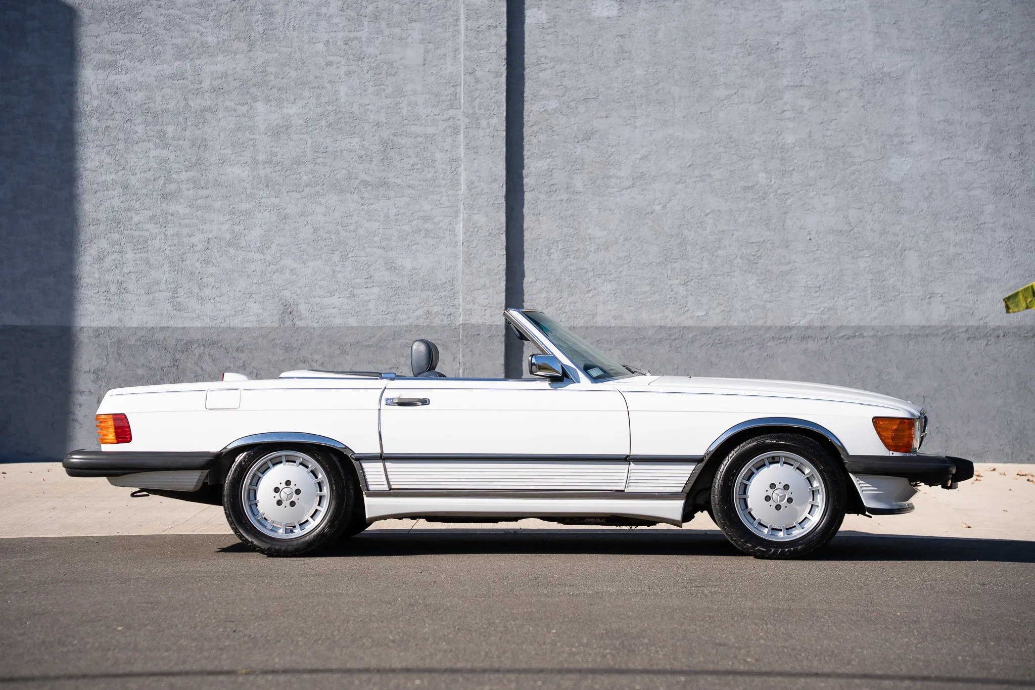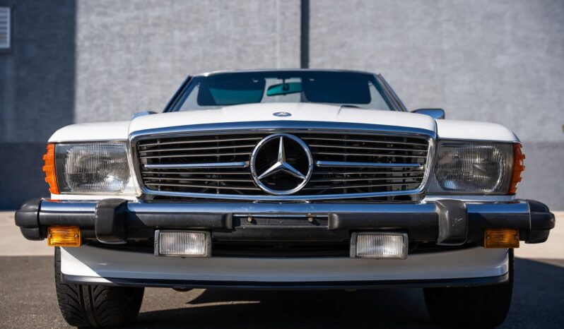 Finished in Classic White over blue leather, the car is powered by a 5.5-liter V8 paired with a four-speed automatic transmission. Equipment includes a limited-slip differential, a dark blue soft top, a removable hardtop, 16″ Lorinser alloy wheels, fog lights, an aftermarket stereo, electric windows, central locking, cruise control, and automatic climate control.