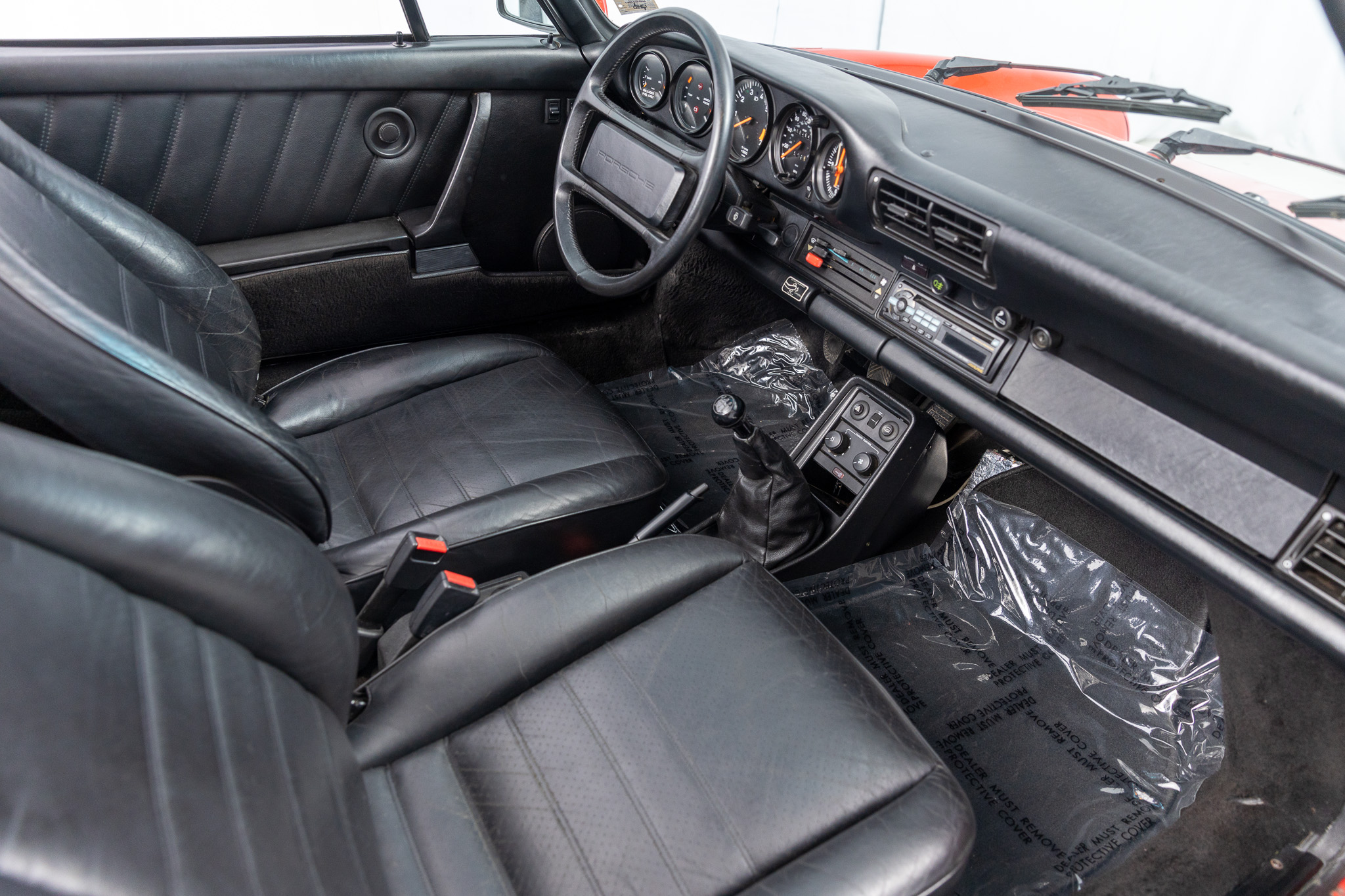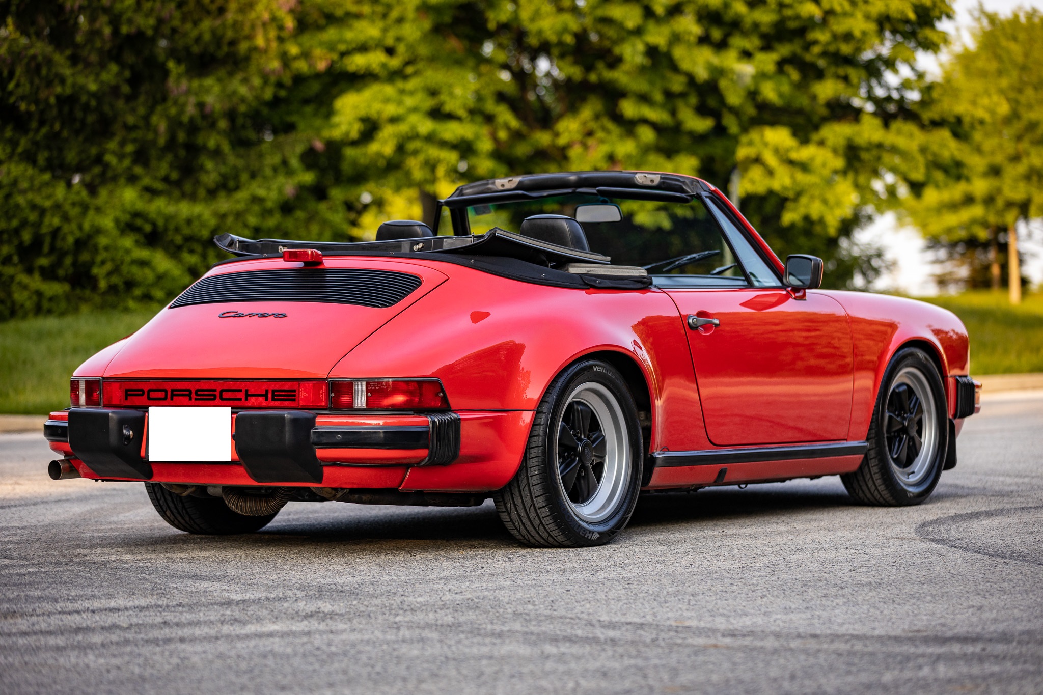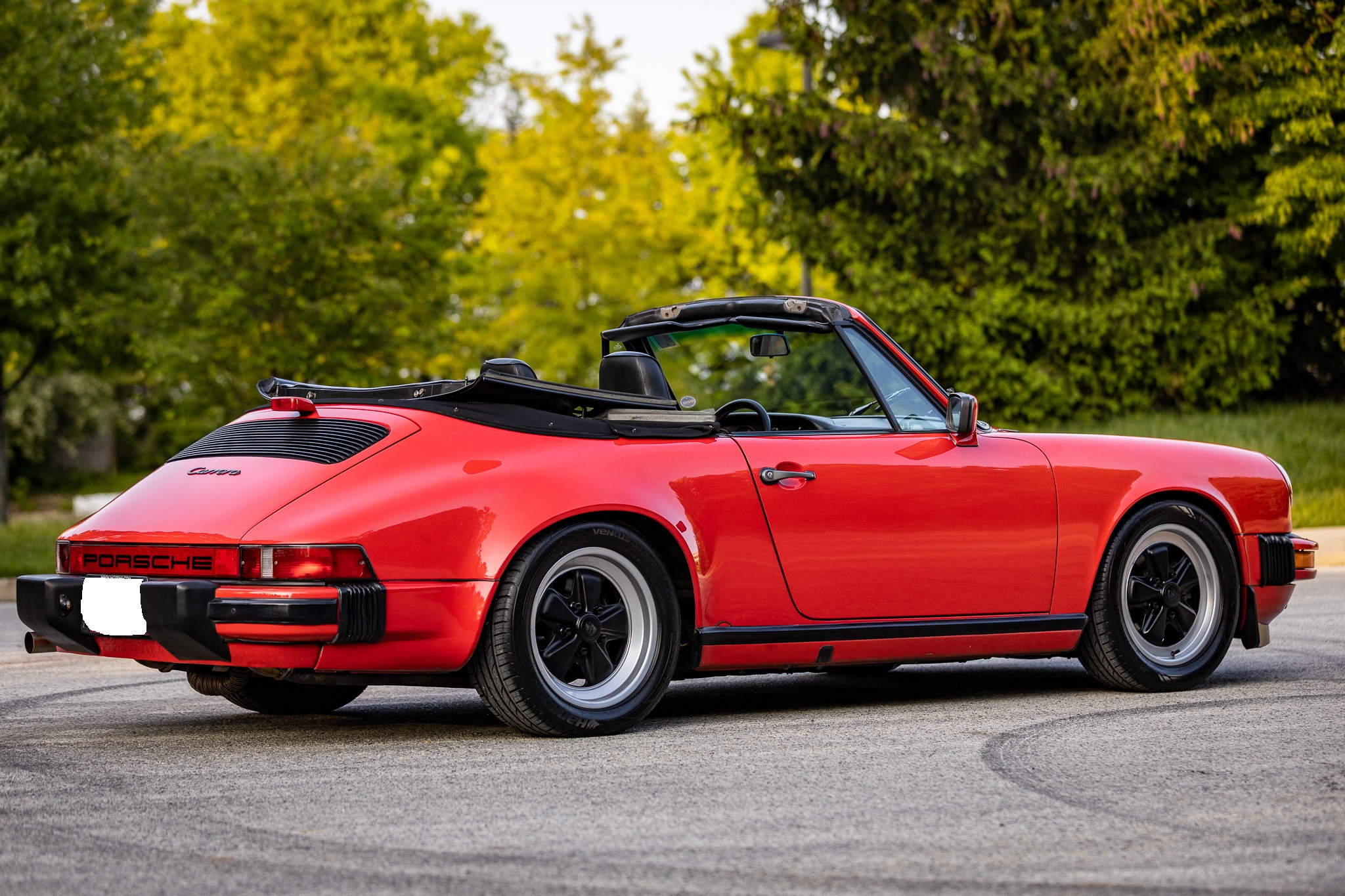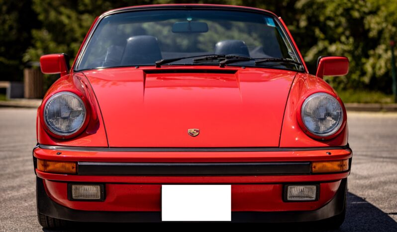 This 1986 Porsche 911 Carrera cabriolet is powered by a 3.2-liter flat-six paired with a 915 five-speed manual transaxle and is finished in Guards Red over black leather upholstery. Additional equipment includes 16″ Fuchs alloy wheels, H4 headlights, a manually operated black soft top, SSI heat exchangers, an M&K exhaust system, an Alpine head unit, a power-adjustable driver’s seat, and air conditioning.