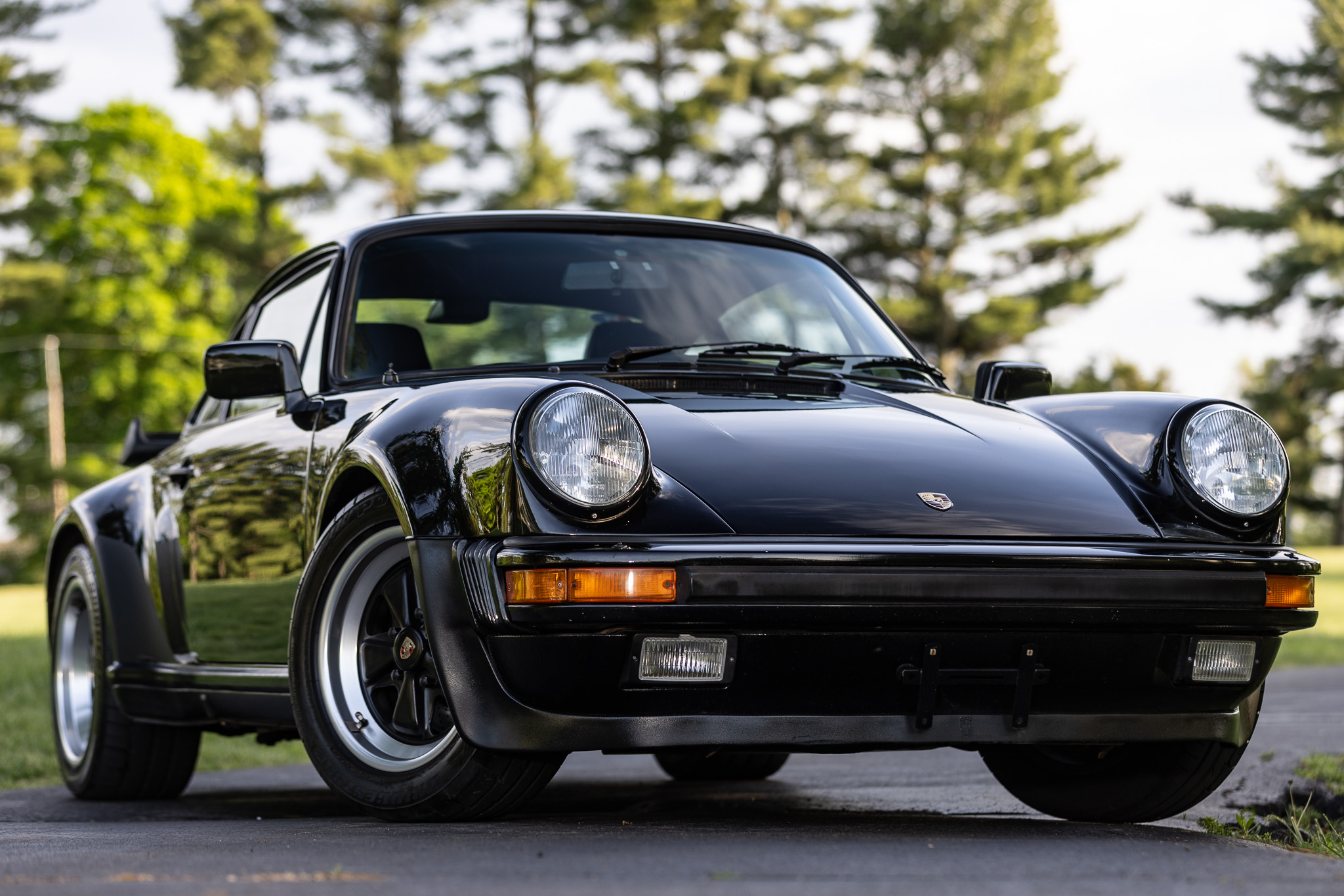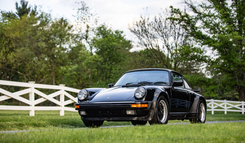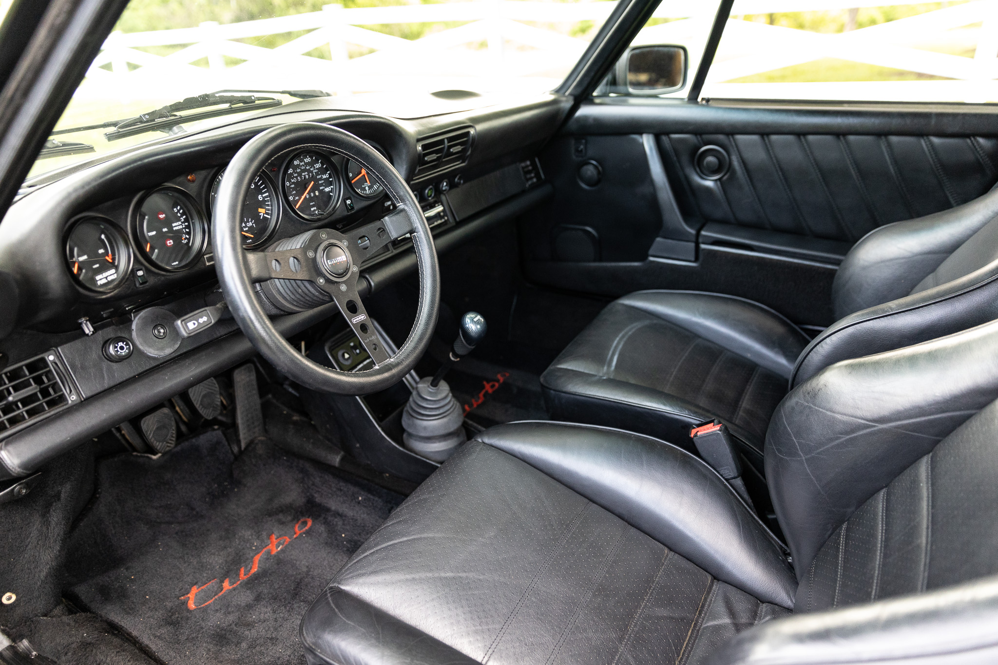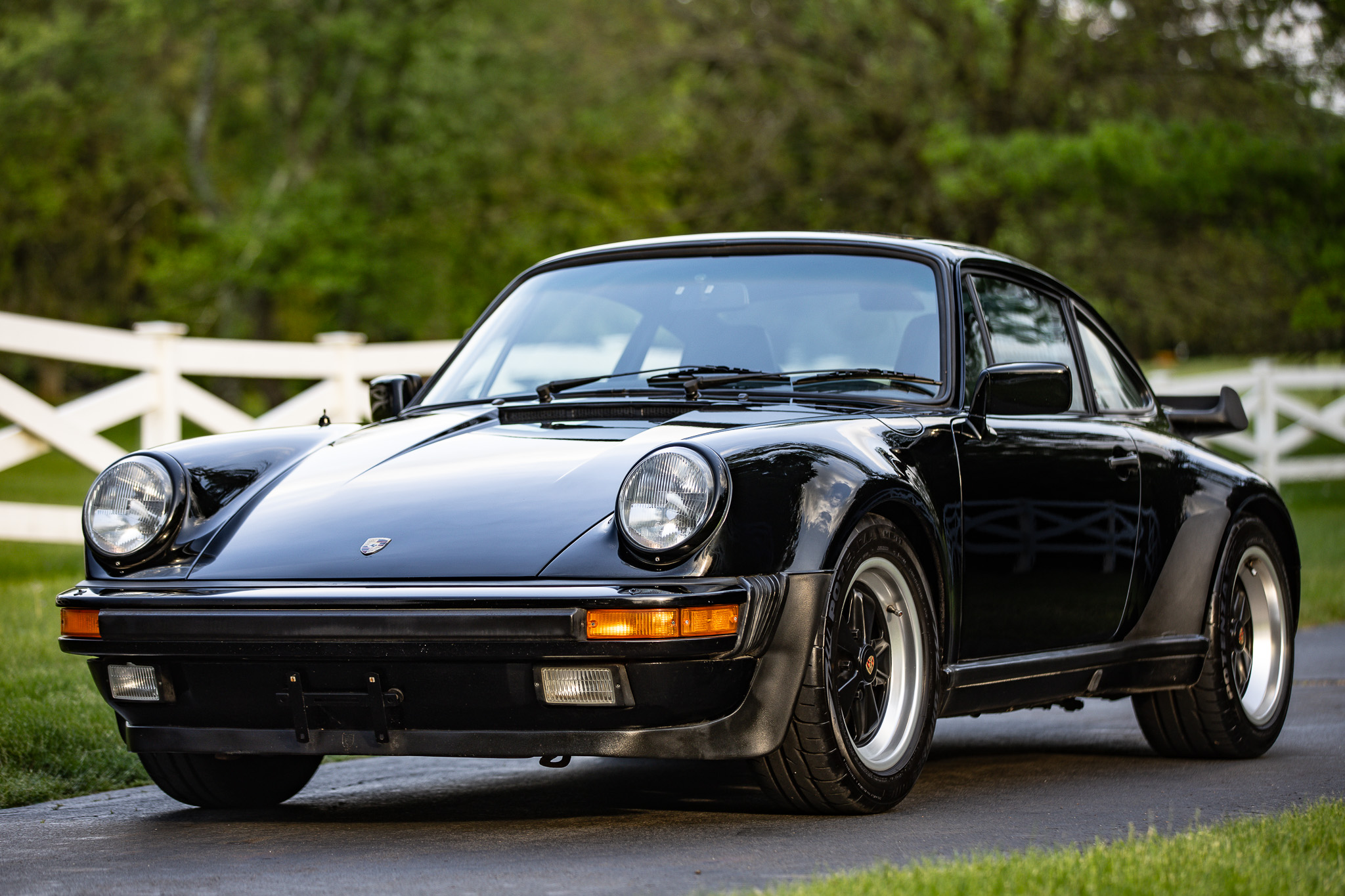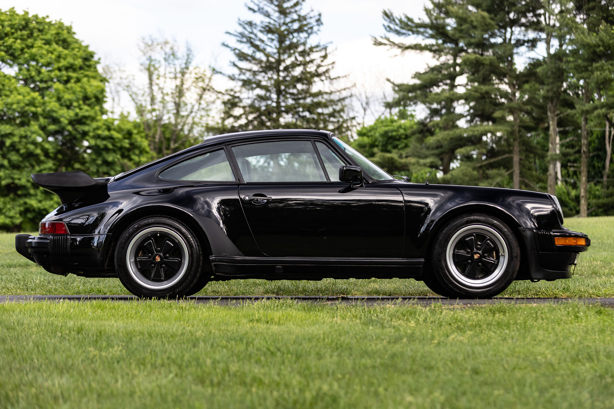 This 1986 Porsche 911 Turbo coupe is powered by a turbocharged 3.3-liter flat-six paired with a four-speed manual transaxle and is finished in black over black leather upholstery. The car is equipped with 16″ Fuchs alloy wheels, four-wheel cross-drilled and ventilated disc brakes, a sunroof, a tea tray rear spoiler, power-adjustable sport seats, a JVC head unit, and air conditioning.