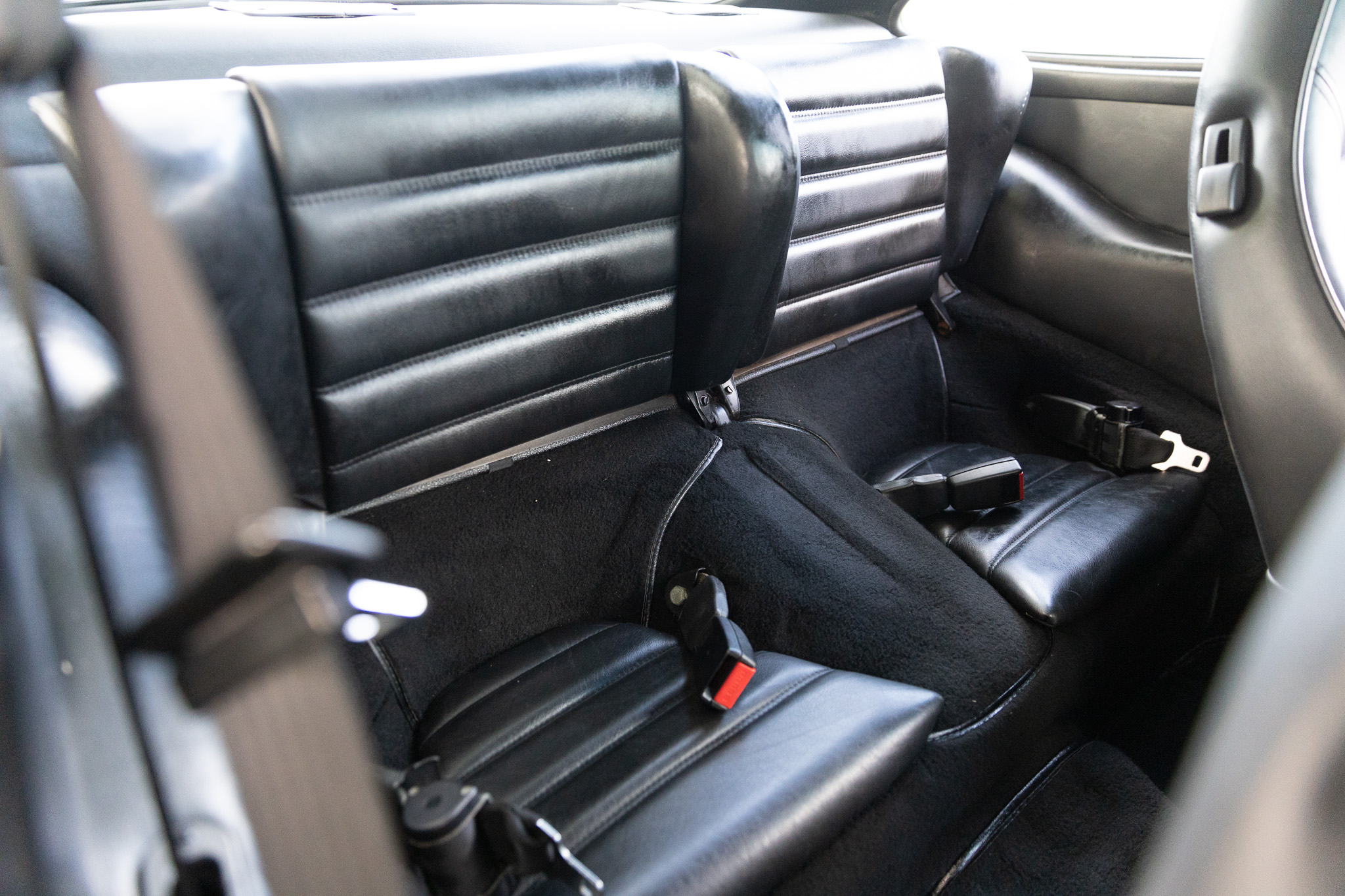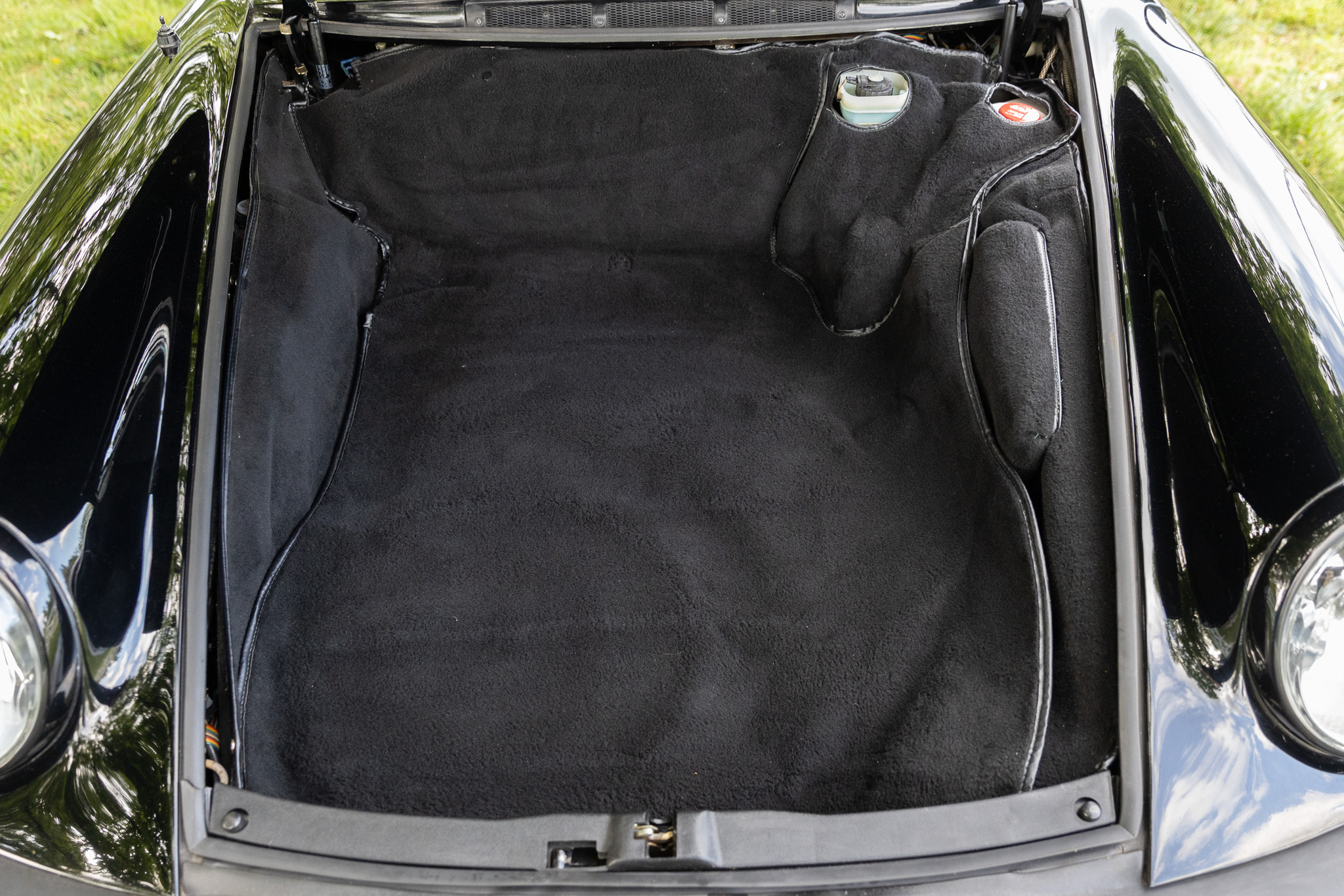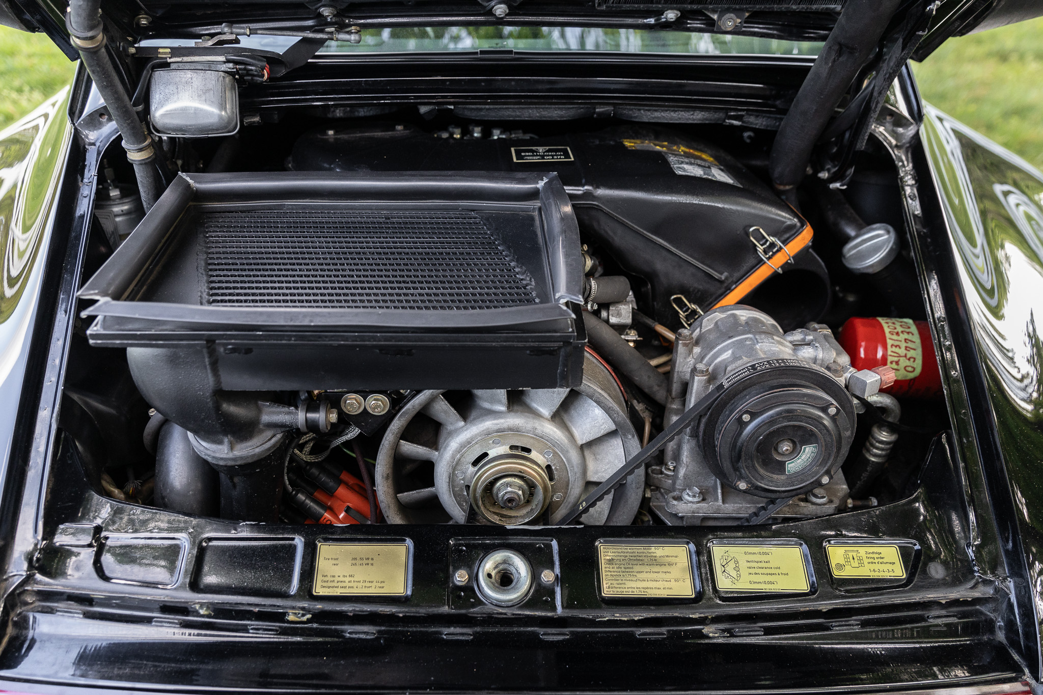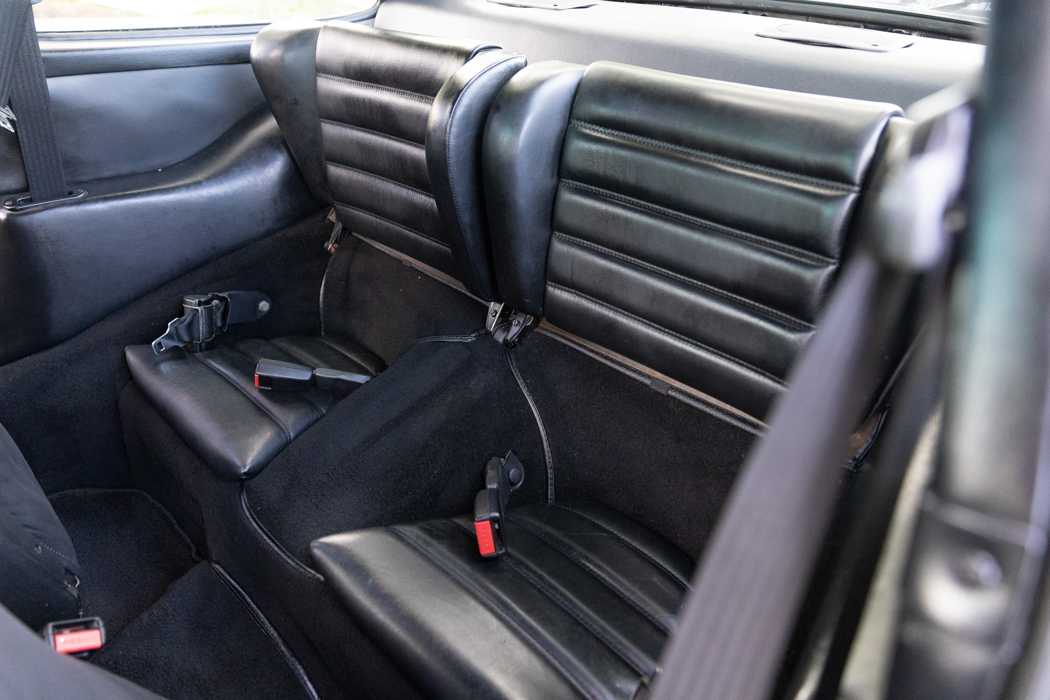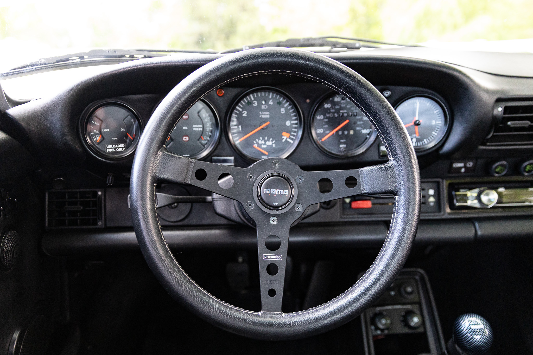 This 1986 Porsche 911 Turbo coupe is powered by a turbocharged 3.3-liter flat-six paired with a four-speed manual transaxle and is finished in black over black leather upholstery. The car is equipped with 16″ Fuchs alloy wheels, four-wheel cross-drilled and ventilated disc brakes, a sunroof, a tea tray rear spoiler, power-adjustable sport seats, a JVC head unit, and air conditioning.