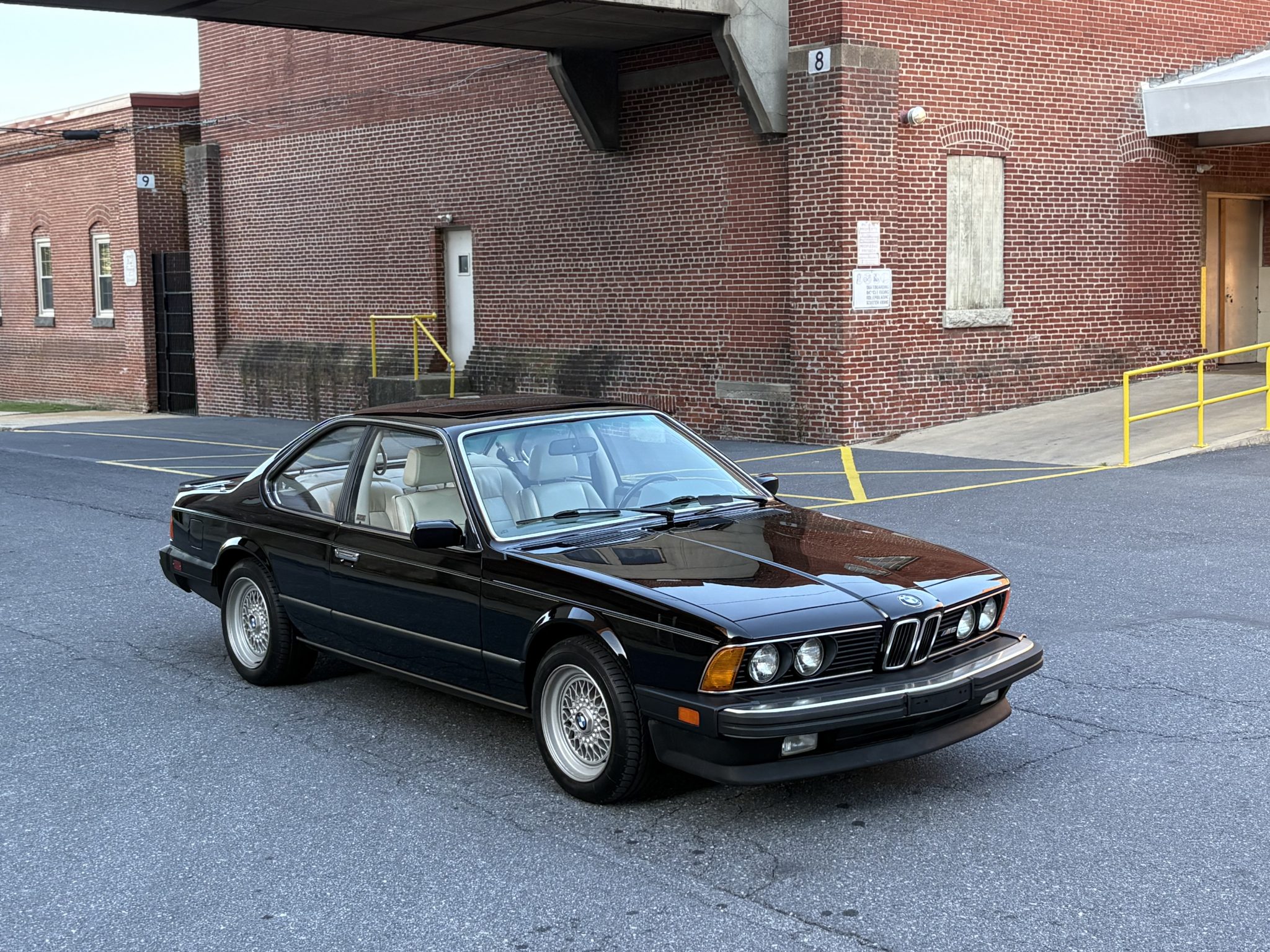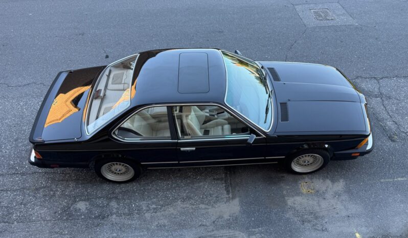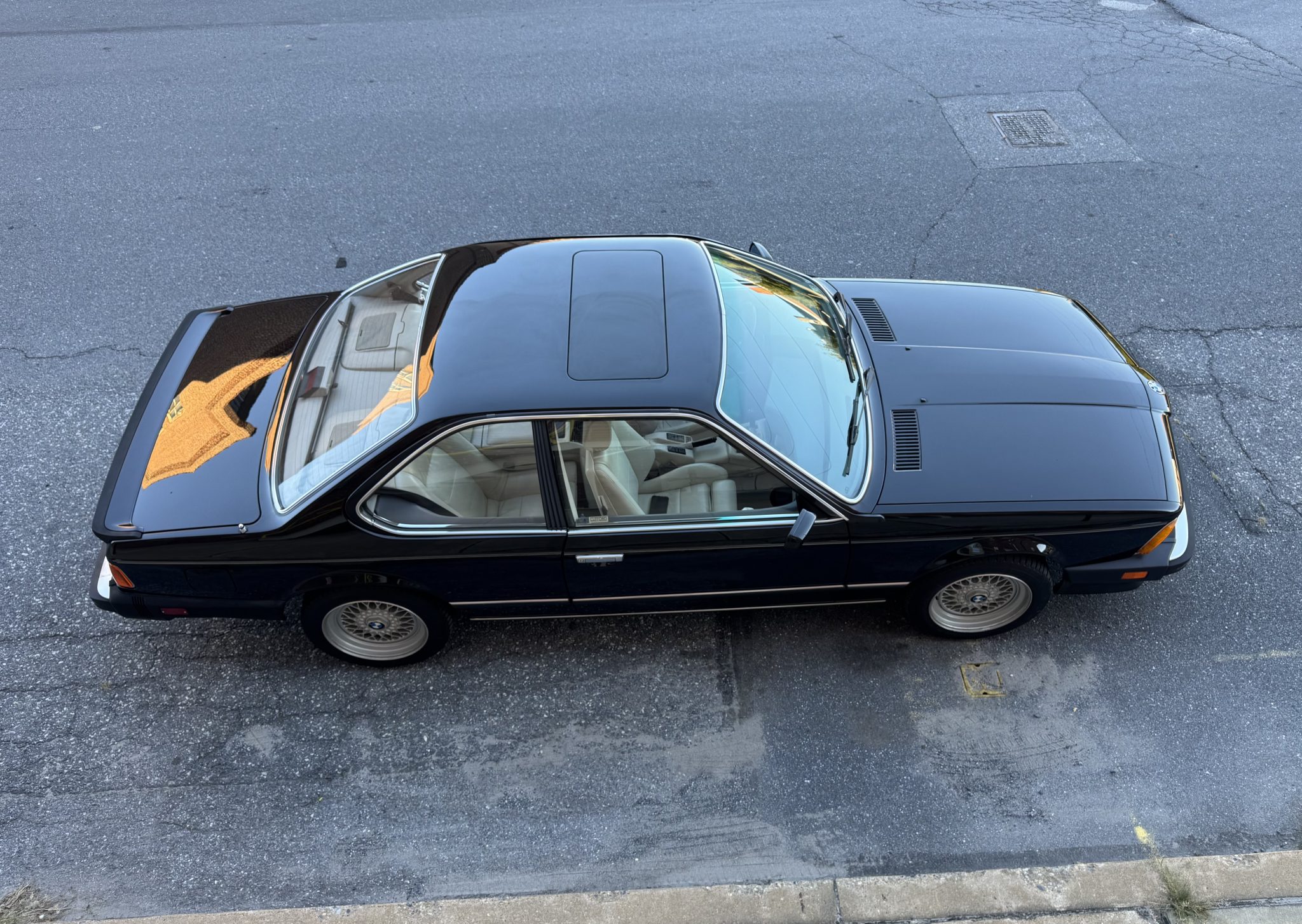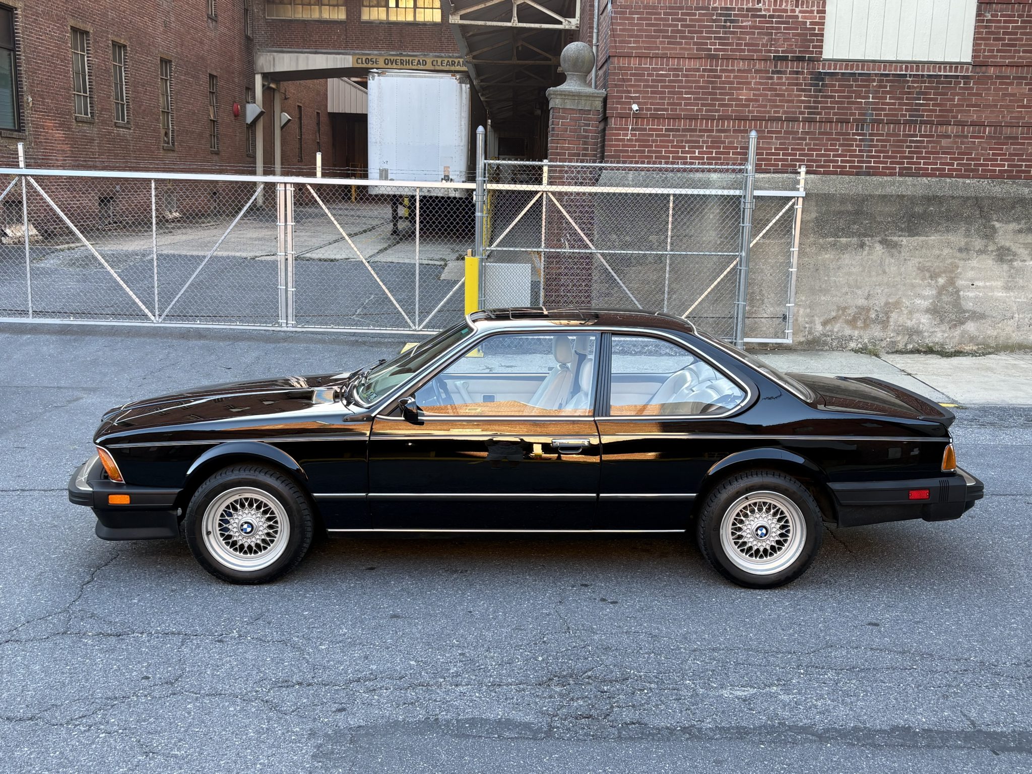 This 1987 BMW M6 is powered by a 3.5-liter S38 inline-six paired with a five-speed manual transmission and is finished in black over Lotus White leather upholstery. Equipment includes a limited-slip differential, 415mm basketweave alloy wheels, an aftermarket exhaust system, a sunroof, a rear spoiler, power-adjustable front seats, an Alpine cassette stereo, cruise control, and air conditioning.