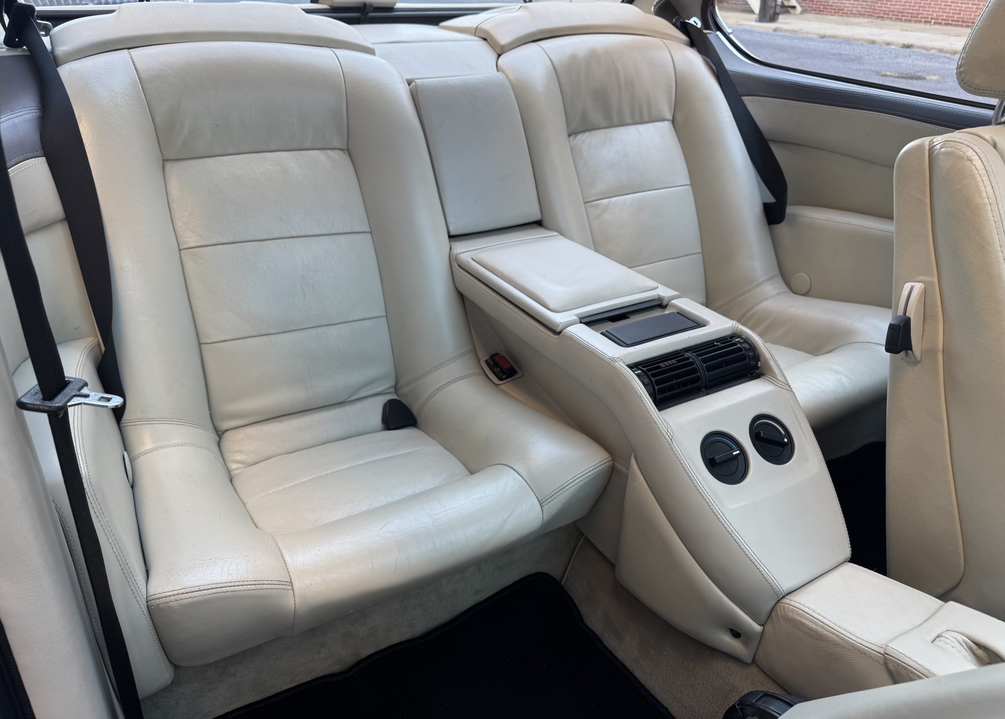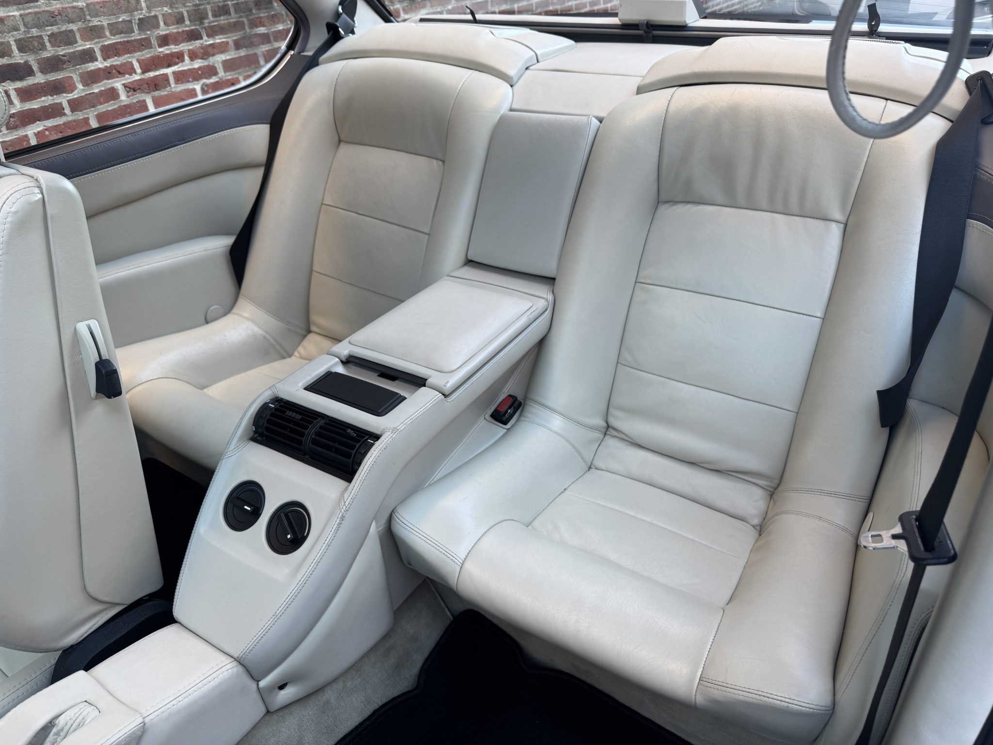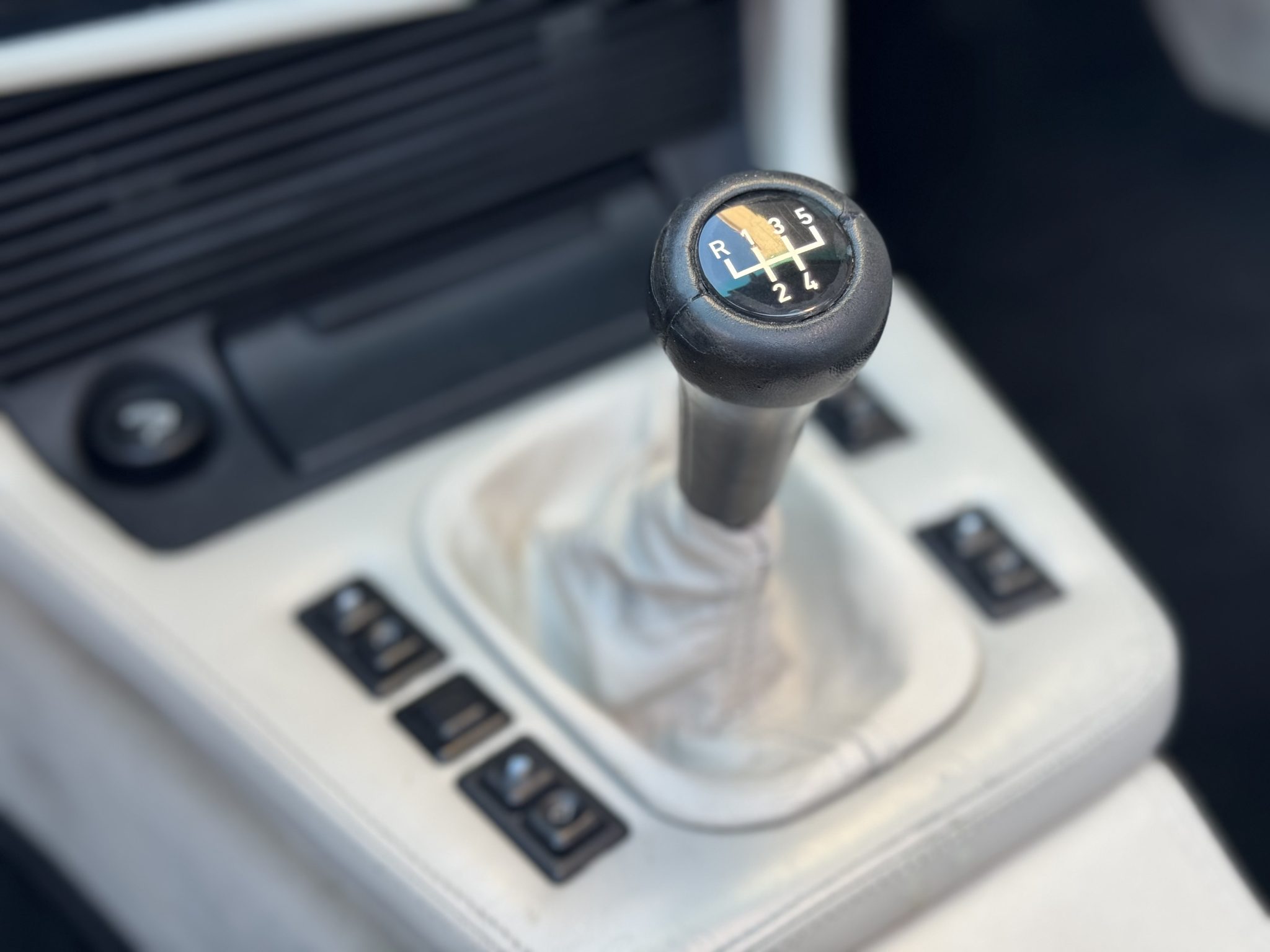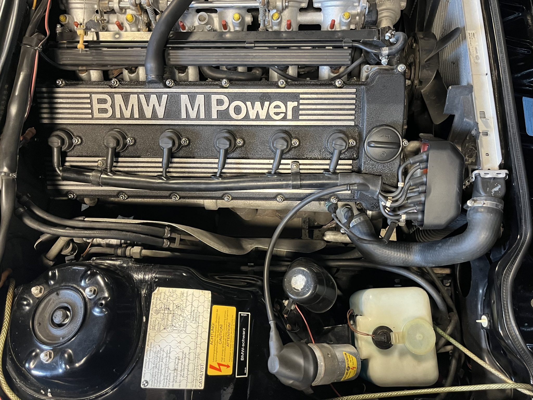 This 1987 BMW M6 is powered by a 3.5-liter S38 inline-six paired with a five-speed manual transmission and is finished in black over Lotus White leather upholstery. Equipment includes a limited-slip differential, 415mm basketweave alloy wheels, an aftermarket exhaust system, a sunroof, a rear spoiler, power-adjustable front seats, an Alpine cassette stereo, cruise control, and air conditioning.