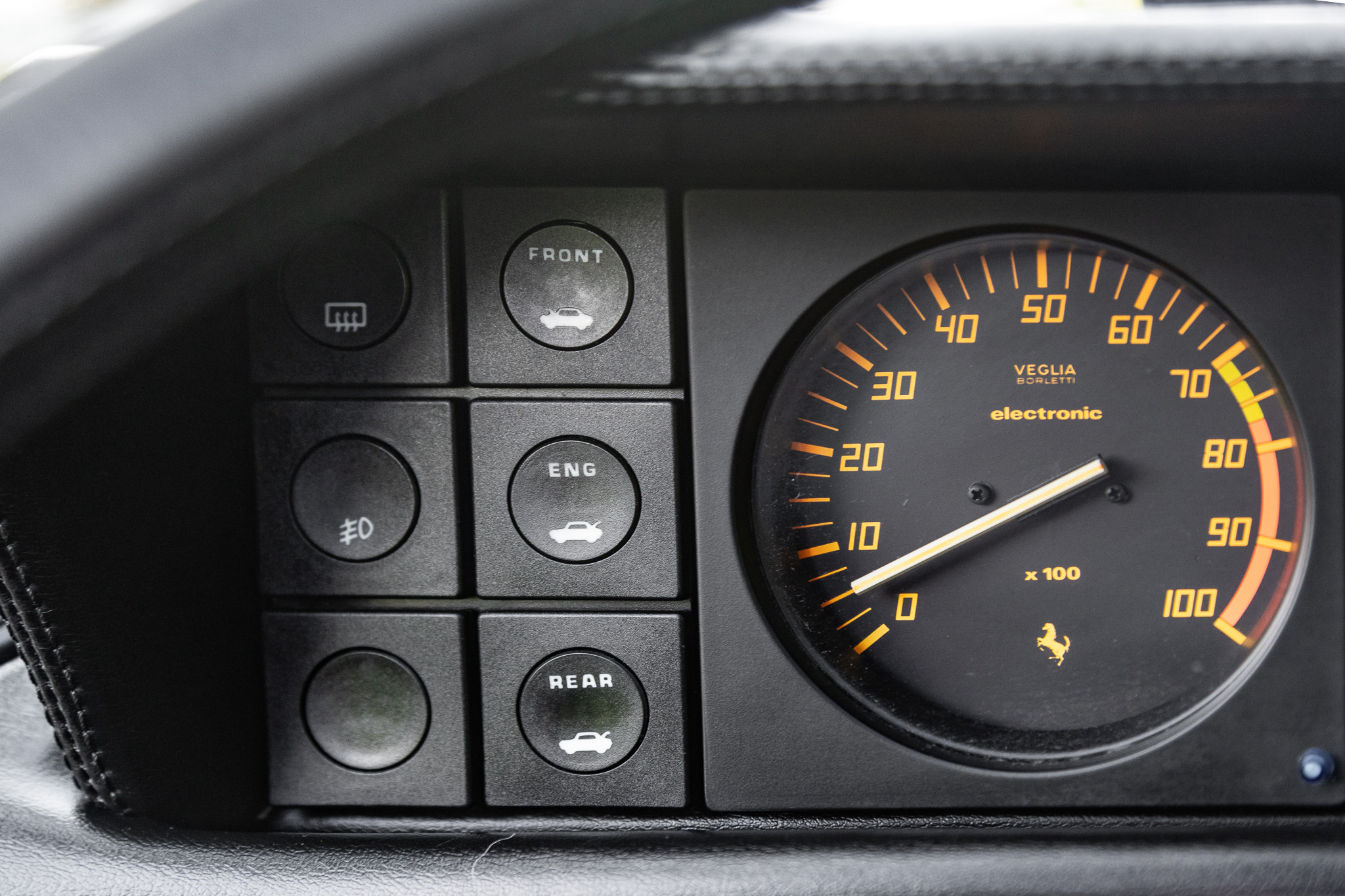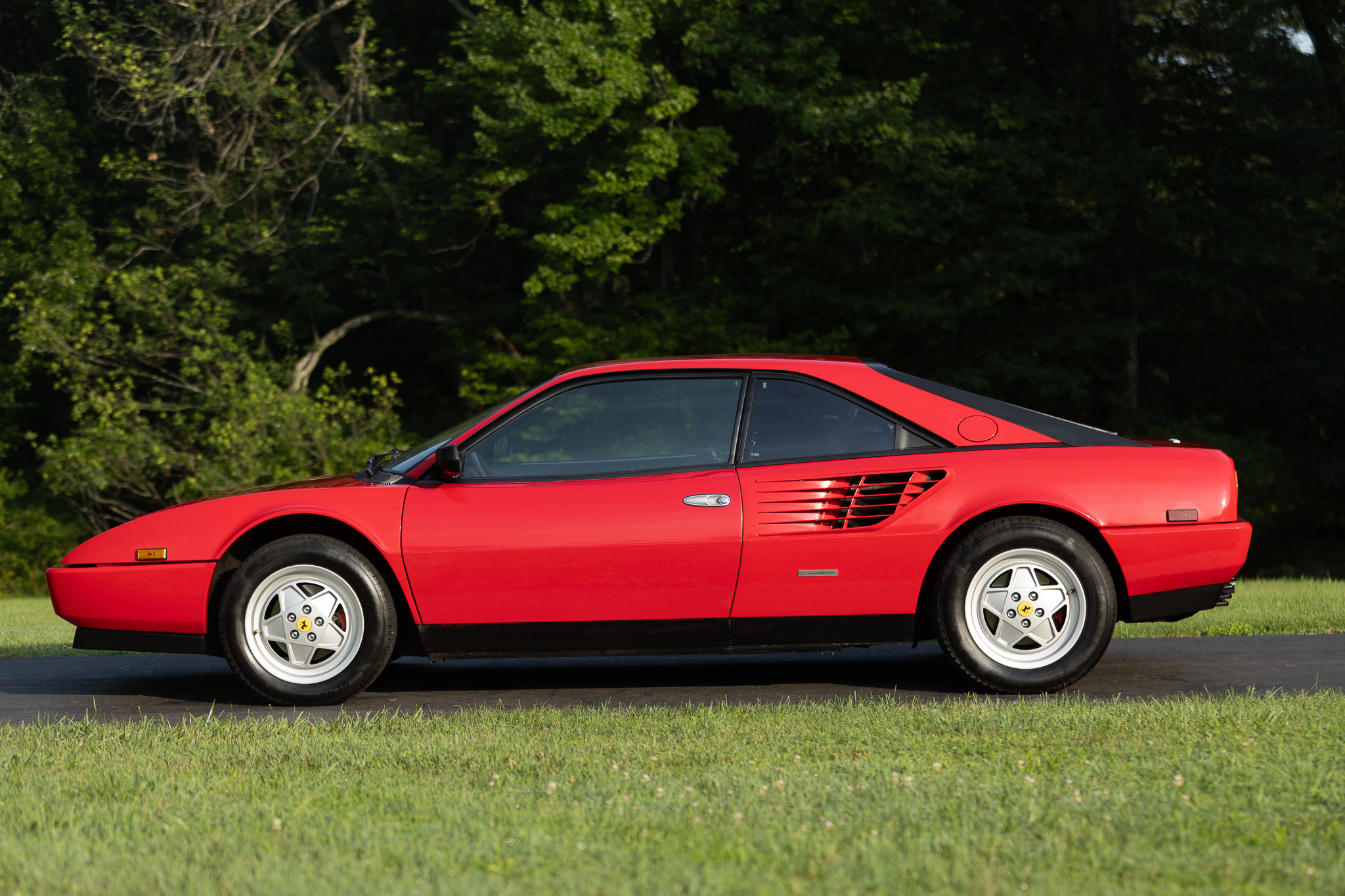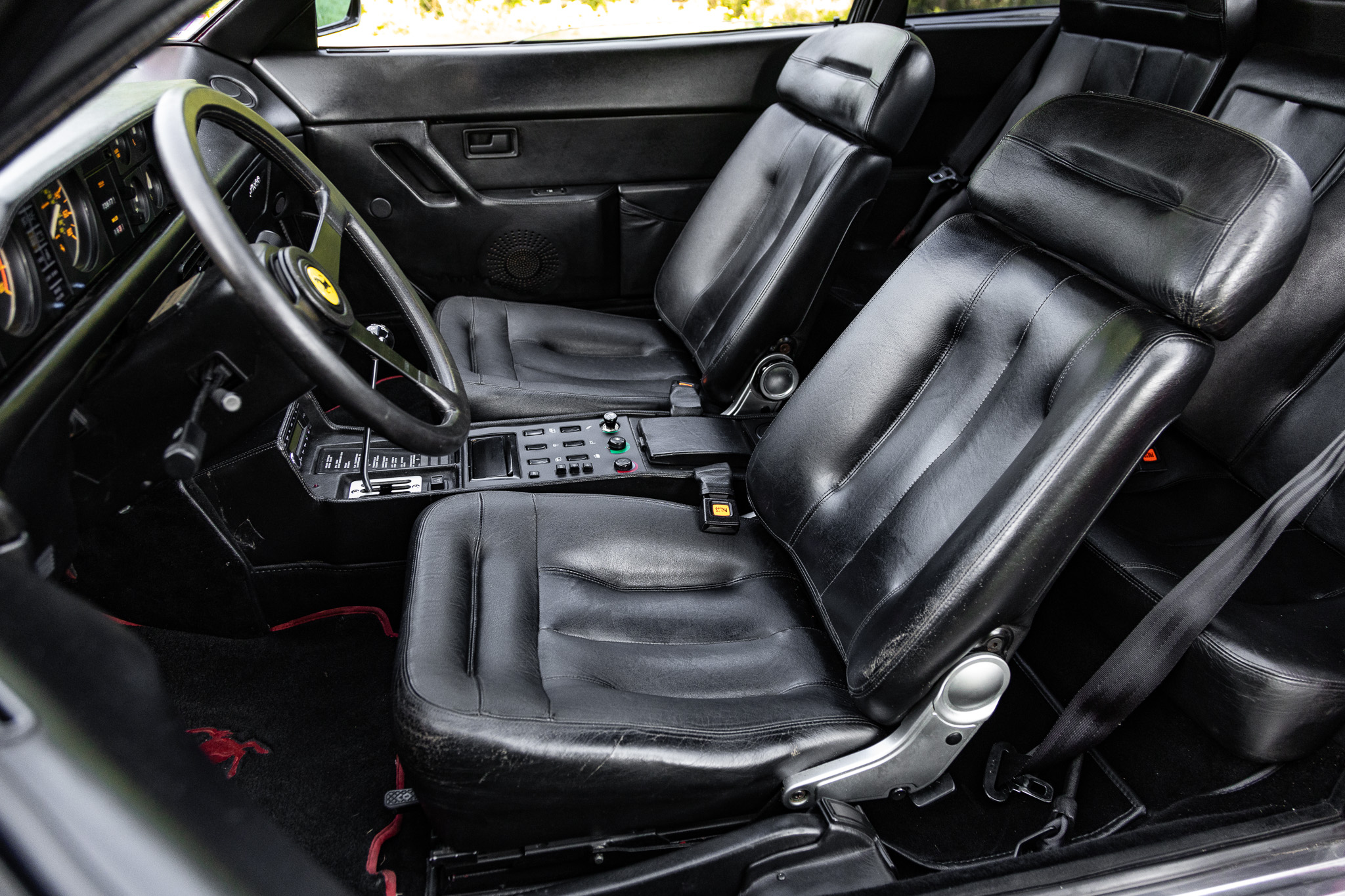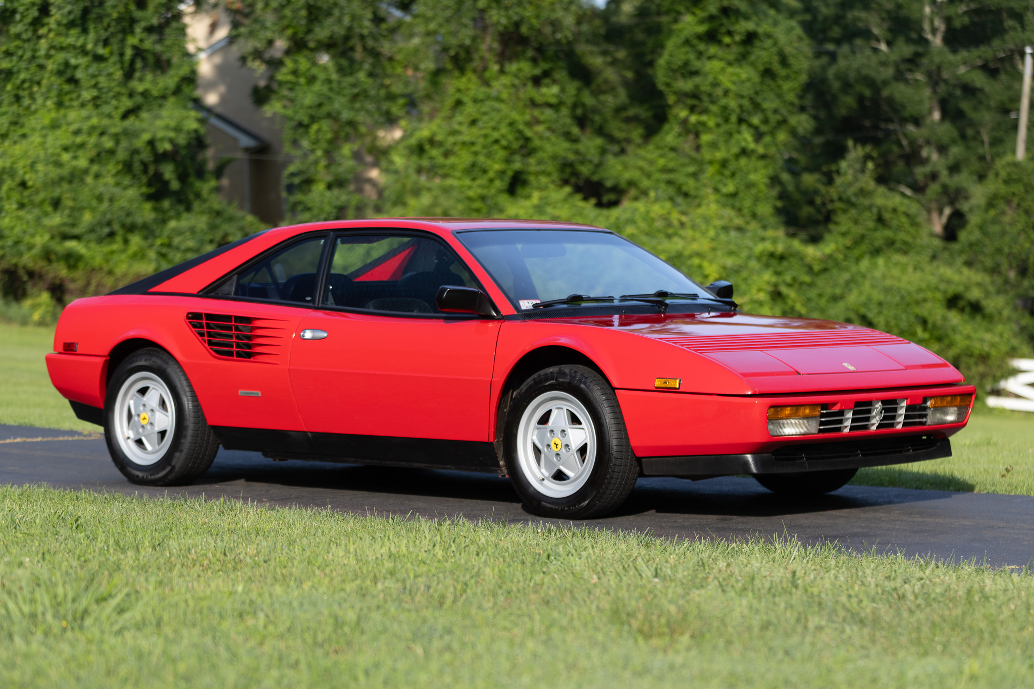 Subsequent work included replacing the timing belts, drive belts, spark plugs, distributor cap and rotor, clutch, climate control module, and tires. Powered by a 3.2-liter F105C V8 paired with a five-speed manual transaxle, the car is finished in Rosso Corsa over Nero leather. Equipment includes a limited-slip differential, 16″ five-spoke alloy wheels, a sunroof, a gated shifter, power windows, air conditioning, and a Continental head unit with Bluetooth connectivity.