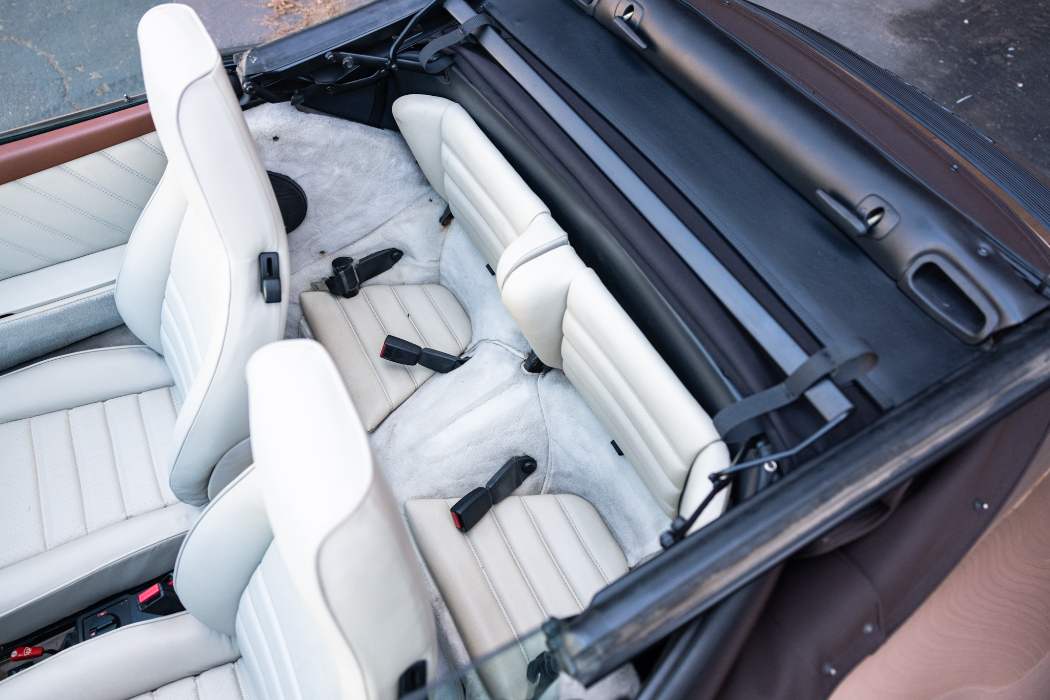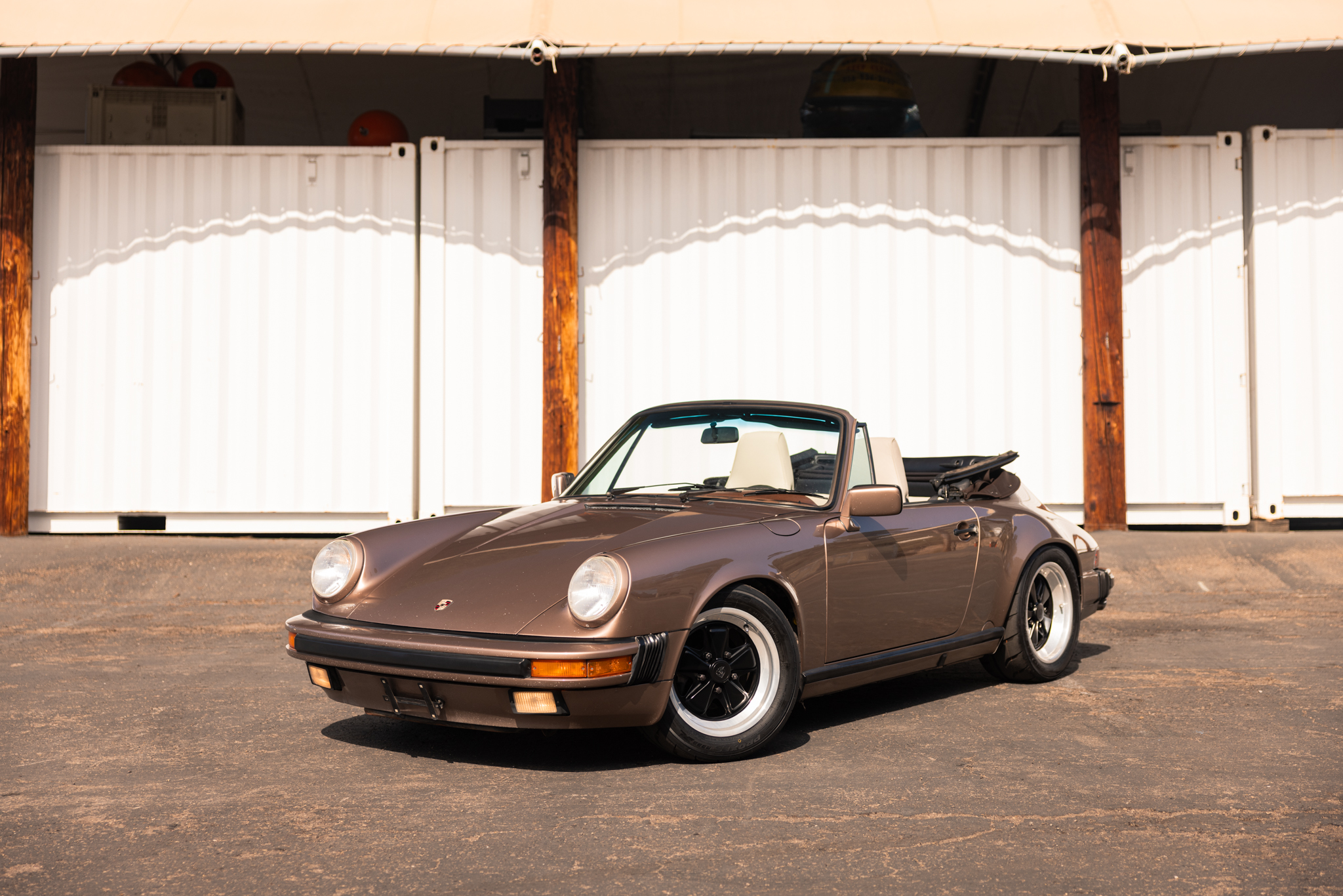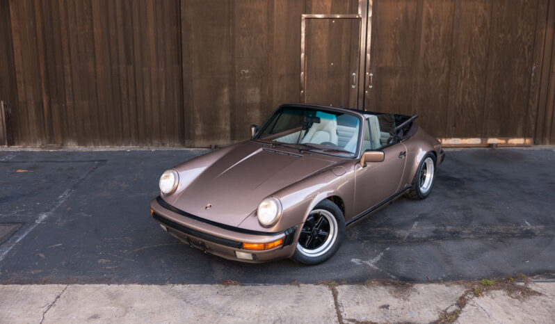 This 1987 Porsche 911 Carrera cabriolet is finished in Nougat Brown Metallic over Pearl White leather and has been fitted with a 993-sourced 3.6L flat-six that is paired with a G50 five-speed manual transaxle. Equipment includes a brown convertible soft top, 16″ Fuchs alloy wheels, power-adjustable front seats, air conditioning, power windows, a Sony cassette stereo, and Alpine speakers. This Carrera cabriolet shows 188k miles