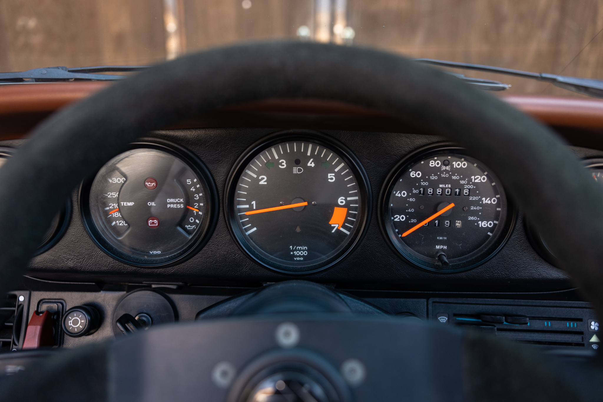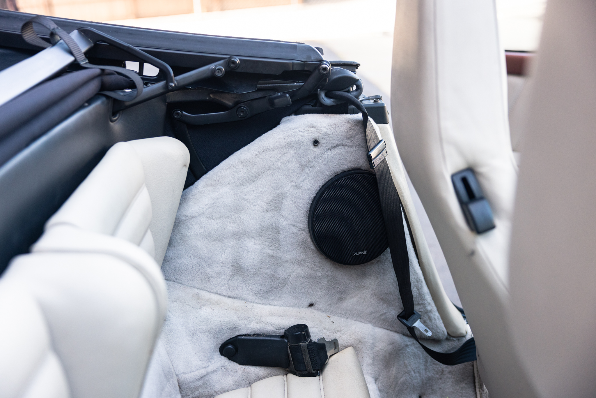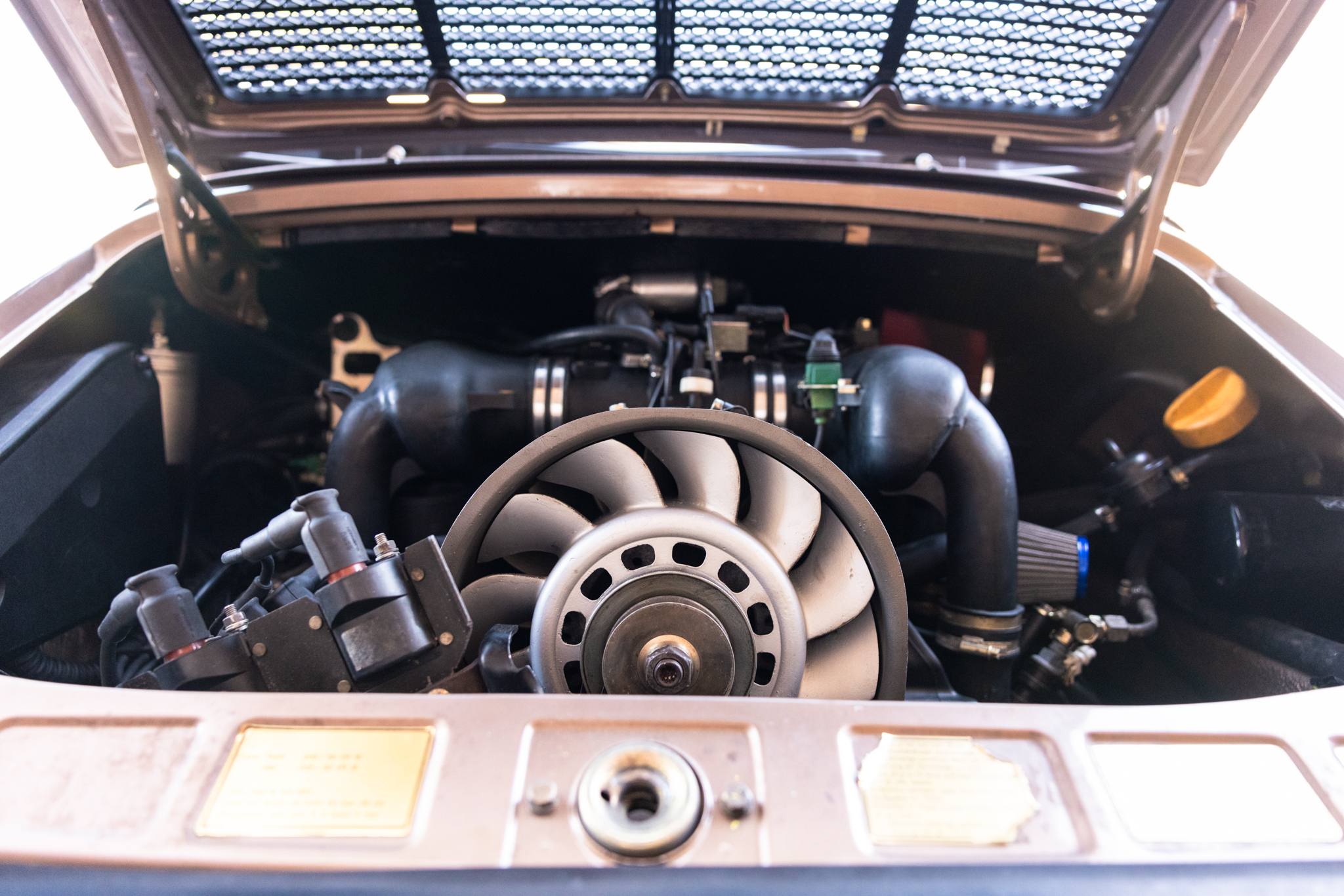 This 1987 Porsche 911 Carrera cabriolet is finished in Nougat Brown Metallic over Pearl White leather and has been fitted with a 993-sourced 3.6L flat-six that is paired with a G50 five-speed manual transaxle. Equipment includes a brown convertible soft top, 16″ Fuchs alloy wheels, power-adjustable front seats, air conditioning, power windows, a Sony cassette stereo, and Alpine speakers. This Carrera cabriolet shows 188k miles